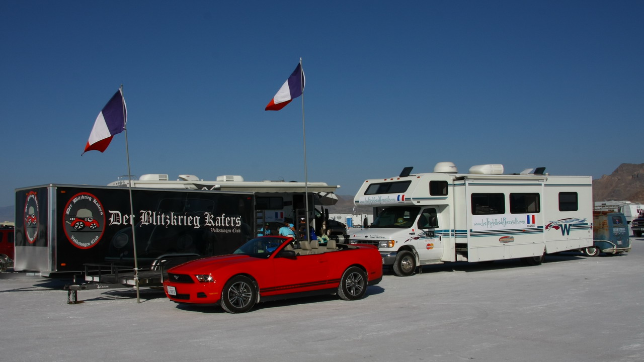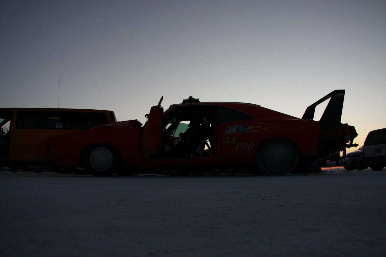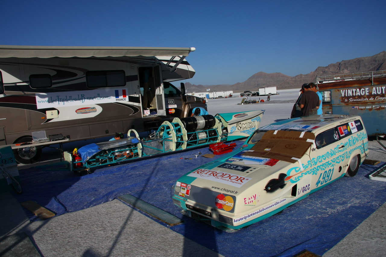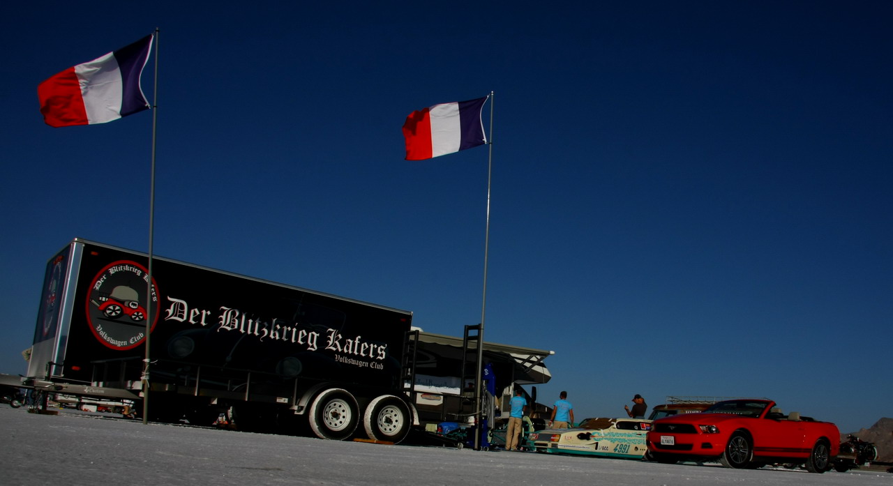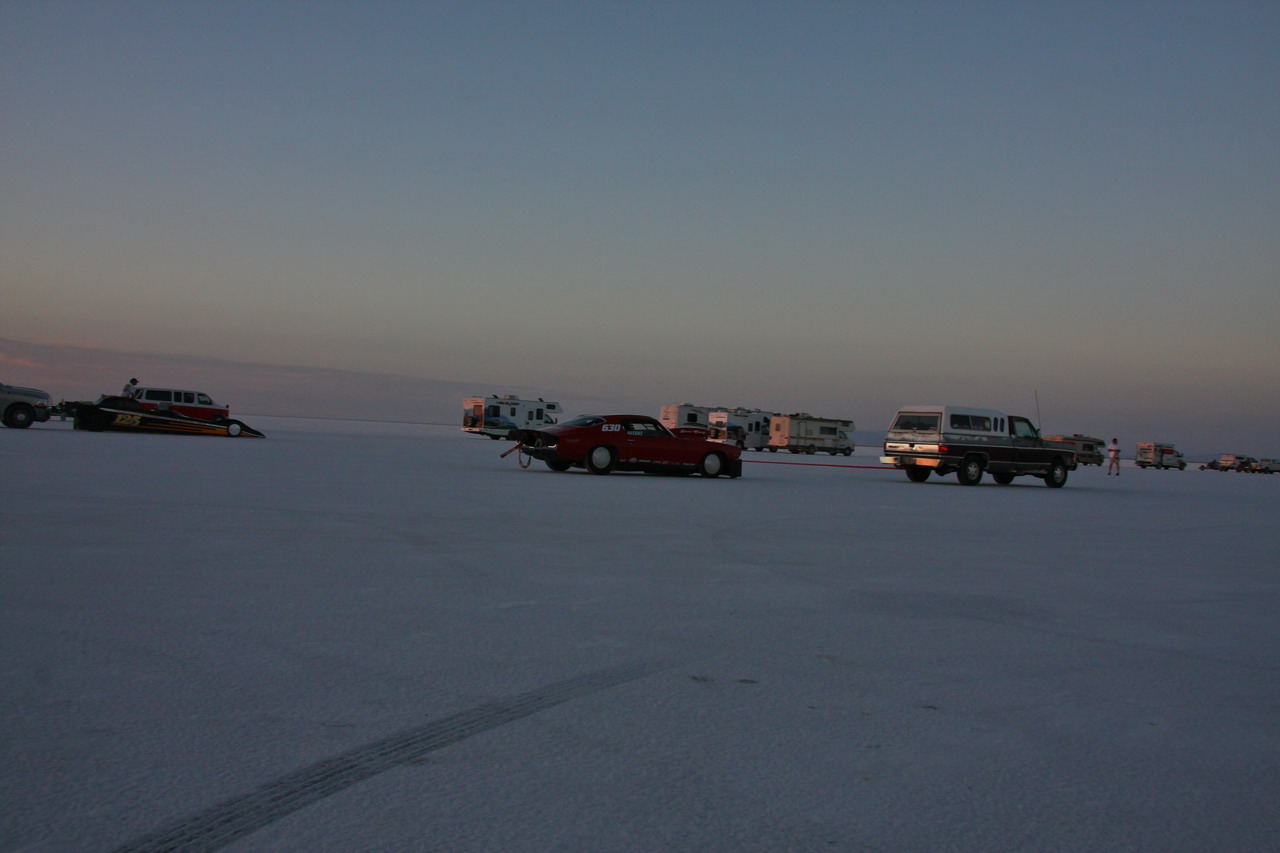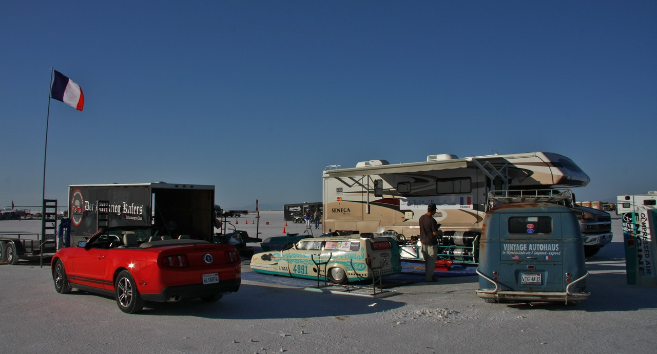et nous n'allons pas être déçu coté sensations, émotions, spectacle et beauté.... nous quittons donc Wendover à 6h00 du mat, il fait une température idéale pour rouler en Stang décapotée (déjà 86°F soit 30°C!!), il fait nuit noire, nous nous dirigeons vers l'est et découvrons enfin le fameux panneau "Bonneville Speedway Exit 4", nous prenons la bretelle et nous engageons sur une route goudronnée entourée d'une immensité plate, il fait tellement noir que nous ne distinguons absolument rien autour, heureusement nous ne sommes pas seuls et nous guidons sur les feux rouges devant nous .... puis, à un moment un petit dévers en pente devant nous, que nous descendons, puis plus rien, plus de goudron, plus de traces, rien, le vide total, l'immensité totale.... Franck Sinatra à la radio, le moment est grandiose.... nous continuons quand même, à allure réduite, sans aucun repère, sur une surface totalement étrangère mais où la Stang se comporte plutôt bien, puis nous commençons à nous faire dépasser par des voitures sur autant de pistes parallèles qu'il peut y avoir de feux rouges !! Nous les suivons donc, et sans s'en rendre compte vu qu'il fait toujours nuit noire et au bout de quelques miles, nous pénétrons en Stang à l'intérieur de l'Impound, c'est genre comme si vous rentriez dans un paddock de F1 et que vous circuliez en voiture à travers les semis transportant les voitures, les motorhomes sans que vous en vous en rendiez compte, de la folie pure, la magie de Bonneville !! c'est après avoir fait le tour et stationné la Stang que nous nous rendons compte que nous étions dans le sanctuaire de l'Impound, nous prenons alors nos armes photographiques, et là, le spectacle son et lumière commence ....