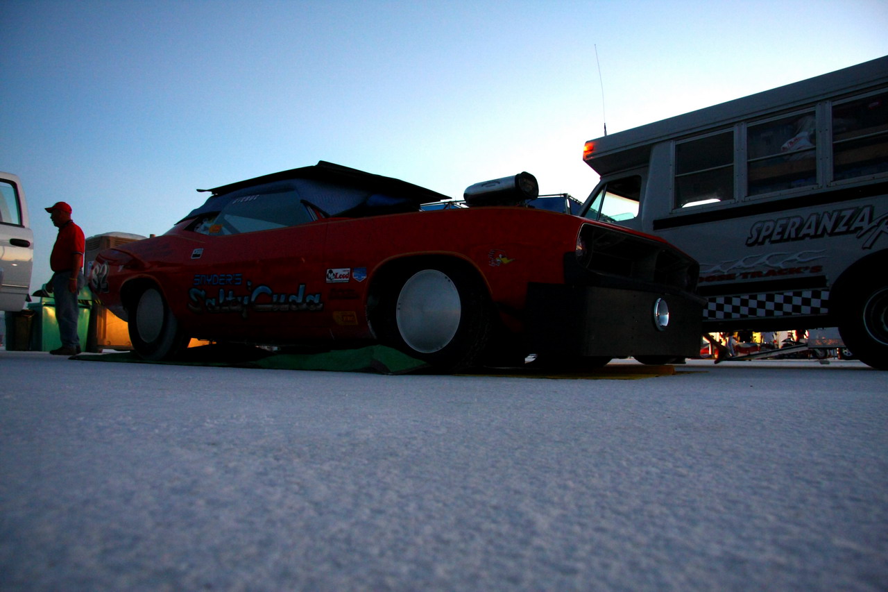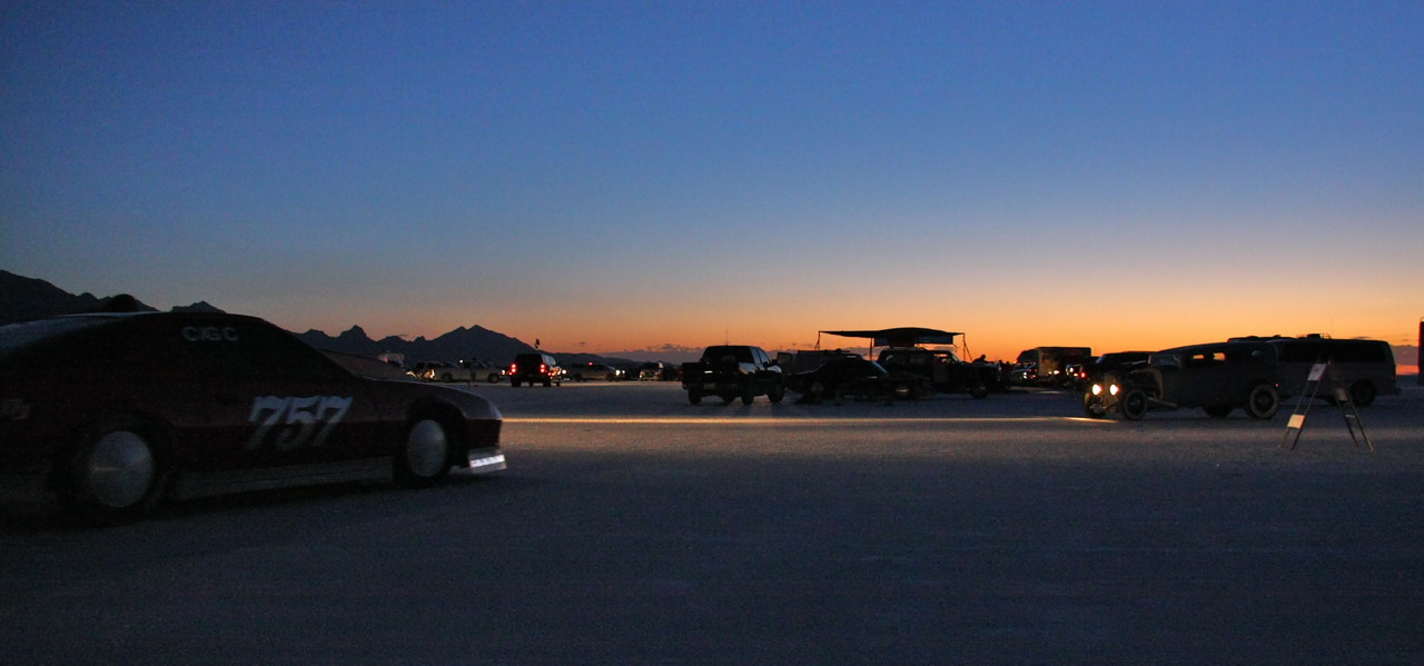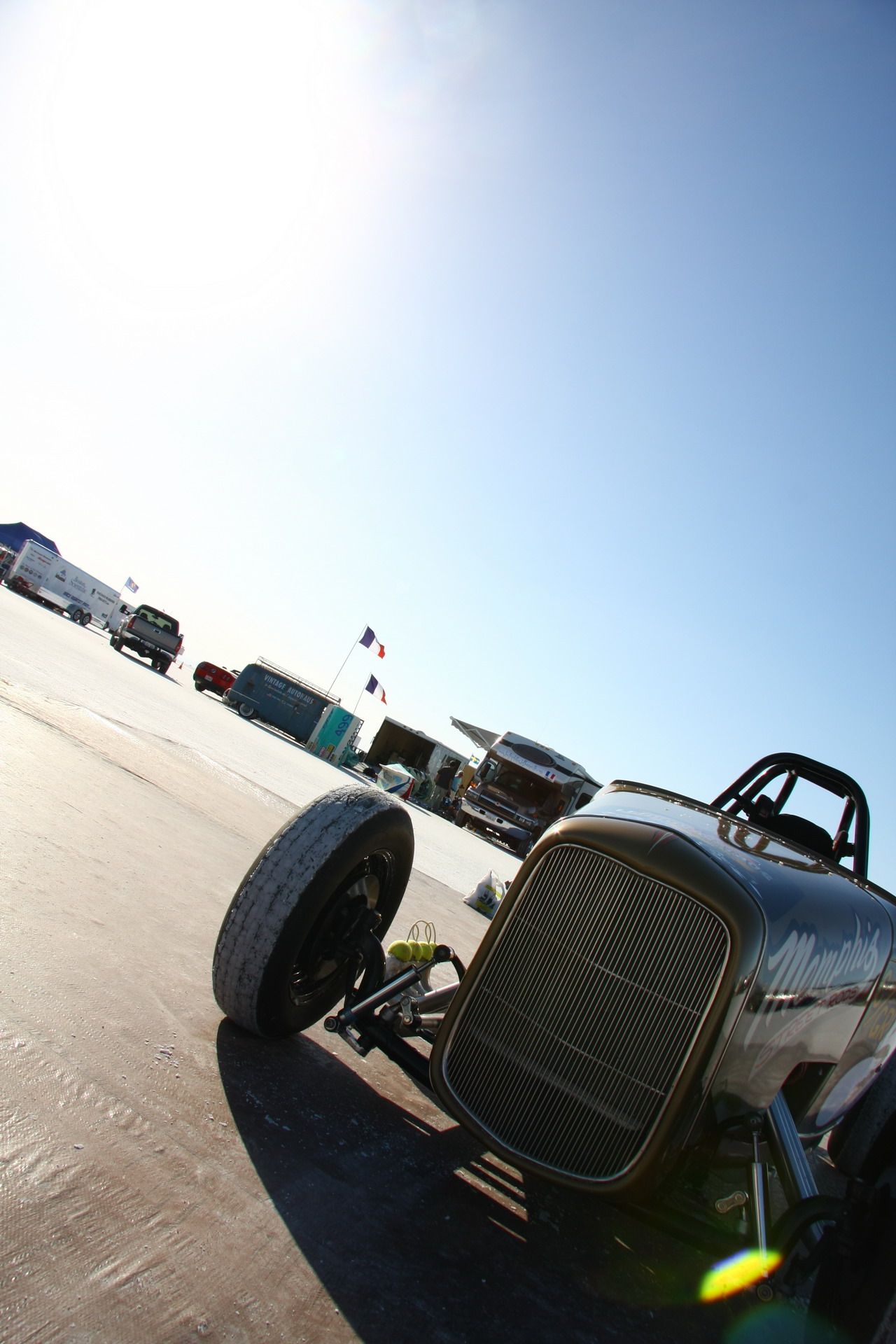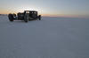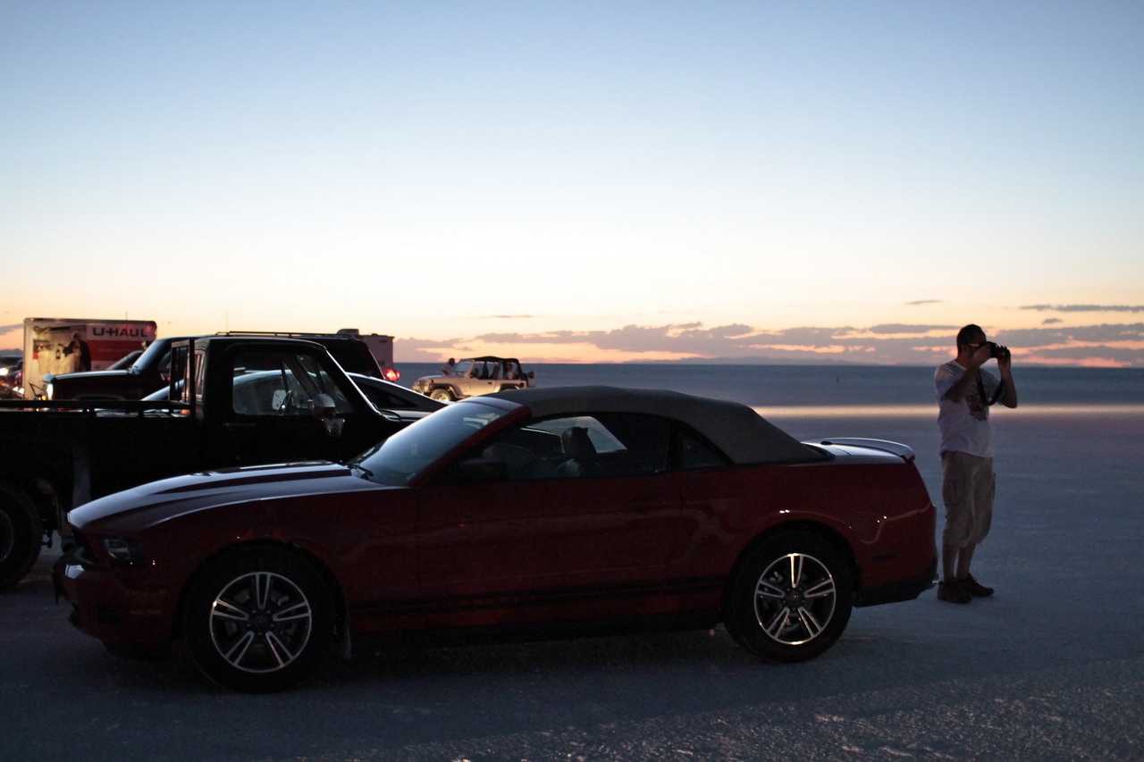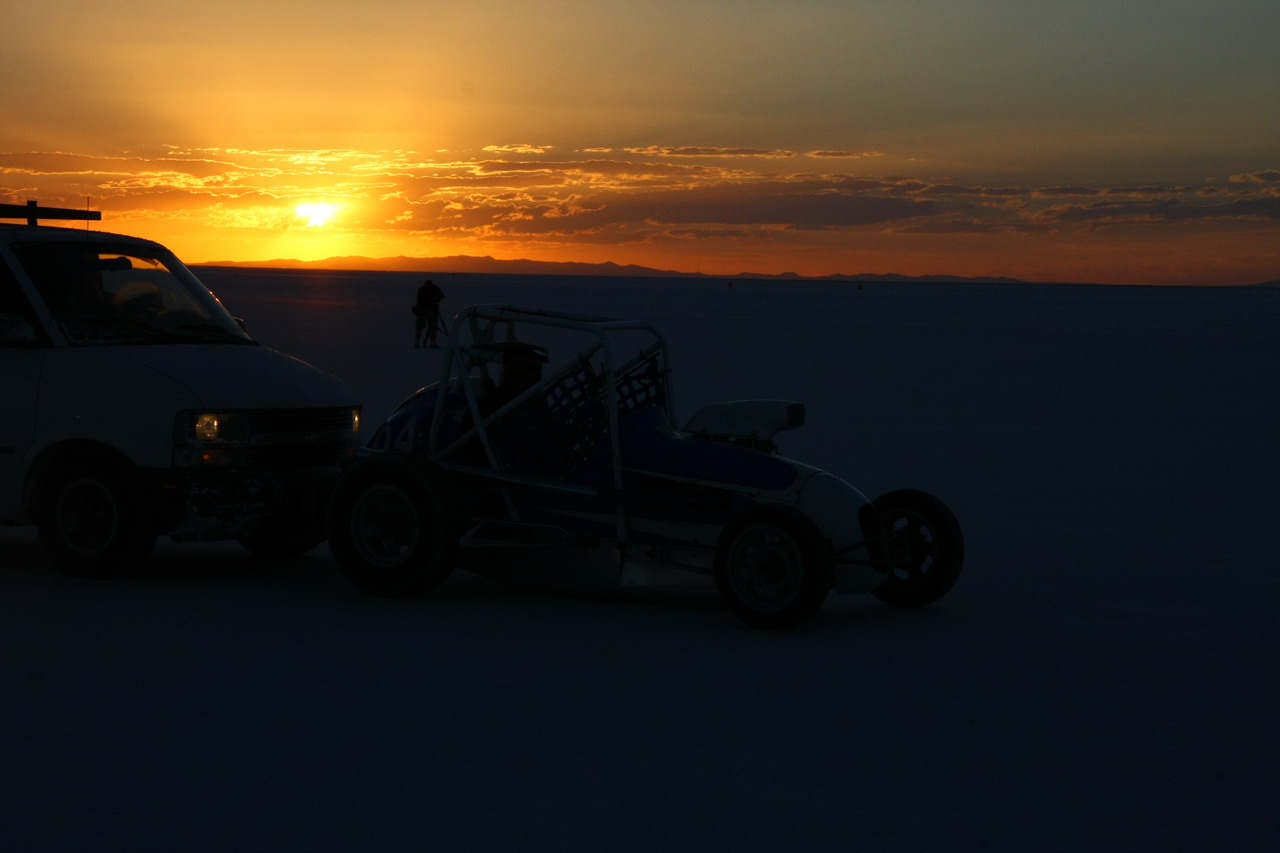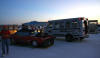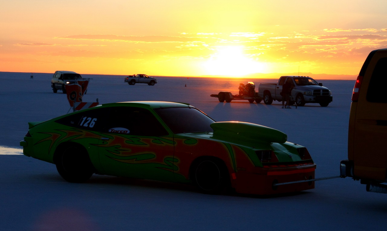 et nous n'allons pas être déçu coté sensations, émotions, spectacle et beauté.... nous quittons donc Wendover à 6h00 du mat, il fait une température idéale pour rouler en Stang décapotée (déjà 86°F soit 30°C!!), il fait nuit noire, nous nous dirigeons vers l'est et découvrons enfin le fameux panneau "Bonneville Speedway Exit 4", nous prenons la bretelle et nous engageons sur une route goudronnée entourée d'une immensité plate, il fait tellement noir que nous ne distinguons absolument rien autour, heureusement nous ne sommes pas seuls et nous guidons sur les feux rouges devant nous .... puis, à un moment un petit dévers en pente devant nous, que nous descendons, puis plus rien, plus de goudron, plus de traces, rien, le vide total, l'immensité totale.... Franck Sinatra à la radio, le moment est grandiose.... nous continuons quand même, à allure réduite, sans aucun repère, sur une surface totalement étrangère mais où la Stang se comporte plutôt bien, puis nous commençons à nous faire dépasser par des voitures sur autant de pistes parallèles qu'il peut y avoir de feux rouges !! Nous les suivons donc, et sans s'en rendre compte vu qu'il fait toujours nuit noire et au bout de quelques miles, nous pénétrons en Stang à l'intérieur de l'Impound, c'est genre comme si vous rentriez dans un paddock de F1 et que vous circuliez en voiture à travers les semis transportant les voitures, les motorhomes sans que vous en vous en rendiez compte, de la folie pure, la magie de Bonneville !! c'est après avoir fait le tour et stationné la Stang que nous nous rendons compte que nous étions dans le sanctuaire de l'Impound, nous prenons alors nos armes photographiques, et là, le spectacle son et lumière commence ....