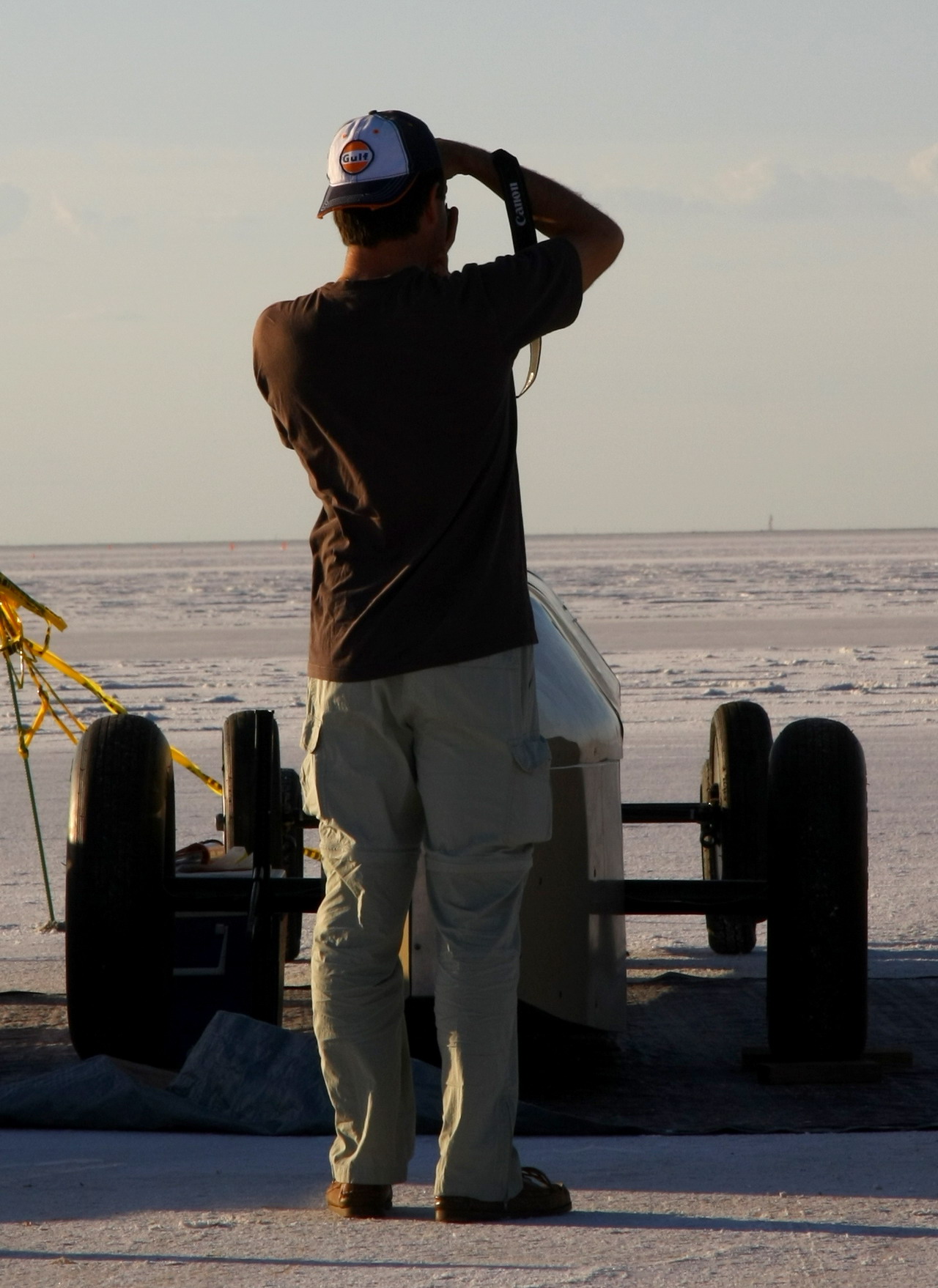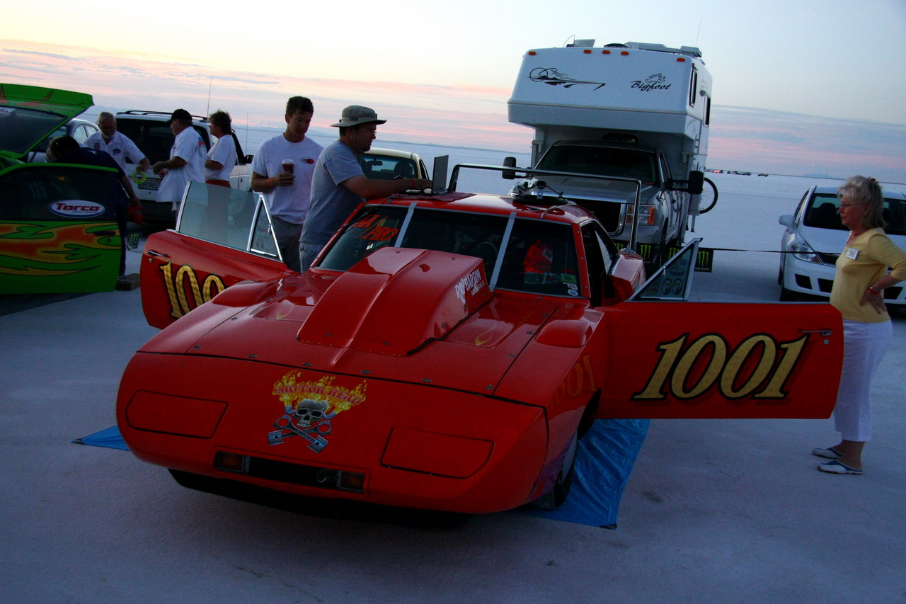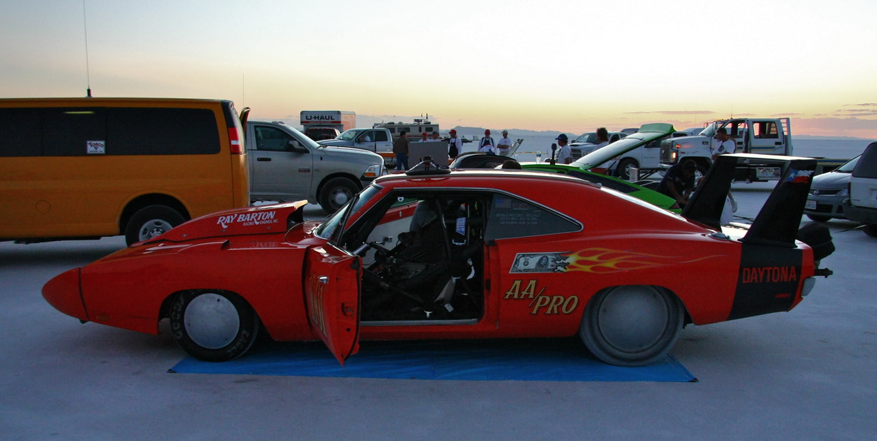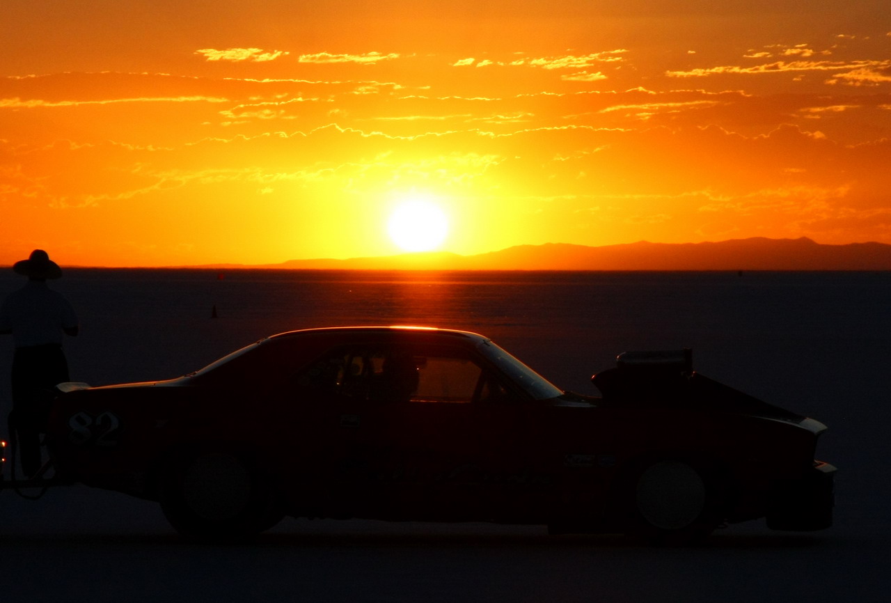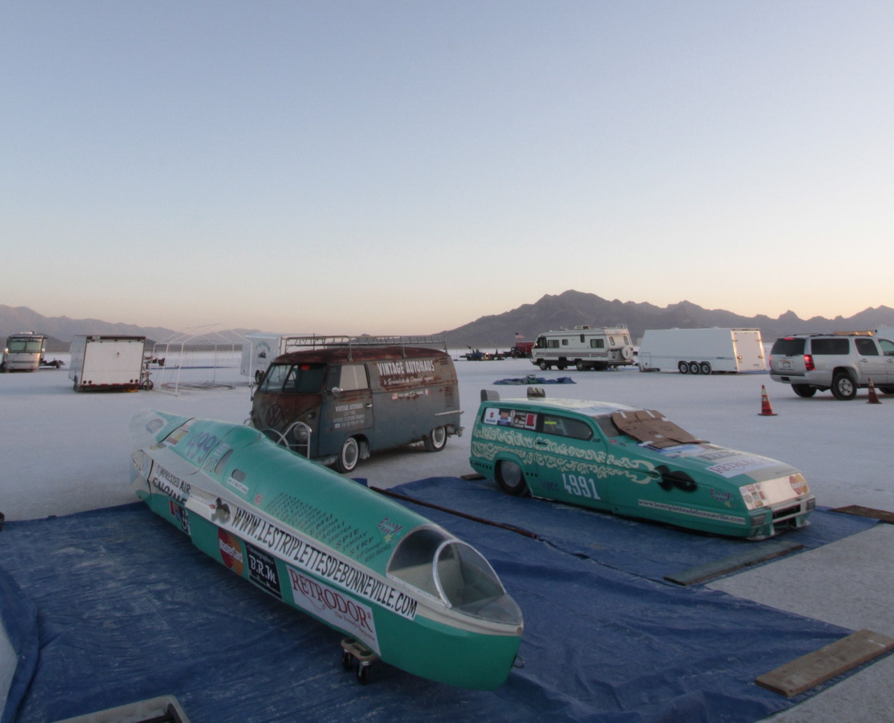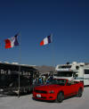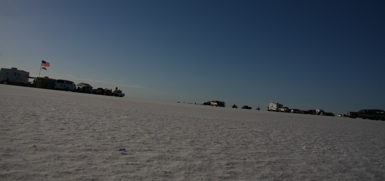 et nous n'allons pas être déçu coté sensations, émotions, spectacle et beauté.... nous quittons donc Wendover à 6h00 du mat, il fait une température idéale pour rouler en Stang décapotée (déjà 86°F soit 30°C!!), il fait nuit noire, nous nous dirigeons vers l'est et découvrons enfin le fameux panneau "Bonneville Speedway Exit 4", nous prenons la bretelle et nous engageons sur une route goudronnée entourée d'une immensité plate, il fait tellement noir que nous ne distinguons absolument rien autour, heureusement nous ne sommes pas seuls et nous guidons sur les feux rouges devant nous .... puis, à un moment un petit dévers en pente devant nous, que nous descendons, puis plus rien, plus de goudron, plus de traces, rien, le vide total, l'immensité totale.... Franck Sinatra à la radio, le moment est grandiose.... nous continuons quand même, à allure réduite, sans aucun repère, sur une surface totalement étrangère mais où la Stang se comporte plutôt bien, puis nous commençons à nous faire dépasser par des voitures sur autant de pistes parallèles qu'il peut y avoir de feux rouges !! Nous les suivons donc, et sans s'en rendre compte vu qu'il fait toujours nuit noire et au bout de quelques miles, nous pénétrons en Stang à l'intérieur de l'Impound, c'est genre comme si vous rentriez dans un paddock de F1 et que vous circuliez en voiture à travers les semis transportant les voitures, les motorhomes sans que vous en vous en rendiez compte, de la folie pure, la magie de Bonneville !! c'est après avoir fait le tour et stationné la Stang que nous nous rendons compte que nous étions dans le sanctuaire de l'Impound, nous prenons alors nos armes photographiques, et là, le spectacle son et lumière commence ....