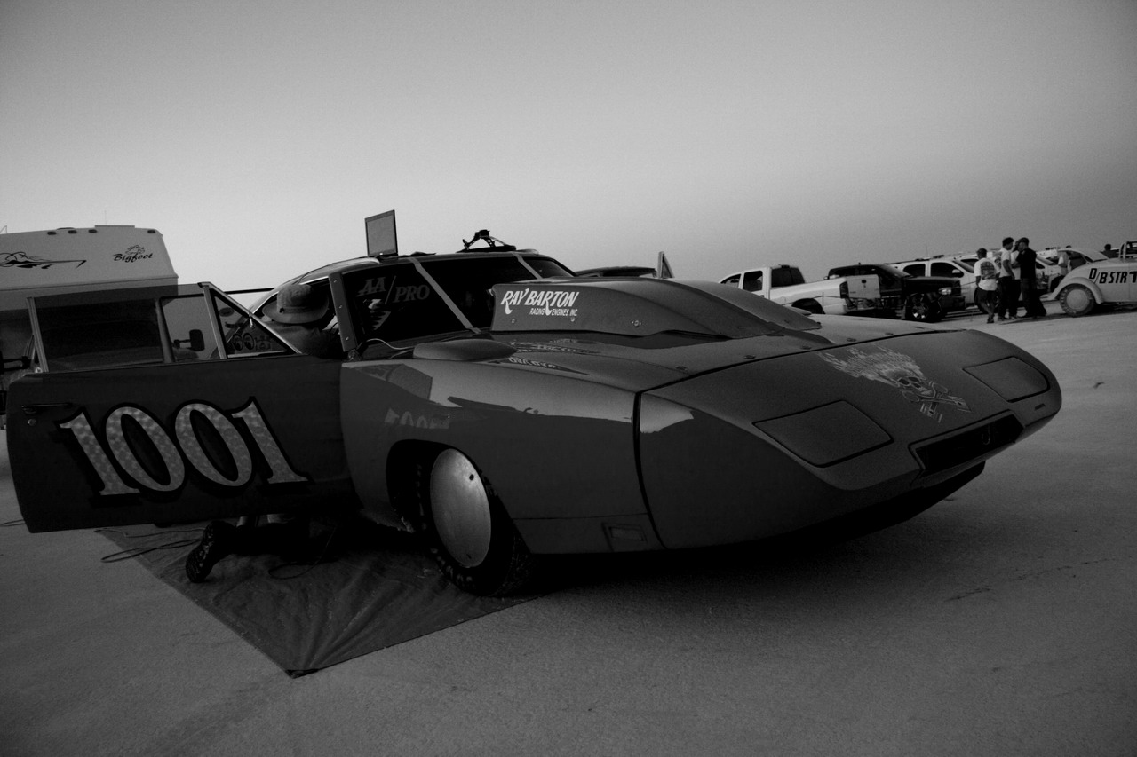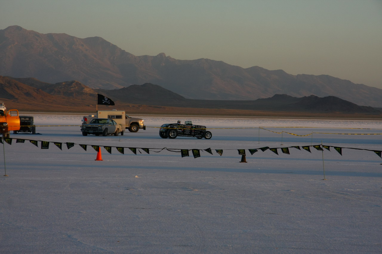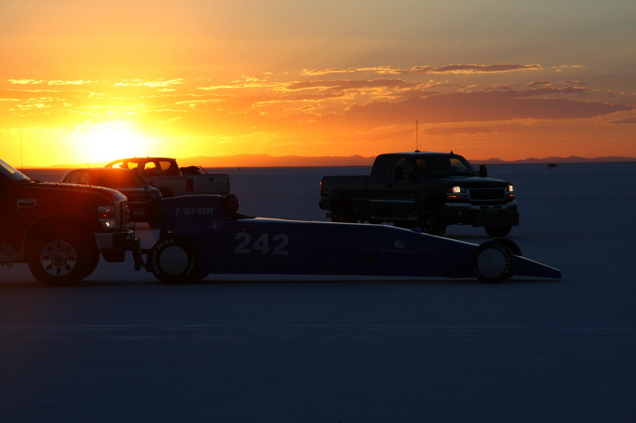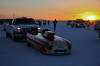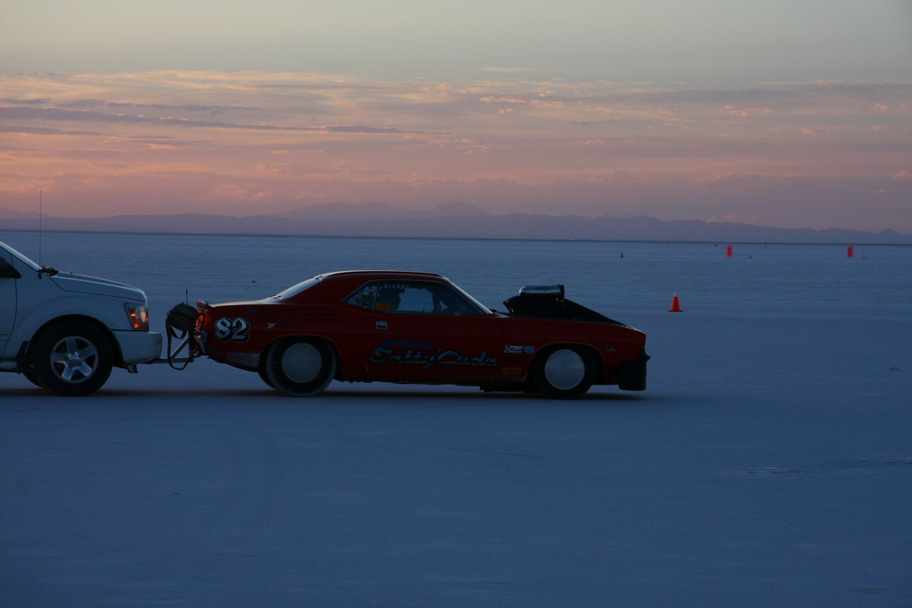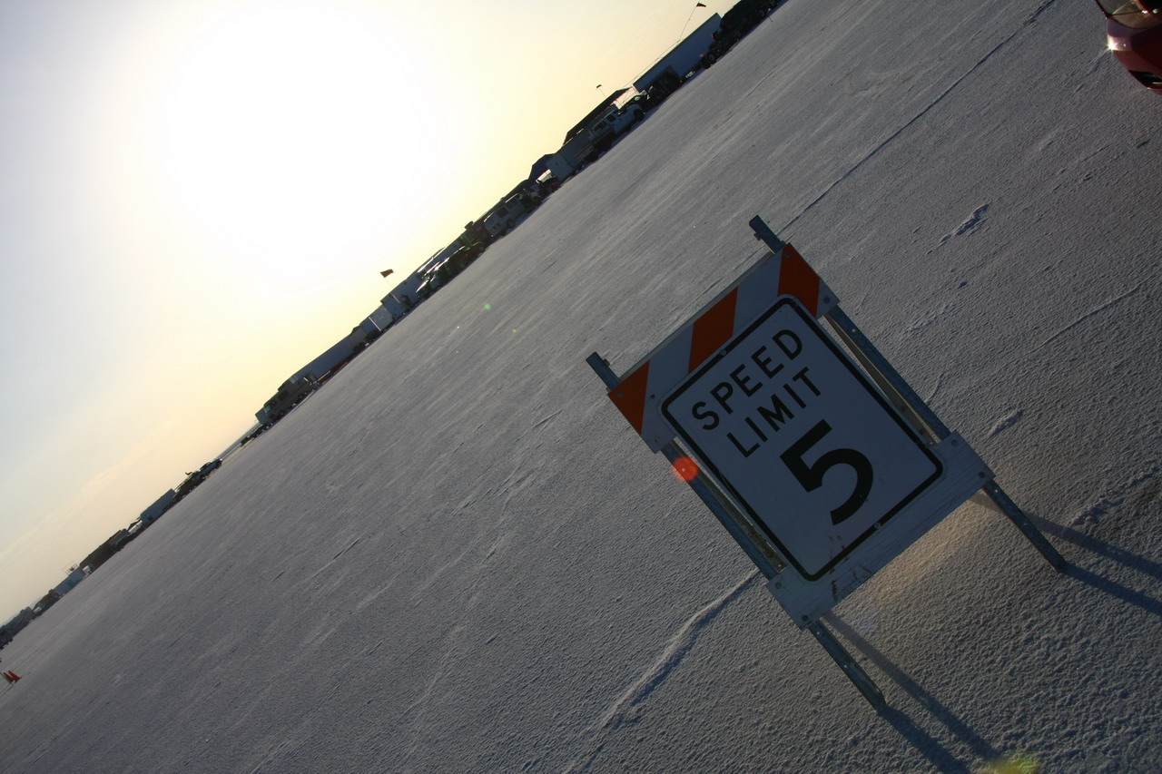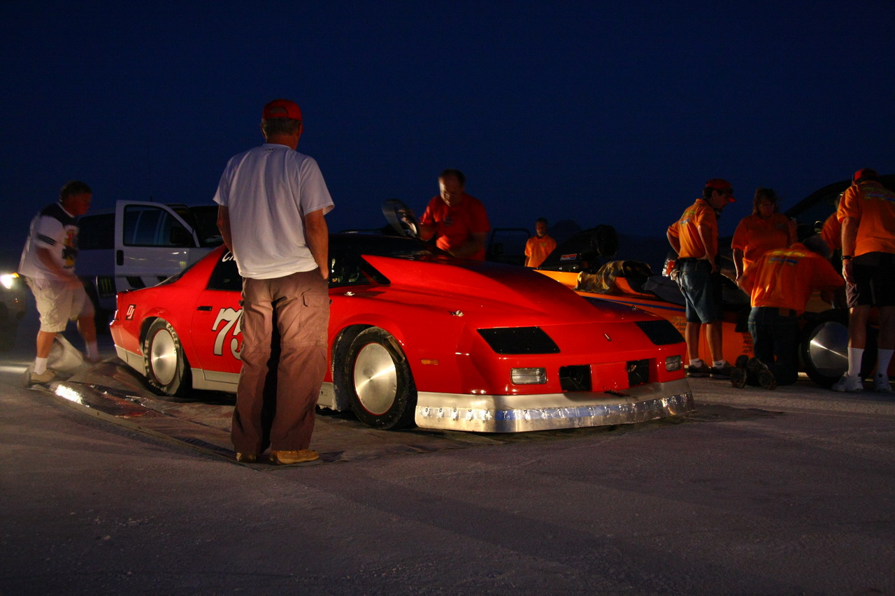 et nous n'allons pas être déçu coté sensations, émotions, spectacle et beauté.... nous quittons donc Wendover à 6h00 du mat, il fait une température idéale pour rouler en Stang décapotée (déjà 86°F soit 30°C!!), il fait nuit noire, nous nous dirigeons vers l'est et découvrons enfin le fameux panneau "Bonneville Speedway Exit 4", nous prenons la bretelle et nous engageons sur une route goudronnée entourée d'une immensité plate, il fait tellement noir que nous ne distinguons absolument rien autour, heureusement nous ne sommes pas seuls et nous guidons sur les feux rouges devant nous .... puis, à un moment un petit dévers en pente devant nous, que nous descendons, puis plus rien, plus de goudron, plus de traces, rien, le vide total, l'immensité totale.... Franck Sinatra à la radio, le moment est grandiose.... nous continuons quand même, à allure réduite, sans aucun repère, sur une surface totalement étrangère mais où la Stang se comporte plutôt bien, puis nous commençons à nous faire dépasser par des voitures sur autant de pistes parallèles qu'il peut y avoir de feux rouges !! Nous les suivons donc, et sans s'en rendre compte vu qu'il fait toujours nuit noire et au bout de quelques miles, nous pénétrons en Stang à l'intérieur de l'Impound, c'est genre comme si vous rentriez dans un paddock de F1 et que vous circuliez en voiture à travers les semis transportant les voitures, les motorhomes sans que vous en vous en rendiez compte, de la folie pure, la magie de Bonneville !! c'est après avoir fait le tour et stationné la Stang que nous nous rendons compte que nous étions dans le sanctuaire de l'Impound, nous prenons alors nos armes photographiques, et là, le spectacle son et lumière commence ....