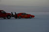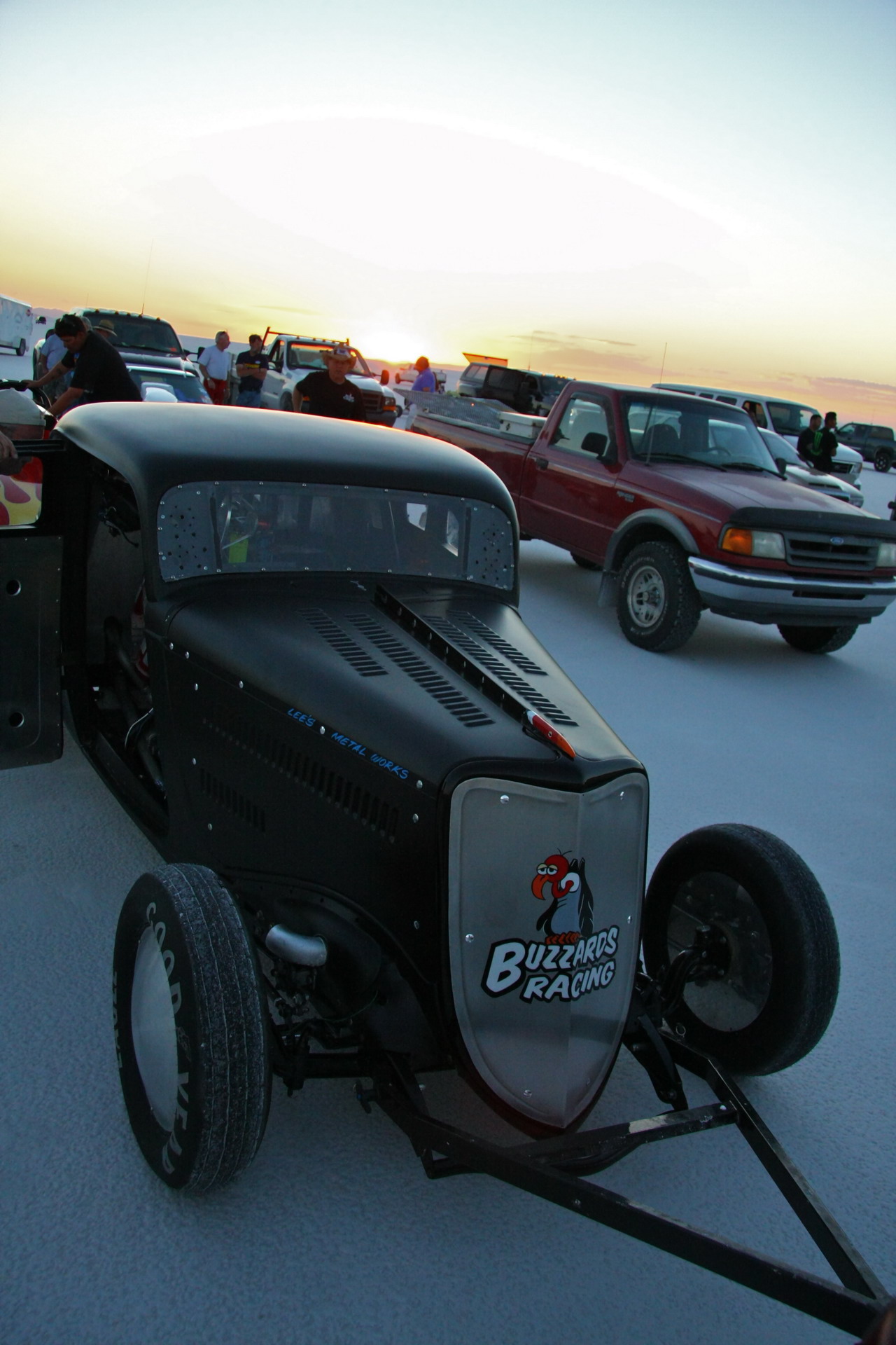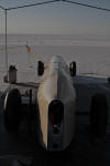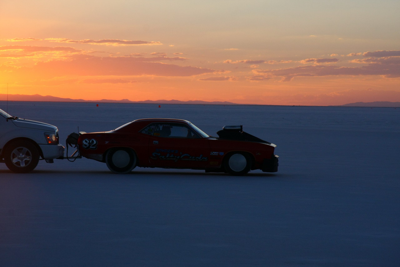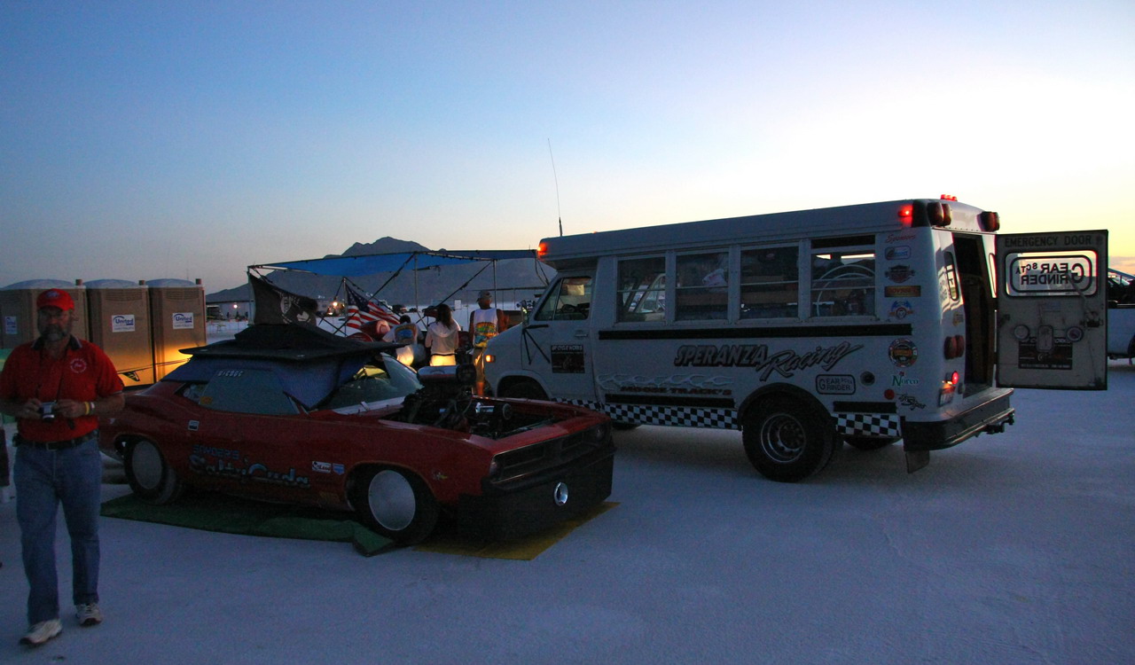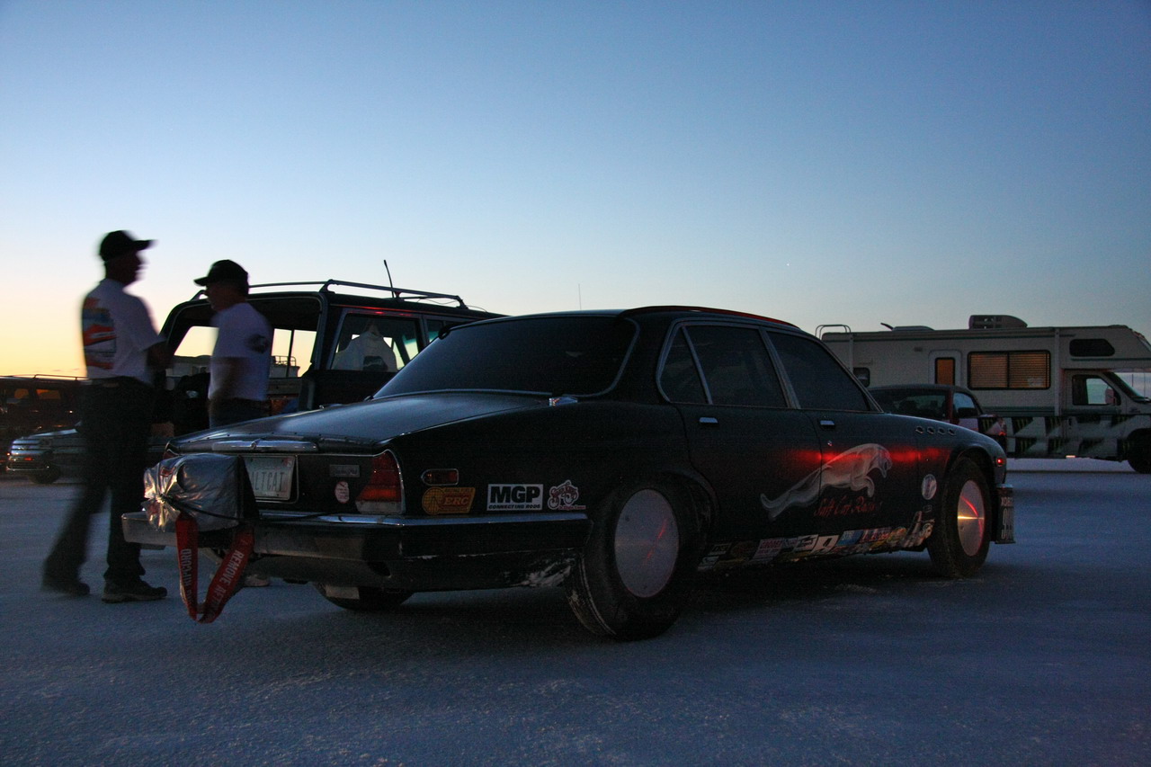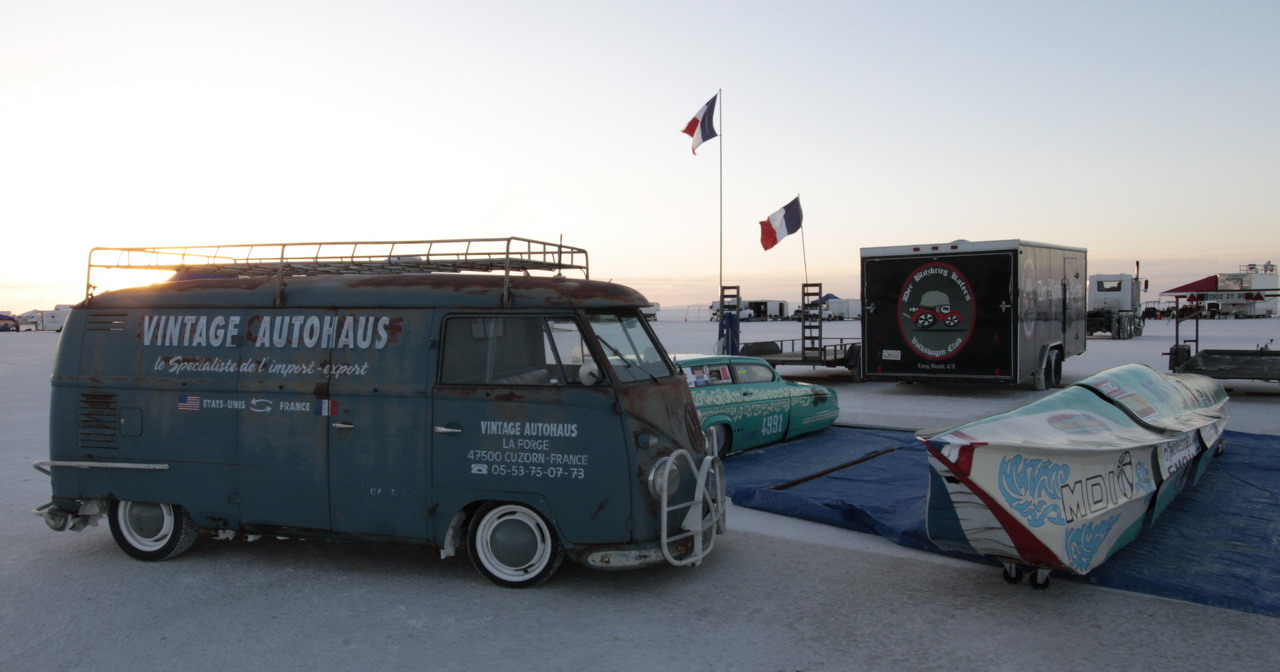 et nous n'allons pas être déçu coté sensations, émotions, spectacle et beauté.... nous quittons donc Wendover à 6h00 du mat, il fait une température idéale pour rouler en Stang décapotée (déjà 86°F soit 30°C!!), il fait nuit noire, nous nous dirigeons vers l'est et découvrons enfin le fameux panneau "Bonneville Speedway Exit 4", nous prenons la bretelle et nous engageons sur une route goudronnée entourée d'une immensité plate, il fait tellement noir que nous ne distinguons absolument rien autour, heureusement nous ne sommes pas seuls et nous guidons sur les feux rouges devant nous .... puis, à un moment un petit dévers en pente devant nous, que nous descendons, puis plus rien, plus de goudron, plus de traces, rien, le vide total, l'immensité totale.... Franck Sinatra à la radio, le moment est grandiose.... nous continuons quand même, à allure réduite, sans aucun repère, sur une surface totalement étrangère mais où la Stang se comporte plutôt bien, puis nous commençons à nous faire dépasser par des voitures sur autant de pistes parallèles qu'il peut y avoir de feux rouges !! Nous les suivons donc, et sans s'en rendre compte vu qu'il fait toujours nuit noire et au bout de quelques miles, nous pénétrons en Stang à l'intérieur de l'Impound, c'est genre comme si vous rentriez dans un paddock de F1 et que vous circuliez en voiture à travers les semis transportant les voitures, les motorhomes sans que vous en vous en rendiez compte, de la folie pure, la magie de Bonneville !! c'est après avoir fait le tour et stationné la Stang que nous nous rendons compte que nous étions dans le sanctuaire de l'Impound, nous prenons alors nos armes photographiques, et là, le spectacle son et lumière commence ....