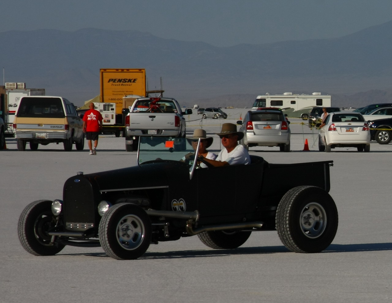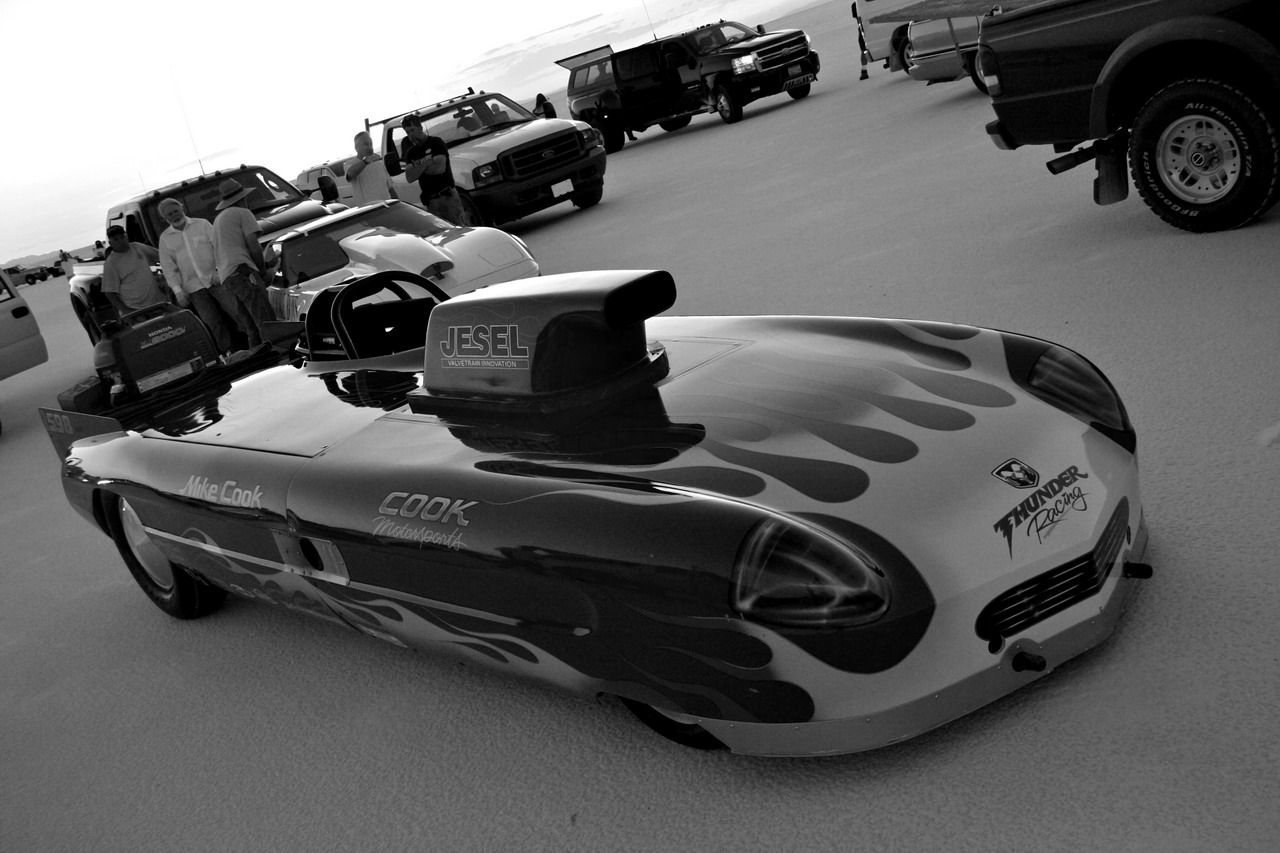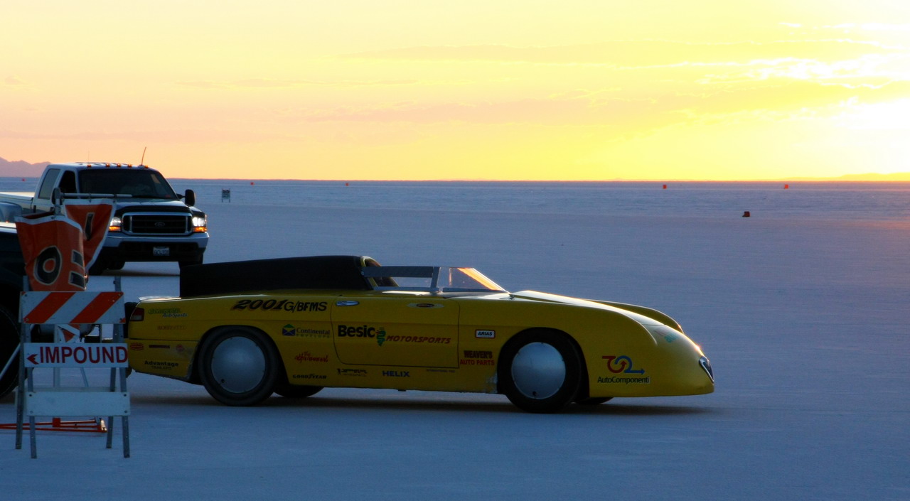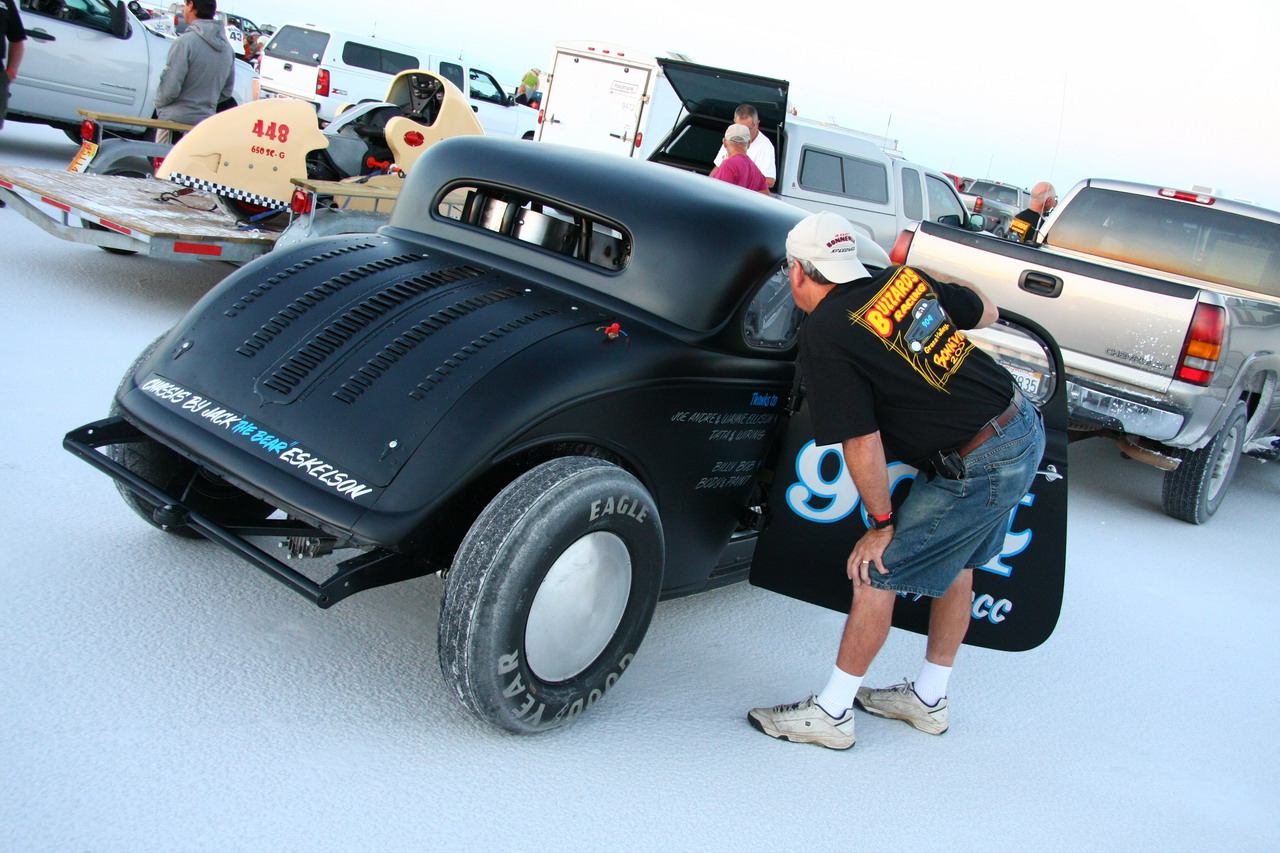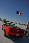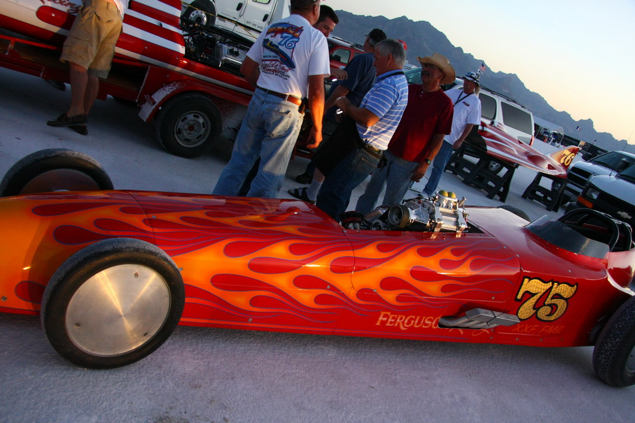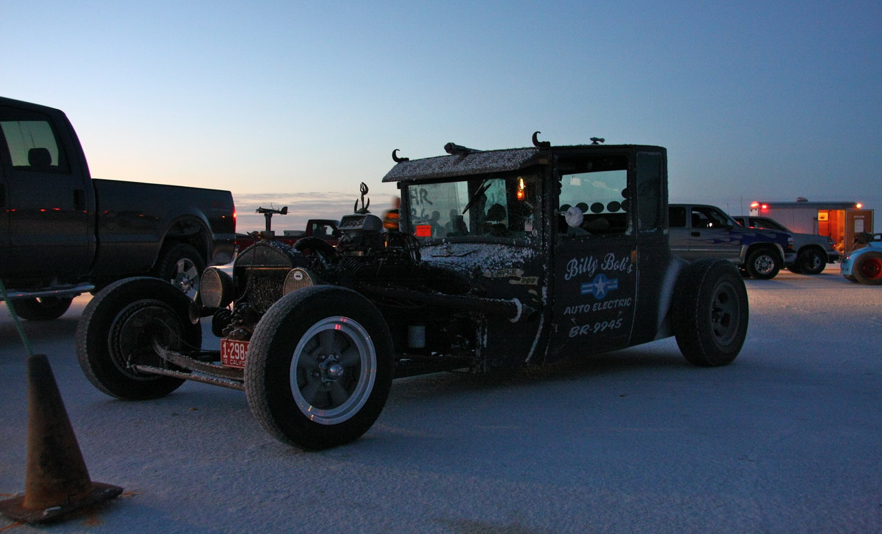 et nous n'allons pas être déçu coté sensations, émotions, spectacle et beauté.... nous quittons donc Wendover à 6h00 du mat, il fait une température idéale pour rouler en Stang décapotée (déjà 86°F soit 30°C!!), il fait nuit noire, nous nous dirigeons vers l'est et découvrons enfin le fameux panneau "Bonneville Speedway Exit 4", nous prenons la bretelle et nous engageons sur une route goudronnée entourée d'une immensité plate, il fait tellement noir que nous ne distinguons absolument rien autour, heureusement nous ne sommes pas seuls et nous guidons sur les feux rouges devant nous .... puis, à un moment un petit dévers en pente devant nous, que nous descendons, puis plus rien, plus de goudron, plus de traces, rien, le vide total, l'immensité totale.... Franck Sinatra à la radio, le moment est grandiose.... nous continuons quand même, à allure réduite, sans aucun repère, sur une surface totalement étrangère mais où la Stang se comporte plutôt bien, puis nous commençons à nous faire dépasser par des voitures sur autant de pistes parallèles qu'il peut y avoir de feux rouges !! Nous les suivons donc, et sans s'en rendre compte vu qu'il fait toujours nuit noire et au bout de quelques miles, nous pénétrons en Stang à l'intérieur de l'Impound, c'est genre comme si vous rentriez dans un paddock de F1 et que vous circuliez en voiture à travers les semis transportant les voitures, les motorhomes sans que vous en vous en rendiez compte, de la folie pure, la magie de Bonneville !! c'est après avoir fait le tour et stationné la Stang que nous nous rendons compte que nous étions dans le sanctuaire de l'Impound, nous prenons alors nos armes photographiques, et là, le spectacle son et lumière commence ....