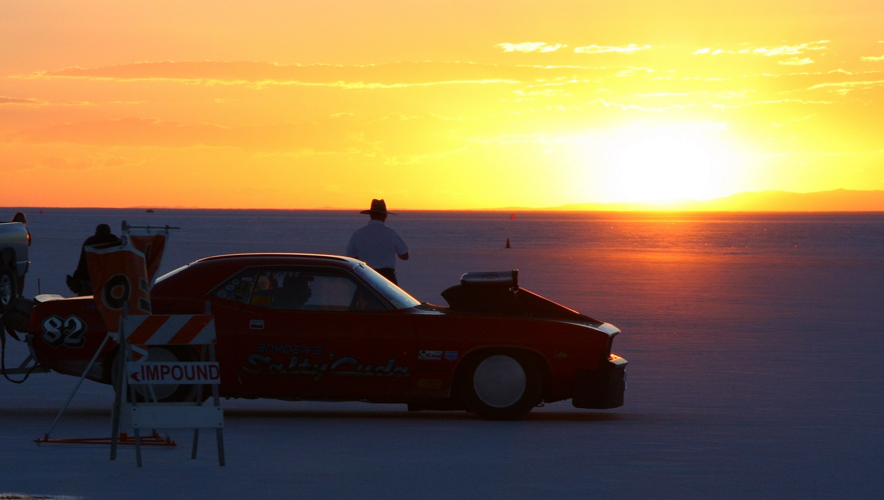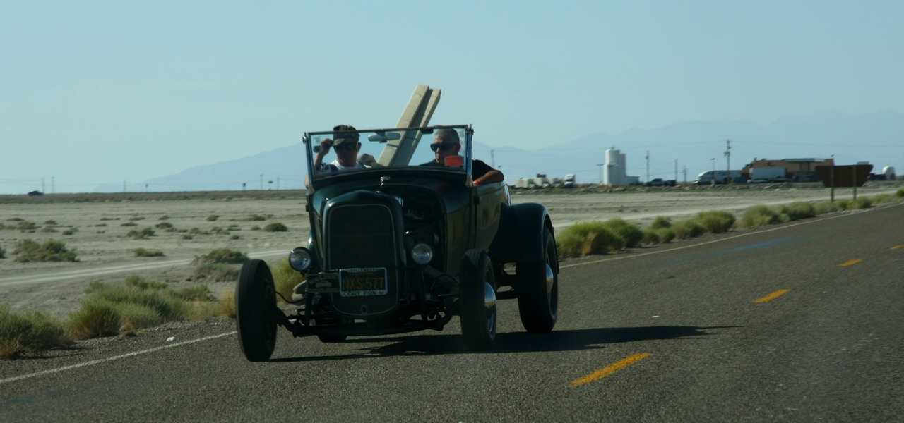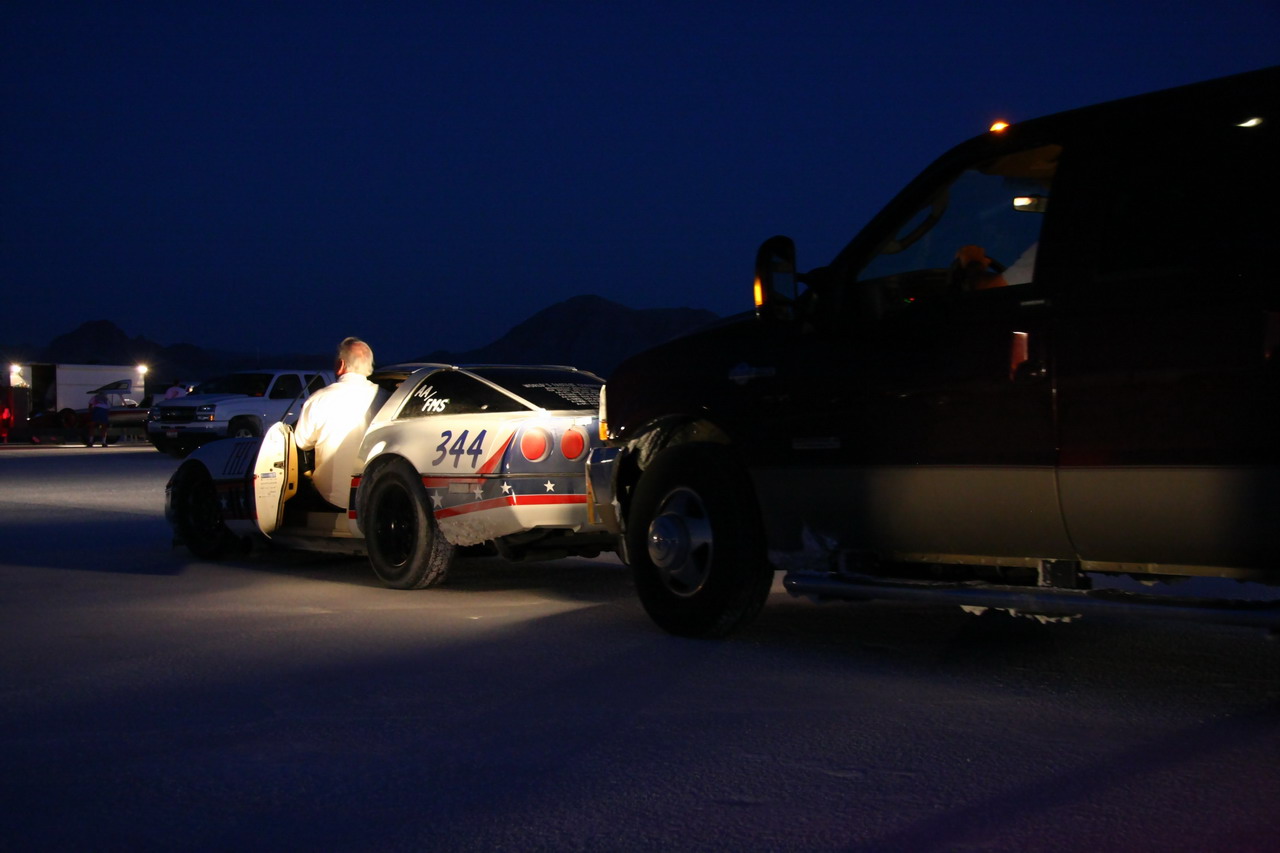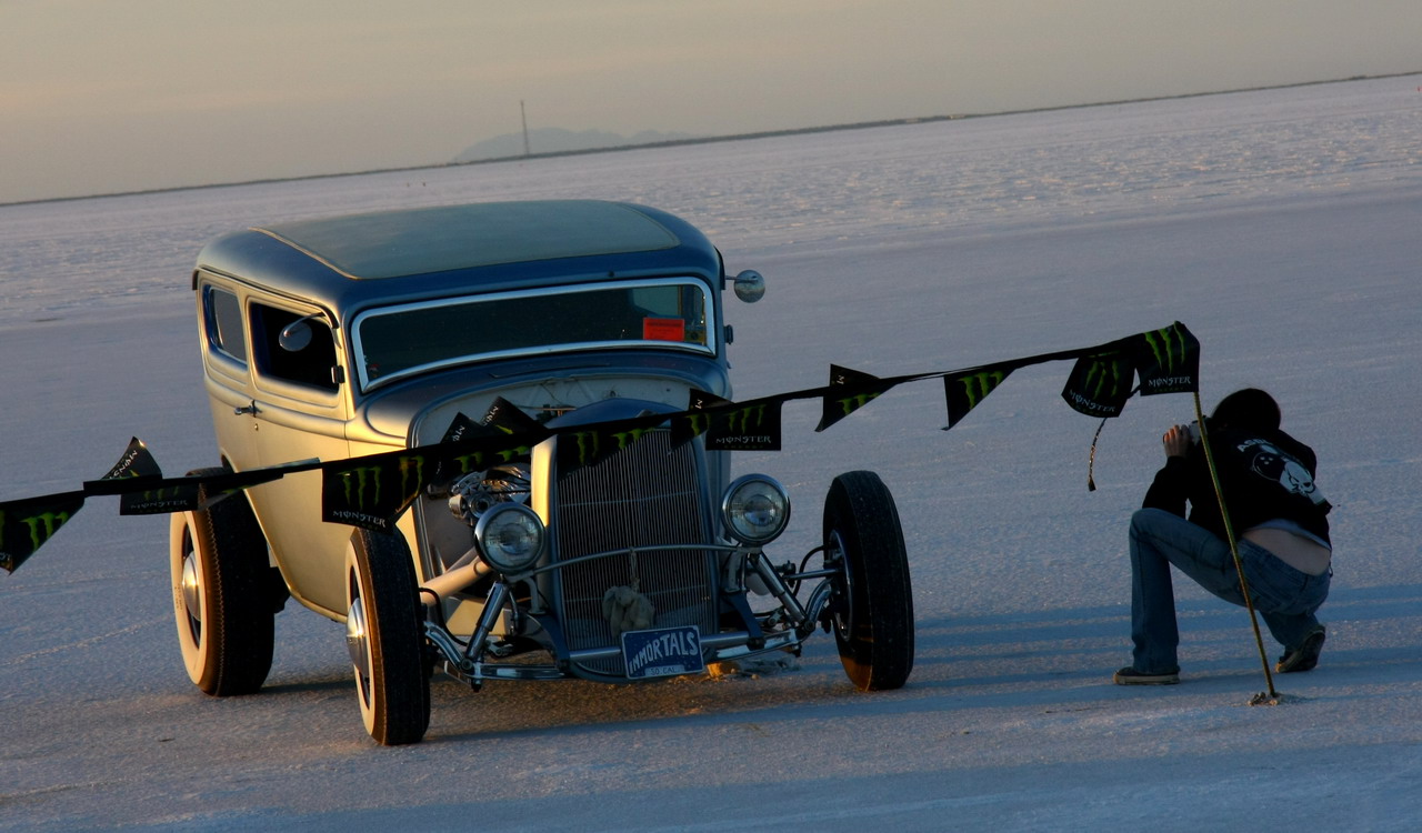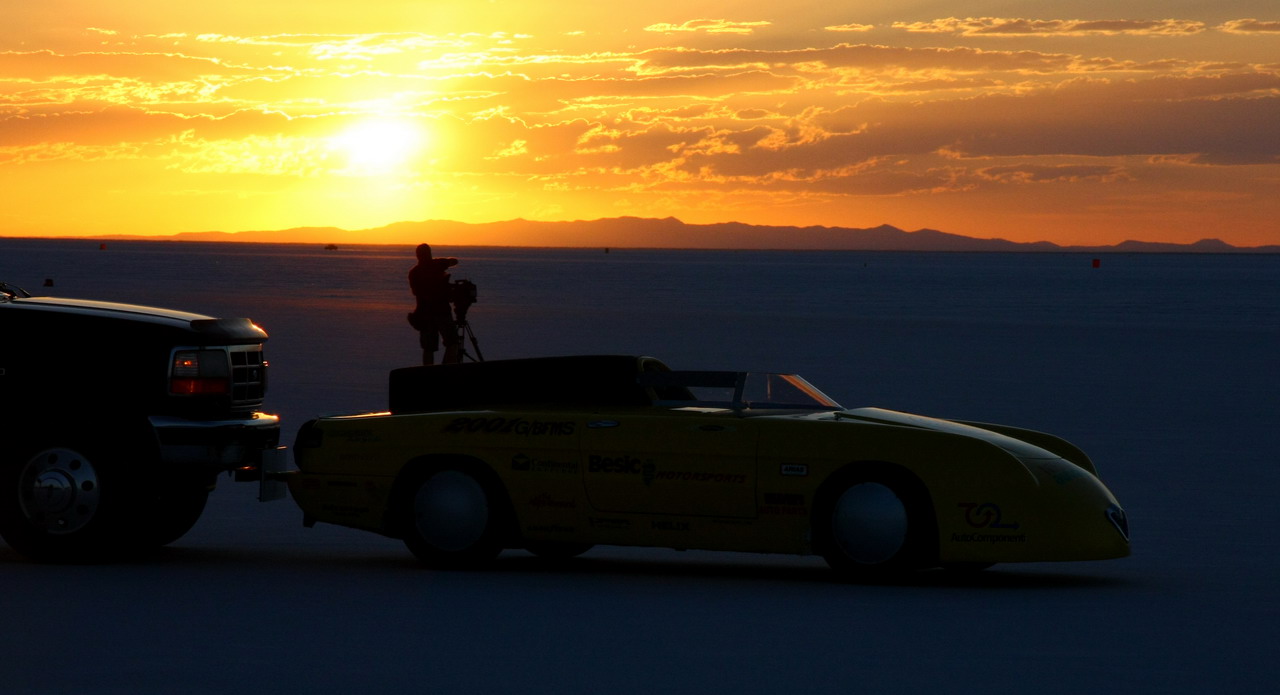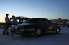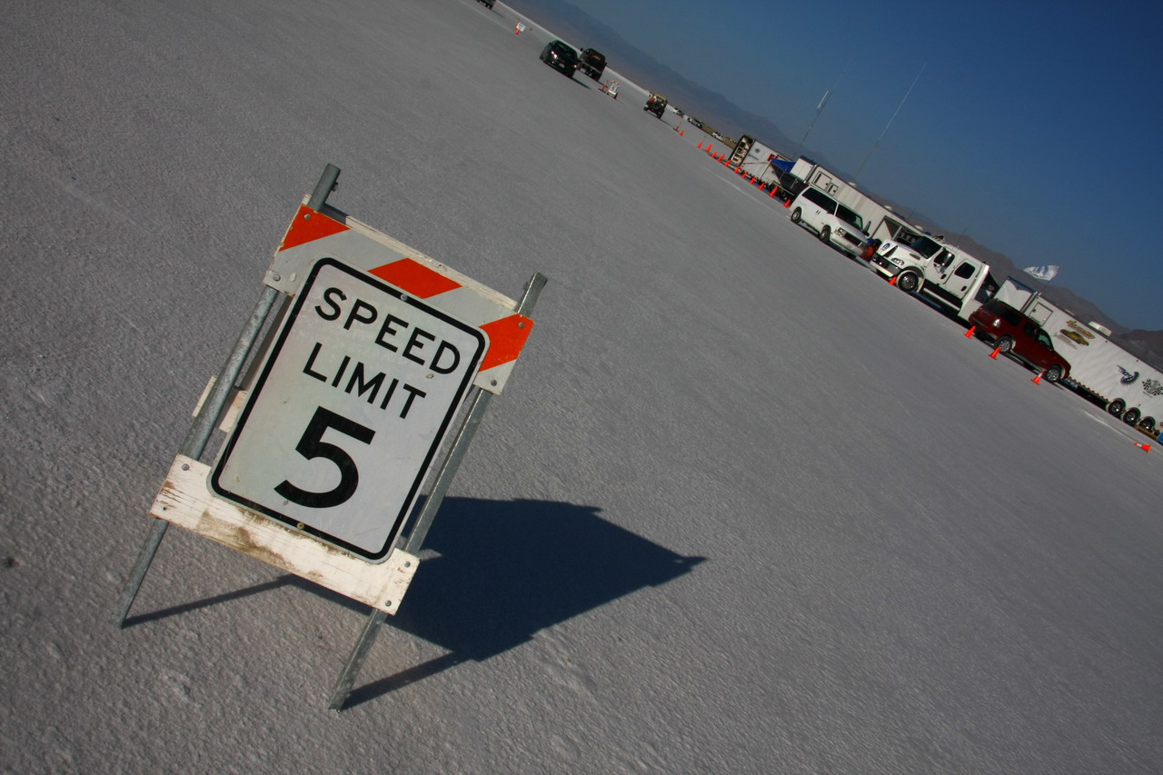 et nous n'allons pas être déçu coté sensations, émotions, spectacle et beauté.... nous quittons donc Wendover à 6h00 du mat, il fait une température idéale pour rouler en Stang décapotée (déjà 86°F soit 30°C!!), il fait nuit noire, nous nous dirigeons vers l'est et découvrons enfin le fameux panneau "Bonneville Speedway Exit 4", nous prenons la bretelle et nous engageons sur une route goudronnée entourée d'une immensité plate, il fait tellement noir que nous ne distinguons absolument rien autour, heureusement nous ne sommes pas seuls et nous guidons sur les feux rouges devant nous .... puis, à un moment un petit dévers en pente devant nous, que nous descendons, puis plus rien, plus de goudron, plus de traces, rien, le vide total, l'immensité totale.... Franck Sinatra à la radio, le moment est grandiose.... nous continuons quand même, à allure réduite, sans aucun repère, sur une surface totalement étrangère mais où la Stang se comporte plutôt bien, puis nous commençons à nous faire dépasser par des voitures sur autant de pistes parallèles qu'il peut y avoir de feux rouges !! Nous les suivons donc, et sans s'en rendre compte vu qu'il fait toujours nuit noire et au bout de quelques miles, nous pénétrons en Stang à l'intérieur de l'Impound, c'est genre comme si vous rentriez dans un paddock de F1 et que vous circuliez en voiture à travers les semis transportant les voitures, les motorhomes sans que vous en vous en rendiez compte, de la folie pure, la magie de Bonneville !! c'est après avoir fait le tour et stationné la Stang que nous nous rendons compte que nous étions dans le sanctuaire de l'Impound, nous prenons alors nos armes photographiques, et là, le spectacle son et lumière commence ....