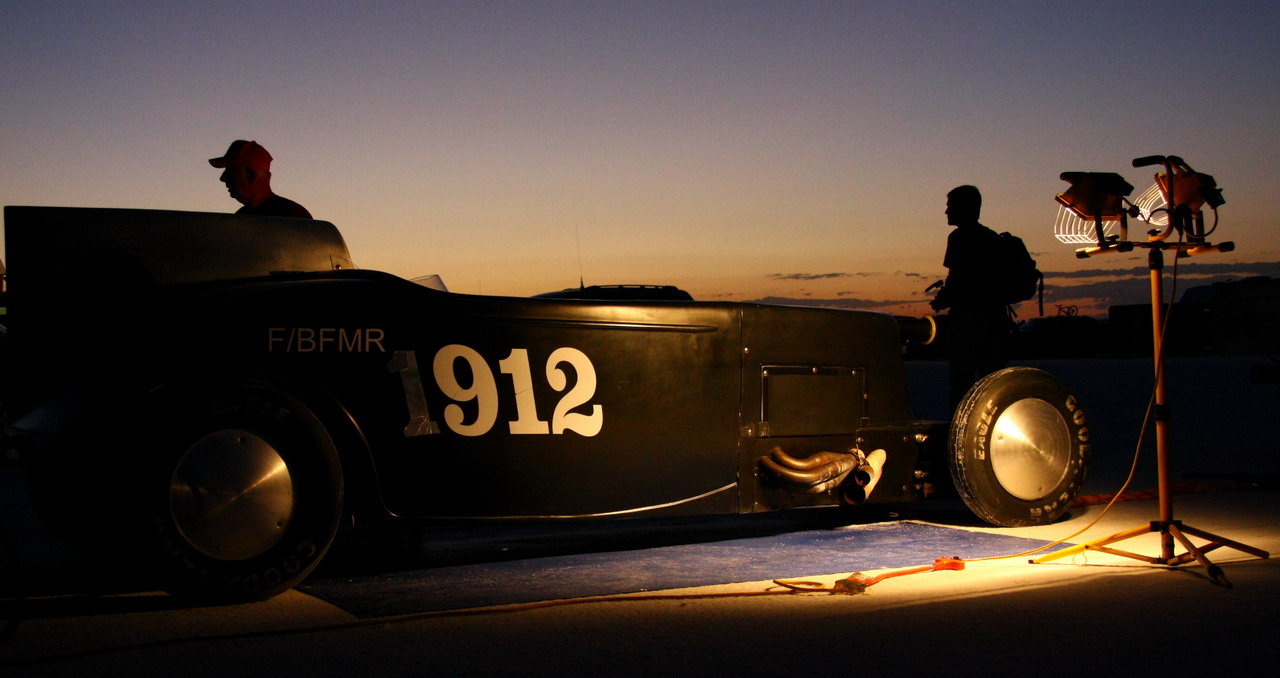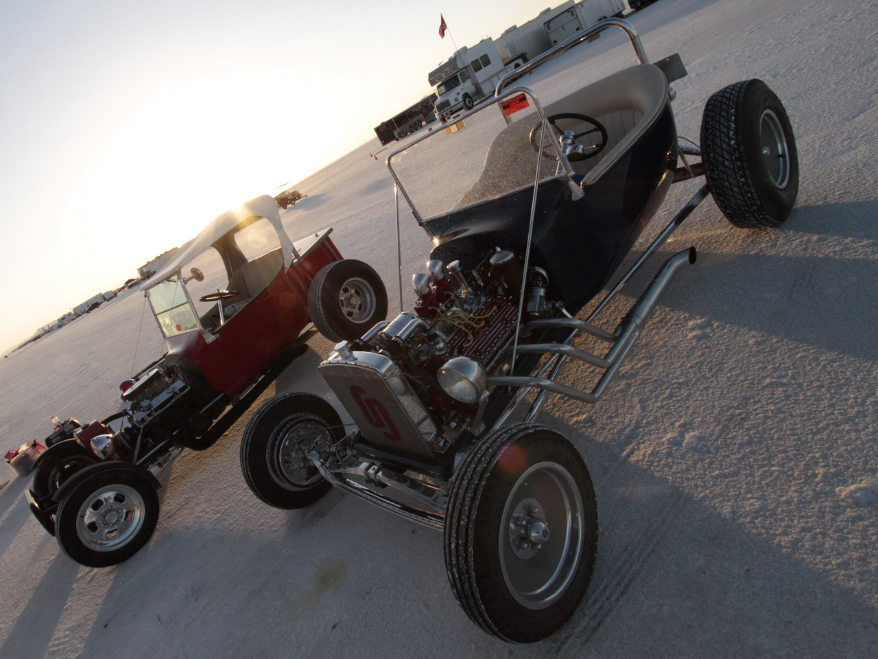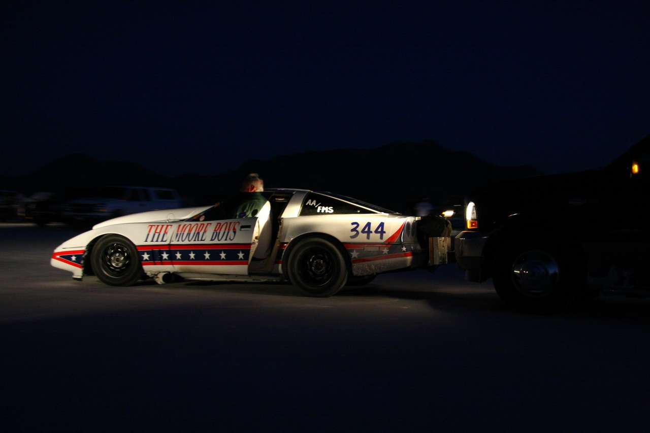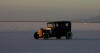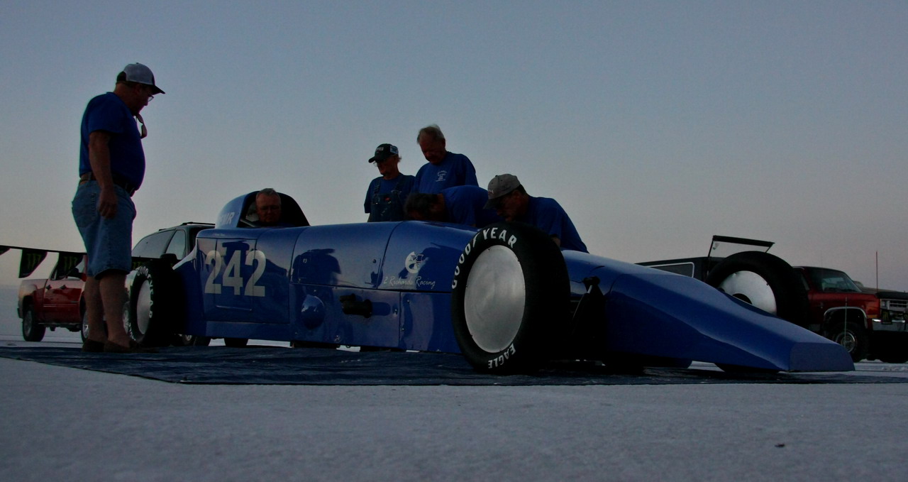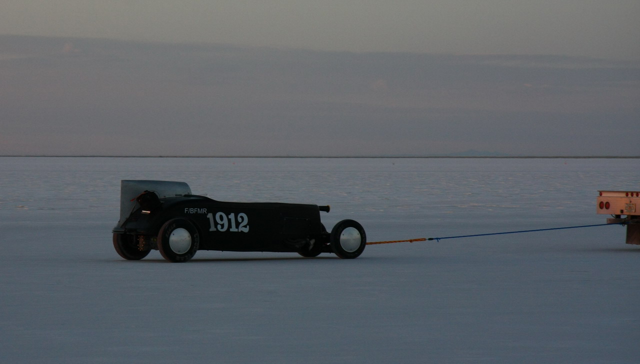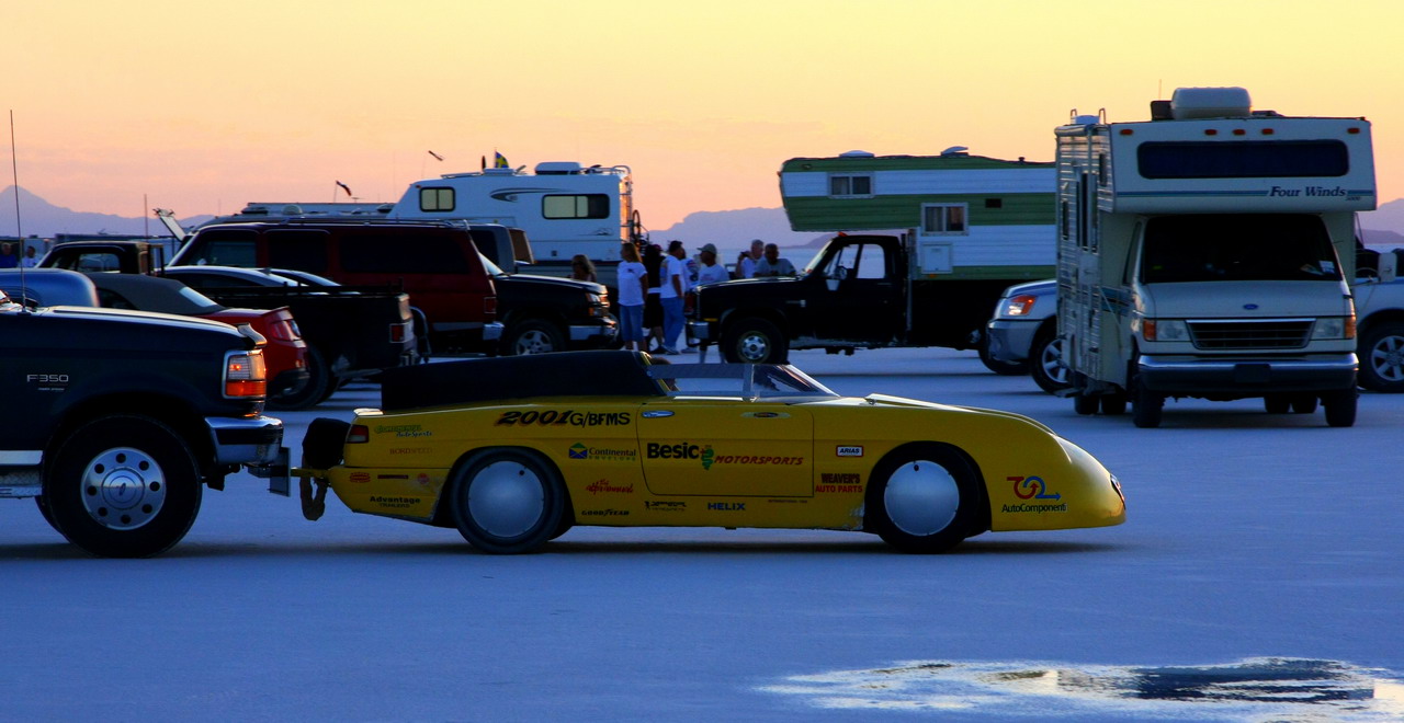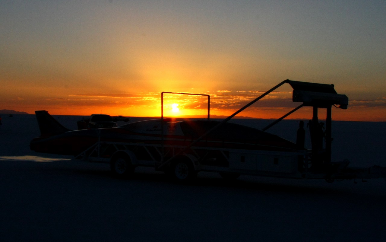 et nous n'allons pas être déçu coté sensations, émotions, spectacle et beauté.... nous quittons donc Wendover à 6h00 du mat, il fait une température idéale pour rouler en Stang décapotée (déjà 86°F soit 30°C!!), il fait nuit noire, nous nous dirigeons vers l'est et découvrons enfin le fameux panneau "Bonneville Speedway Exit 4", nous prenons la bretelle et nous engageons sur une route goudronnée entourée d'une immensité plate, il fait tellement noir que nous ne distinguons absolument rien autour, heureusement nous ne sommes pas seuls et nous guidons sur les feux rouges devant nous .... puis, à un moment un petit dévers en pente devant nous, que nous descendons, puis plus rien, plus de goudron, plus de traces, rien, le vide total, l'immensité totale.... Franck Sinatra à la radio, le moment est grandiose.... nous continuons quand même, à allure réduite, sans aucun repère, sur une surface totalement étrangère mais où la Stang se comporte plutôt bien, puis nous commençons à nous faire dépasser par des voitures sur autant de pistes parallèles qu'il peut y avoir de feux rouges !! Nous les suivons donc, et sans s'en rendre compte vu qu'il fait toujours nuit noire et au bout de quelques miles, nous pénétrons en Stang à l'intérieur de l'Impound, c'est genre comme si vous rentriez dans un paddock de F1 et que vous circuliez en voiture à travers les semis transportant les voitures, les motorhomes sans que vous en vous en rendiez compte, de la folie pure, la magie de Bonneville !! c'est après avoir fait le tour et stationné la Stang que nous nous rendons compte que nous étions dans le sanctuaire de l'Impound, nous prenons alors nos armes photographiques, et là, le spectacle son et lumière commence ....