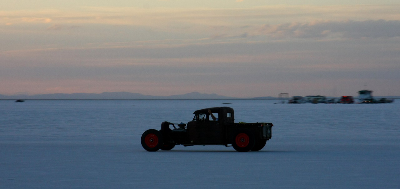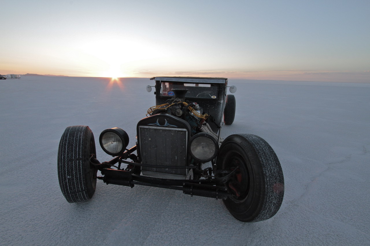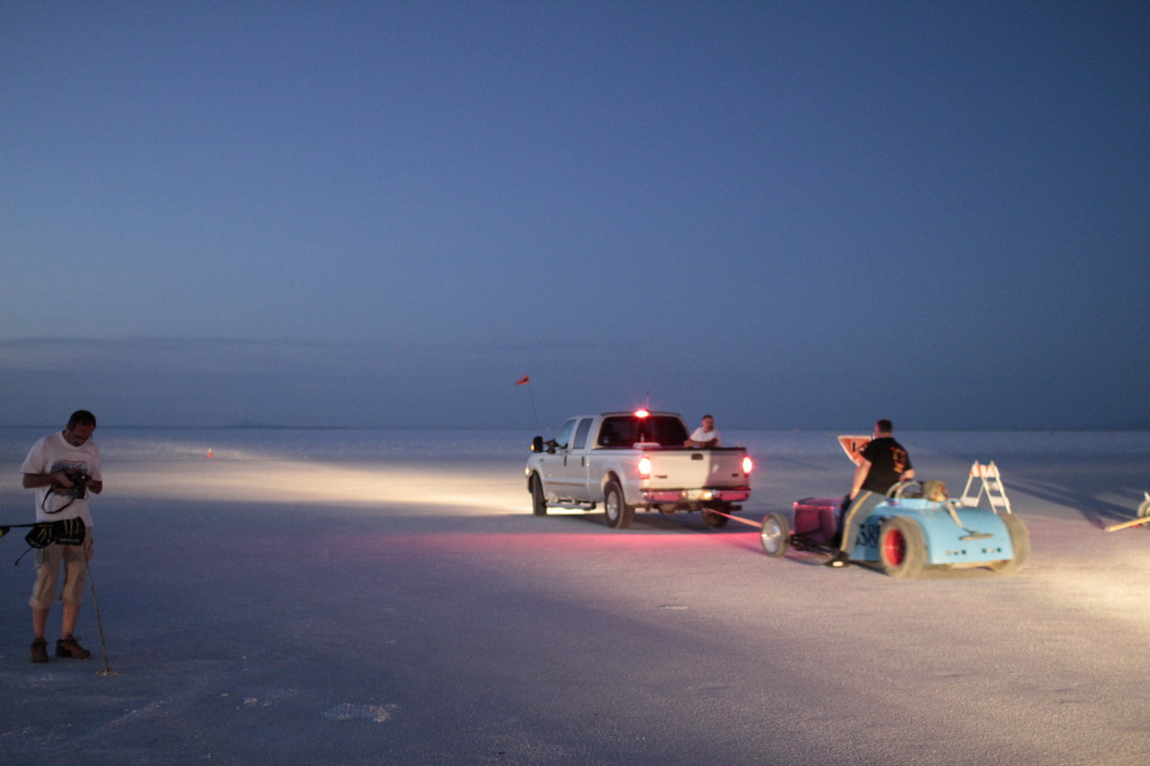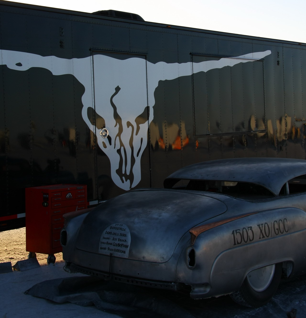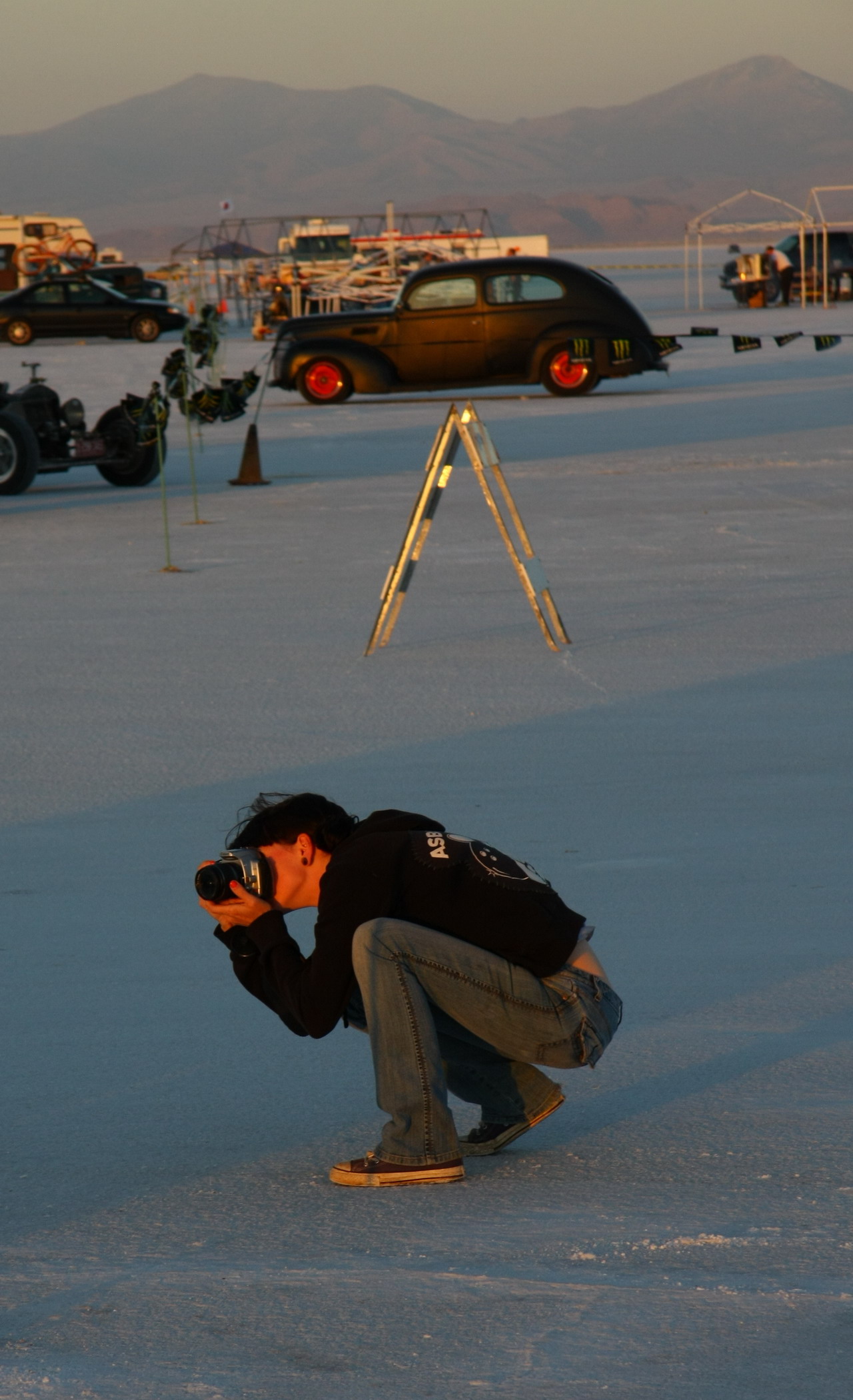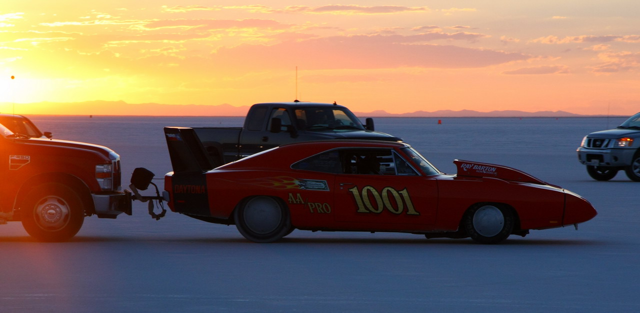 et nous n'allons pas être déçu coté sensations, émotions, spectacle et beauté.... nous quittons donc Wendover à 6h00 du mat, il fait une température idéale pour rouler en Stang décapotée (déjà 86°F soit 30°C!!), il fait nuit noire, nous nous dirigeons vers l'est et découvrons enfin le fameux panneau "Bonneville Speedway Exit 4", nous prenons la bretelle et nous engageons sur une route goudronnée entourée d'une immensité plate, il fait tellement noir que nous ne distinguons absolument rien autour, heureusement nous ne sommes pas seuls et nous guidons sur les feux rouges devant nous .... puis, à un moment un petit dévers en pente devant nous, que nous descendons, puis plus rien, plus de goudron, plus de traces, rien, le vide total, l'immensité totale.... Franck Sinatra à la radio, le moment est grandiose.... nous continuons quand même, à allure réduite, sans aucun repère, sur une surface totalement étrangère mais où la Stang se comporte plutôt bien, puis nous commençons à nous faire dépasser par des voitures sur autant de pistes parallèles qu'il peut y avoir de feux rouges !! Nous les suivons donc, et sans s'en rendre compte vu qu'il fait toujours nuit noire et au bout de quelques miles, nous pénétrons en Stang à l'intérieur de l'Impound, c'est genre comme si vous rentriez dans un paddock de F1 et que vous circuliez en voiture à travers les semis transportant les voitures, les motorhomes sans que vous en vous en rendiez compte, de la folie pure, la magie de Bonneville !! c'est après avoir fait le tour et stationné la Stang que nous nous rendons compte que nous étions dans le sanctuaire de l'Impound, nous prenons alors nos armes photographiques, et là, le spectacle son et lumière commence ....