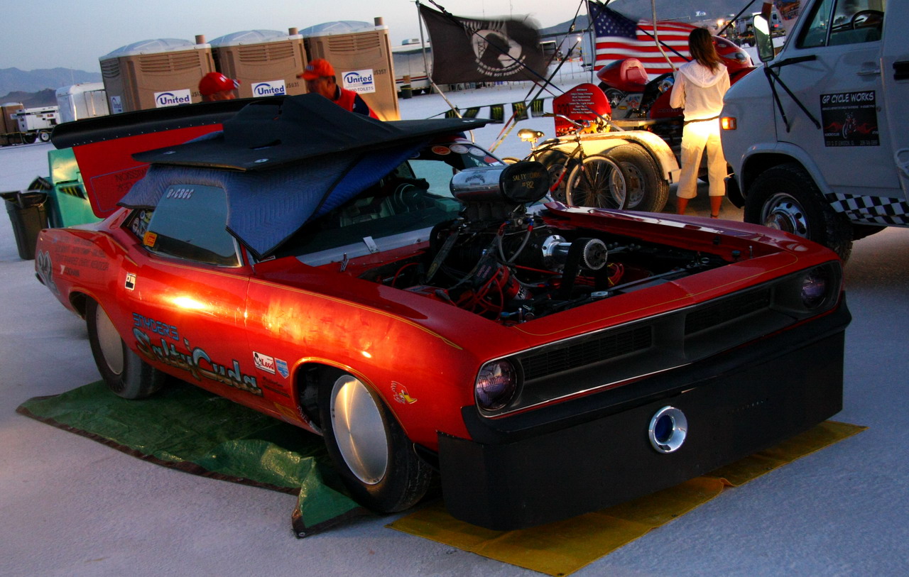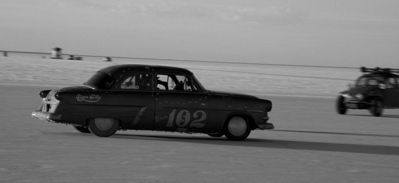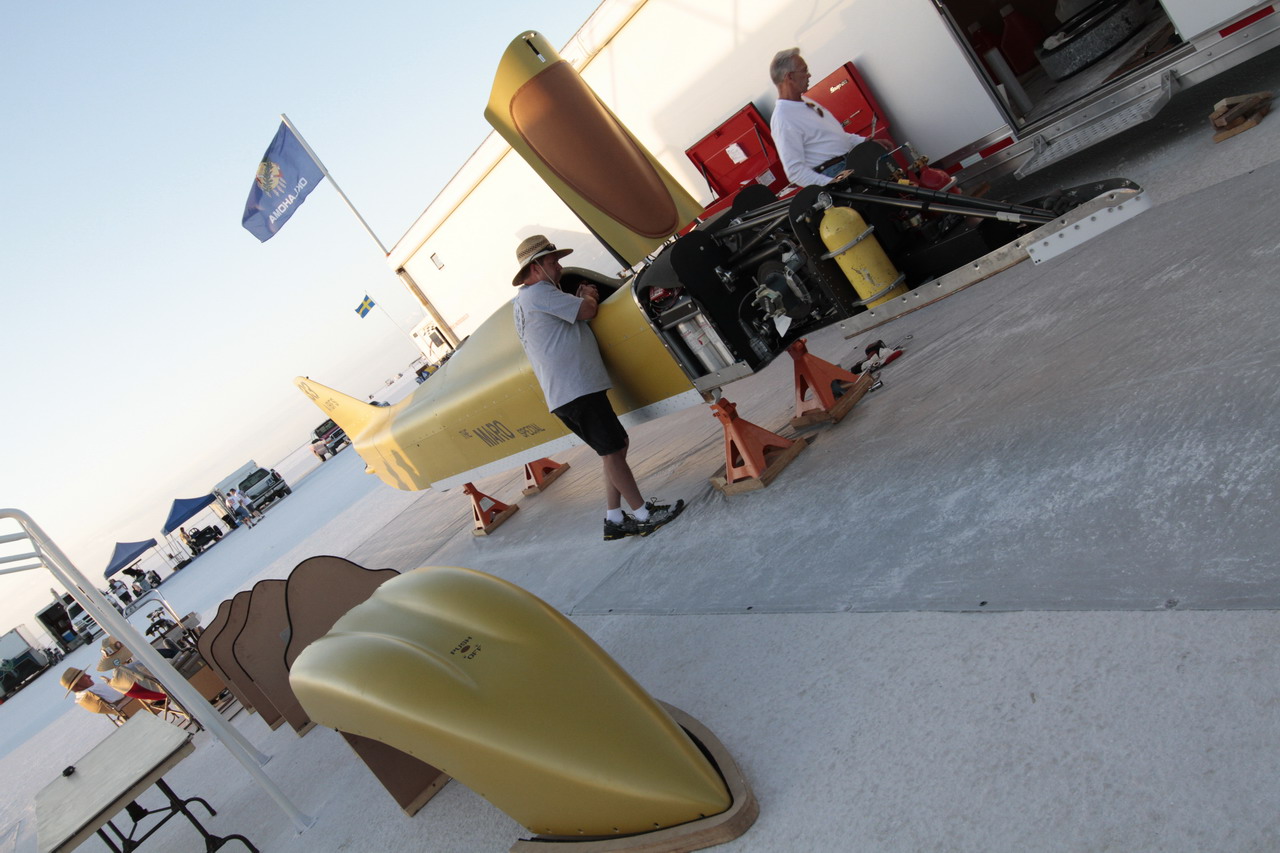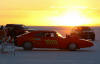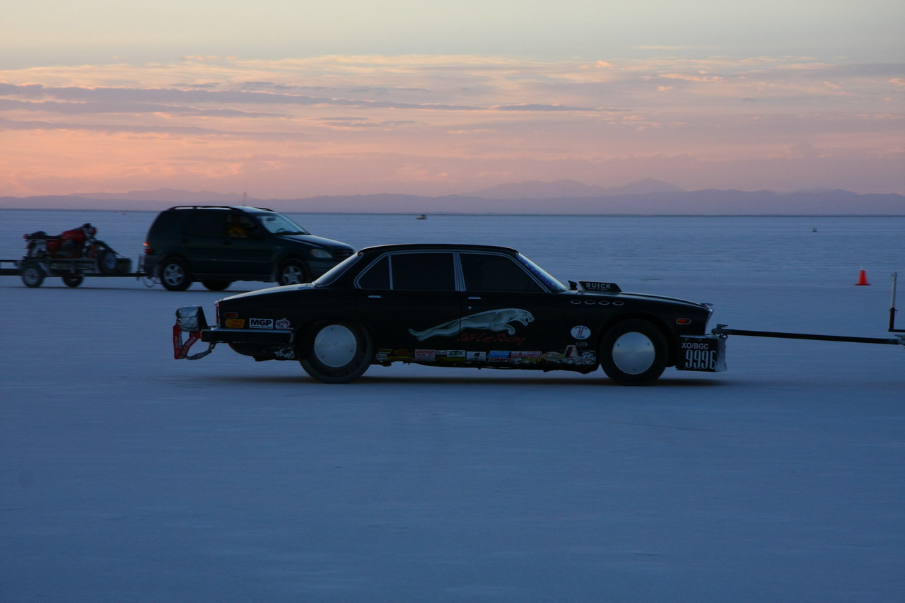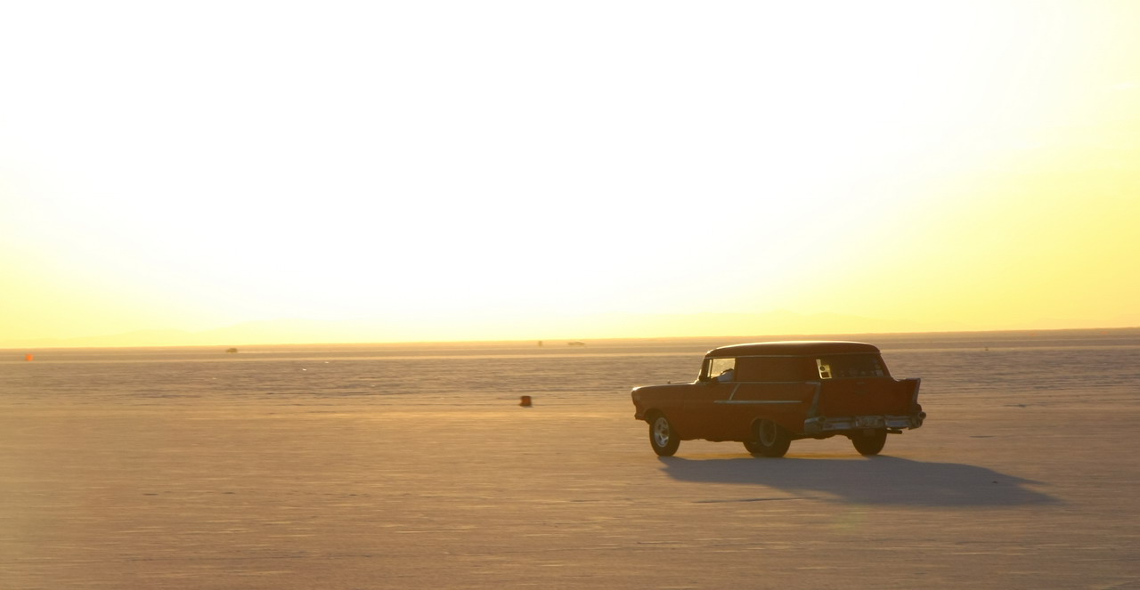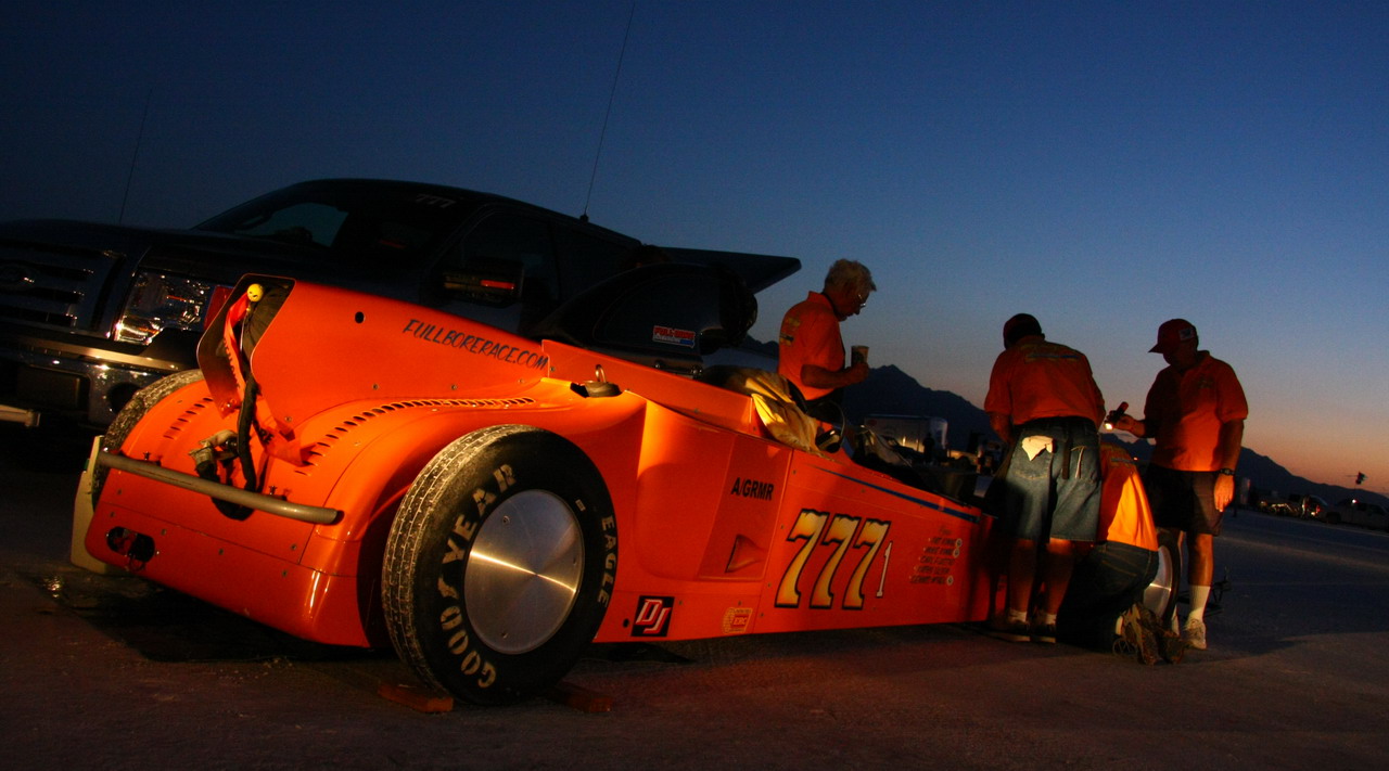 et nous n'allons pas être déçu coté sensations, émotions, spectacle et beauté.... nous quittons donc Wendover à 6h00 du mat, il fait une température idéale pour rouler en Stang décapotée (déjà 86°F soit 30°C!!), il fait nuit noire, nous nous dirigeons vers l'est et découvrons enfin le fameux panneau "Bonneville Speedway Exit 4", nous prenons la bretelle et nous engageons sur une route goudronnée entourée d'une immensité plate, il fait tellement noir que nous ne distinguons absolument rien autour, heureusement nous ne sommes pas seuls et nous guidons sur les feux rouges devant nous .... puis, à un moment un petit dévers en pente devant nous, que nous descendons, puis plus rien, plus de goudron, plus de traces, rien, le vide total, l'immensité totale.... Franck Sinatra à la radio, le moment est grandiose.... nous continuons quand même, à allure réduite, sans aucun repère, sur une surface totalement étrangère mais où la Stang se comporte plutôt bien, puis nous commençons à nous faire dépasser par des voitures sur autant de pistes parallèles qu'il peut y avoir de feux rouges !! Nous les suivons donc, et sans s'en rendre compte vu qu'il fait toujours nuit noire et au bout de quelques miles, nous pénétrons en Stang à l'intérieur de l'Impound, c'est genre comme si vous rentriez dans un paddock de F1 et que vous circuliez en voiture à travers les semis transportant les voitures, les motorhomes sans que vous en vous en rendiez compte, de la folie pure, la magie de Bonneville !! c'est après avoir fait le tour et stationné la Stang que nous nous rendons compte que nous étions dans le sanctuaire de l'Impound, nous prenons alors nos armes photographiques, et là, le spectacle son et lumière commence ....