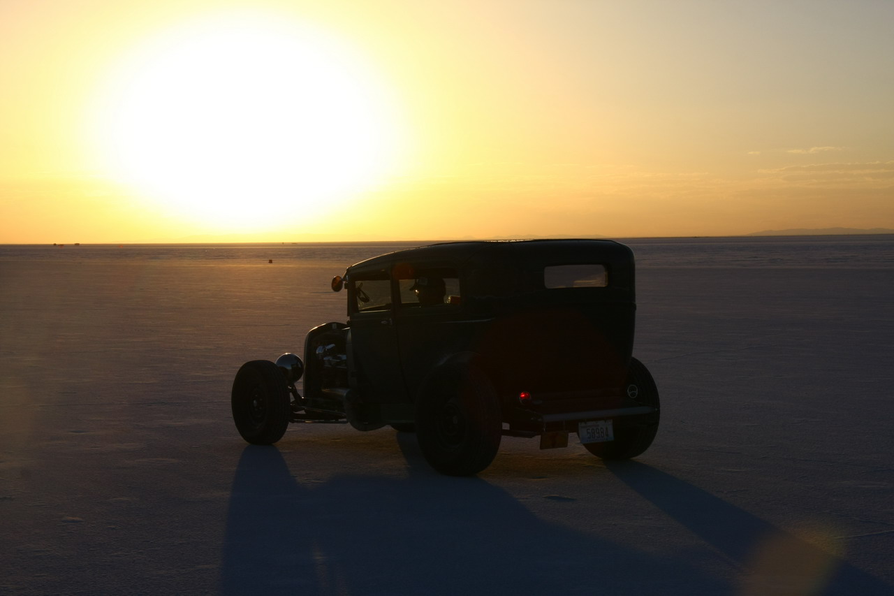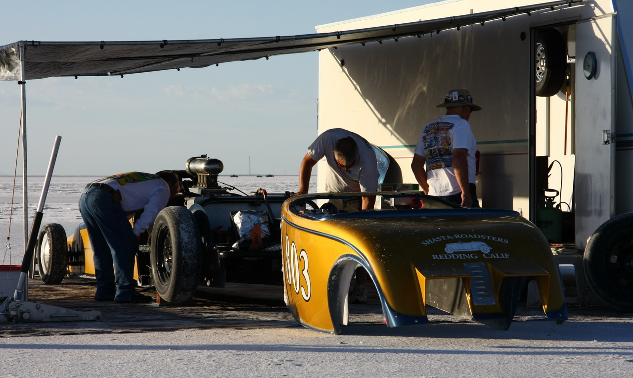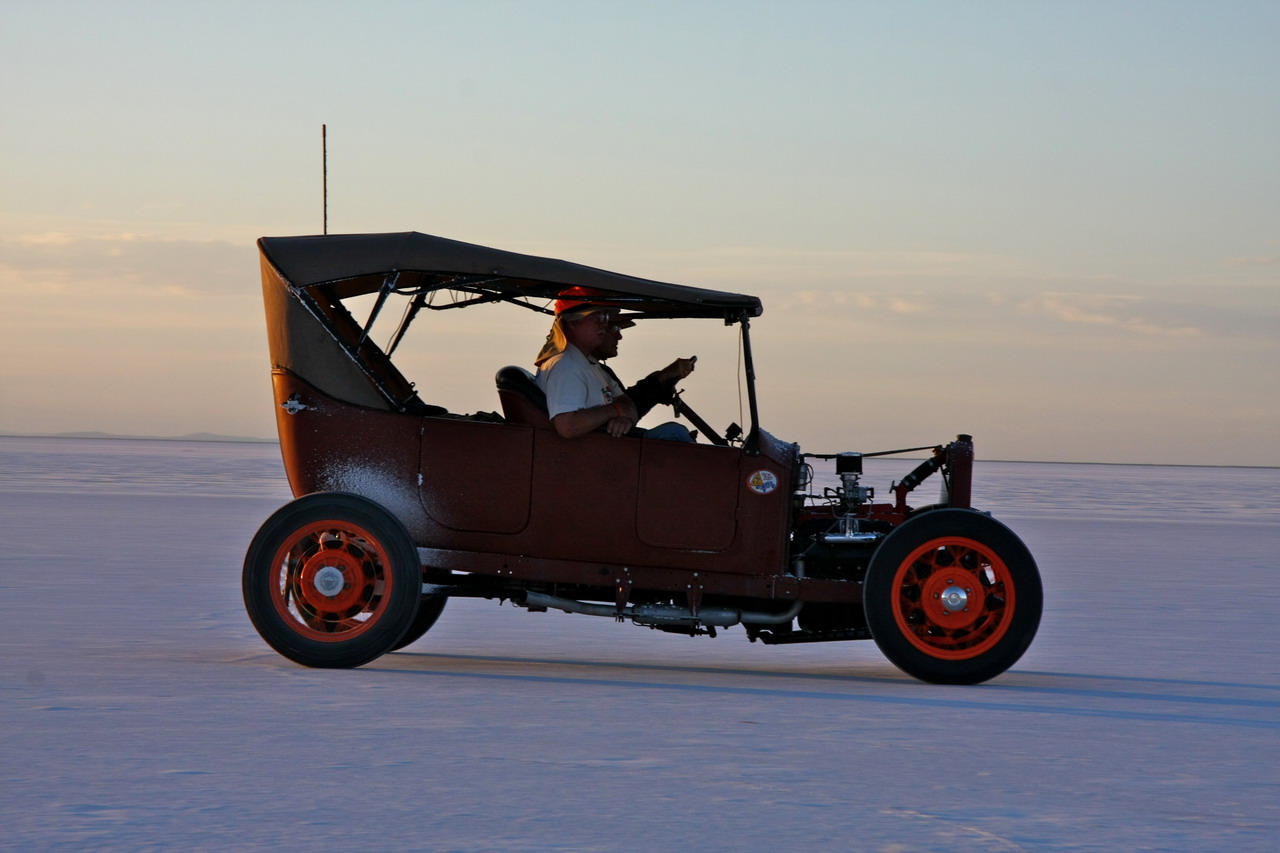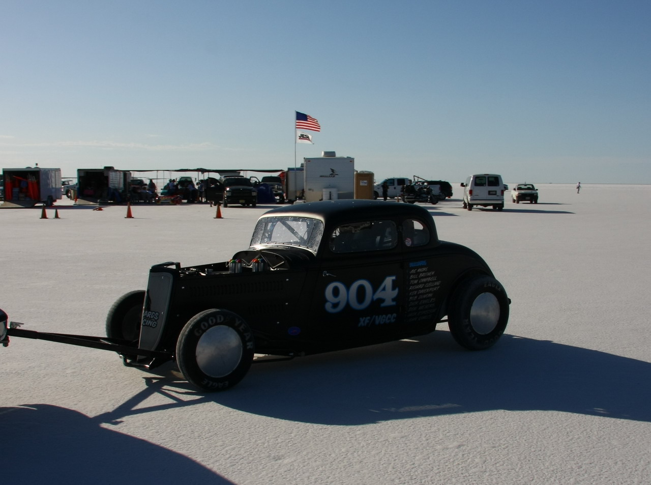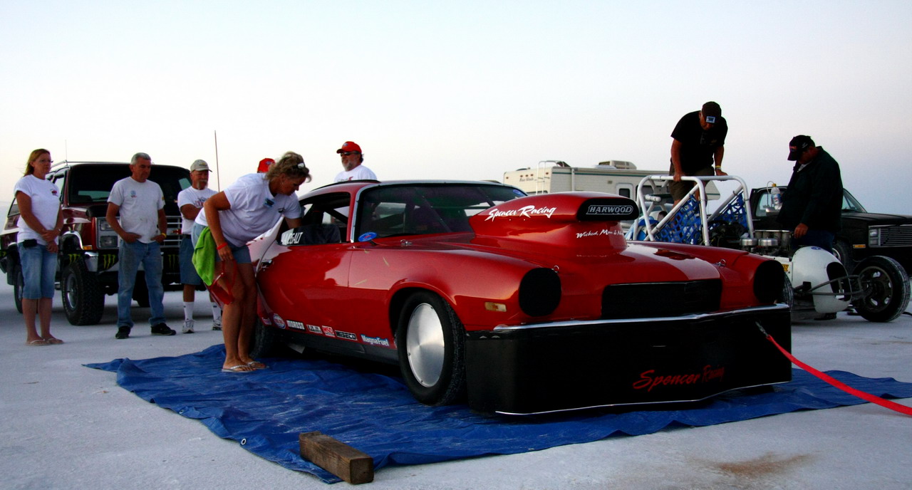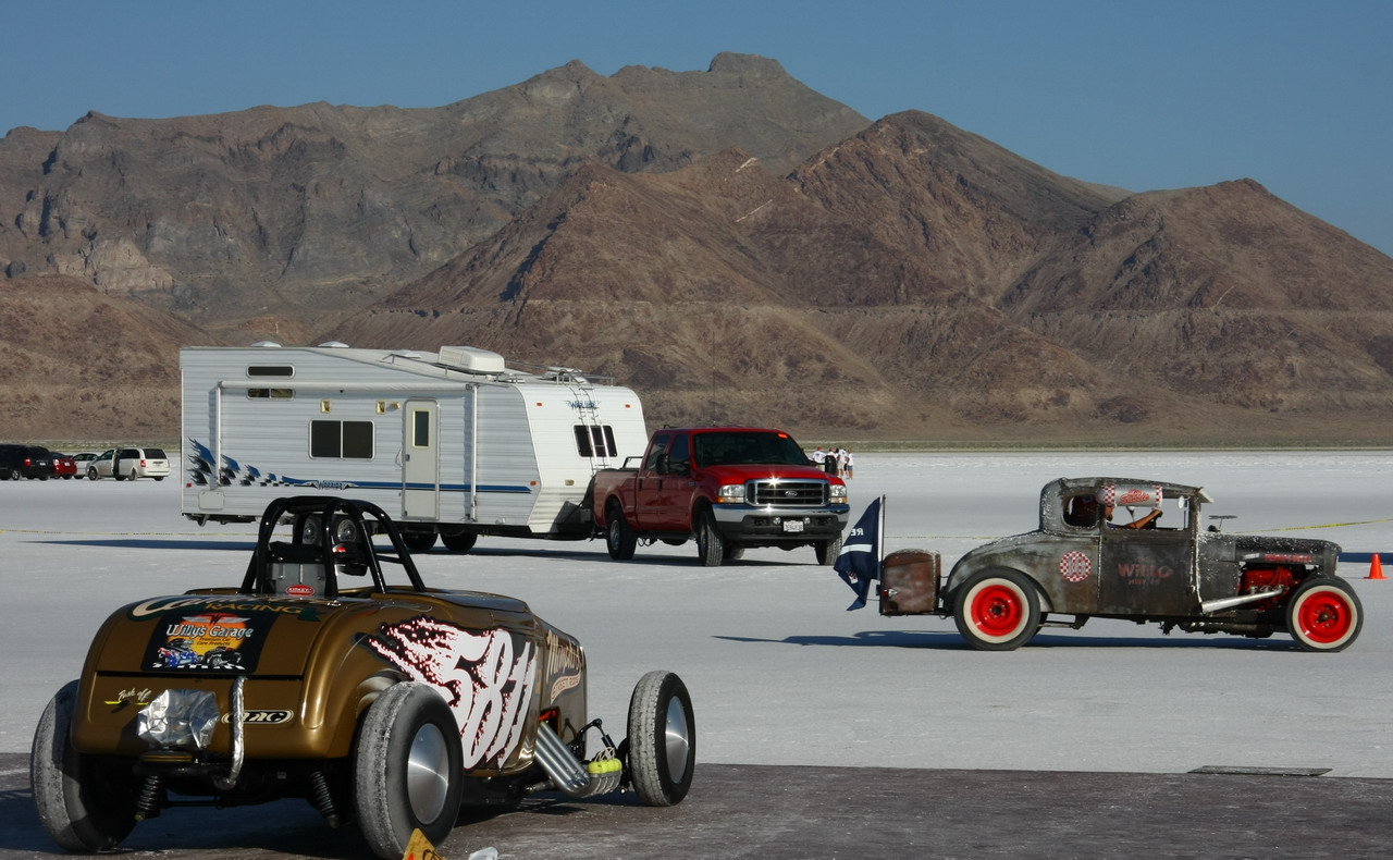 et nous n'allons pas être déçu coté sensations, émotions, spectacle et beauté.... nous quittons donc Wendover à 6h00 du mat, il fait une température idéale pour rouler en Stang décapotée (déjà 86°F soit 30°C!!), il fait nuit noire, nous nous dirigeons vers l'est et découvrons enfin le fameux panneau "Bonneville Speedway Exit 4", nous prenons la bretelle et nous engageons sur une route goudronnée entourée d'une immensité plate, il fait tellement noir que nous ne distinguons absolument rien autour, heureusement nous ne sommes pas seuls et nous guidons sur les feux rouges devant nous .... puis, à un moment un petit dévers en pente devant nous, que nous descendons, puis plus rien, plus de goudron, plus de traces, rien, le vide total, l'immensité totale.... Franck Sinatra à la radio, le moment est grandiose.... nous continuons quand même, à allure réduite, sans aucun repère, sur une surface totalement étrangère mais où la Stang se comporte plutôt bien, puis nous commençons à nous faire dépasser par des voitures sur autant de pistes parallèles qu'il peut y avoir de feux rouges !! Nous les suivons donc, et sans s'en rendre compte vu qu'il fait toujours nuit noire et au bout de quelques miles, nous pénétrons en Stang à l'intérieur de l'Impound, c'est genre comme si vous rentriez dans un paddock de F1 et que vous circuliez en voiture à travers les semis transportant les voitures, les motorhomes sans que vous en vous en rendiez compte, de la folie pure, la magie de Bonneville !! c'est après avoir fait le tour et stationné la Stang que nous nous rendons compte que nous étions dans le sanctuaire de l'Impound, nous prenons alors nos armes photographiques, et là, le spectacle son et lumière commence ....