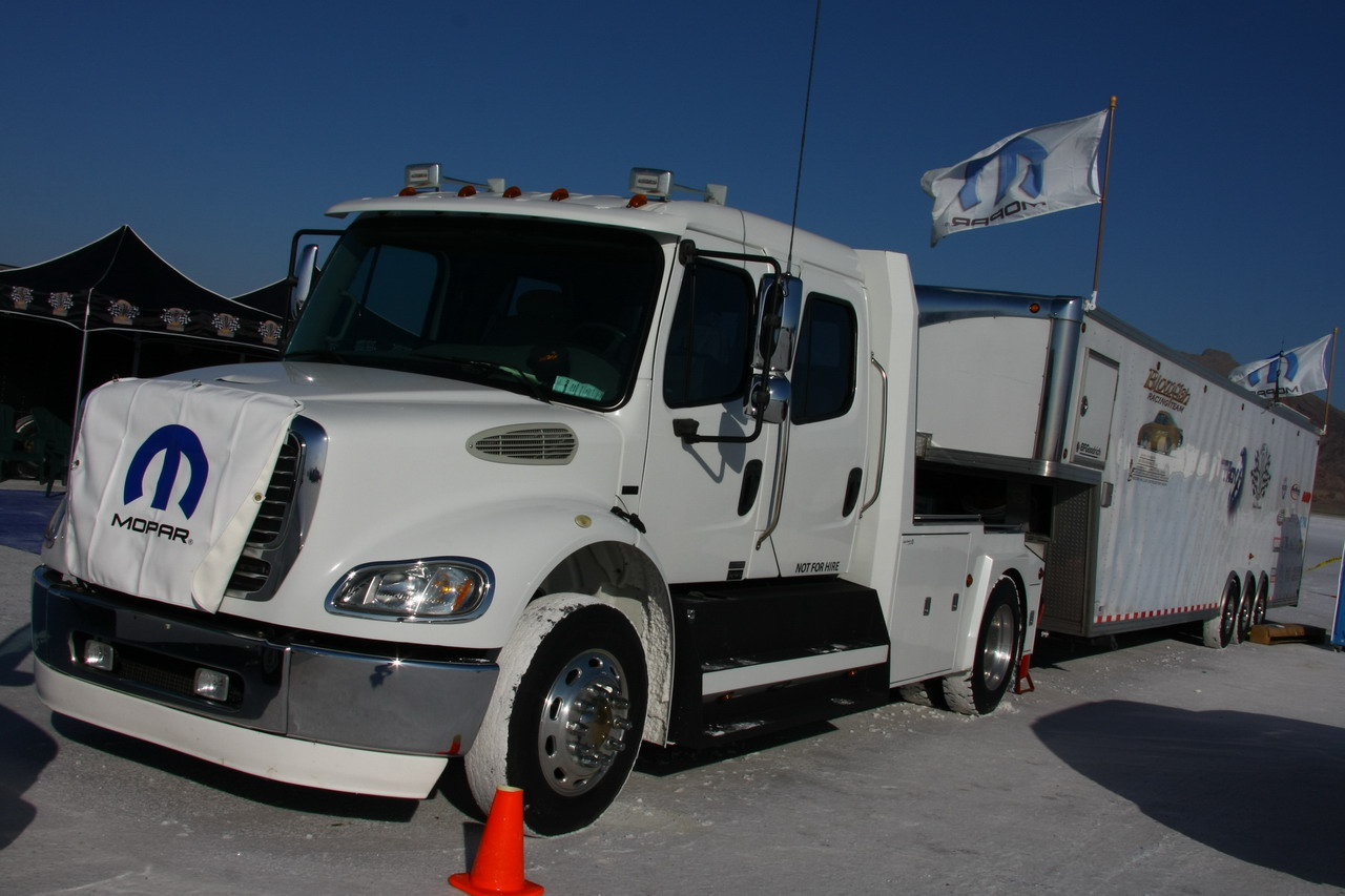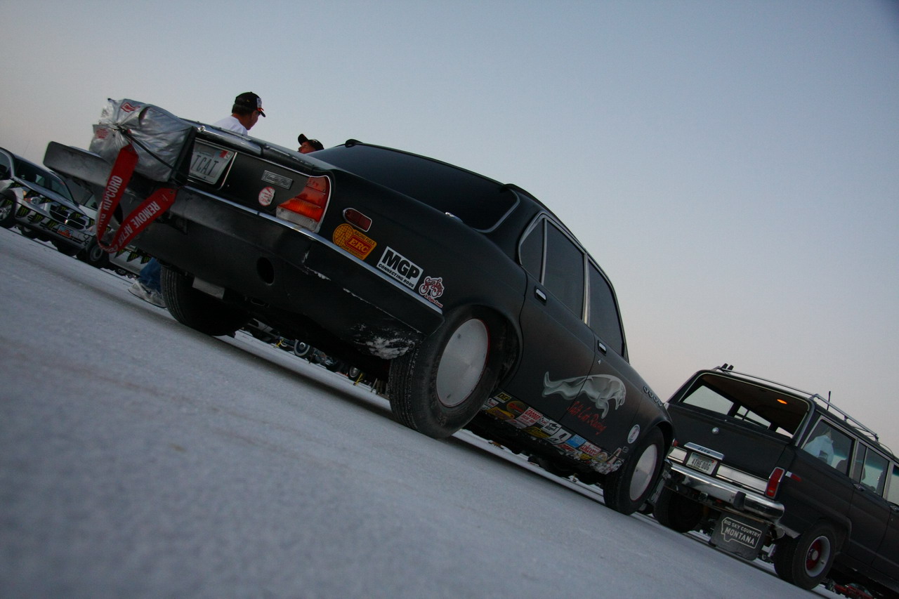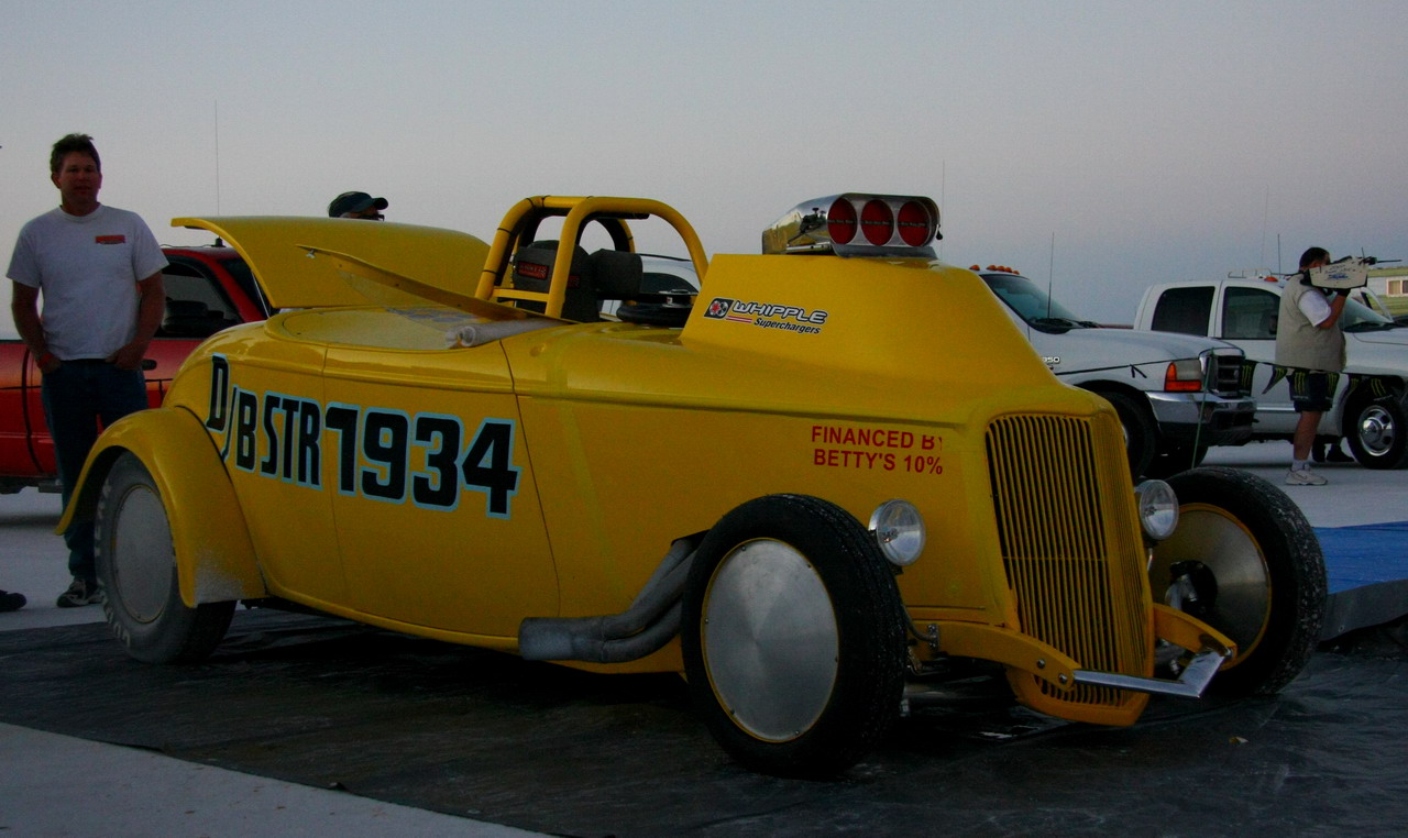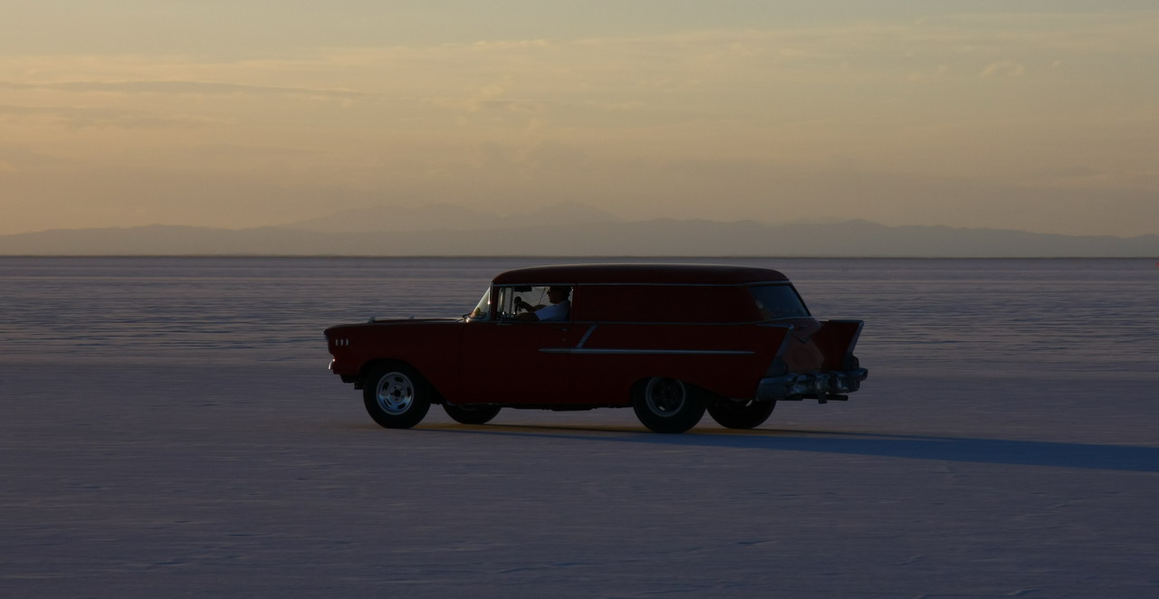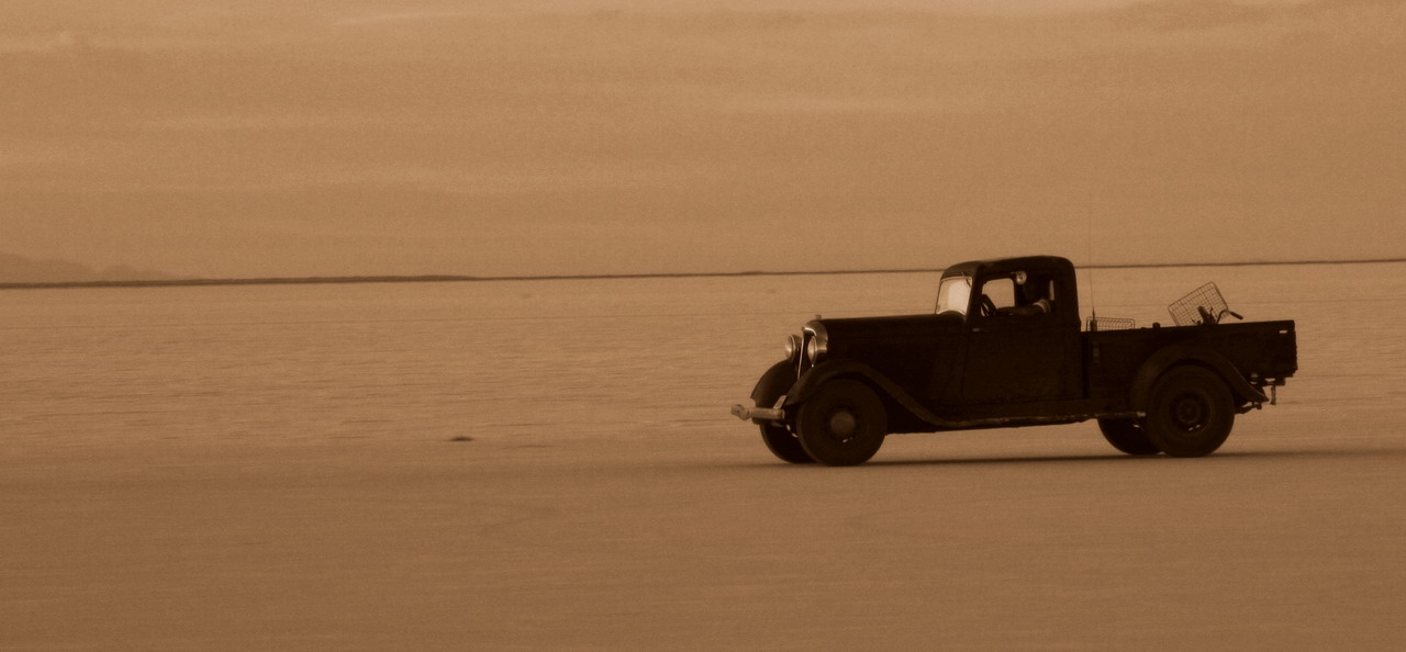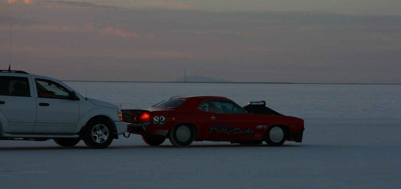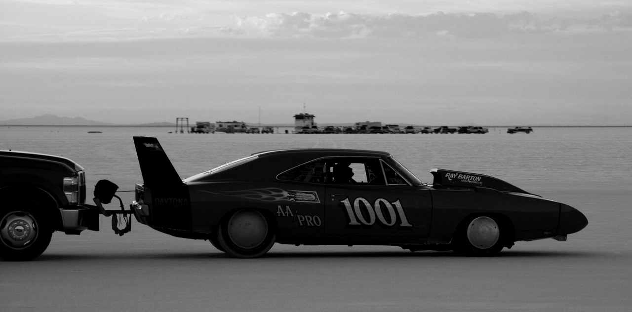 et nous n'allons pas être déçu coté sensations, émotions, spectacle et beauté.... nous quittons donc Wendover à 6h00 du mat, il fait une température idéale pour rouler en Stang décapotée (déjà 86°F soit 30°C!!), il fait nuit noire, nous nous dirigeons vers l'est et découvrons enfin le fameux panneau "Bonneville Speedway Exit 4", nous prenons la bretelle et nous engageons sur une route goudronnée entourée d'une immensité plate, il fait tellement noir que nous ne distinguons absolument rien autour, heureusement nous ne sommes pas seuls et nous guidons sur les feux rouges devant nous .... puis, à un moment un petit dévers en pente devant nous, que nous descendons, puis plus rien, plus de goudron, plus de traces, rien, le vide total, l'immensité totale.... Franck Sinatra à la radio, le moment est grandiose.... nous continuons quand même, à allure réduite, sans aucun repère, sur une surface totalement étrangère mais où la Stang se comporte plutôt bien, puis nous commençons à nous faire dépasser par des voitures sur autant de pistes parallèles qu'il peut y avoir de feux rouges !! Nous les suivons donc, et sans s'en rendre compte vu qu'il fait toujours nuit noire et au bout de quelques miles, nous pénétrons en Stang à l'intérieur de l'Impound, c'est genre comme si vous rentriez dans un paddock de F1 et que vous circuliez en voiture à travers les semis transportant les voitures, les motorhomes sans que vous en vous en rendiez compte, de la folie pure, la magie de Bonneville !! c'est après avoir fait le tour et stationné la Stang que nous nous rendons compte que nous étions dans le sanctuaire de l'Impound, nous prenons alors nos armes photographiques, et là, le spectacle son et lumière commence ....