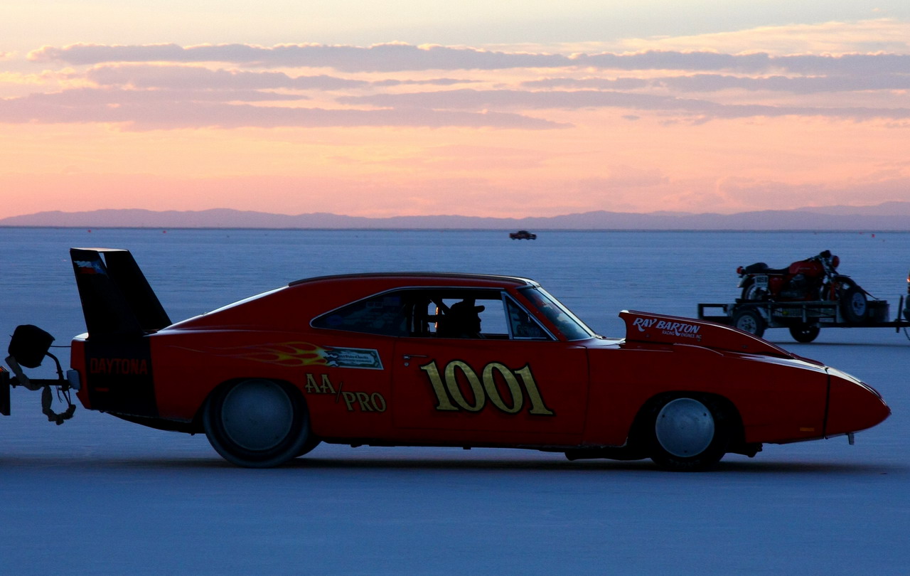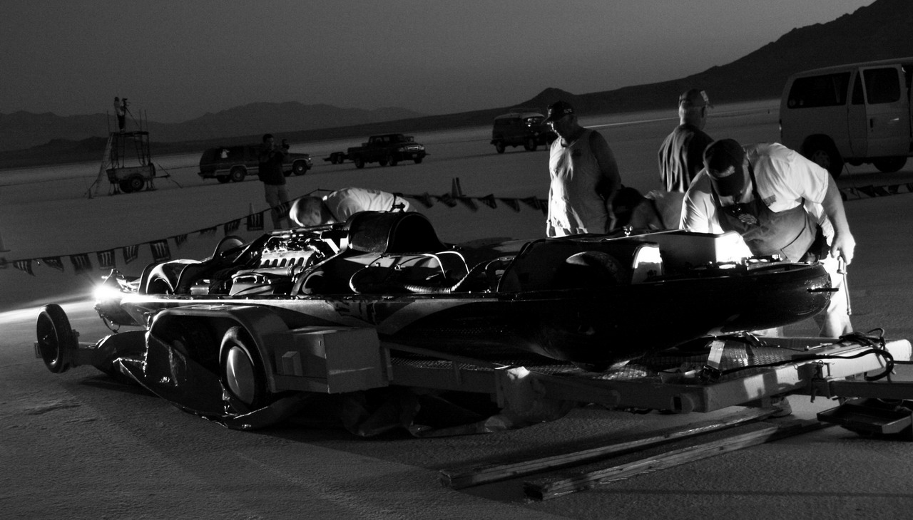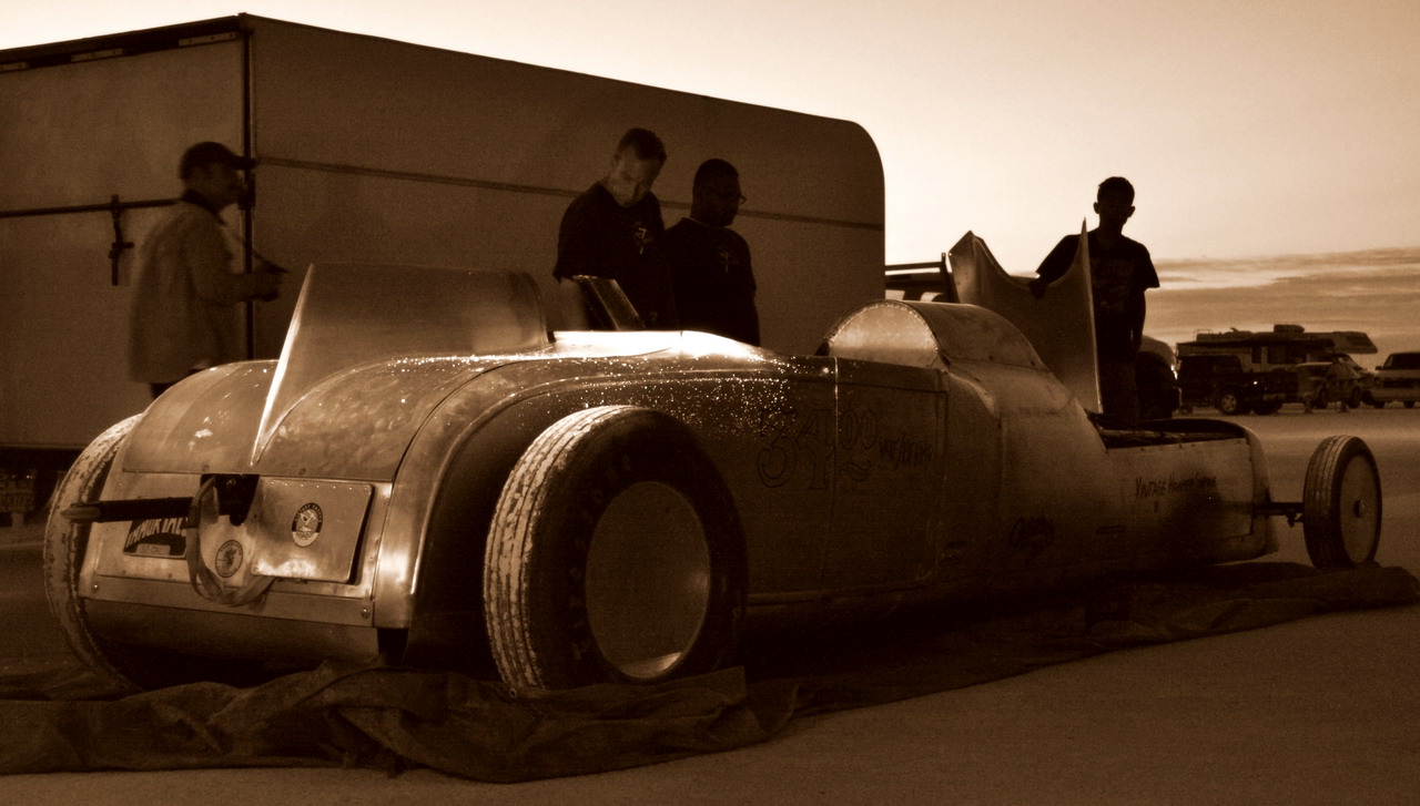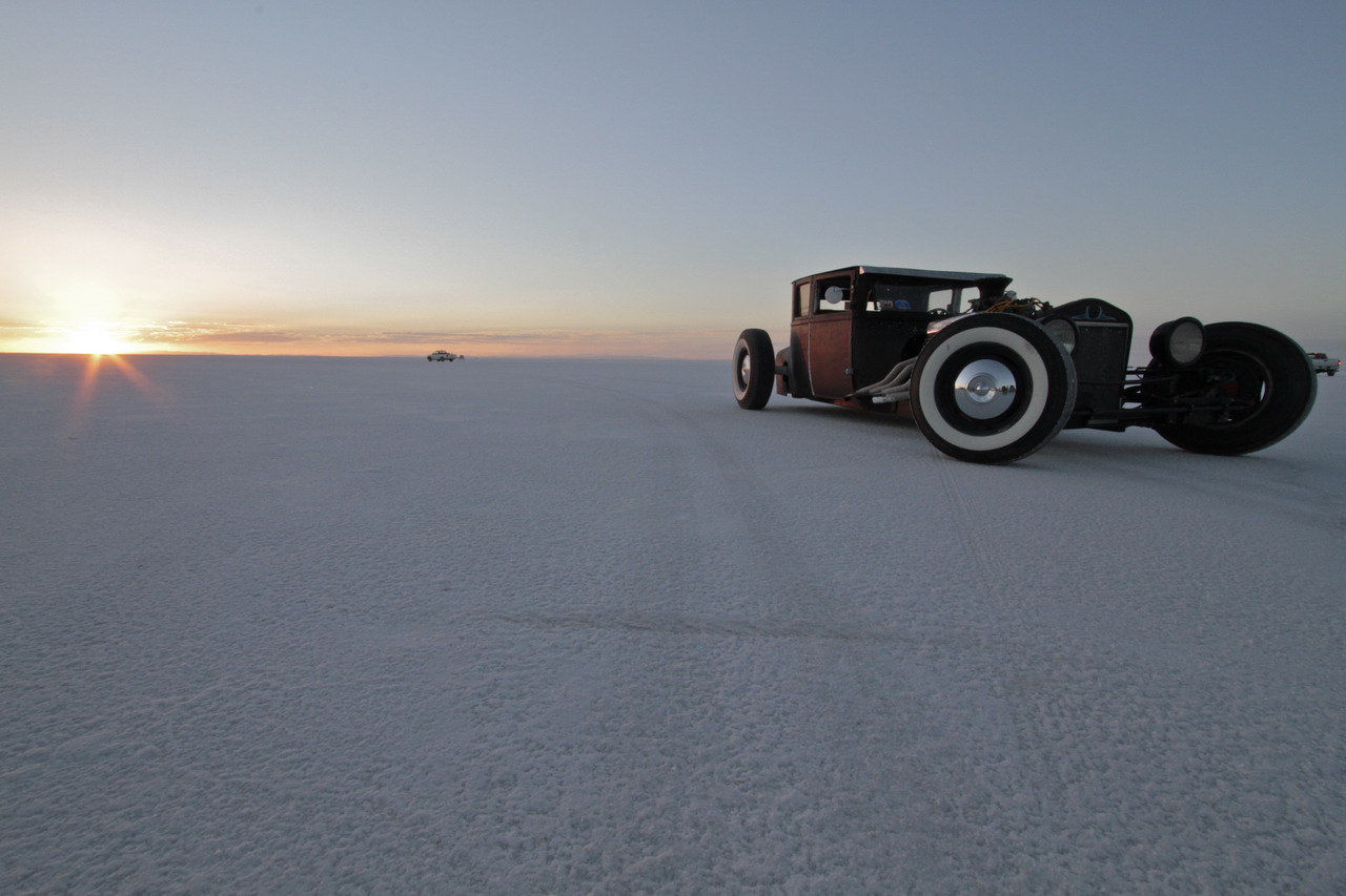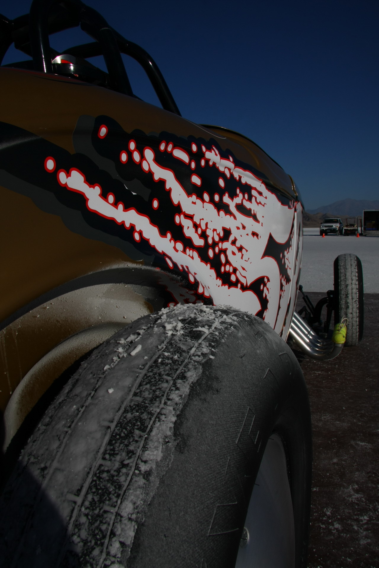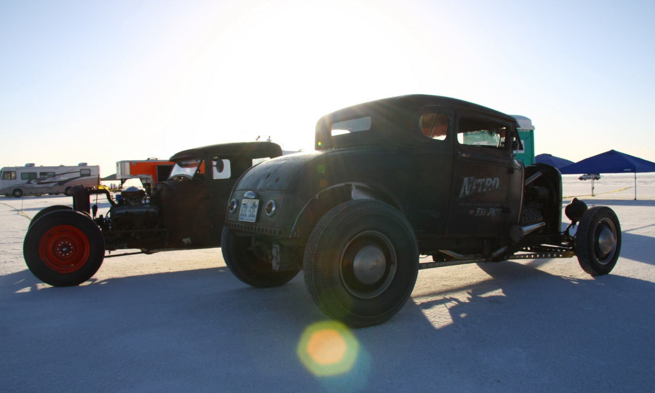 et nous n'allons pas être déçu coté sensations, émotions, spectacle et beauté.... nous quittons donc Wendover à 6h00 du mat, il fait une température idéale pour rouler en Stang décapotée (déjà 86°F soit 30°C!!), il fait nuit noire, nous nous dirigeons vers l'est et découvrons enfin le fameux panneau "Bonneville Speedway Exit 4", nous prenons la bretelle et nous engageons sur une route goudronnée entourée d'une immensité plate, il fait tellement noir que nous ne distinguons absolument rien autour, heureusement nous ne sommes pas seuls et nous guidons sur les feux rouges devant nous .... puis, à un moment un petit dévers en pente devant nous, que nous descendons, puis plus rien, plus de goudron, plus de traces, rien, le vide total, l'immensité totale.... Franck Sinatra à la radio, le moment est grandiose.... nous continuons quand même, à allure réduite, sans aucun repère, sur une surface totalement étrangère mais où la Stang se comporte plutôt bien, puis nous commençons à nous faire dépasser par des voitures sur autant de pistes parallèles qu'il peut y avoir de feux rouges !! Nous les suivons donc, et sans s'en rendre compte vu qu'il fait toujours nuit noire et au bout de quelques miles, nous pénétrons en Stang à l'intérieur de l'Impound, c'est genre comme si vous rentriez dans un paddock de F1 et que vous circuliez en voiture à travers les semis transportant les voitures, les motorhomes sans que vous en vous en rendiez compte, de la folie pure, la magie de Bonneville !! c'est après avoir fait le tour et stationné la Stang que nous nous rendons compte que nous étions dans le sanctuaire de l'Impound, nous prenons alors nos armes photographiques, et là, le spectacle son et lumière commence ....