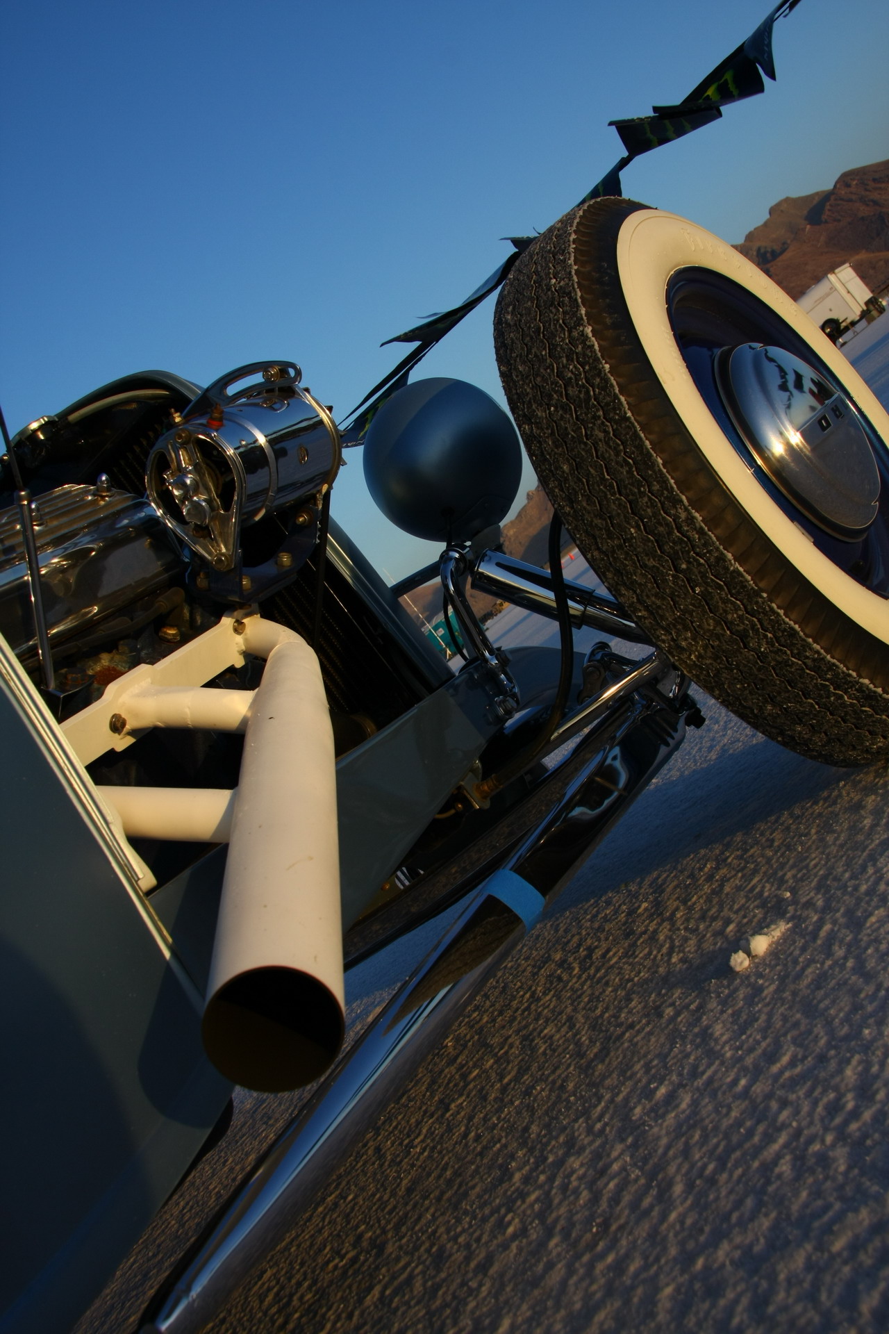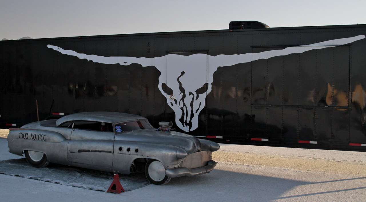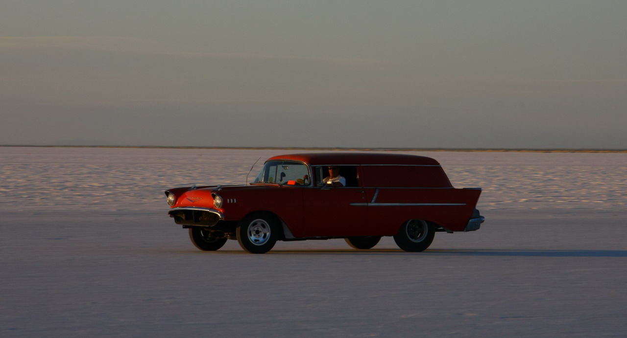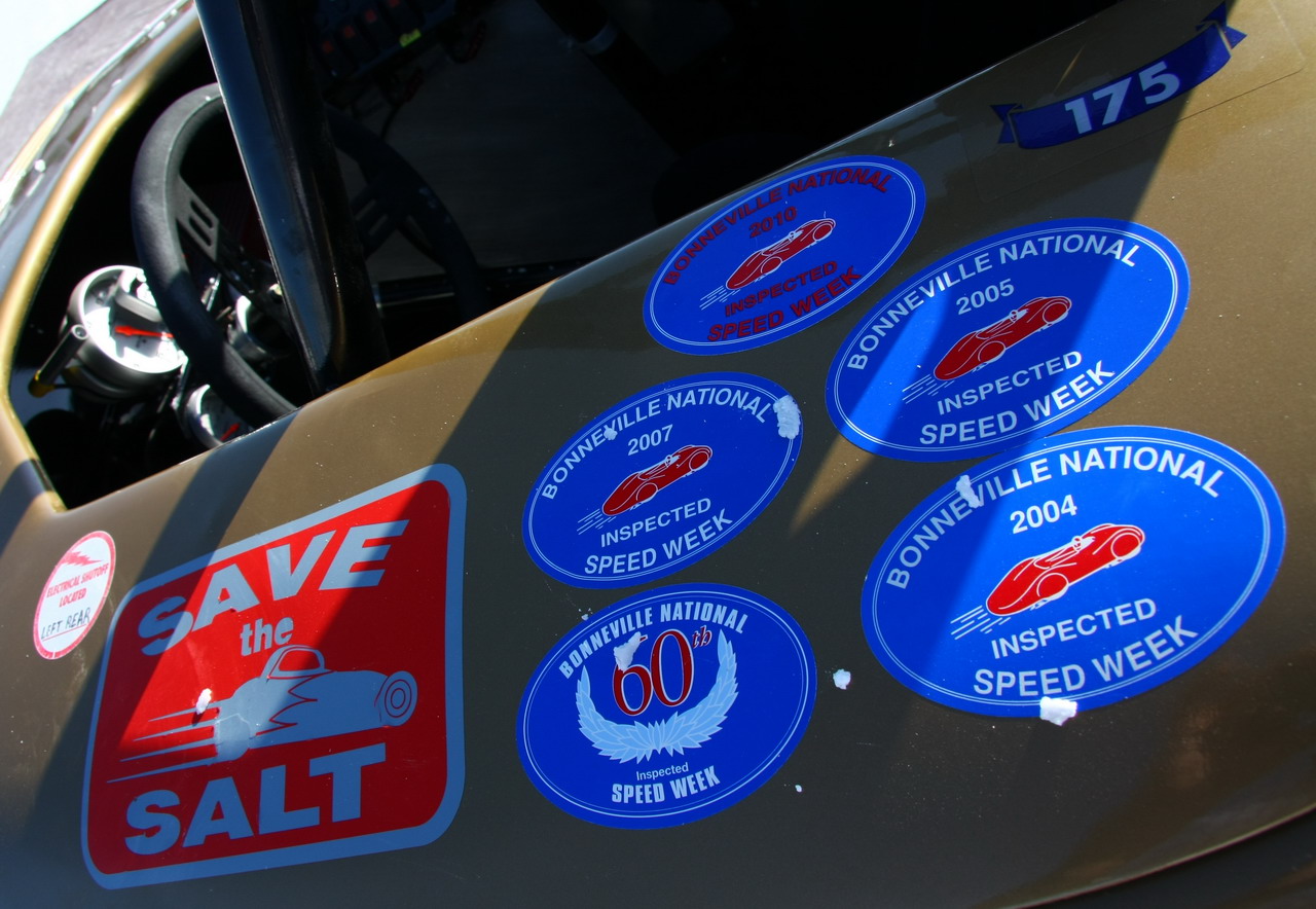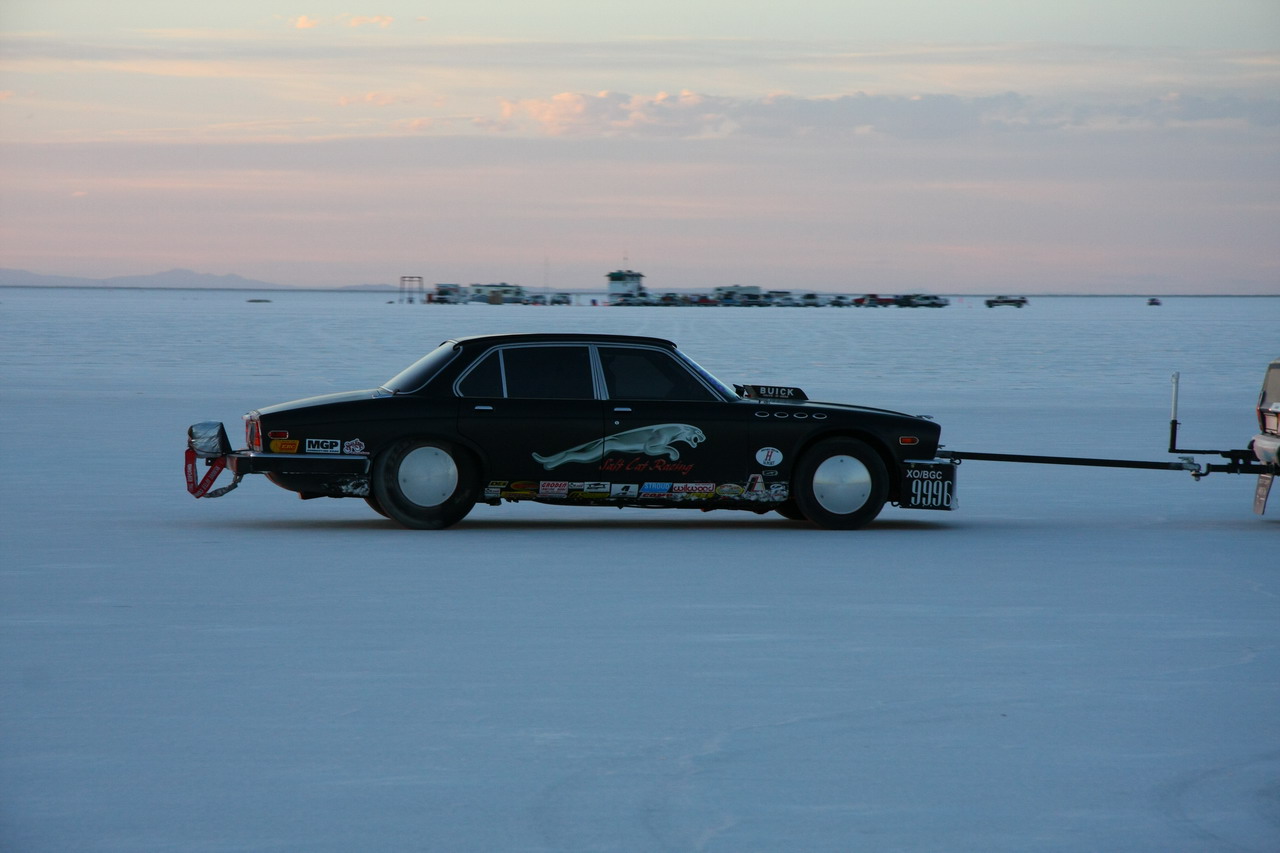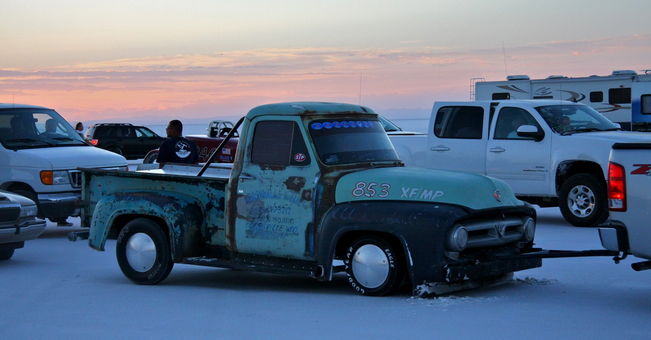 et nous n'allons pas être déçu coté sensations, émotions, spectacle et beauté.... nous quittons donc Wendover à 6h00 du mat, il fait une température idéale pour rouler en Stang décapotée (déjà 86°F soit 30°C!!), il fait nuit noire, nous nous dirigeons vers l'est et découvrons enfin le fameux panneau "Bonneville Speedway Exit 4", nous prenons la bretelle et nous engageons sur une route goudronnée entourée d'une immensité plate, il fait tellement noir que nous ne distinguons absolument rien autour, heureusement nous ne sommes pas seuls et nous guidons sur les feux rouges devant nous .... puis, à un moment un petit dévers en pente devant nous, que nous descendons, puis plus rien, plus de goudron, plus de traces, rien, le vide total, l'immensité totale.... Franck Sinatra à la radio, le moment est grandiose.... nous continuons quand même, à allure réduite, sans aucun repère, sur une surface totalement étrangère mais où la Stang se comporte plutôt bien, puis nous commençons à nous faire dépasser par des voitures sur autant de pistes parallèles qu'il peut y avoir de feux rouges !! Nous les suivons donc, et sans s'en rendre compte vu qu'il fait toujours nuit noire et au bout de quelques miles, nous pénétrons en Stang à l'intérieur de l'Impound, c'est genre comme si vous rentriez dans un paddock de F1 et que vous circuliez en voiture à travers les semis transportant les voitures, les motorhomes sans que vous en vous en rendiez compte, de la folie pure, la magie de Bonneville !! c'est après avoir fait le tour et stationné la Stang que nous nous rendons compte que nous étions dans le sanctuaire de l'Impound, nous prenons alors nos armes photographiques, et là, le spectacle son et lumière commence ....