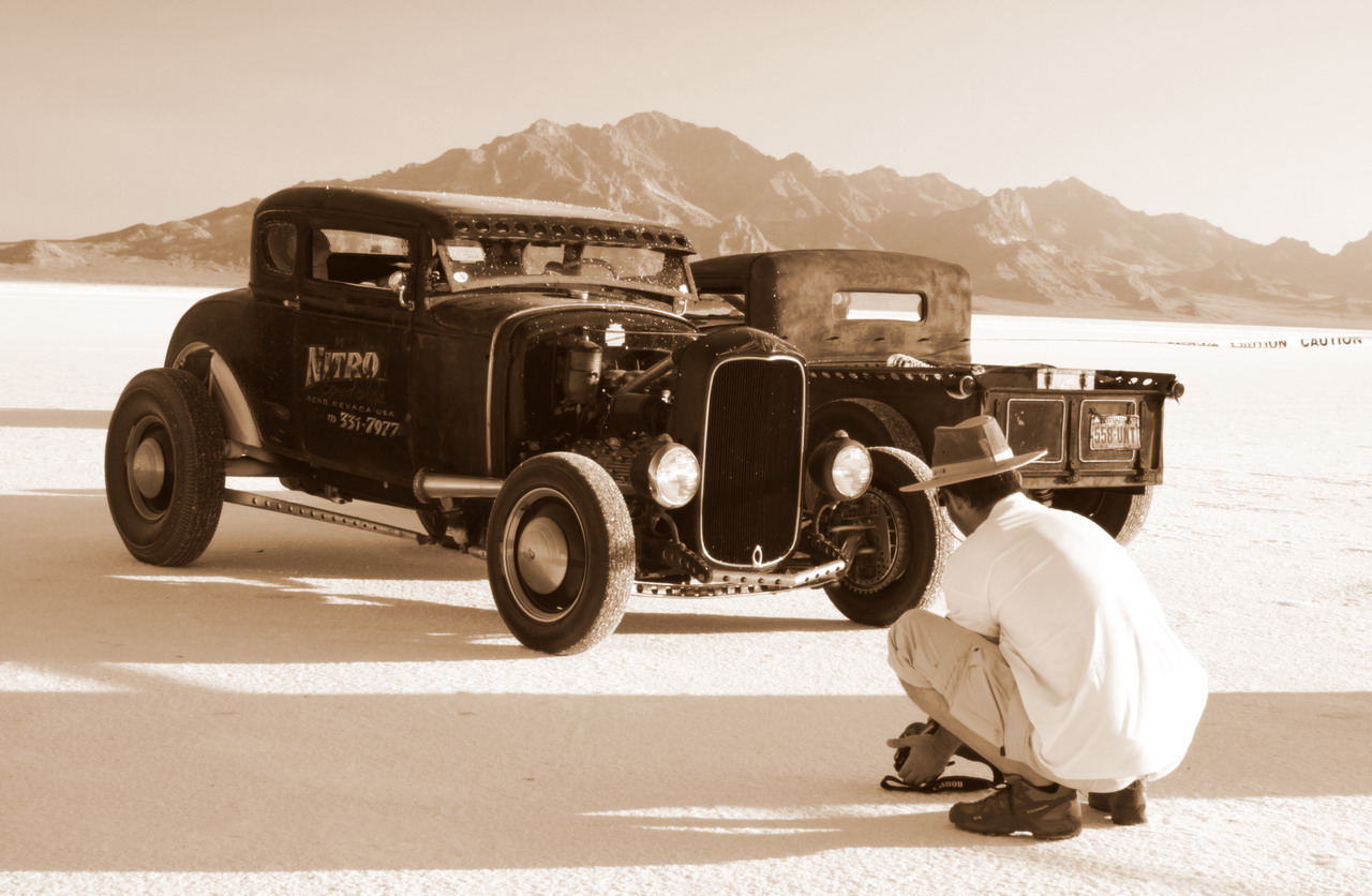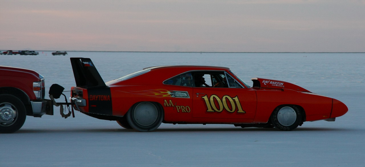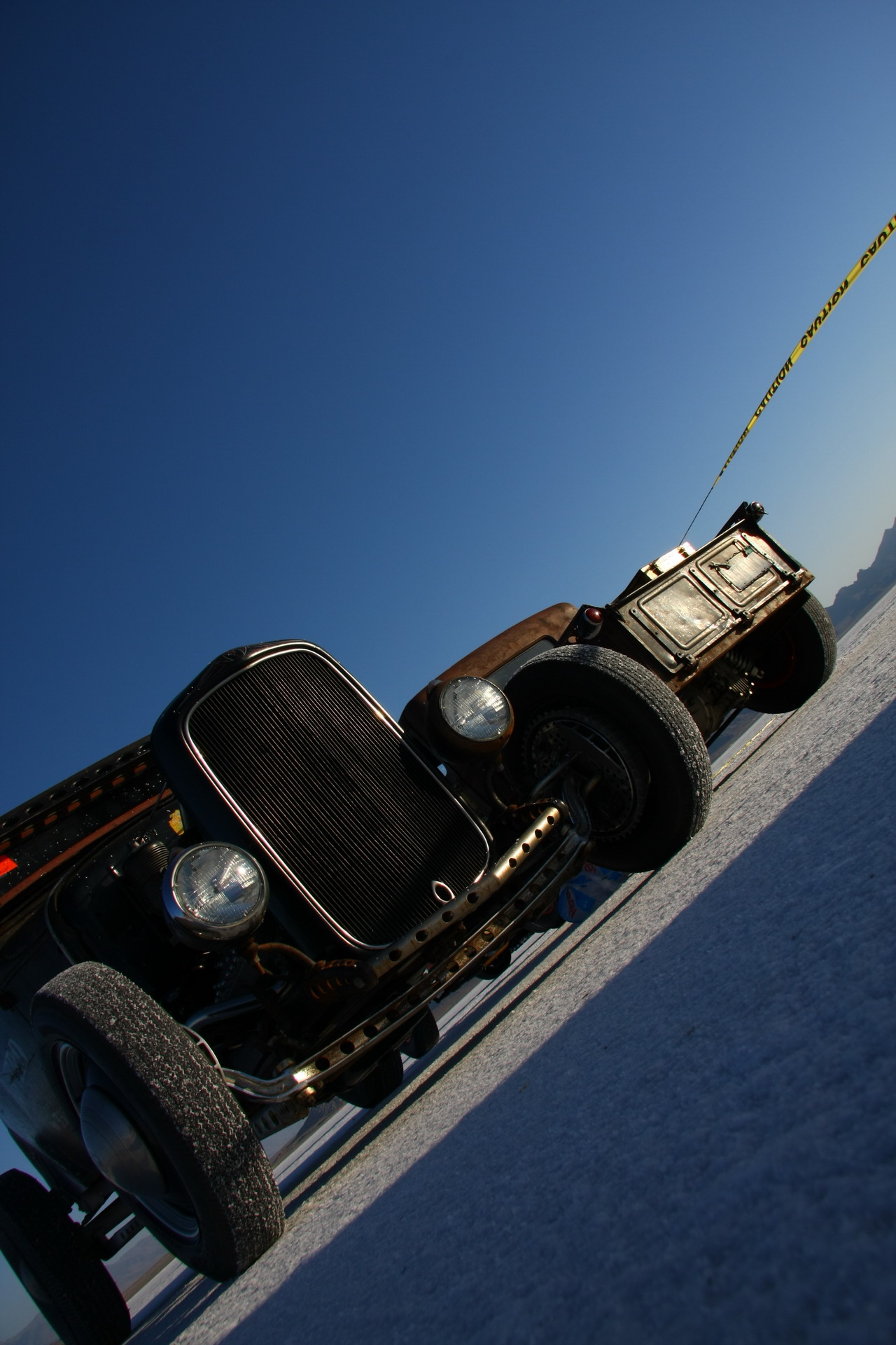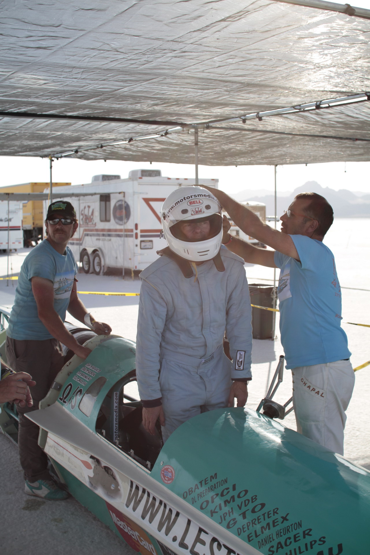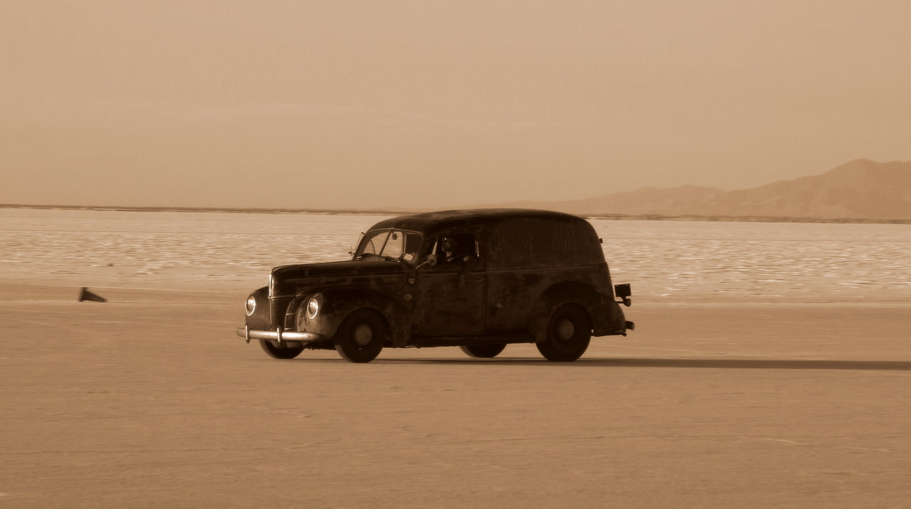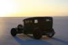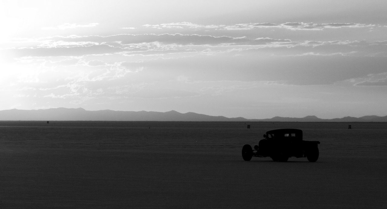 et nous n'allons pas être déçu coté sensations, émotions, spectacle et beauté.... nous quittons donc Wendover à 6h00 du mat, il fait une température idéale pour rouler en Stang décapotée (déjà 86°F soit 30°C!!), il fait nuit noire, nous nous dirigeons vers l'est et découvrons enfin le fameux panneau "Bonneville Speedway Exit 4", nous prenons la bretelle et nous engageons sur une route goudronnée entourée d'une immensité plate, il fait tellement noir que nous ne distinguons absolument rien autour, heureusement nous ne sommes pas seuls et nous guidons sur les feux rouges devant nous .... puis, à un moment un petit dévers en pente devant nous, que nous descendons, puis plus rien, plus de goudron, plus de traces, rien, le vide total, l'immensité totale.... Franck Sinatra à la radio, le moment est grandiose.... nous continuons quand même, à allure réduite, sans aucun repère, sur une surface totalement étrangère mais où la Stang se comporte plutôt bien, puis nous commençons à nous faire dépasser par des voitures sur autant de pistes parallèles qu'il peut y avoir de feux rouges !! Nous les suivons donc, et sans s'en rendre compte vu qu'il fait toujours nuit noire et au bout de quelques miles, nous pénétrons en Stang à l'intérieur de l'Impound, c'est genre comme si vous rentriez dans un paddock de F1 et que vous circuliez en voiture à travers les semis transportant les voitures, les motorhomes sans que vous en vous en rendiez compte, de la folie pure, la magie de Bonneville !! c'est après avoir fait le tour et stationné la Stang que nous nous rendons compte que nous étions dans le sanctuaire de l'Impound, nous prenons alors nos armes photographiques, et là, le spectacle son et lumière commence ....