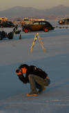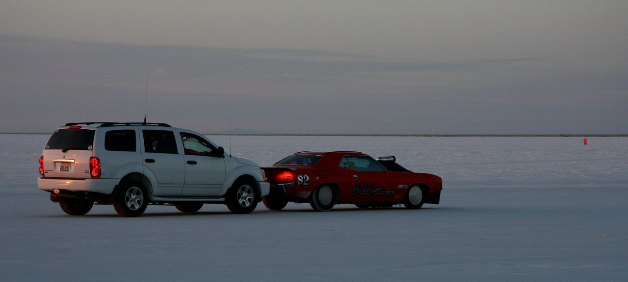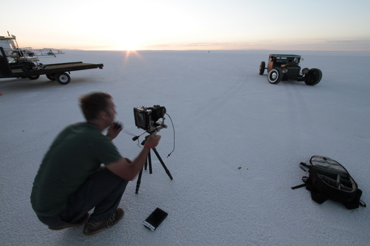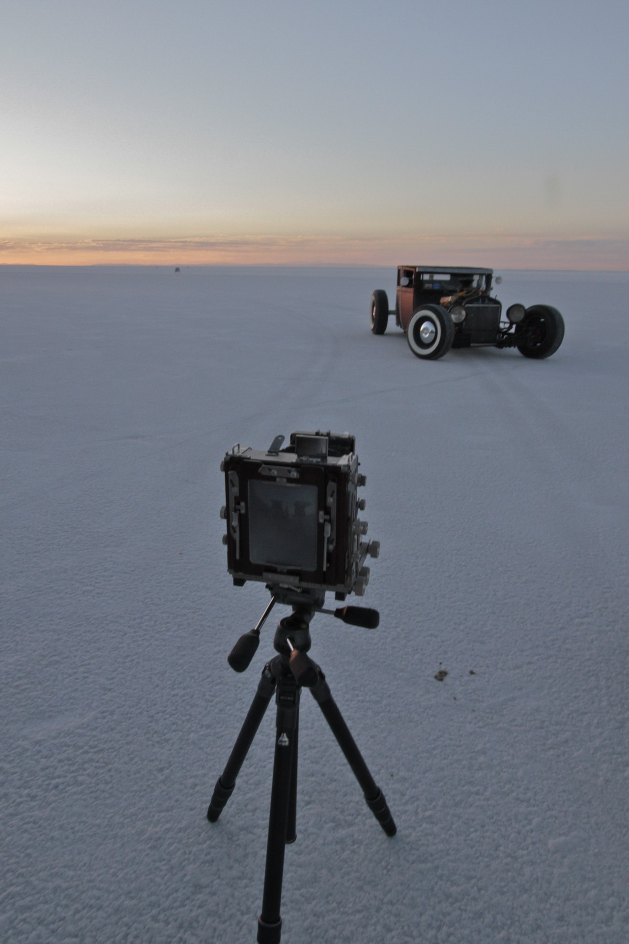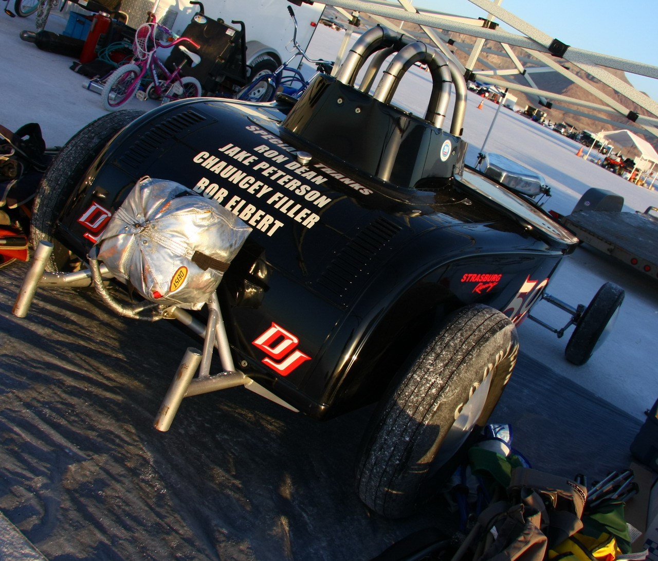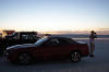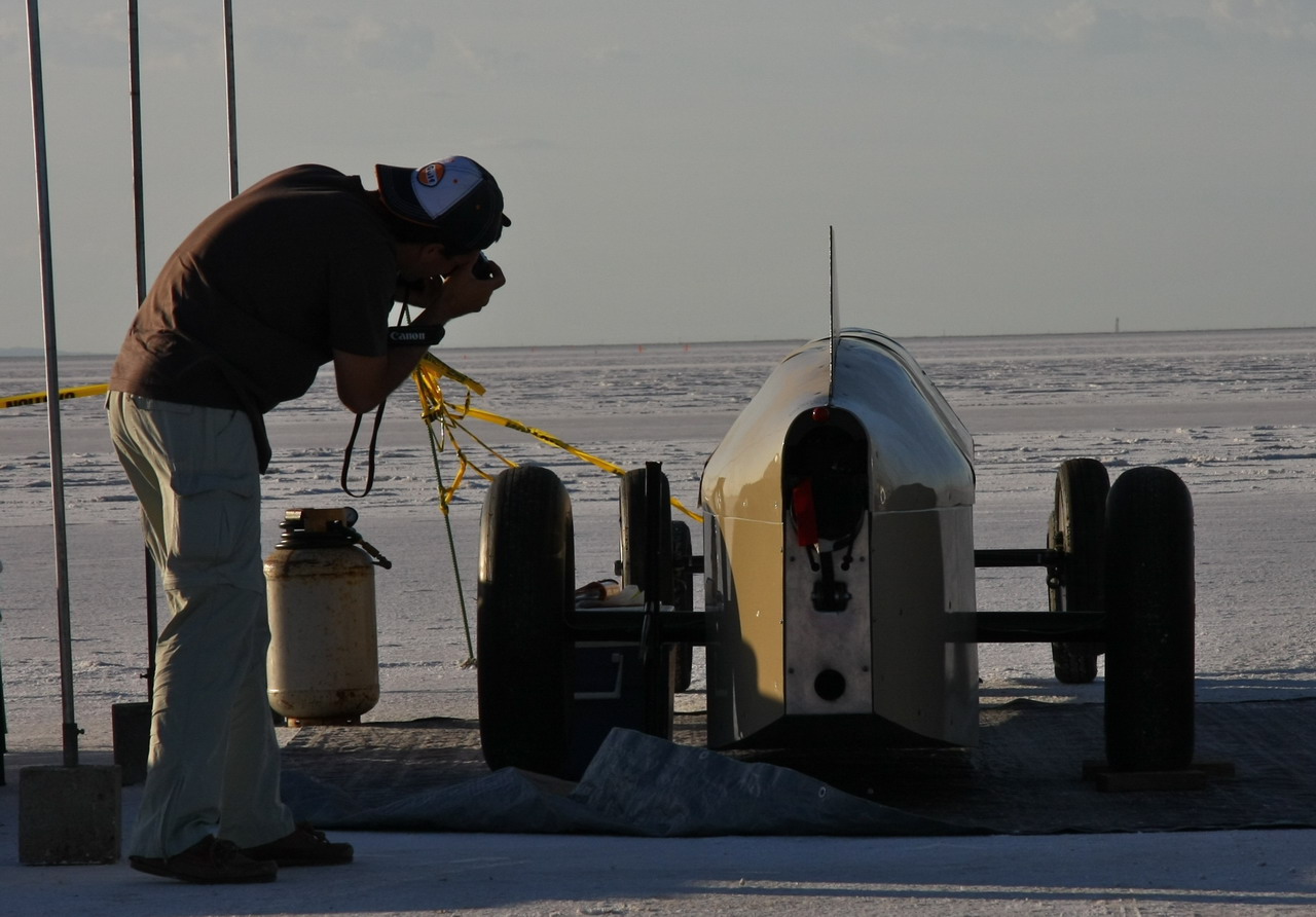et nous n'allons pas être déçu coté sensations, émotions, spectacle et beauté.... nous quittons donc Wendover à 6h00 du mat, il fait une température idéale pour rouler en Stang décapotée (déjà 86°F soit 30°C!!), il fait nuit noire, nous nous dirigeons vers l'est et découvrons enfin le fameux panneau "Bonneville Speedway Exit 4", nous prenons la bretelle et nous engageons sur une route goudronnée entourée d'une immensité plate, il fait tellement noir que nous ne distinguons absolument rien autour, heureusement nous ne sommes pas seuls et nous guidons sur les feux rouges devant nous .... puis, à un moment un petit dévers en pente devant nous, que nous descendons, puis plus rien, plus de goudron, plus de traces, rien, le vide total, l'immensité totale.... Franck Sinatra à la radio, le moment est grandiose.... nous continuons quand même, à allure réduite, sans aucun repère, sur une surface totalement étrangère mais où la Stang se comporte plutôt bien, puis nous commençons à nous faire dépasser par des voitures sur autant de pistes parallèles qu'il peut y avoir de feux rouges !! Nous les suivons donc, et sans s'en rendre compte vu qu'il fait toujours nuit noire et au bout de quelques miles, nous pénétrons en Stang à l'intérieur de l'Impound, c'est genre comme si vous rentriez dans un paddock de F1 et que vous circuliez en voiture à travers les semis transportant les voitures, les motorhomes sans que vous en vous en rendiez compte, de la folie pure, la magie de Bonneville !! c'est après avoir fait le tour et stationné la Stang que nous nous rendons compte que nous étions dans le sanctuaire de l'Impound, nous prenons alors nos armes photographiques, et là, le spectacle son et lumière commence ....
