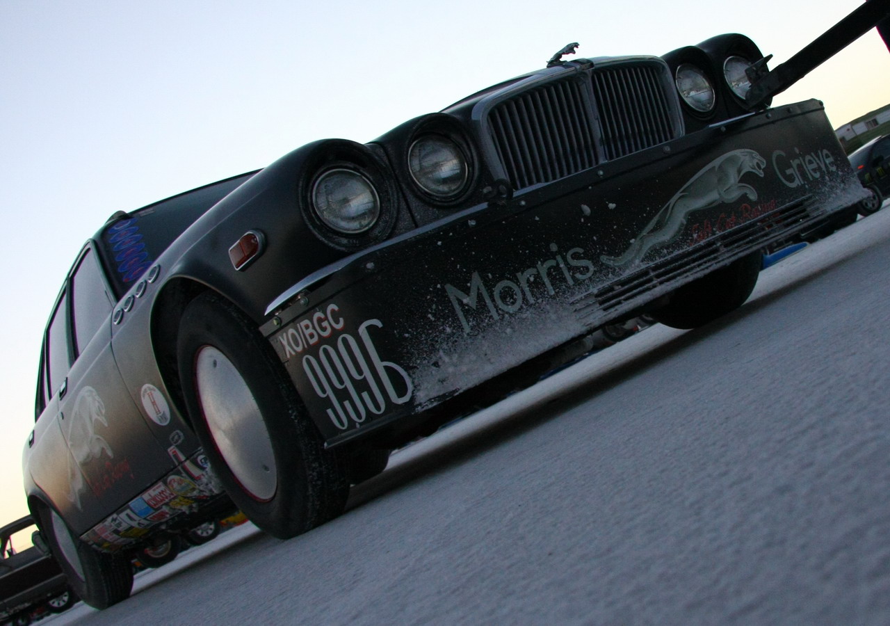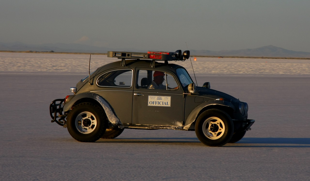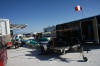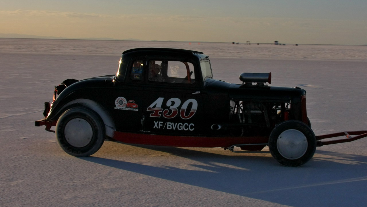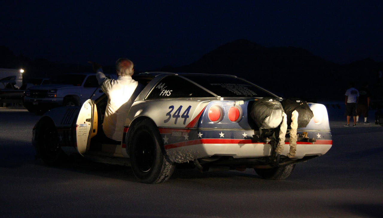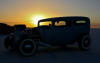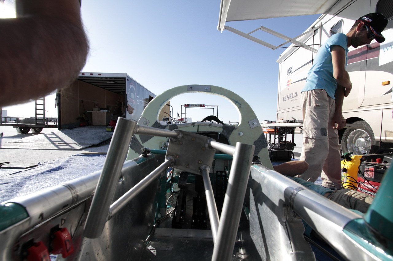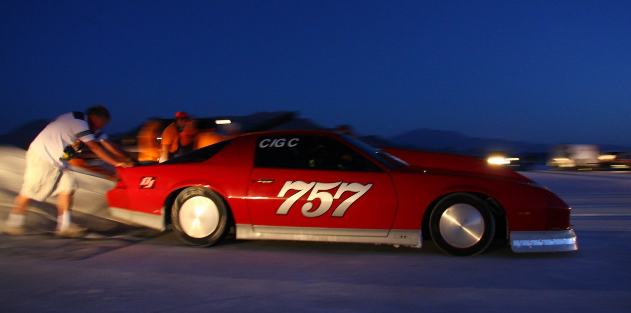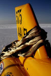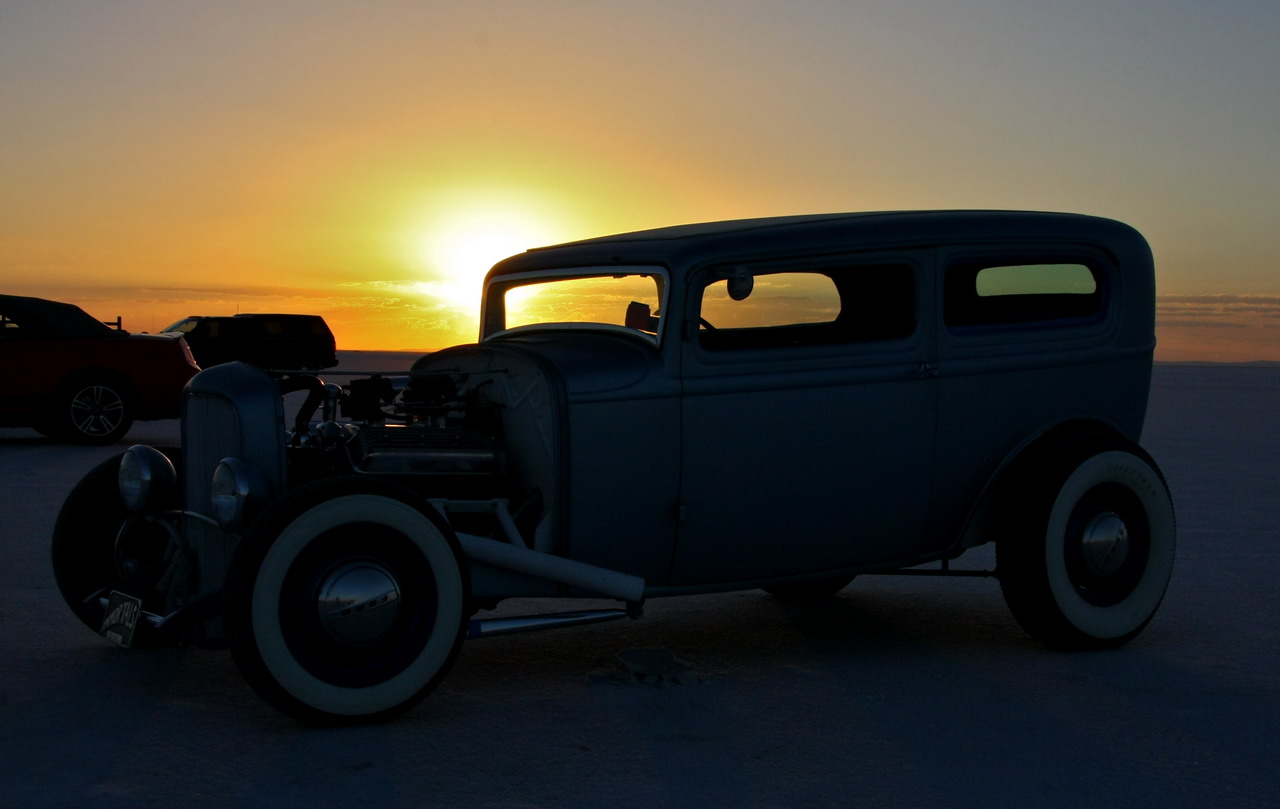 et nous n'allons pas être déçu coté sensations, émotions, spectacle et beauté.... nous quittons donc Wendover à 6h00 du mat, il fait une température idéale pour rouler en Stang décapotée (déjà 86°F soit 30°C!!), il fait nuit noire, nous nous dirigeons vers l'est et découvrons enfin le fameux panneau "Bonneville Speedway Exit 4", nous prenons la bretelle et nous engageons sur une route goudronnée entourée d'une immensité plate, il fait tellement noir que nous ne distinguons absolument rien autour, heureusement nous ne sommes pas seuls et nous guidons sur les feux rouges devant nous .... puis, à un moment un petit dévers en pente devant nous, que nous descendons, puis plus rien, plus de goudron, plus de traces, rien, le vide total, l'immensité totale.... Franck Sinatra à la radio, le moment est grandiose.... nous continuons quand même, à allure réduite, sans aucun repère, sur une surface totalement étrangère mais où la Stang se comporte plutôt bien, puis nous commençons à nous faire dépasser par des voitures sur autant de pistes parallèles qu'il peut y avoir de feux rouges !! Nous les suivons donc, et sans s'en rendre compte vu qu'il fait toujours nuit noire et au bout de quelques miles, nous pénétrons en Stang à l'intérieur de l'Impound, c'est genre comme si vous rentriez dans un paddock de F1 et que vous circuliez en voiture à travers les semis transportant les voitures, les motorhomes sans que vous en vous en rendiez compte, de la folie pure, la magie de Bonneville !! c'est après avoir fait le tour et stationné la Stang que nous nous rendons compte que nous étions dans le sanctuaire de l'Impound, nous prenons alors nos armes photographiques, et là, le spectacle son et lumière commence ....