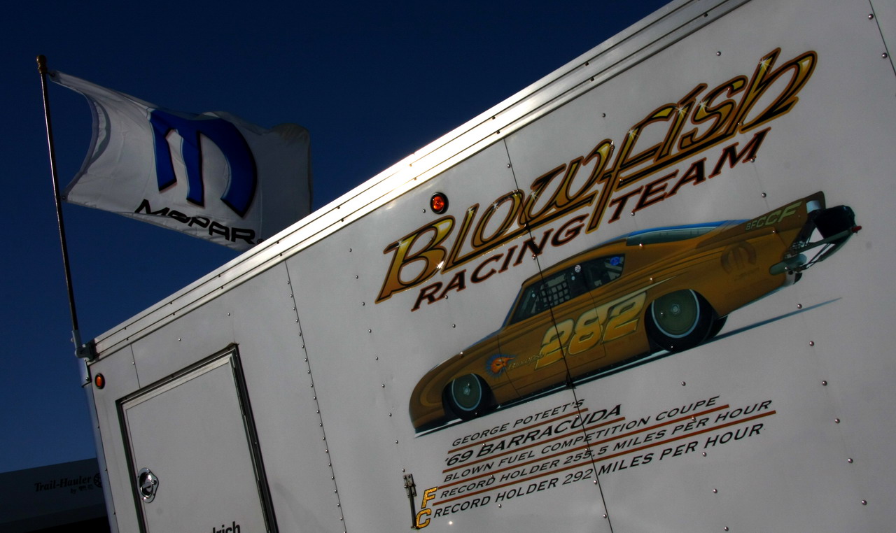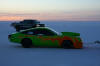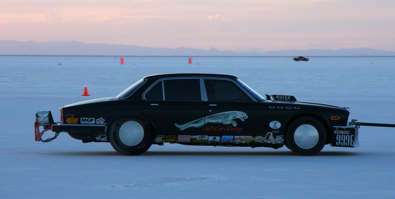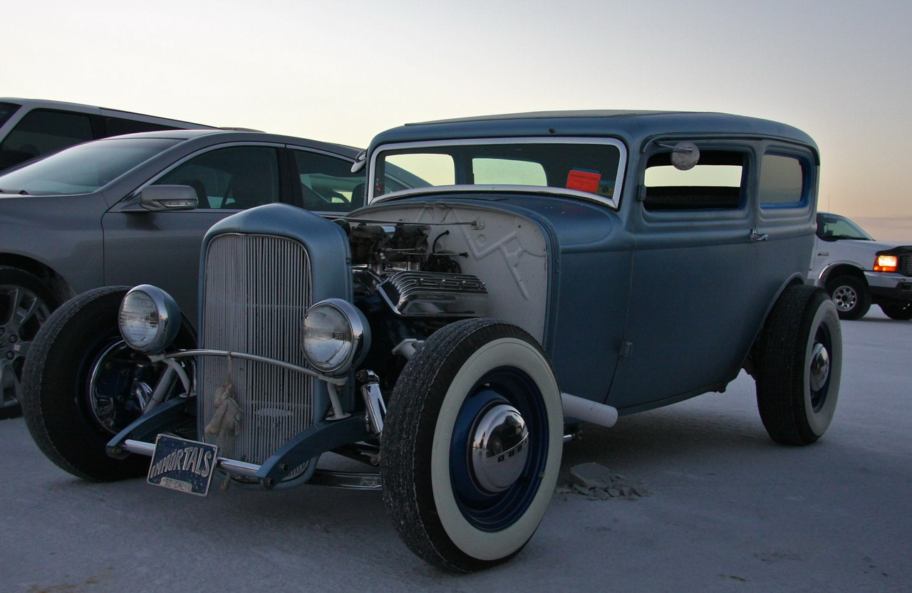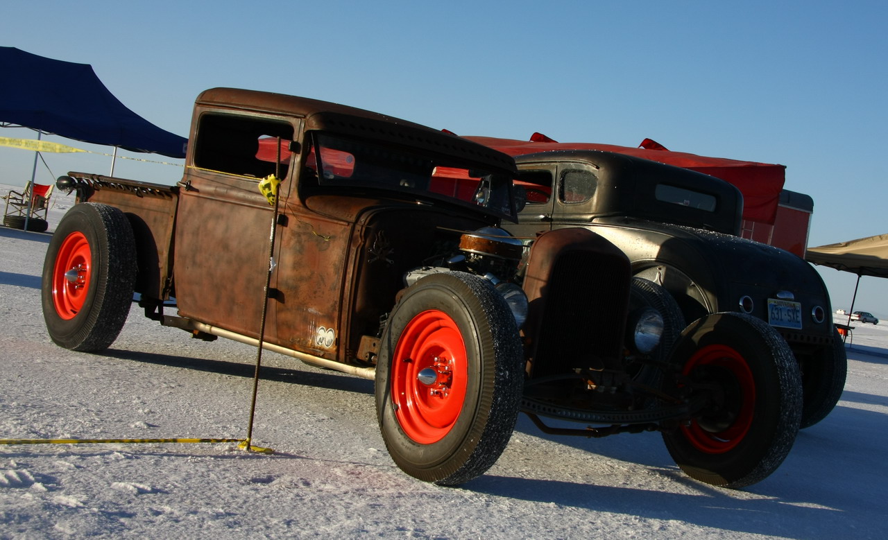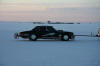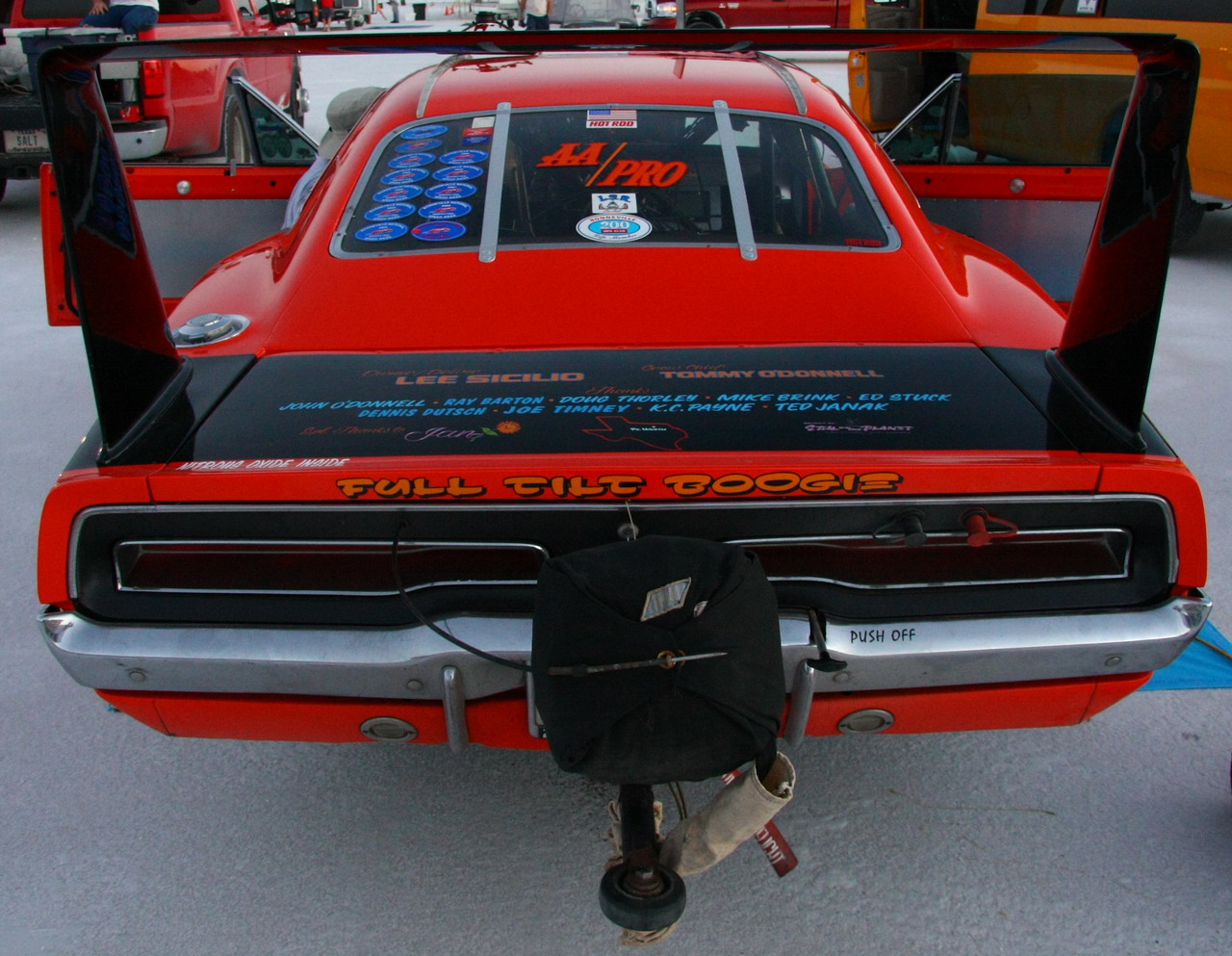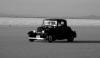 et nous n'allons pas être déçu coté sensations, émotions, spectacle et beauté.... nous quittons donc Wendover à 6h00 du mat, il fait une température idéale pour rouler en Stang décapotée (déjà 86°F soit 30°C!!), il fait nuit noire, nous nous dirigeons vers l'est et découvrons enfin le fameux panneau "Bonneville Speedway Exit 4", nous prenons la bretelle et nous engageons sur une route goudronnée entourée d'une immensité plate, il fait tellement noir que nous ne distinguons absolument rien autour, heureusement nous ne sommes pas seuls et nous guidons sur les feux rouges devant nous .... puis, à un moment un petit dévers en pente devant nous, que nous descendons, puis plus rien, plus de goudron, plus de traces, rien, le vide total, l'immensité totale.... Franck Sinatra à la radio, le moment est grandiose.... nous continuons quand même, à allure réduite, sans aucun repère, sur une surface totalement étrangère mais où la Stang se comporte plutôt bien, puis nous commençons à nous faire dépasser par des voitures sur autant de pistes parallèles qu'il peut y avoir de feux rouges !! Nous les suivons donc, et sans s'en rendre compte vu qu'il fait toujours nuit noire et au bout de quelques miles, nous pénétrons en Stang à l'intérieur de l'Impound, c'est genre comme si vous rentriez dans un paddock de F1 et que vous circuliez en voiture à travers les semis transportant les voitures, les motorhomes sans que vous en vous en rendiez compte, de la folie pure, la magie de Bonneville !! c'est après avoir fait le tour et stationné la Stang que nous nous rendons compte que nous étions dans le sanctuaire de l'Impound, nous prenons alors nos armes photographiques, et là, le spectacle son et lumière commence ....