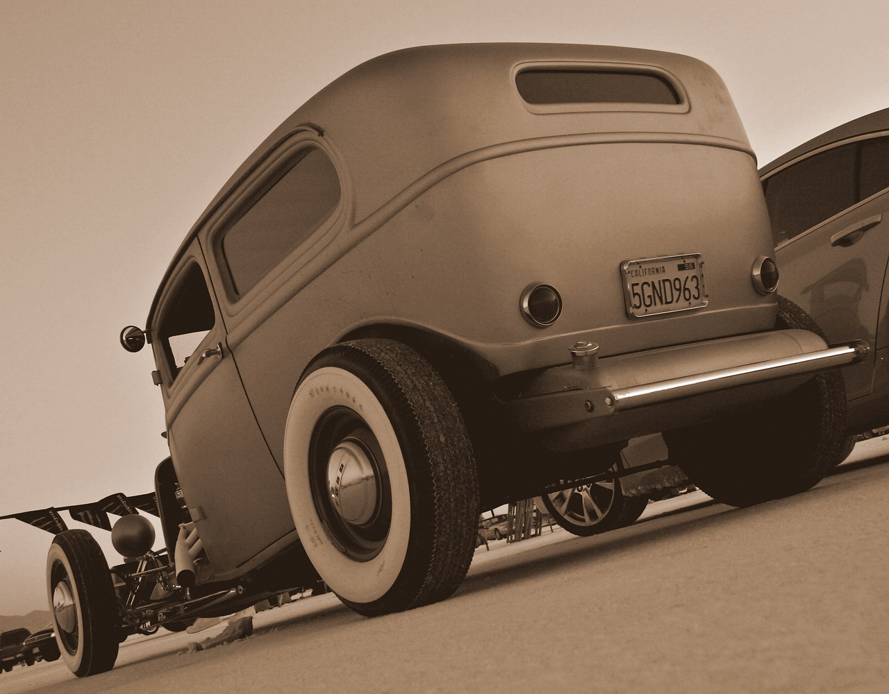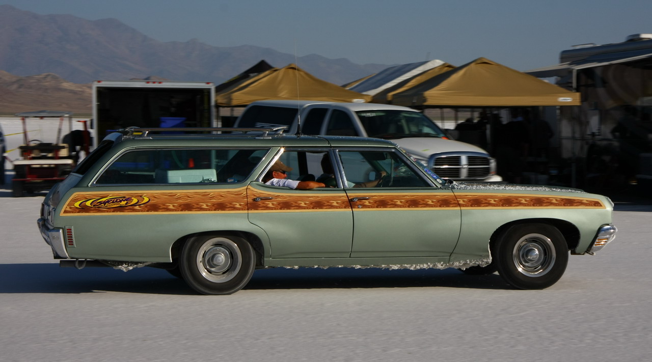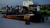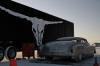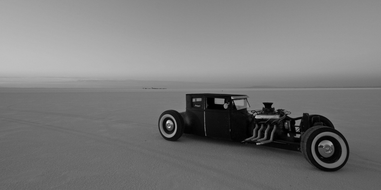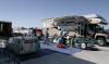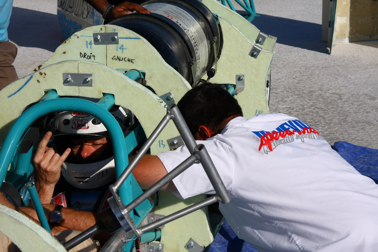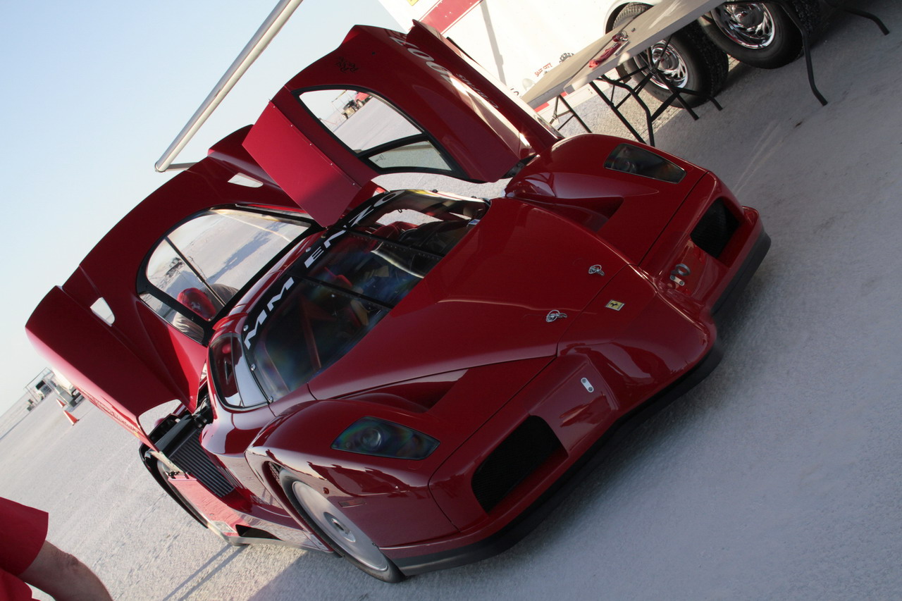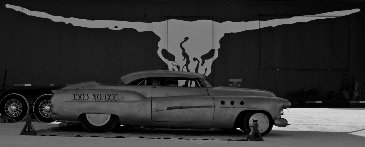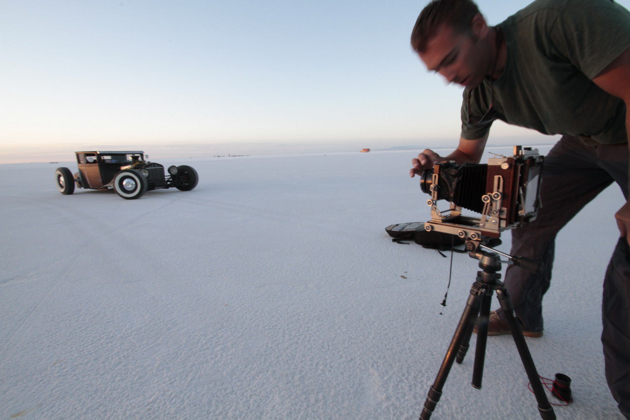 et nous n'allons pas être déçu coté sensations, émotions, spectacle et beauté.... nous quittons donc Wendover à 6h00 du mat, il fait une température idéale pour rouler en Stang décapotée (déjà 86°F soit 30°C!!), il fait nuit noire, nous nous dirigeons vers l'est et découvrons enfin le fameux panneau "Bonneville Speedway Exit 4", nous prenons la bretelle et nous engageons sur une route goudronnée entourée d'une immensité plate, il fait tellement noir que nous ne distinguons absolument rien autour, heureusement nous ne sommes pas seuls et nous guidons sur les feux rouges devant nous .... puis, à un moment un petit dévers en pente devant nous, que nous descendons, puis plus rien, plus de goudron, plus de traces, rien, le vide total, l'immensité totale.... Franck Sinatra à la radio, le moment est grandiose.... nous continuons quand même, à allure réduite, sans aucun repère, sur une surface totalement étrangère mais où la Stang se comporte plutôt bien, puis nous commençons à nous faire dépasser par des voitures sur autant de pistes parallèles qu'il peut y avoir de feux rouges !! Nous les suivons donc, et sans s'en rendre compte vu qu'il fait toujours nuit noire et au bout de quelques miles, nous pénétrons en Stang à l'intérieur de l'Impound, c'est genre comme si vous rentriez dans un paddock de F1 et que vous circuliez en voiture à travers les semis transportant les voitures, les motorhomes sans que vous en vous en rendiez compte, de la folie pure, la magie de Bonneville !! c'est après avoir fait le tour et stationné la Stang que nous nous rendons compte que nous étions dans le sanctuaire de l'Impound, nous prenons alors nos armes photographiques, et là, le spectacle son et lumière commence ....