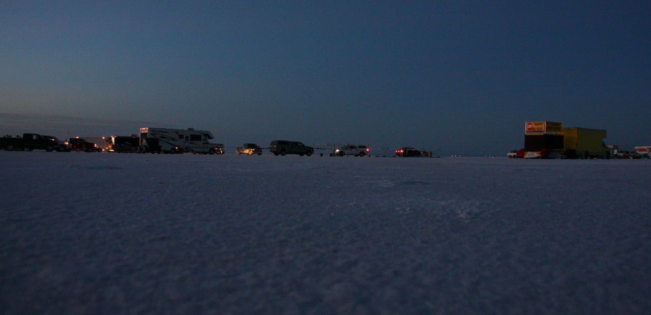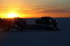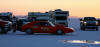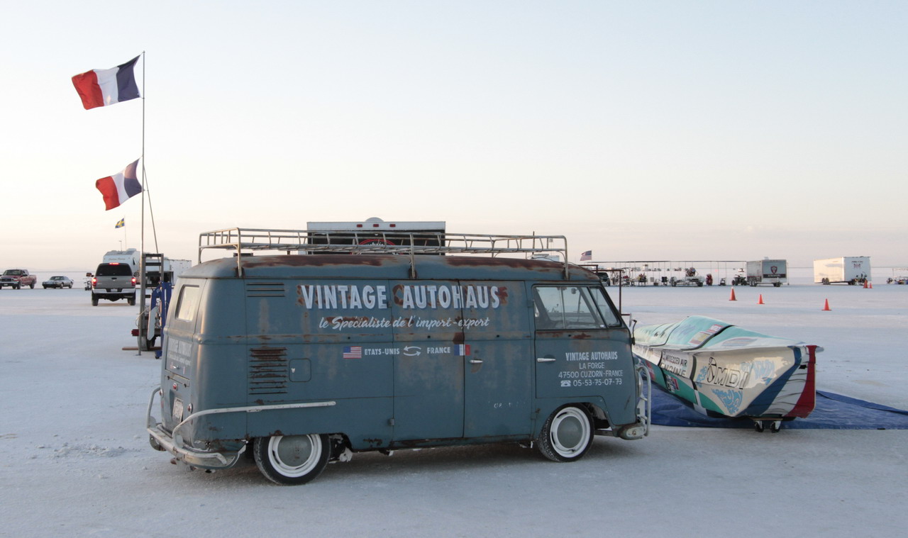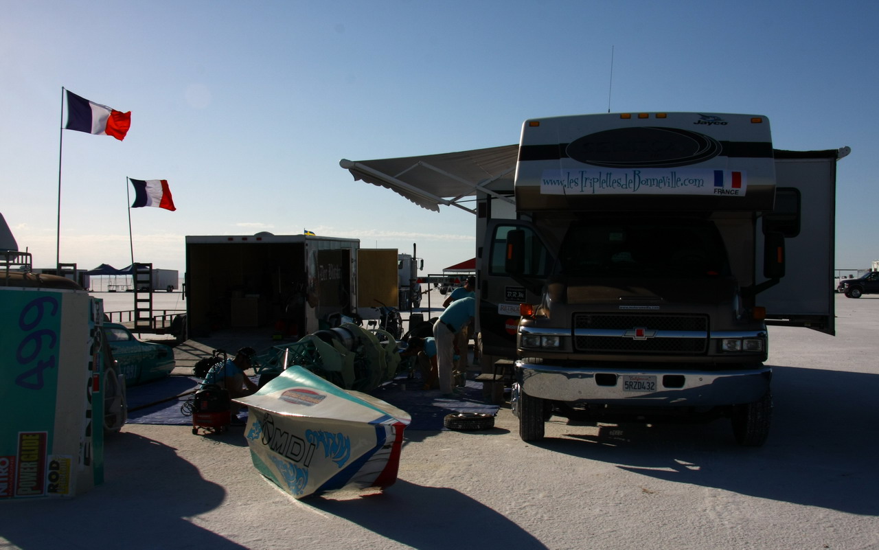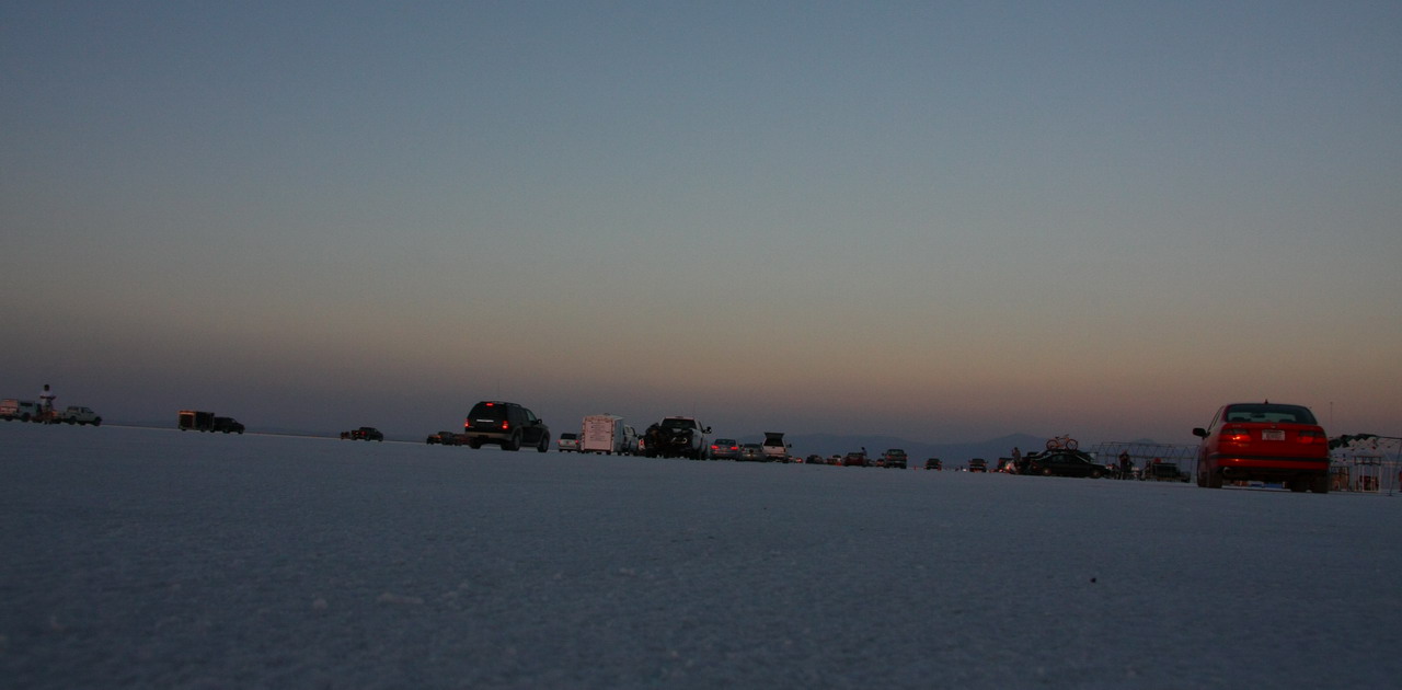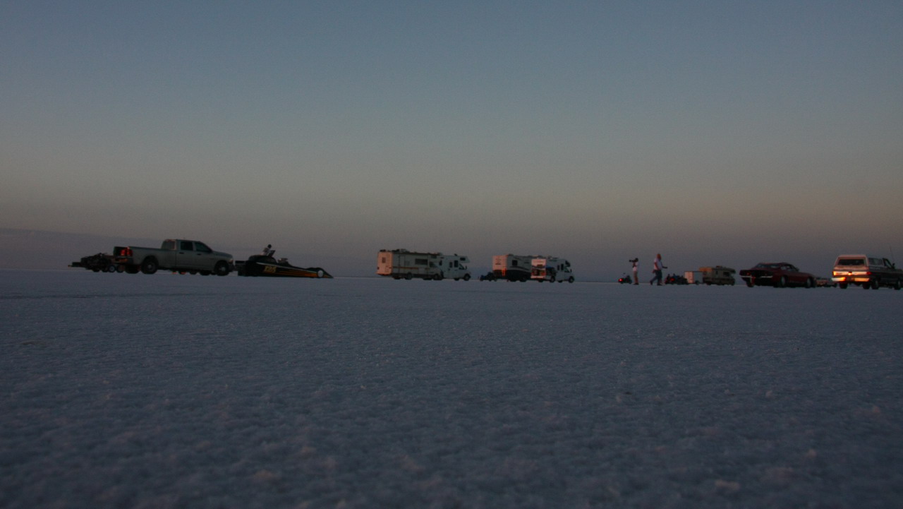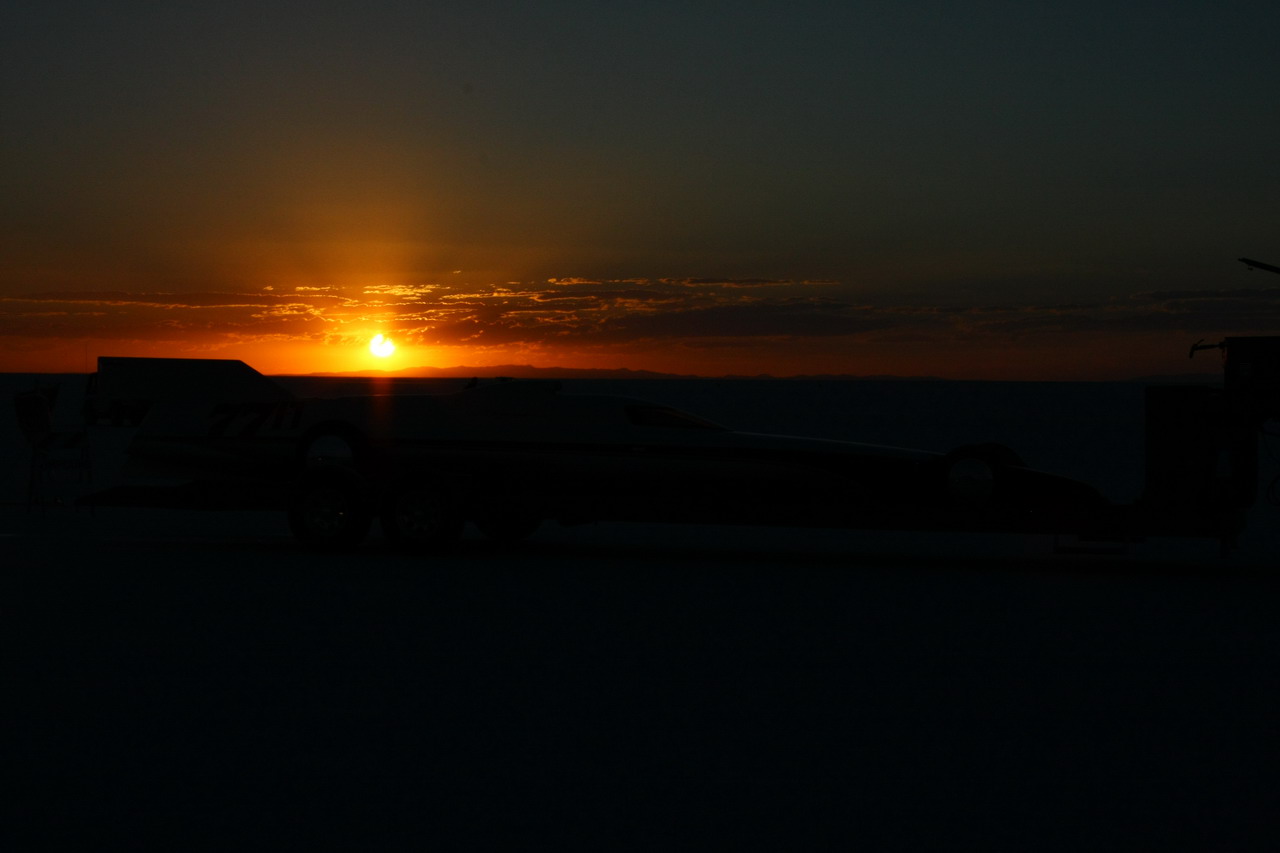 Conseillé par des figures locales, nous avions décidé de partir de nuit, d'une part pour voir l'éveil de l'impound (lieu où sont parkés les engins pour confirmer leur record par un run au petit matin) et d'autre part pour assister au lever de soleil sur l'immense étendue du lac salé, qui est, parait-il, une vraie splendeur en soi ....