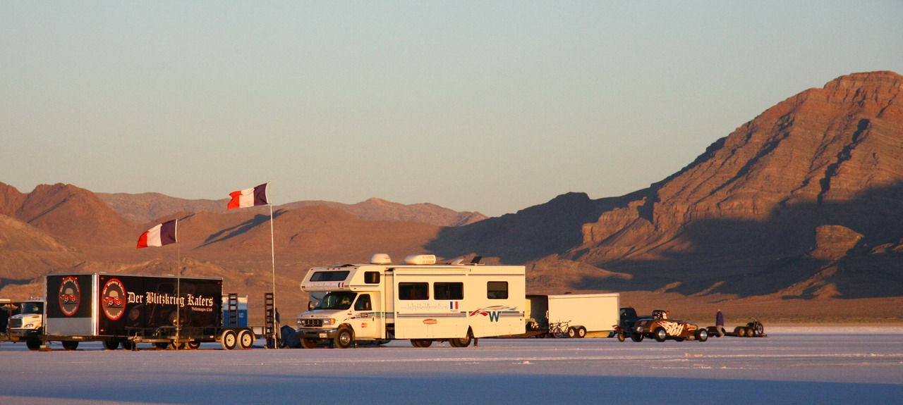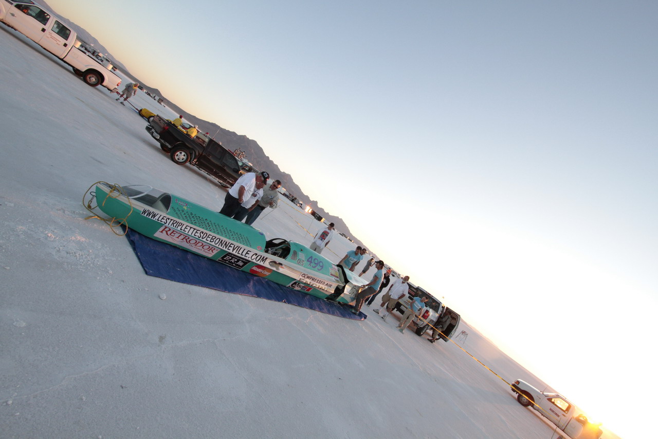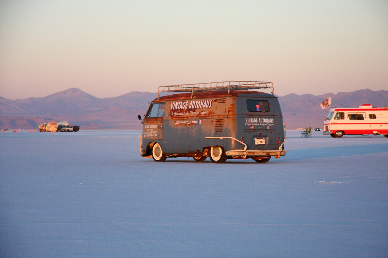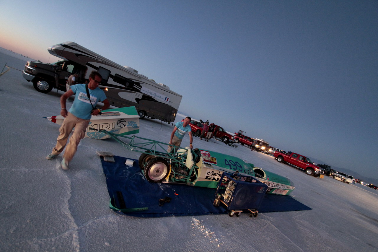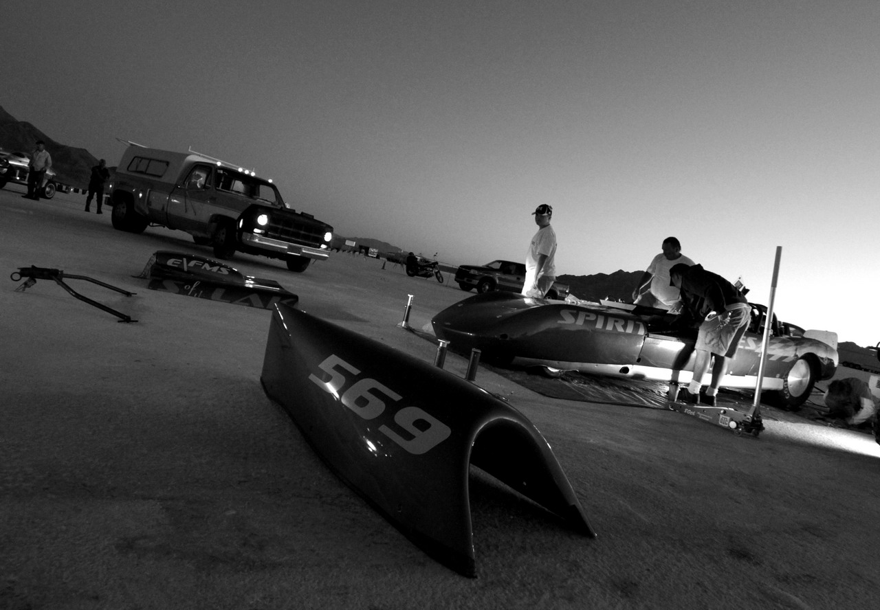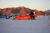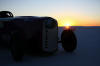 C'est le dernier jour de la Speedweek, qui ferme ses portes qui plus est à midi, les derniers runners vont donc s'activer dare-dare pour battre les derniers records!! Dernier jour, on refait l'effort de se refaire un lever de soleil sur le lac, donc départ de Wendover à 6h00, il fait toujours aussi bon à rouler décapoté mais cette fois la lumière est très différente, il ne fait pas nuit noire comme mercredi, on aura ainsi des conditions différentes, mais moins la magie (et l'angoisse??!!) de ténèbres absolues .... comme mercredi, on file direct dans l'Impound pour assister au réveil des hommes et des machines, puis nous errerons à travers le paddock, à traquer le bon angle et la bonne lumière pour immortaliser les derniers rescapés de cette fabuleuse speedweek....