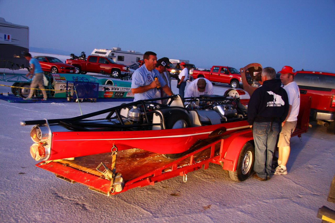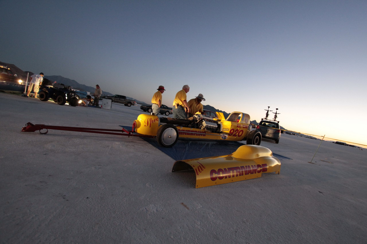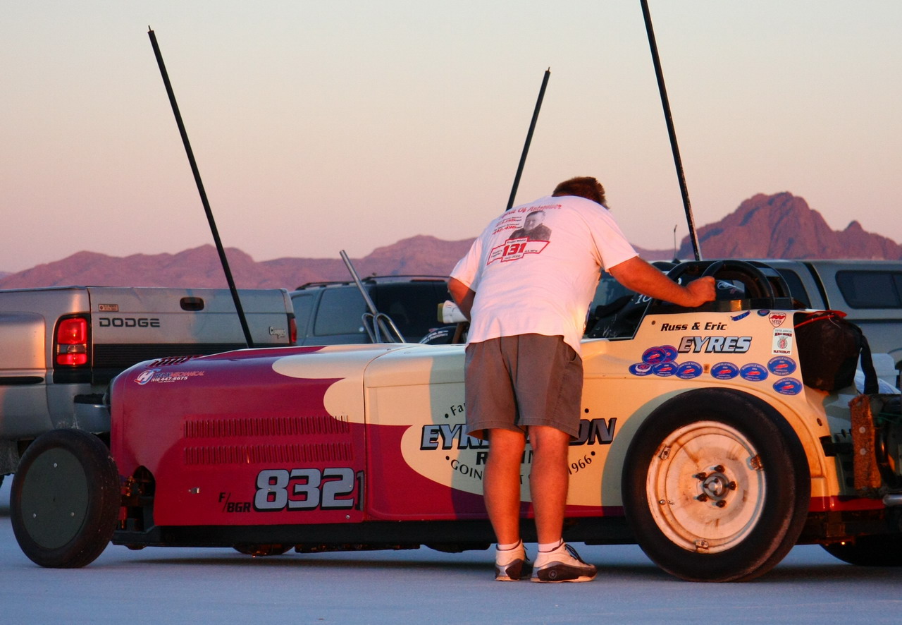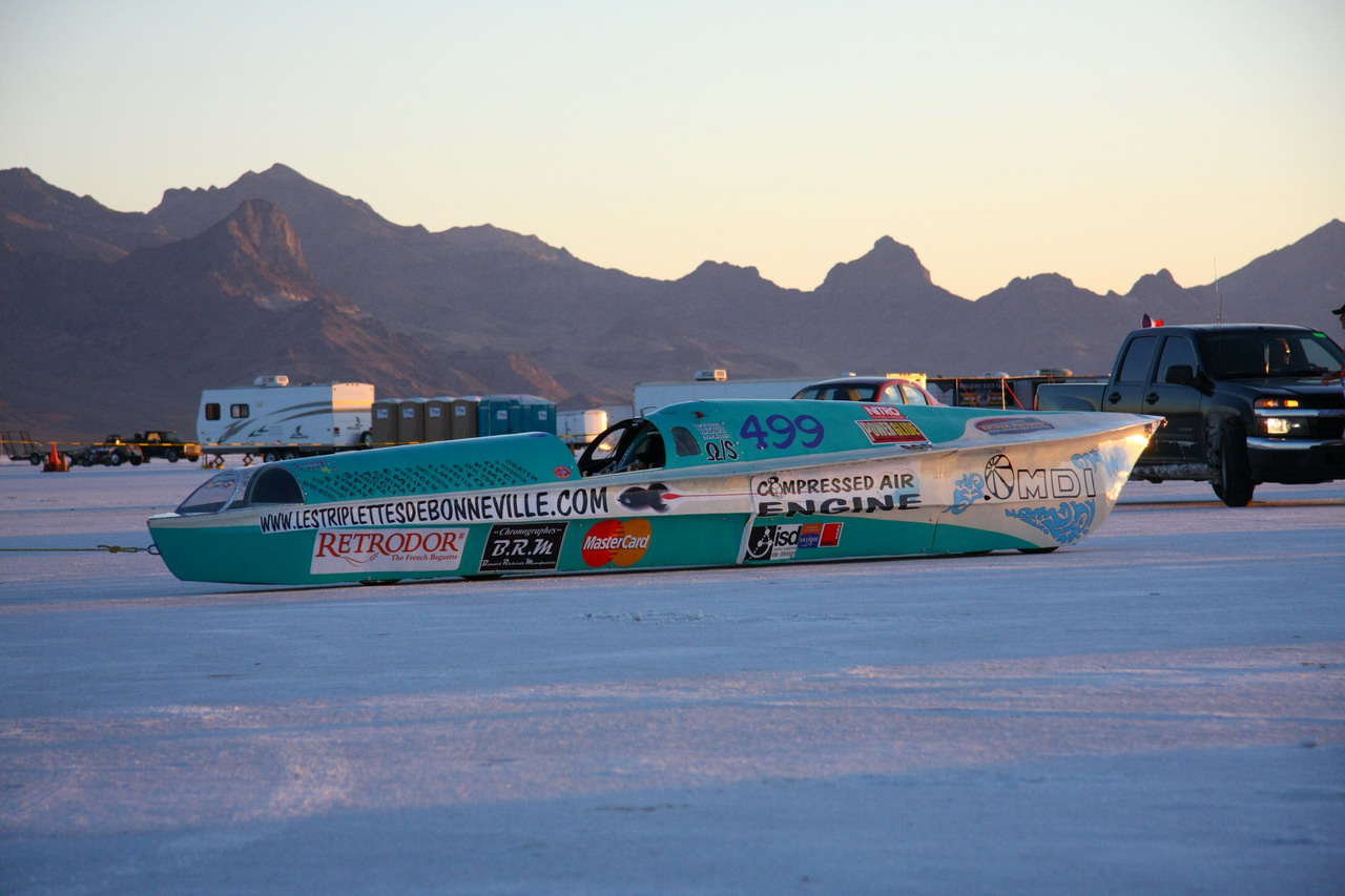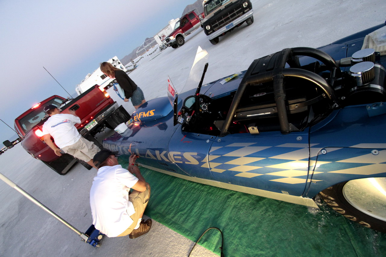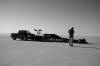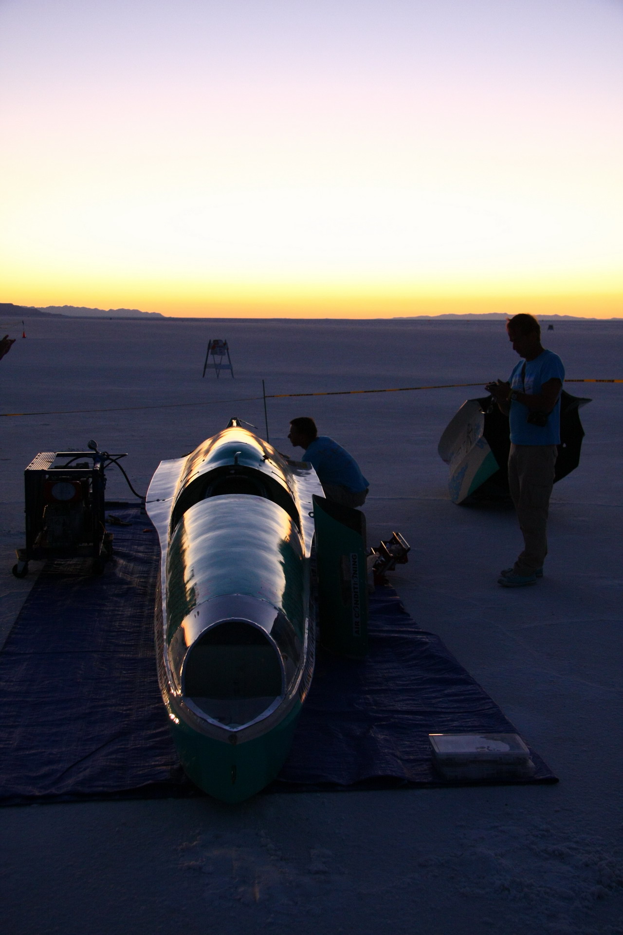 C'est le dernier jour de la Speedweek, qui ferme ses portes qui plus est à midi, les derniers runners vont donc s'activer dare-dare pour battre les derniers records!! Dernier jour, on refait l'effort de se refaire un lever de soleil sur le lac, donc départ de Wendover à 6h00, il fait toujours aussi bon à rouler décapoté mais cette fois la lumière est très différente, il ne fait pas nuit noire comme mercredi, on aura ainsi des conditions différentes, mais moins la magie (et l'angoisse??!!) de ténèbres absolues .... comme mercredi, on file direct dans l'Impound pour assister au réveil des hommes et des machines, puis nous errerons à travers le paddock, à traquer le bon angle et la bonne lumière pour immortaliser les derniers rescapés de cette fabuleuse speedweek....