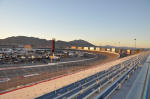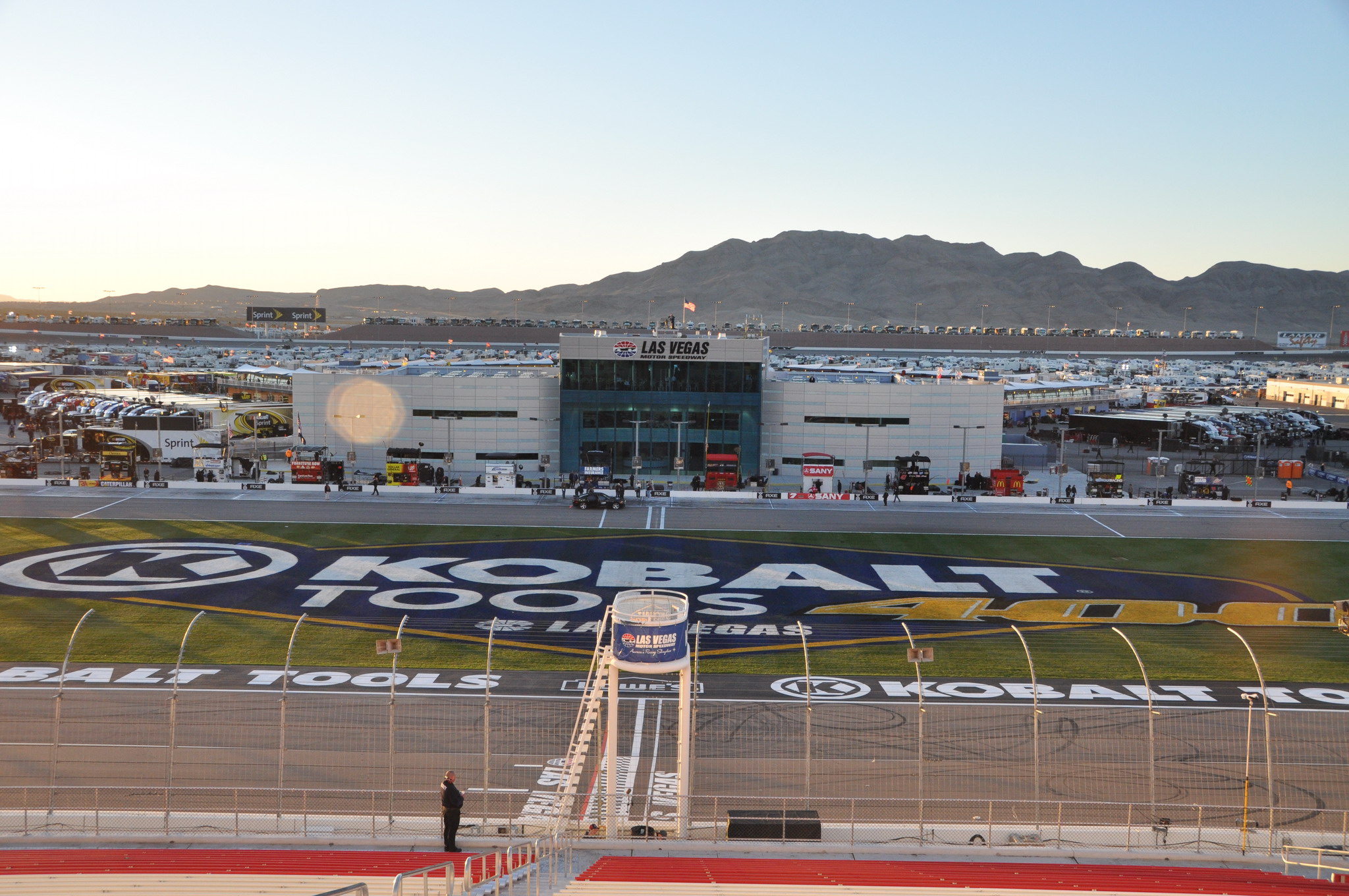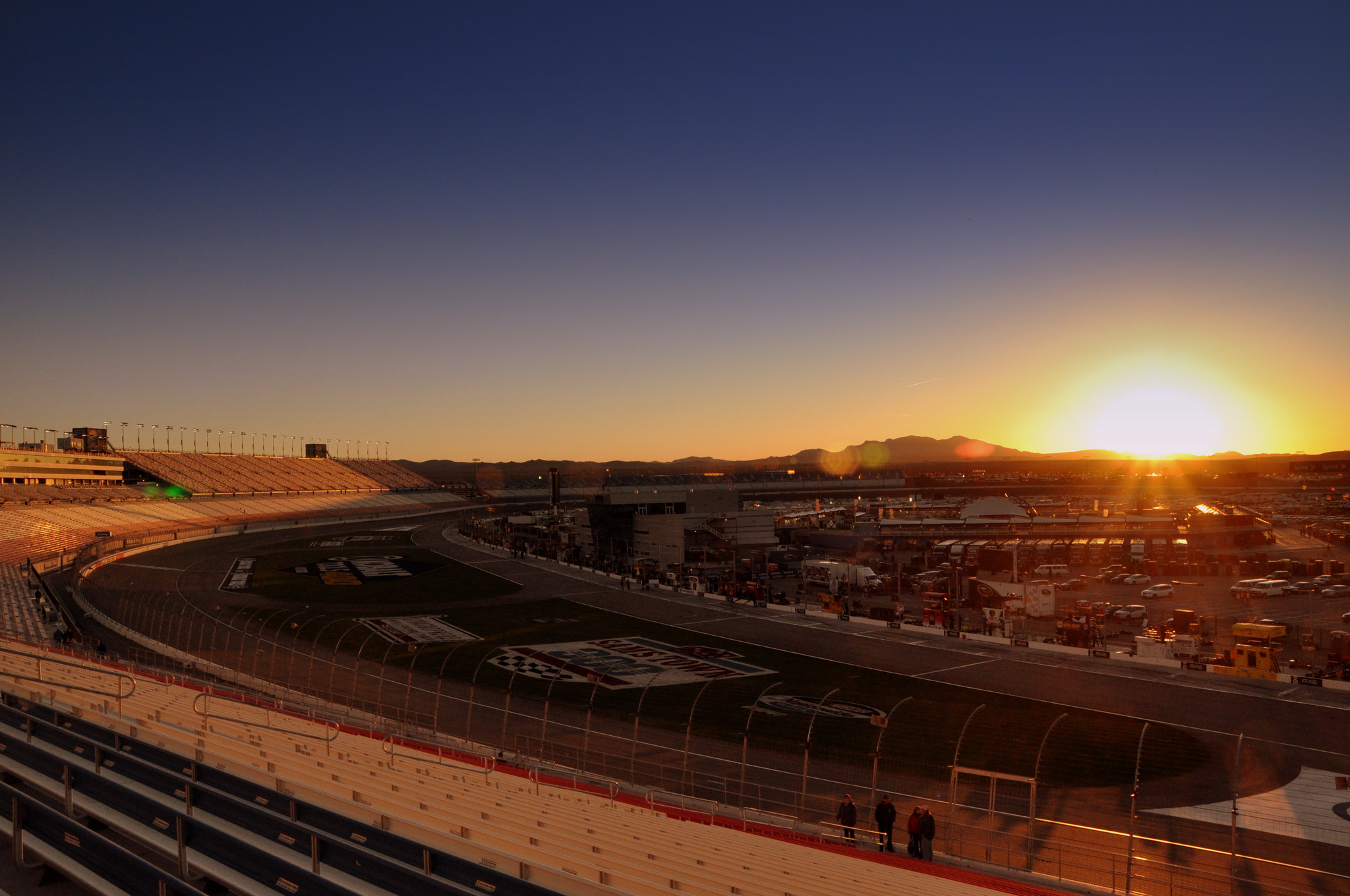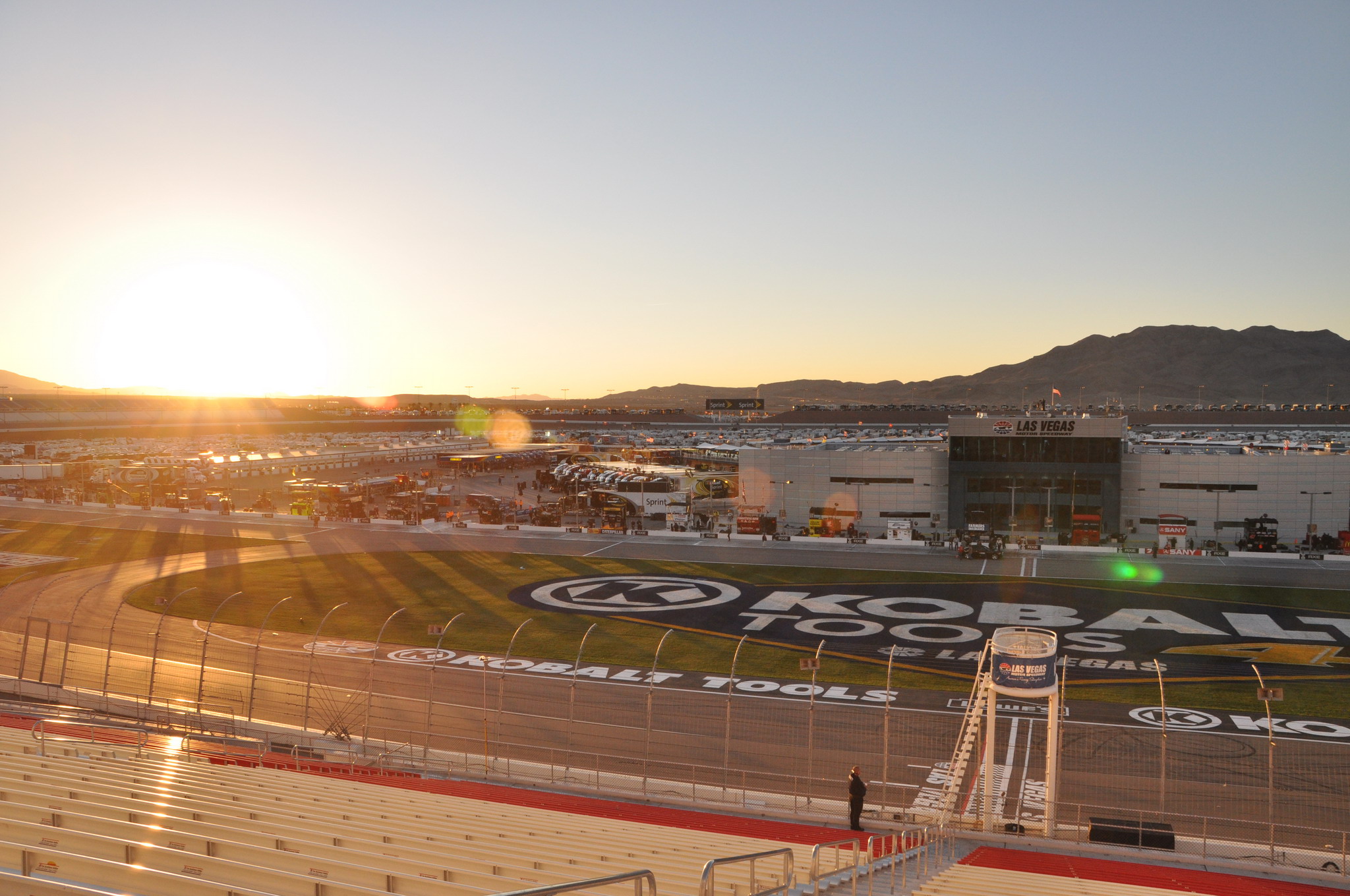 C'est dimanche et c'est donc jour de course aujourd'hui ! J'arrive à quitter l'hotel alors qu'il fait encore nuit, je remonte ainso tout le strip sans encombres et arrive au circuit sans aucun bouchon et retrouve une place sur le parking près du speedway. Les fans ne sont pas encore beaucoup arrivés, j'entre donc aussi dans le speedway sans attendre, et pour assister au lever de soleil au coeur de l'arène, splendide.... Et je fonce dans l'infield et sa fan zone qui surplombe les garages car les équipes, elles, sont levées depuis longtemps et bossent sur les voitures pour qu'elles soient fin prêtes pour la course et aller leur faire passer l'inspection d'avant-course.