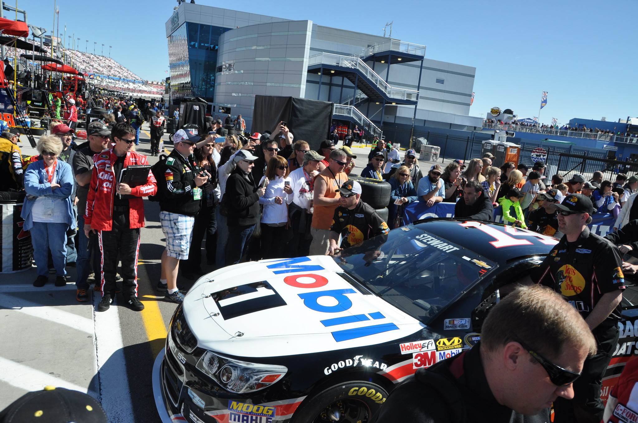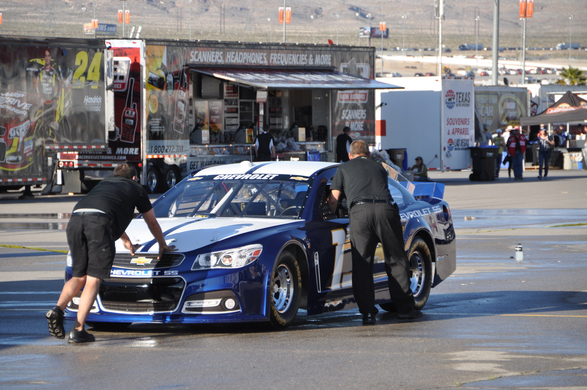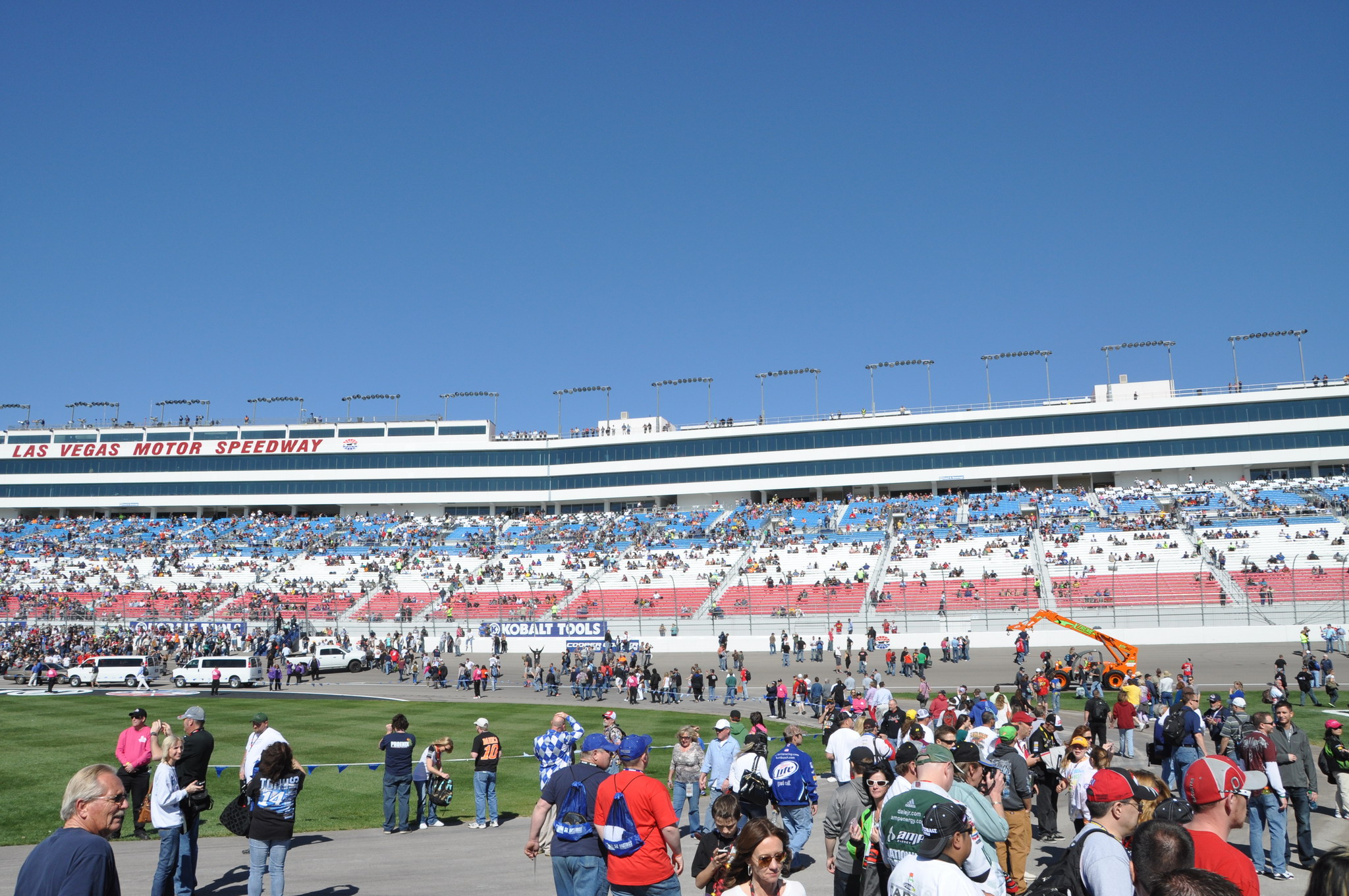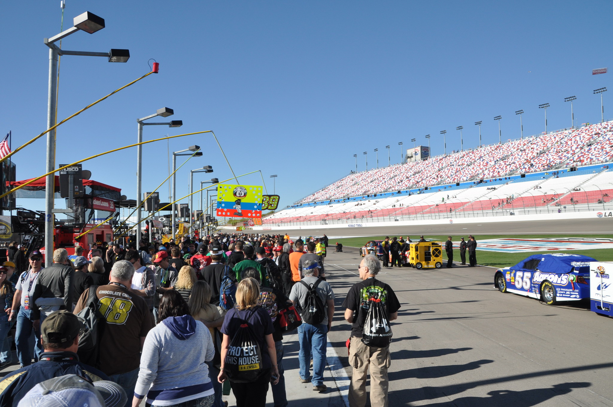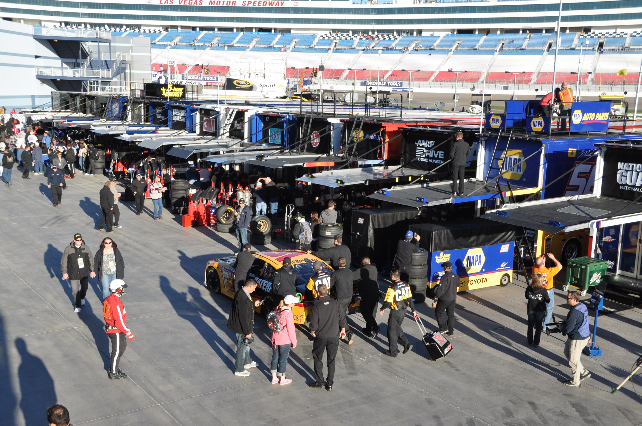 Et comme c'est de tradition le dimanche juste avant la course, et c'est aussi pour ça qu'on m'avait particulièrement conseillé la course de Vegas, toute la ligne des stands est ouverte aux fans. Les équipes, après l'inspection, y mettent les voitures, ce qui permet de toutes les voir de près, quelques animations sont organisées, avec un peu de chance, il est possible de voir les pilotes de près, le vrai spectacle de la Nascar pour les fans.