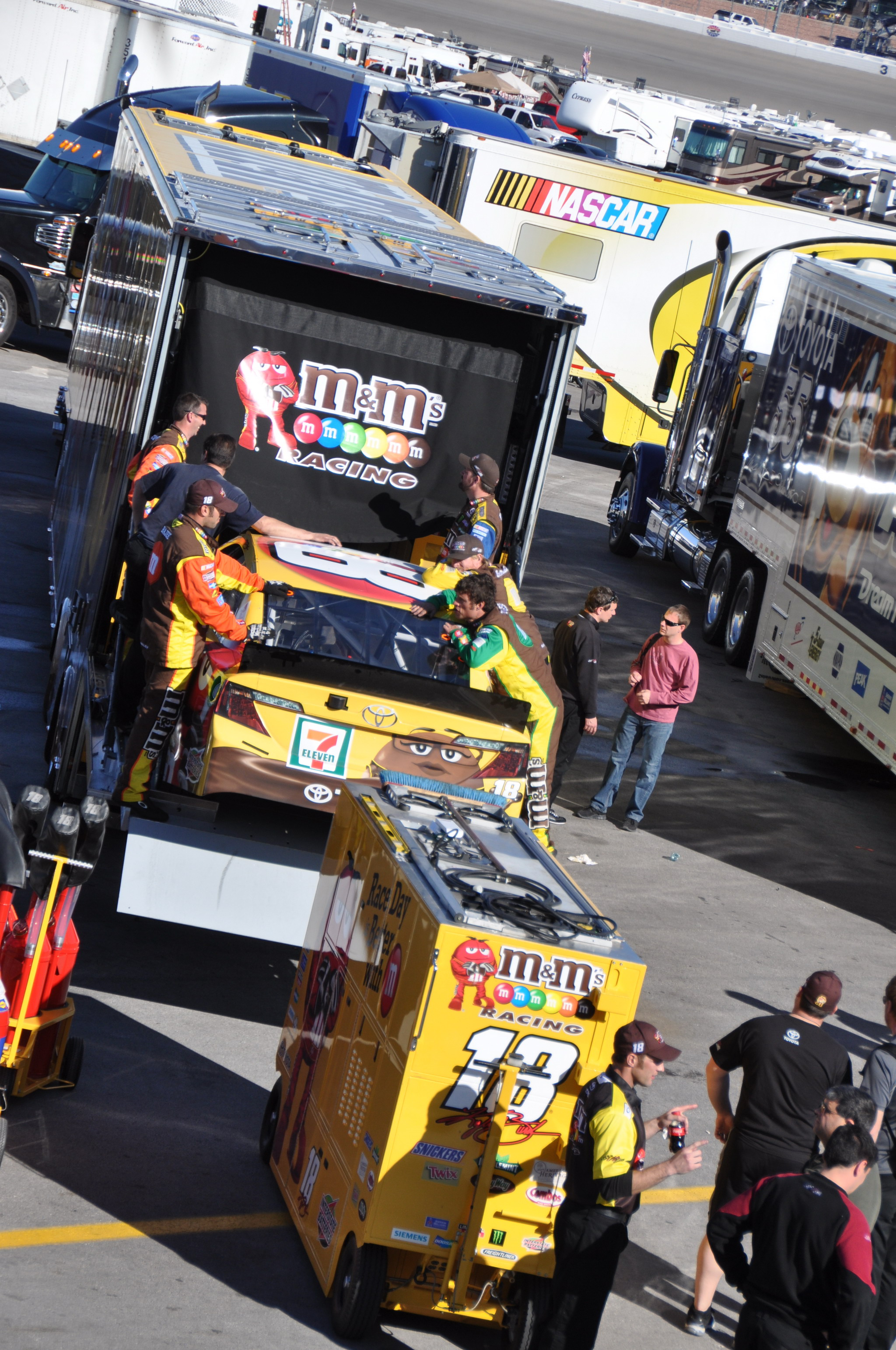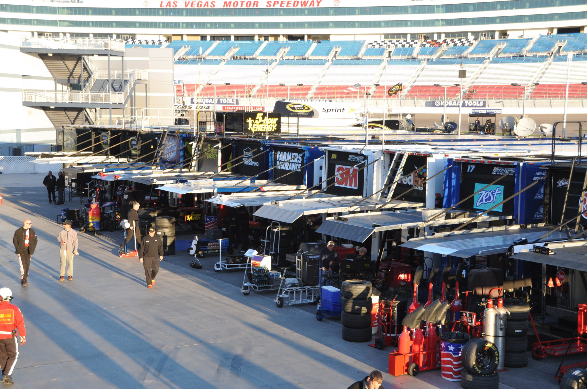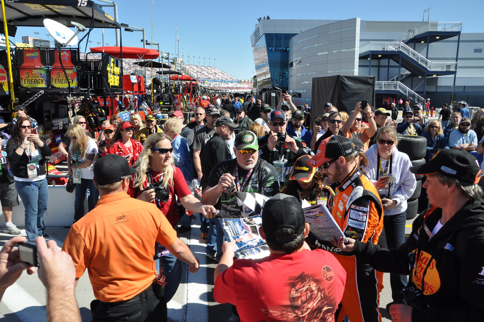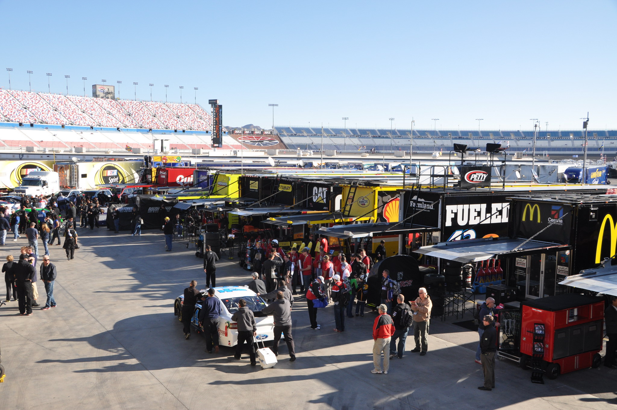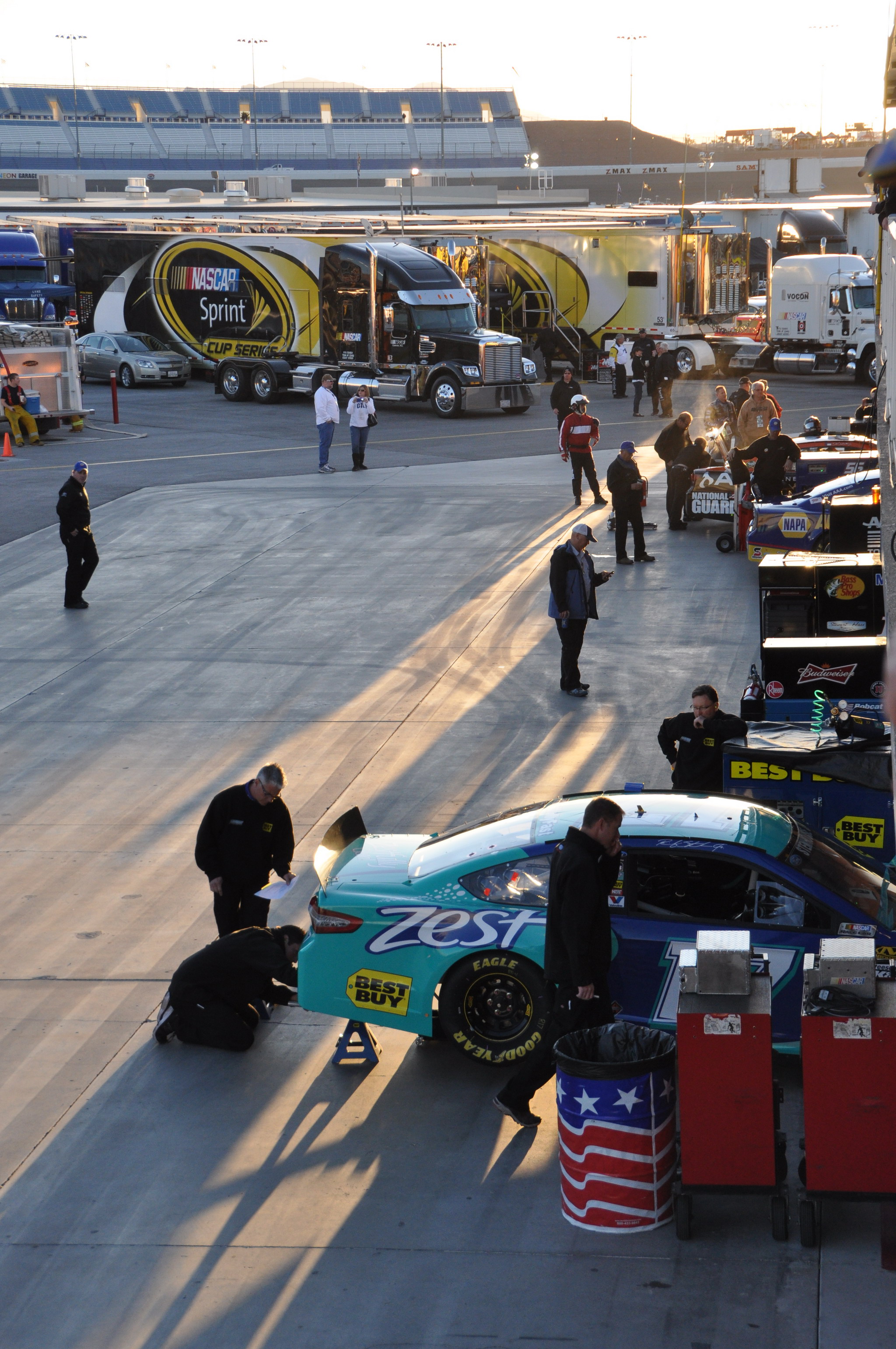 Et comme c'est de tradition le dimanche juste avant la course, et c'est aussi pour ça qu'on m'avait particulièrement conseillé la course de Vegas, toute la ligne des stands est ouverte aux fans. Les équipes, après l'inspection, y mettent les voitures, ce qui permet de toutes les voir de près, quelques animations sont organisées, avec un peu de chance, il est possible de voir les pilotes de près, le vrai spectacle de la Nascar pour les fans.