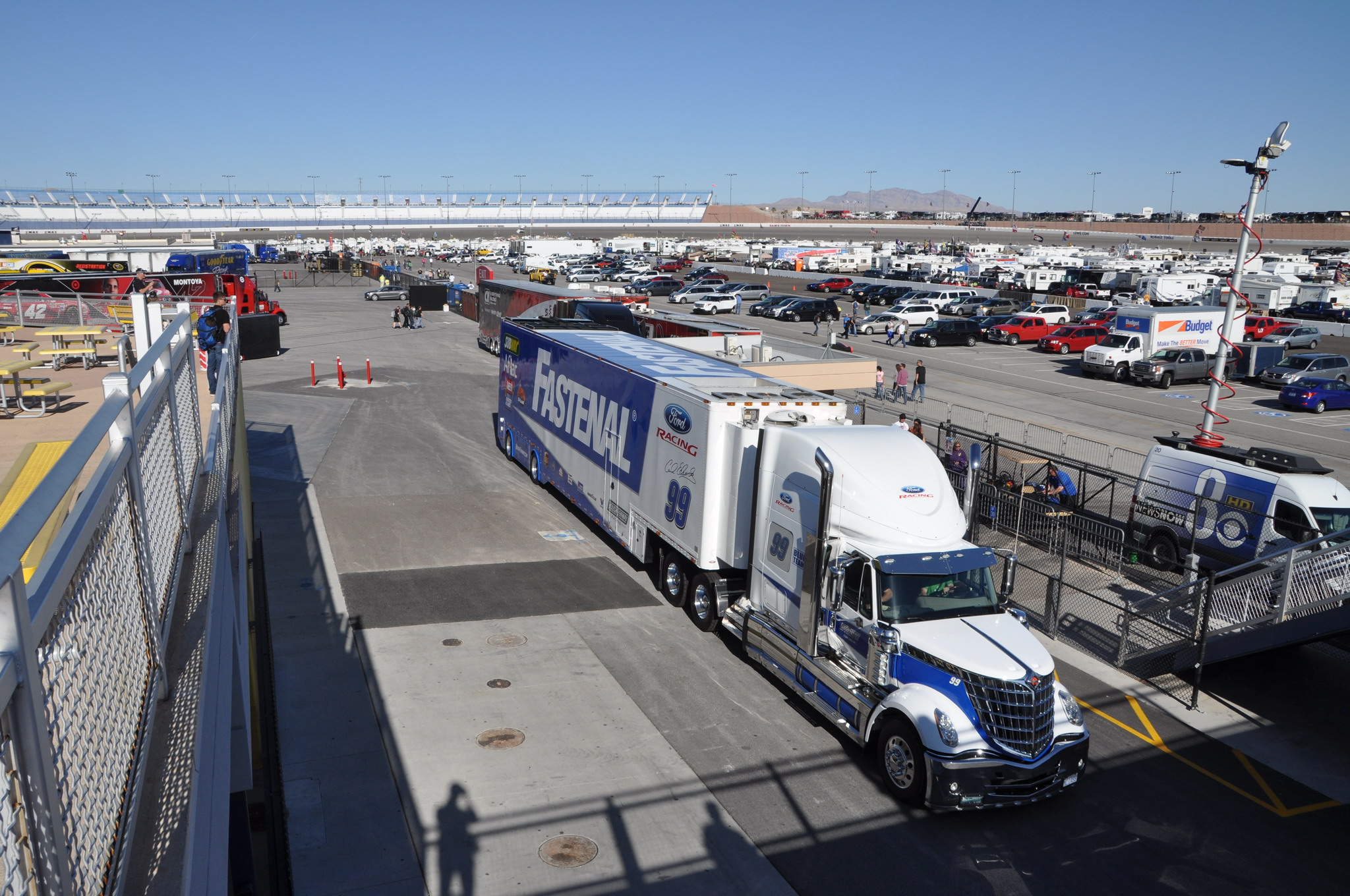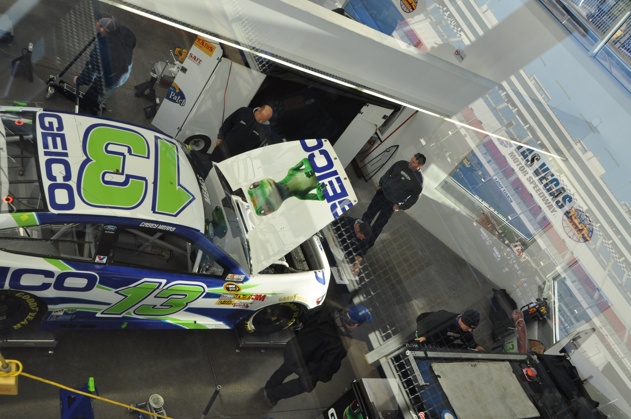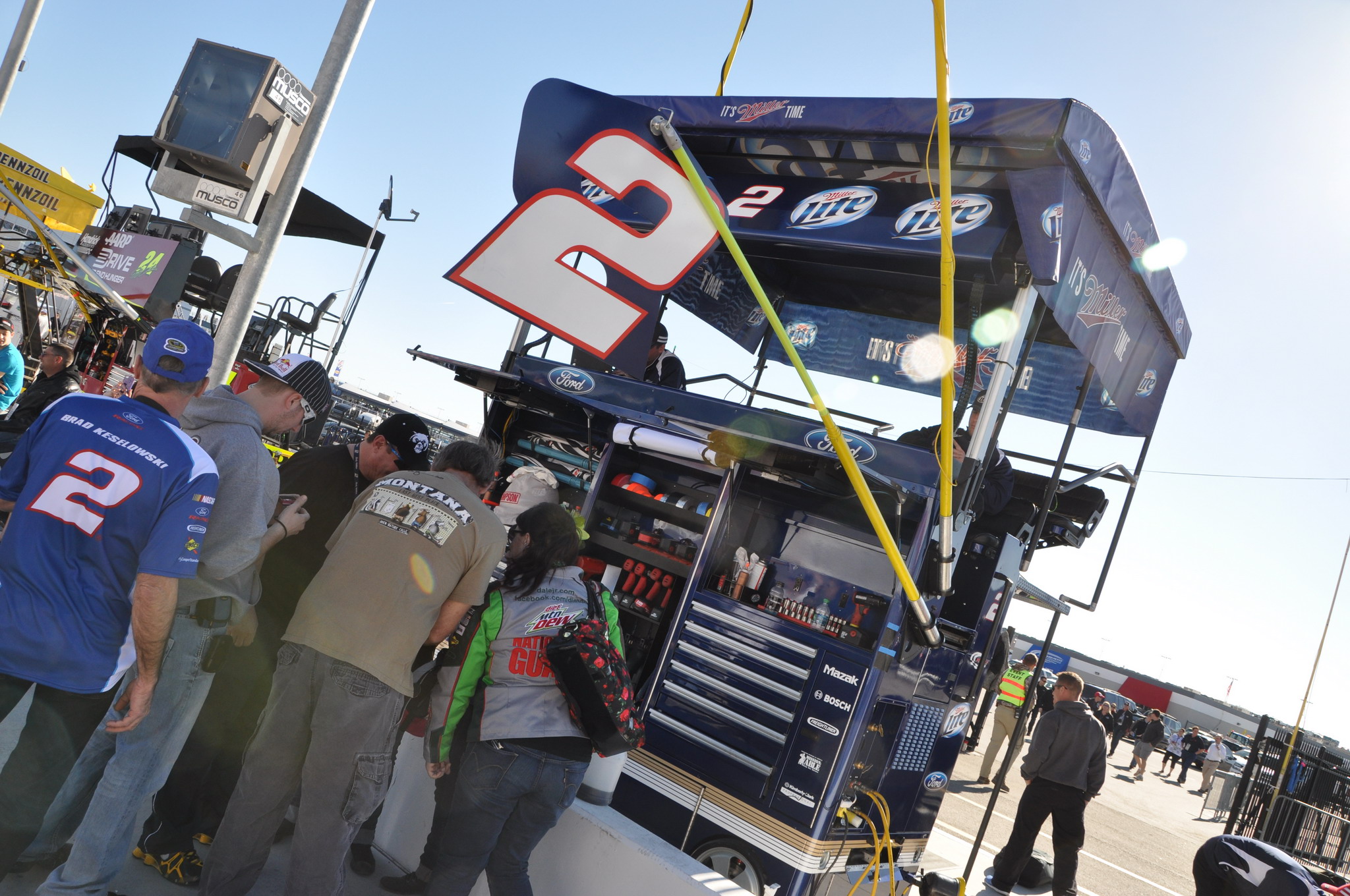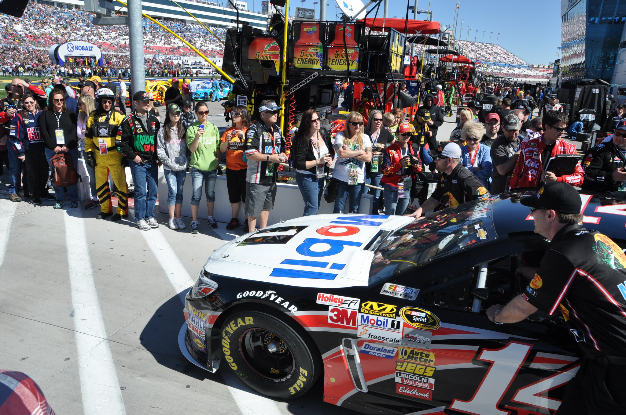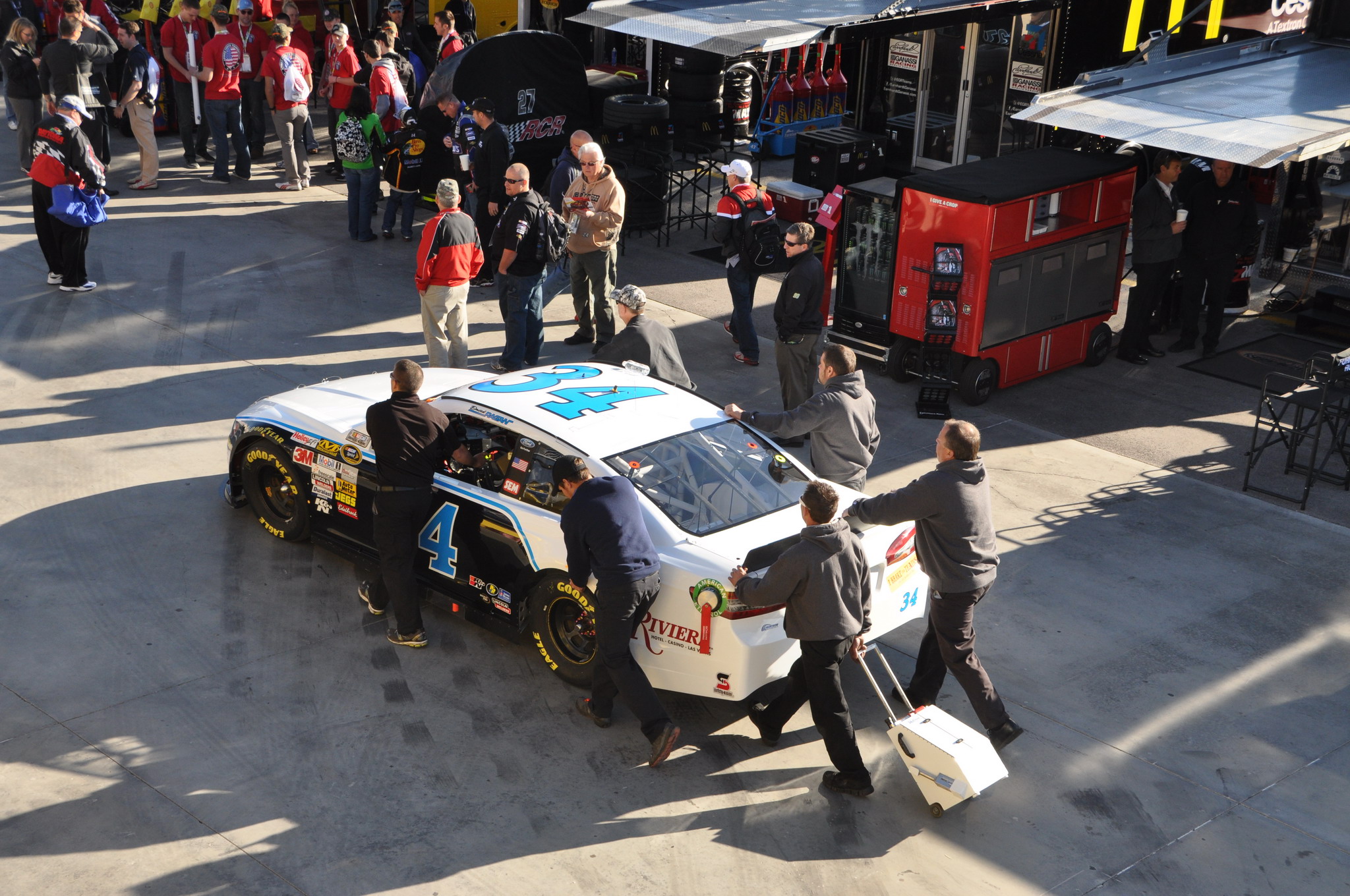 Et comme c'est de tradition le dimanche juste avant la course, et c'est aussi pour ça qu'on m'avait particulièrement conseillé la course de Vegas, toute la ligne des stands est ouverte aux fans. Les équipes, après l'inspection, y mettent les voitures, ce qui permet de toutes les voir de près, quelques animations sont organisées, avec un peu de chance, il est possible de voir les pilotes de près, le vrai spectacle de la Nascar pour les fans.