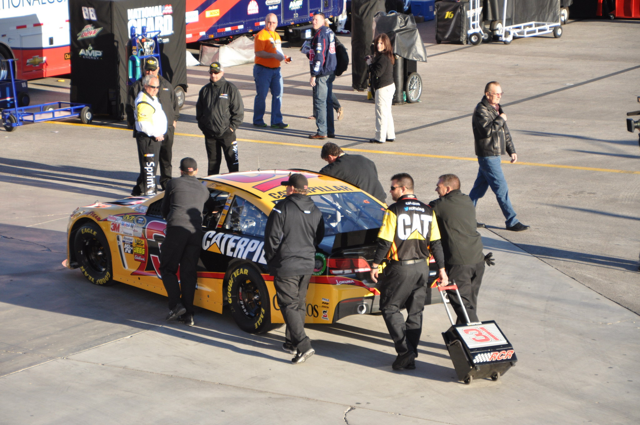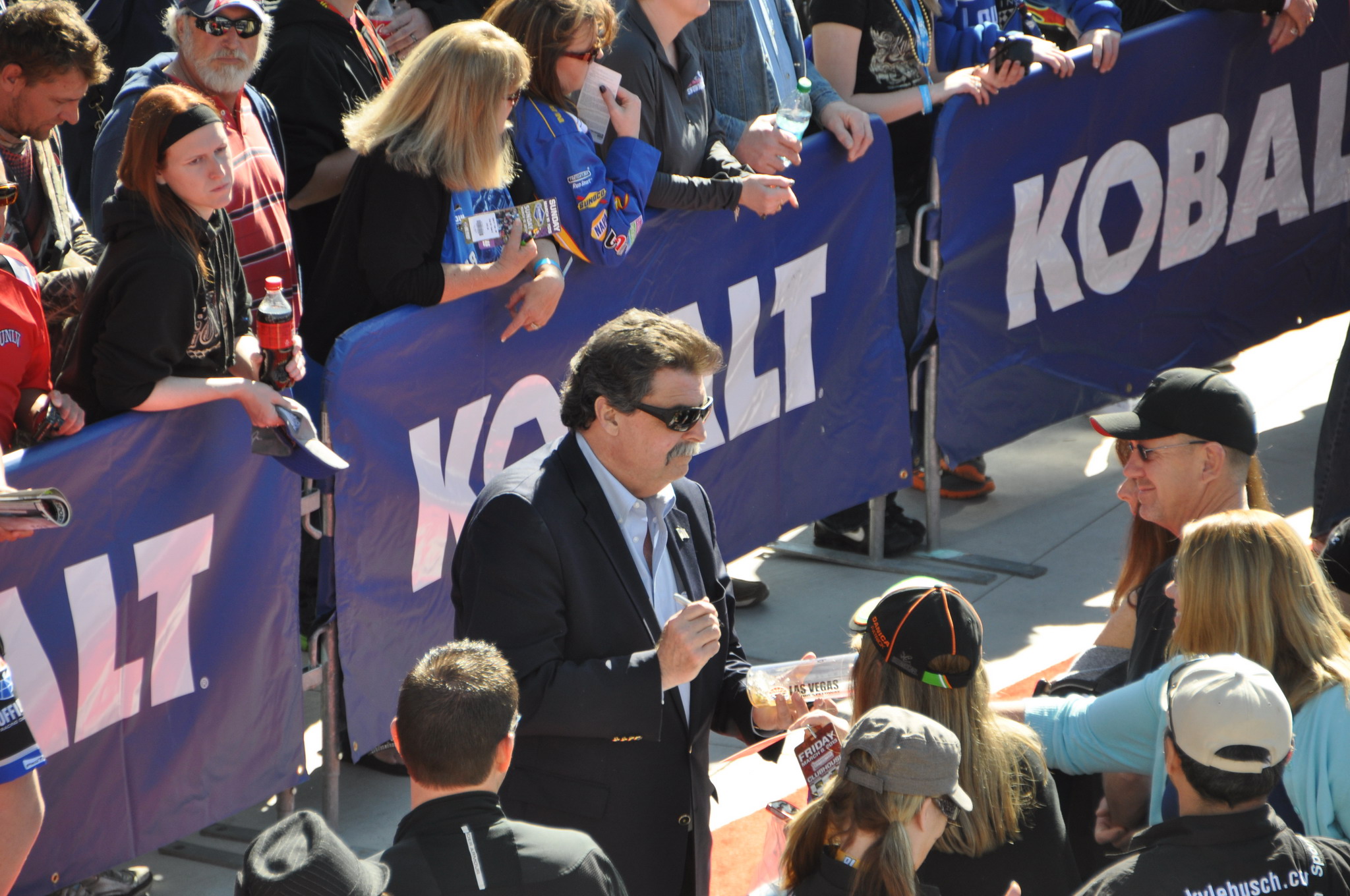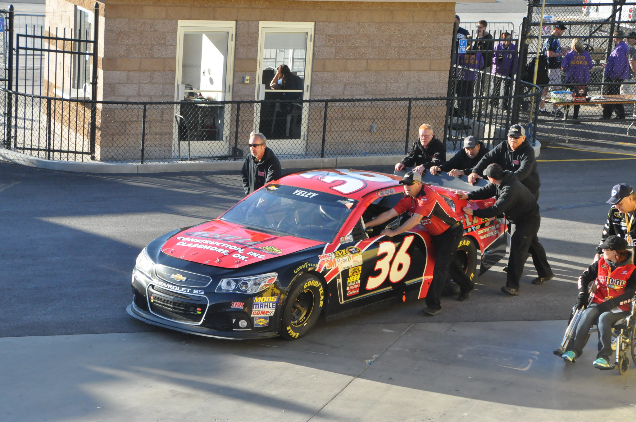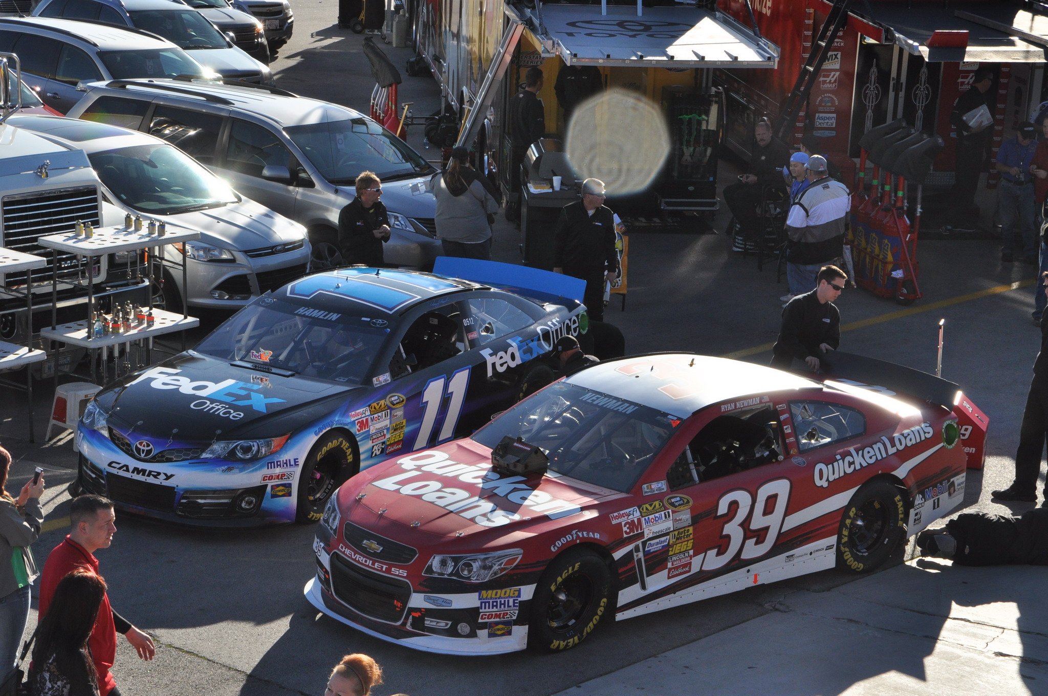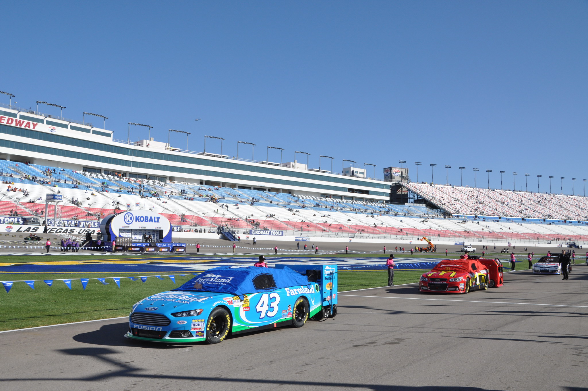 Et comme c'est de tradition le dimanche juste avant la course, et c'est aussi pour ça qu'on m'avait particulièrement conseillé la course de Vegas, toute la ligne des stands est ouverte aux fans. Les équipes, après l'inspection, y mettent les voitures, ce qui permet de toutes les voir de près, quelques animations sont organisées, avec un peu de chance, il est possible de voir les pilotes de près, le vrai spectacle de la Nascar pour les fans.