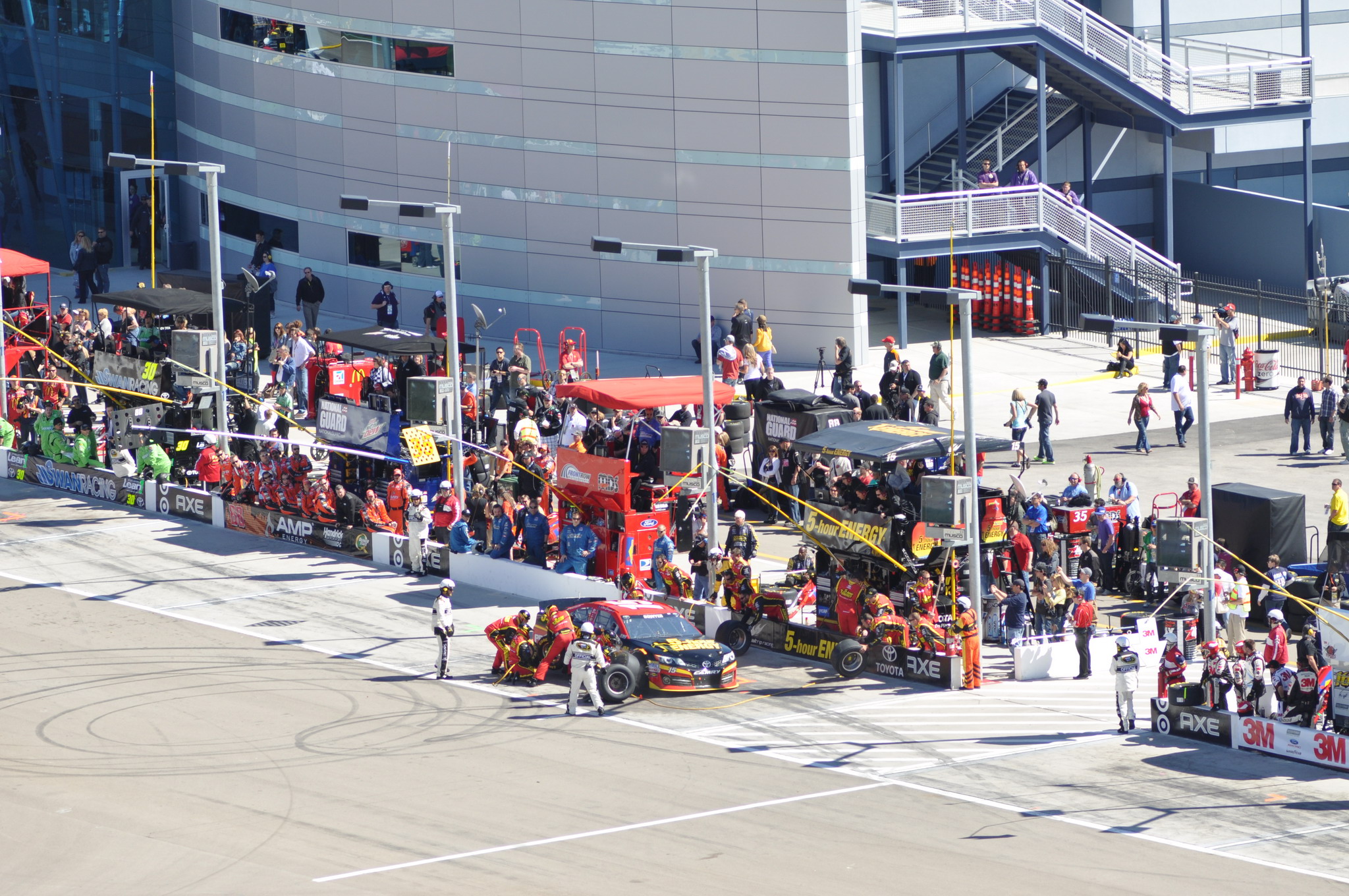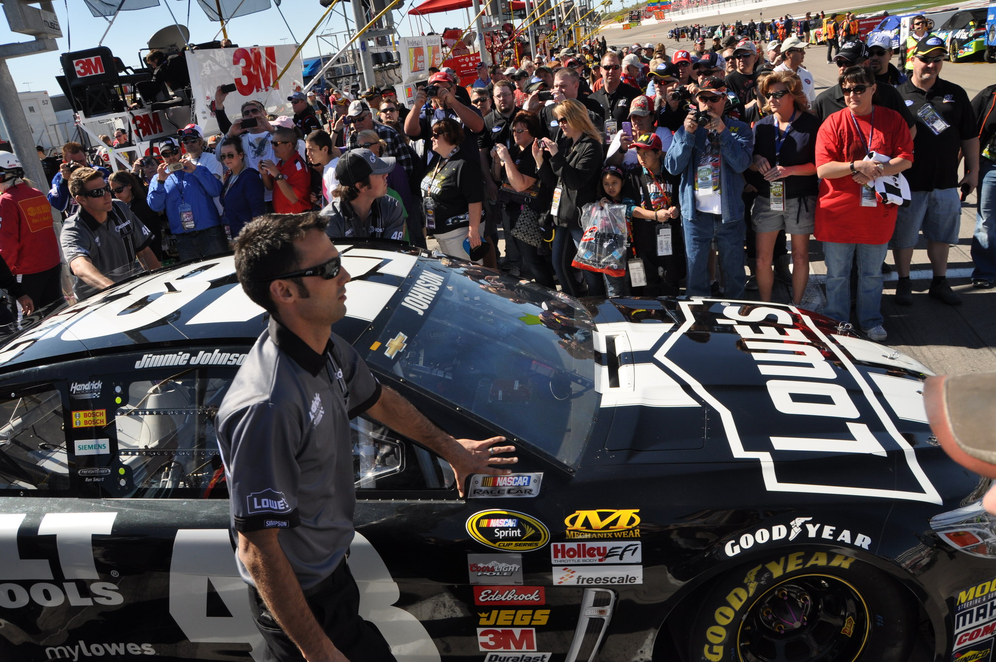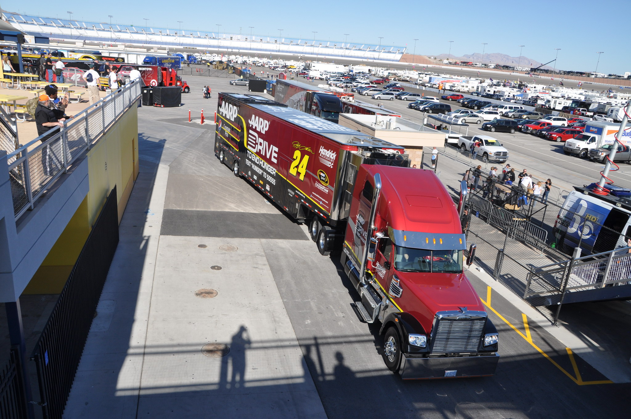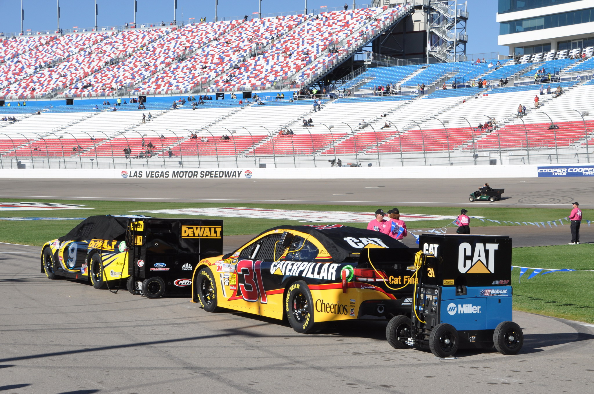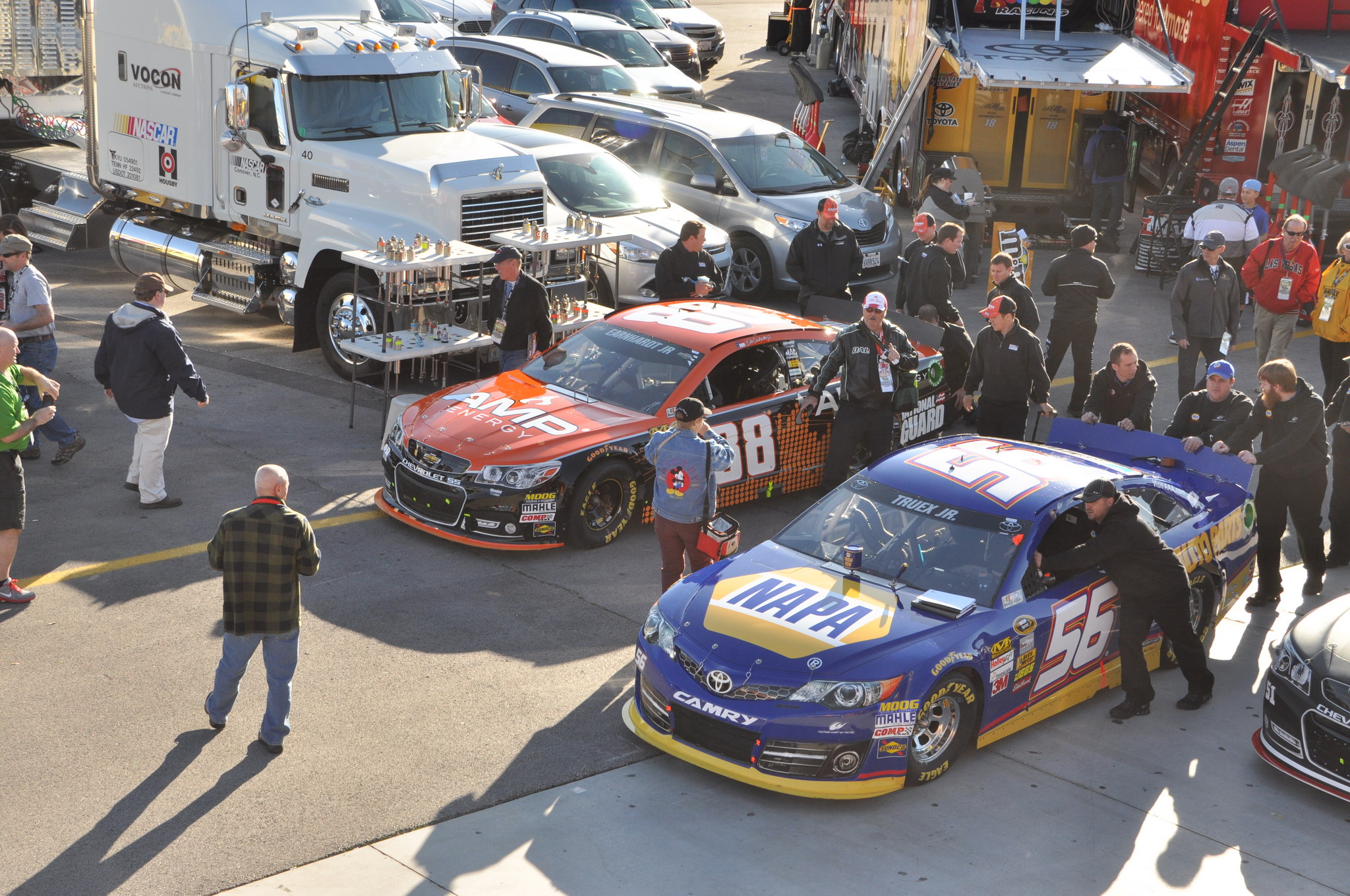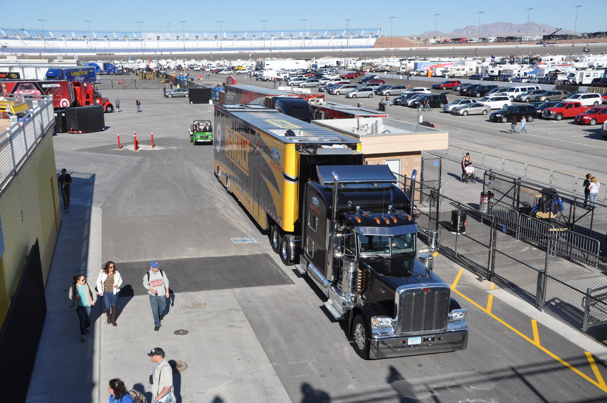 Et comme c'est de tradition le dimanche juste avant la course, et c'est aussi pour ça qu'on m'avait particulièrement conseillé la course de Vegas, toute la ligne des stands est ouverte aux fans. Les équipes, après l'inspection, y mettent les voitures, ce qui permet de toutes les voir de près, quelques animations sont organisées, avec un peu de chance, il est possible de voir les pilotes de près, le vrai spectacle de la Nascar pour les fans.