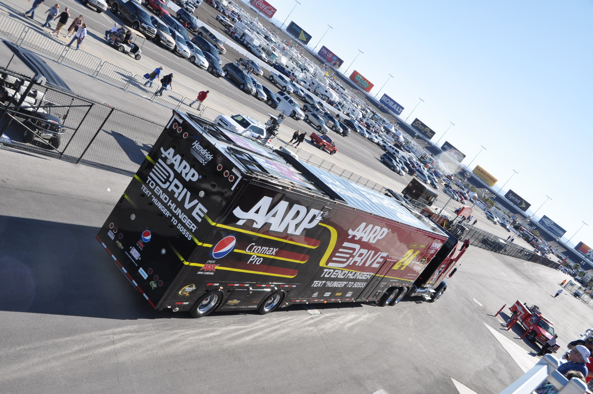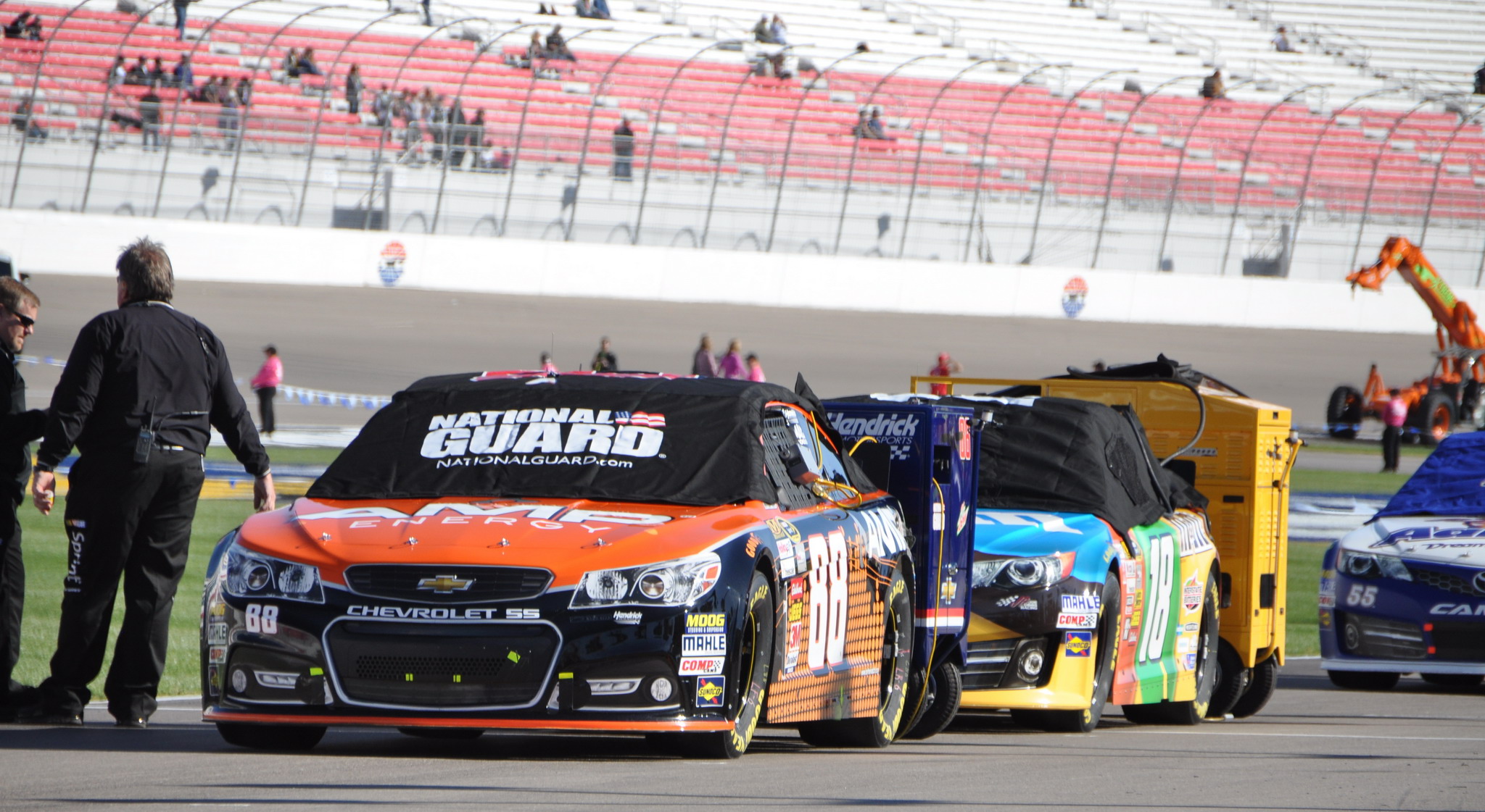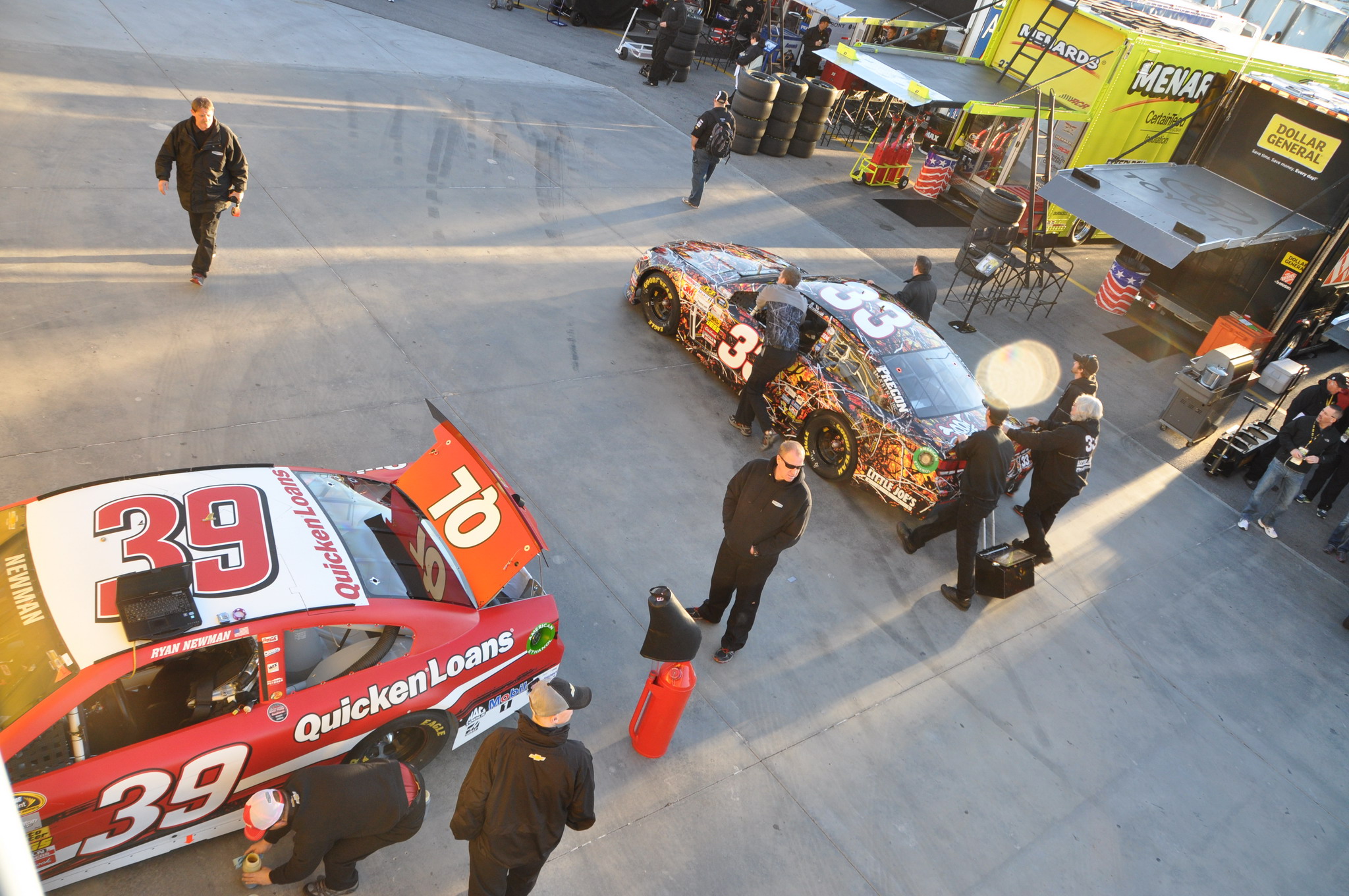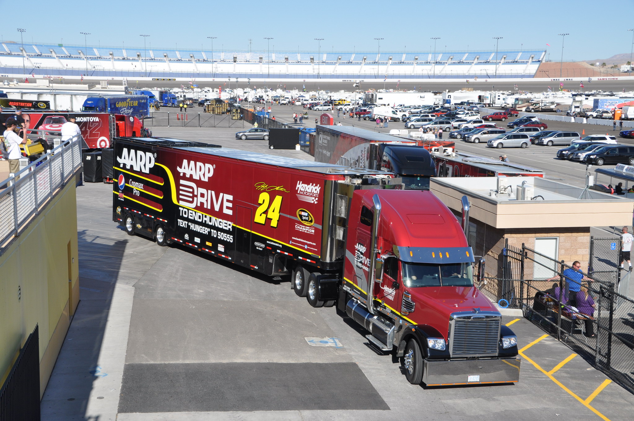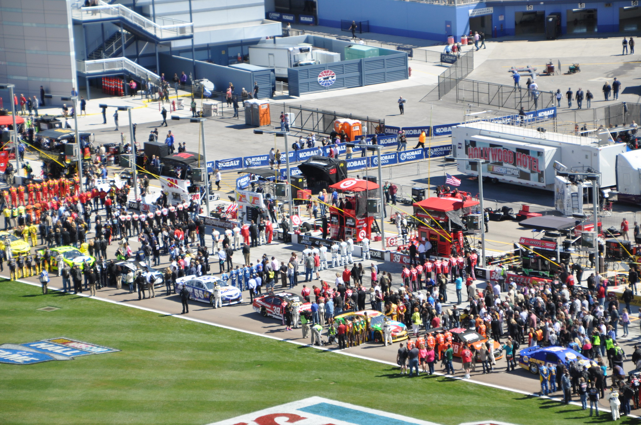 Et comme c'est de tradition le dimanche juste avant la course, et c'est aussi pour ça qu'on m'avait particulièrement conseillé la course de Vegas, toute la ligne des stands est ouverte aux fans. Les équipes, après l'inspection, y mettent les voitures, ce qui permet de toutes les voir de près, quelques animations sont organisées, avec un peu de chance, il est possible de voir les pilotes de près, le vrai spectacle de la Nascar pour les fans.