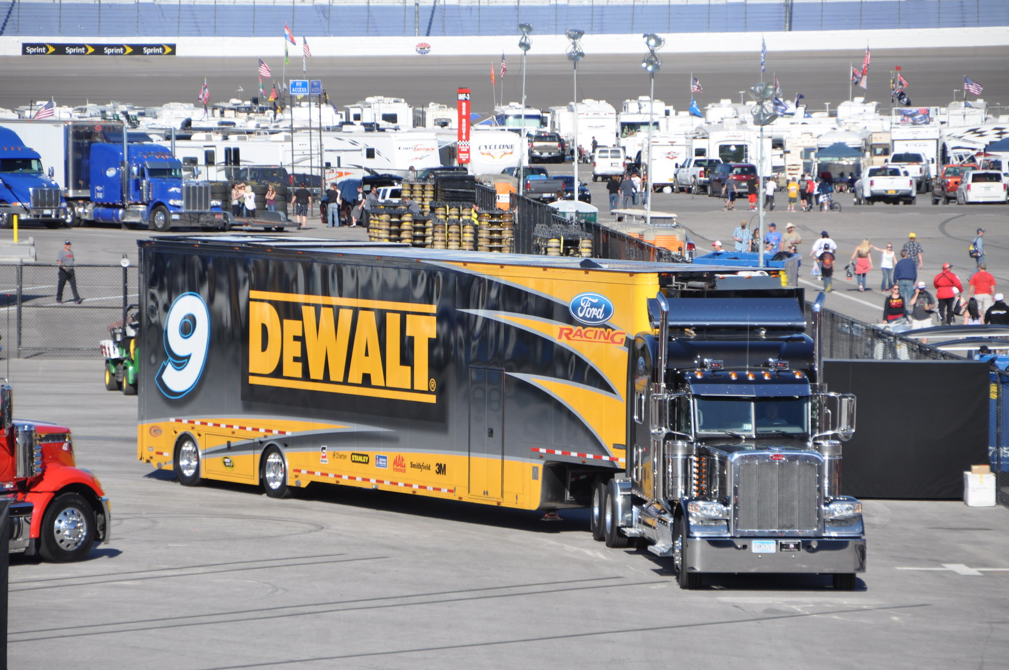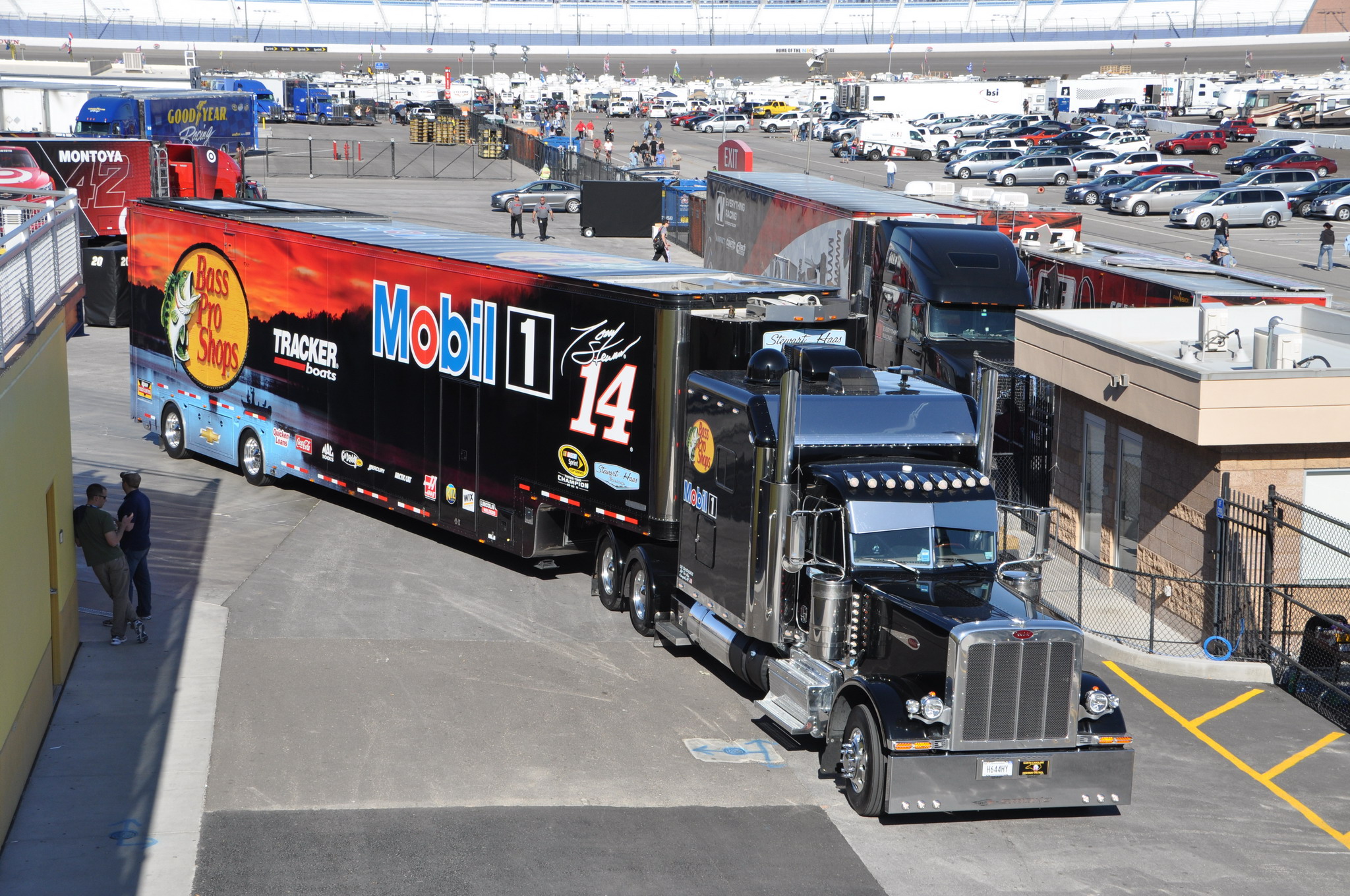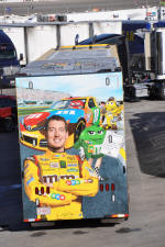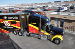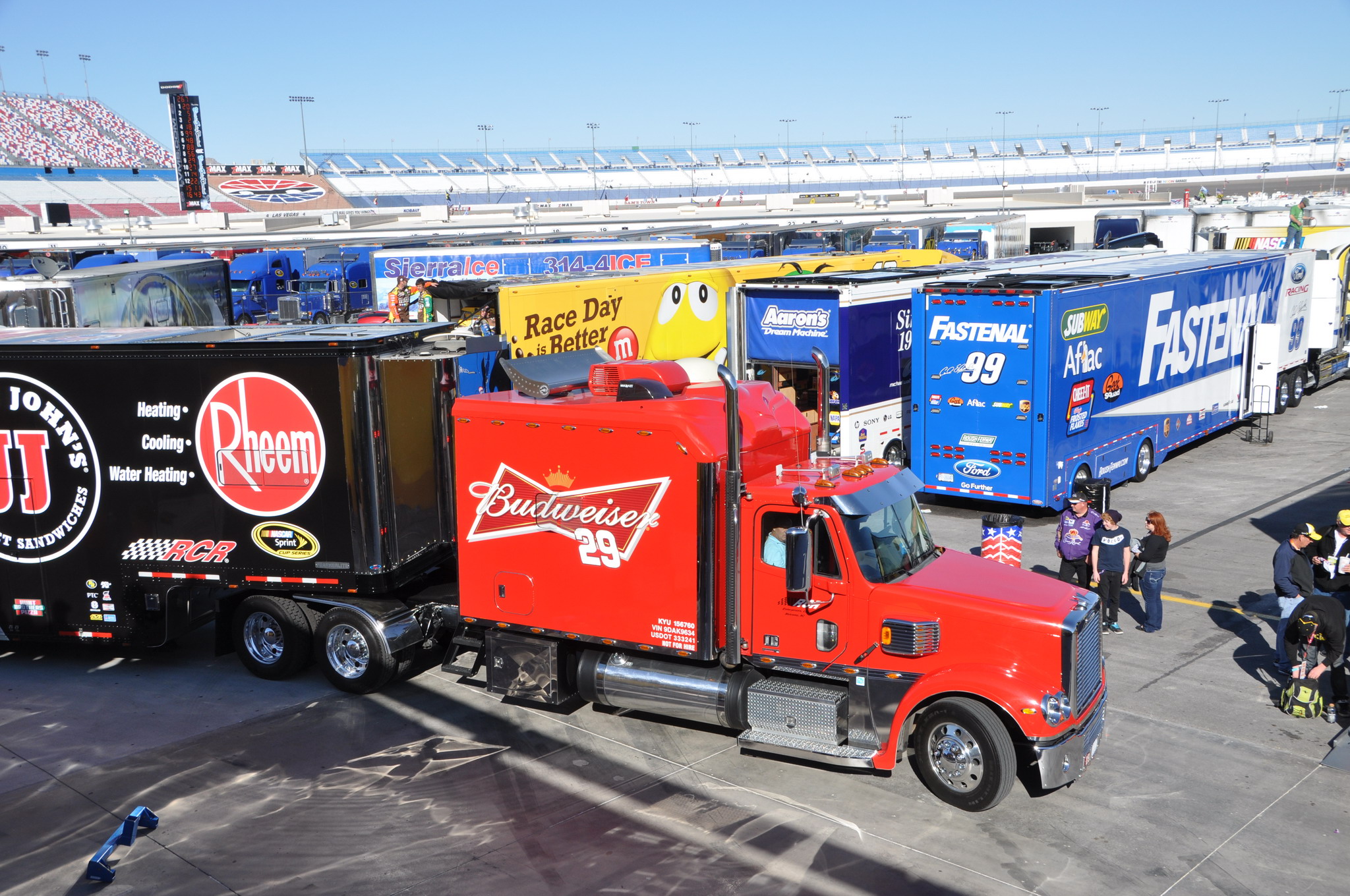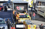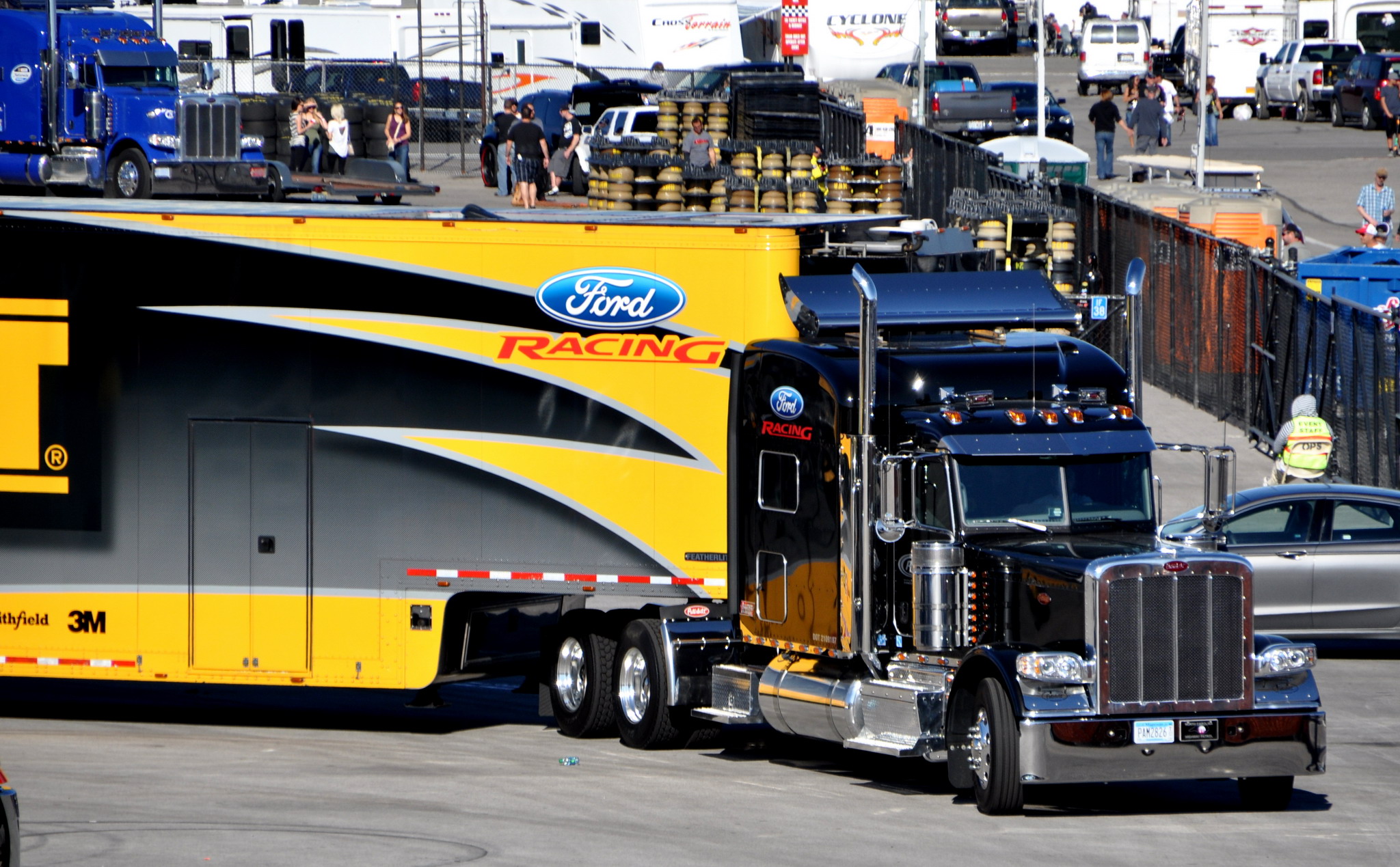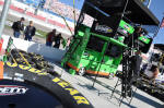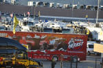 A la fin de la course, je décide dare-dare de retourner dans l'infield pour voir encore le maximum de choses, et j'arrive ainsi à m'approcher tout près par le haut de la voiture #20 de Matt Kenseth, l'interveiiew du vainqueur, et je reste même un bon moment pour regarder les équipes plier tout le matos, et surtout voir défiler tous ces superbes haulers qui partent dévorer le bitume des highways au soleil couchant pour regagner les usines ou se rendre directement sur le speedway de la prochaine course ....