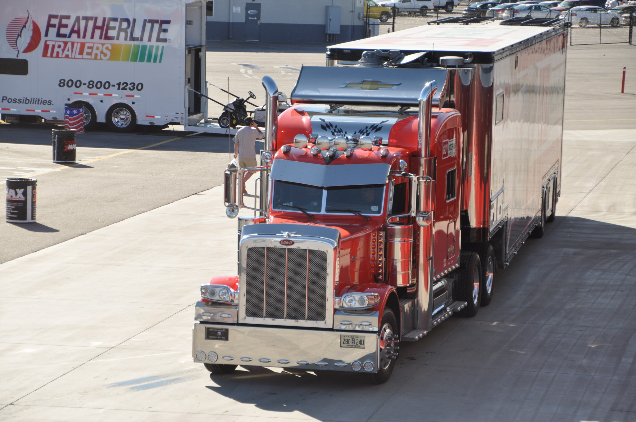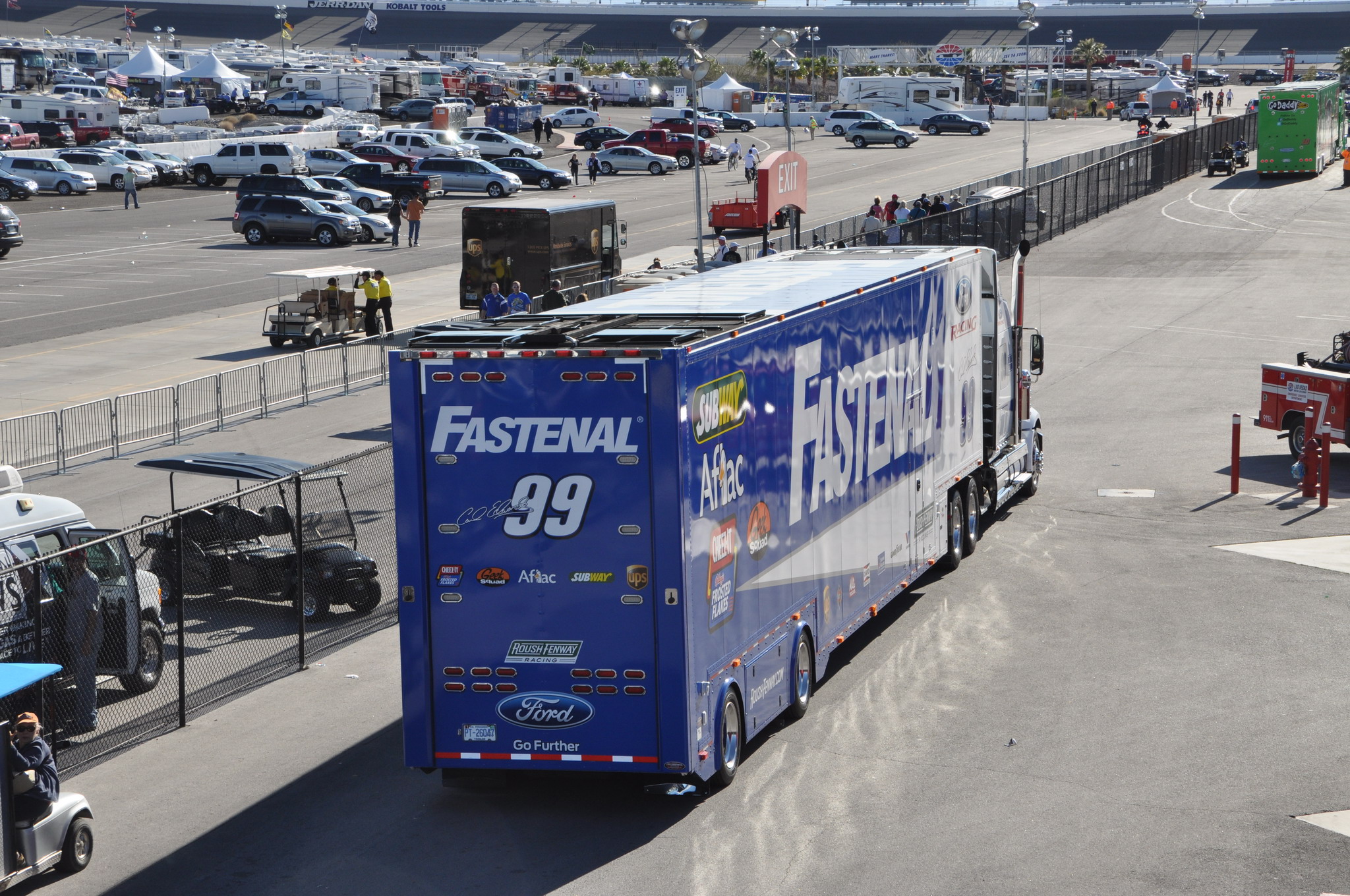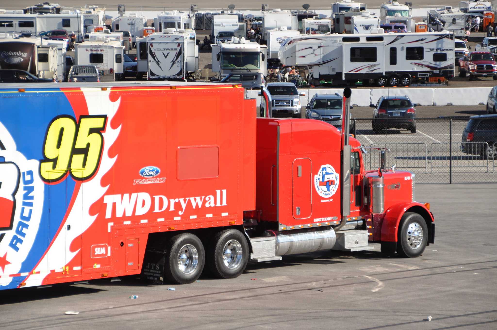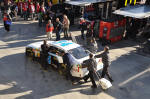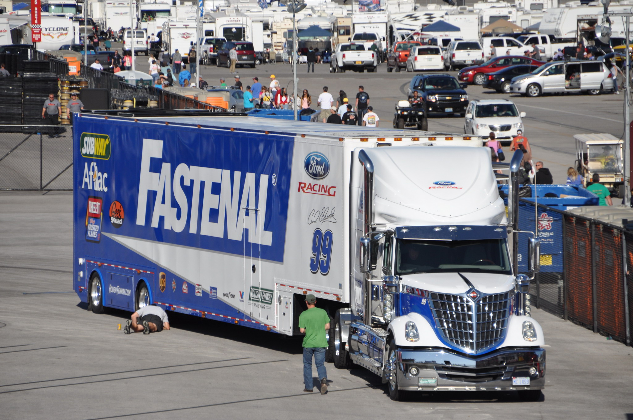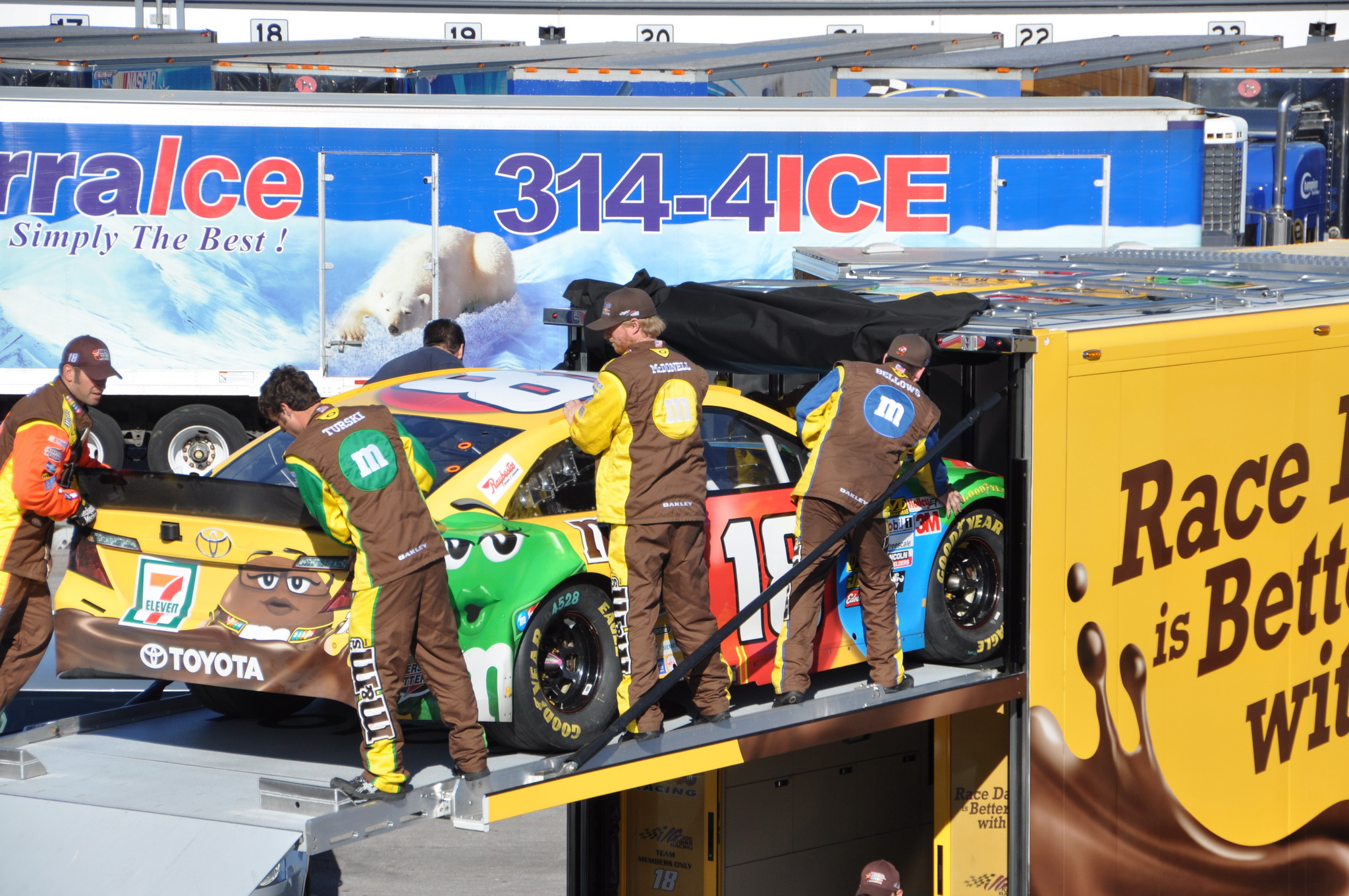 A la fin de la course, je décide dare-dare de retourner dans l'infield pour voir encore le maximum de choses, et j'arrive ainsi à m'approcher tout près par le haut de la voiture #20 de Matt Kenseth, l'interveiiew du vainqueur, et je reste même un bon moment pour regarder les équipes plier tout le matos, et surtout voir défiler tous ces superbes haulers qui partent dévorer le bitume des highways au soleil couchant pour regagner les usines ou se rendre directement sur le speedway de la prochaine course ....
