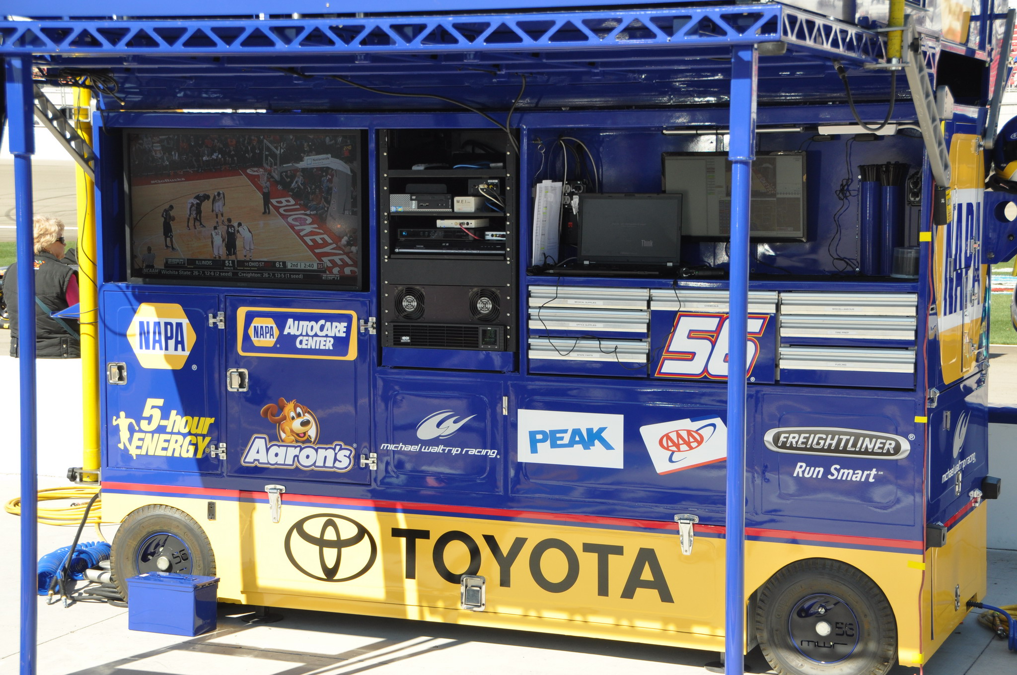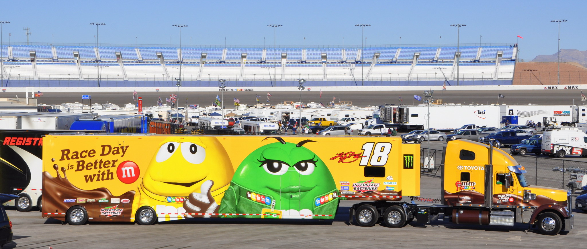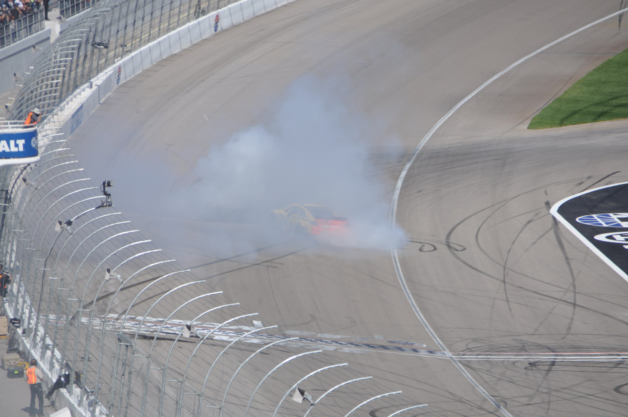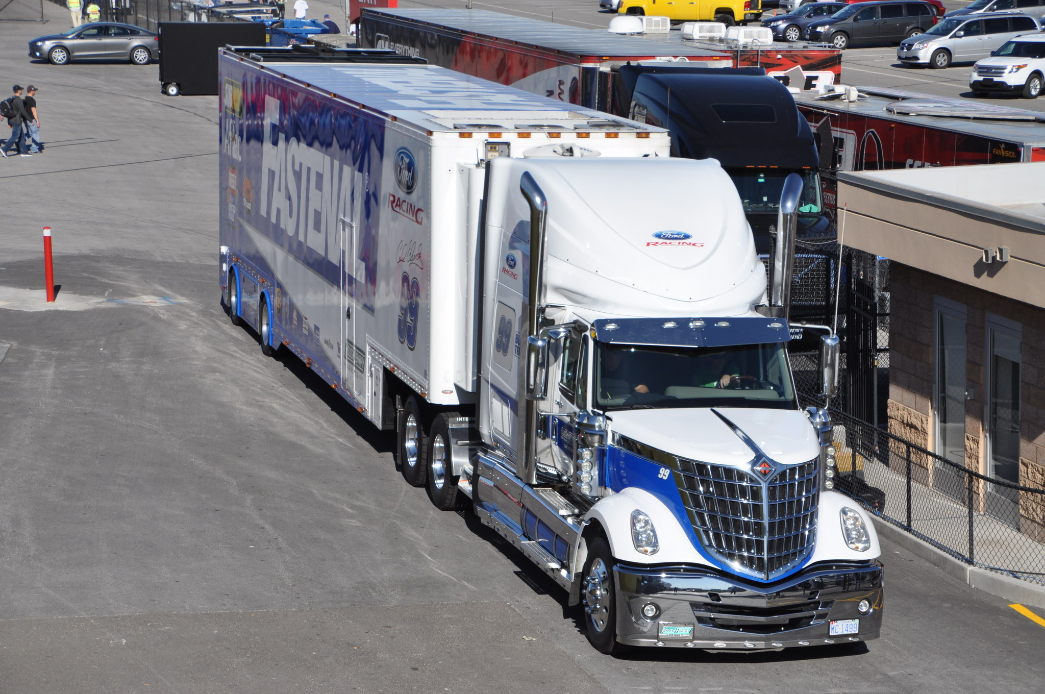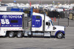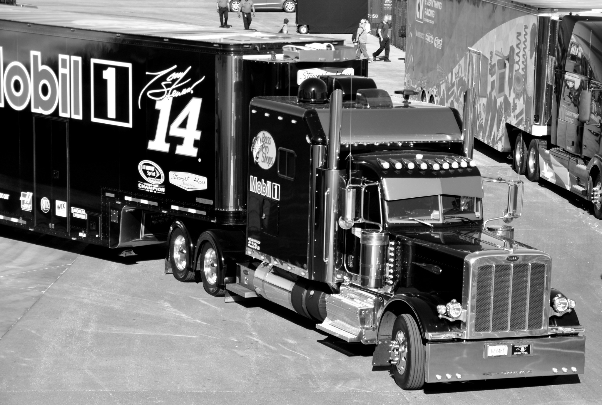 A la fin de la course, je décide dare-dare de retourner dans l'infield pour voir encore le maximum de choses, et j'arrive ainsi à m'approcher tout près par le haut de la voiture #20 de Matt Kenseth, l'interveiiew du vainqueur, et je reste même un bon moment pour regarder les équipes plier tout le matos, et surtout voir défiler tous ces superbes haulers qui partent dévorer le bitume des highways au soleil couchant pour regagner les usines ou se rendre directement sur le speedway de la prochaine course ....
