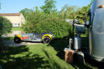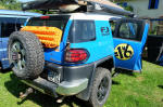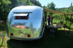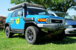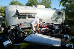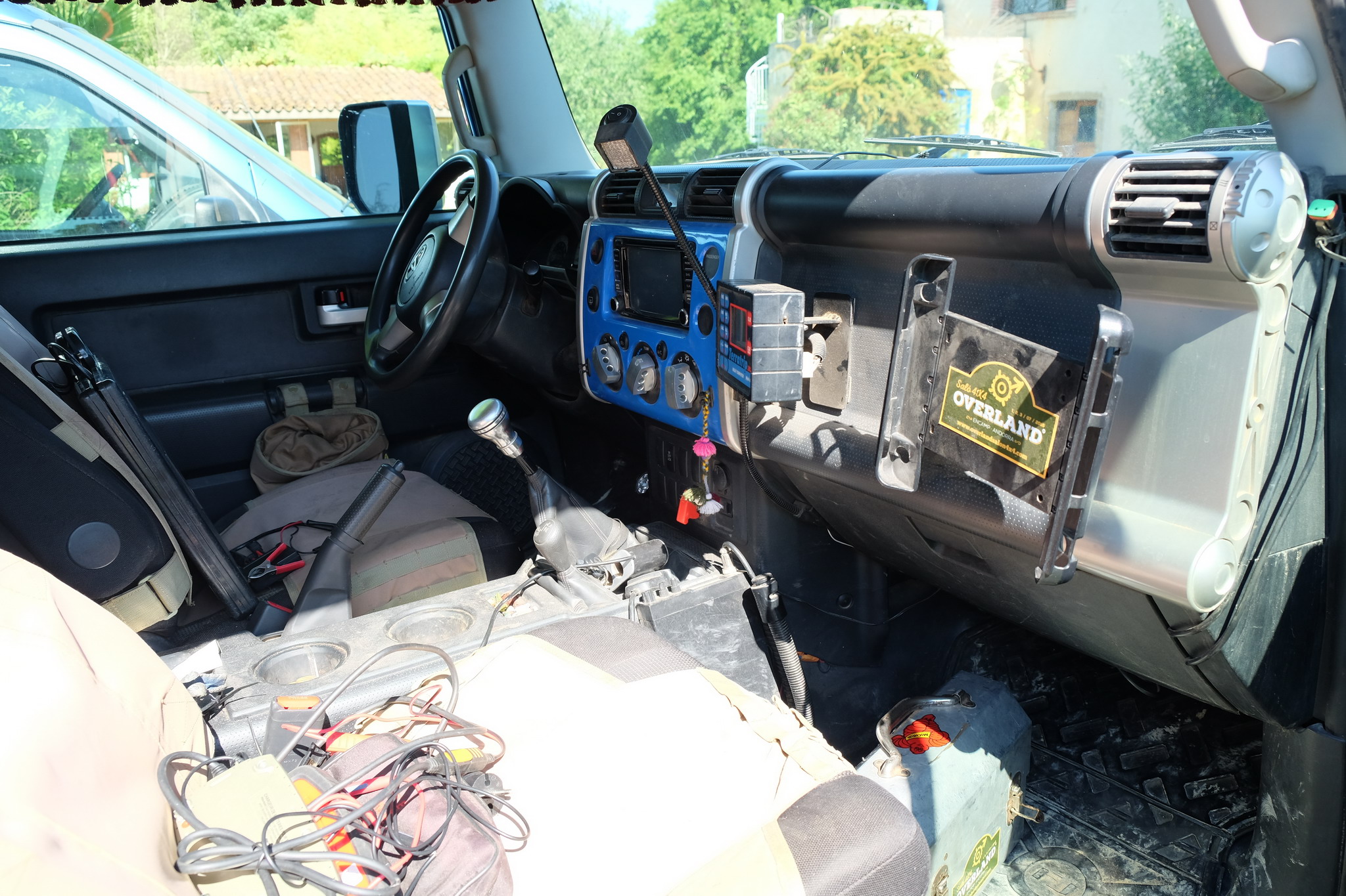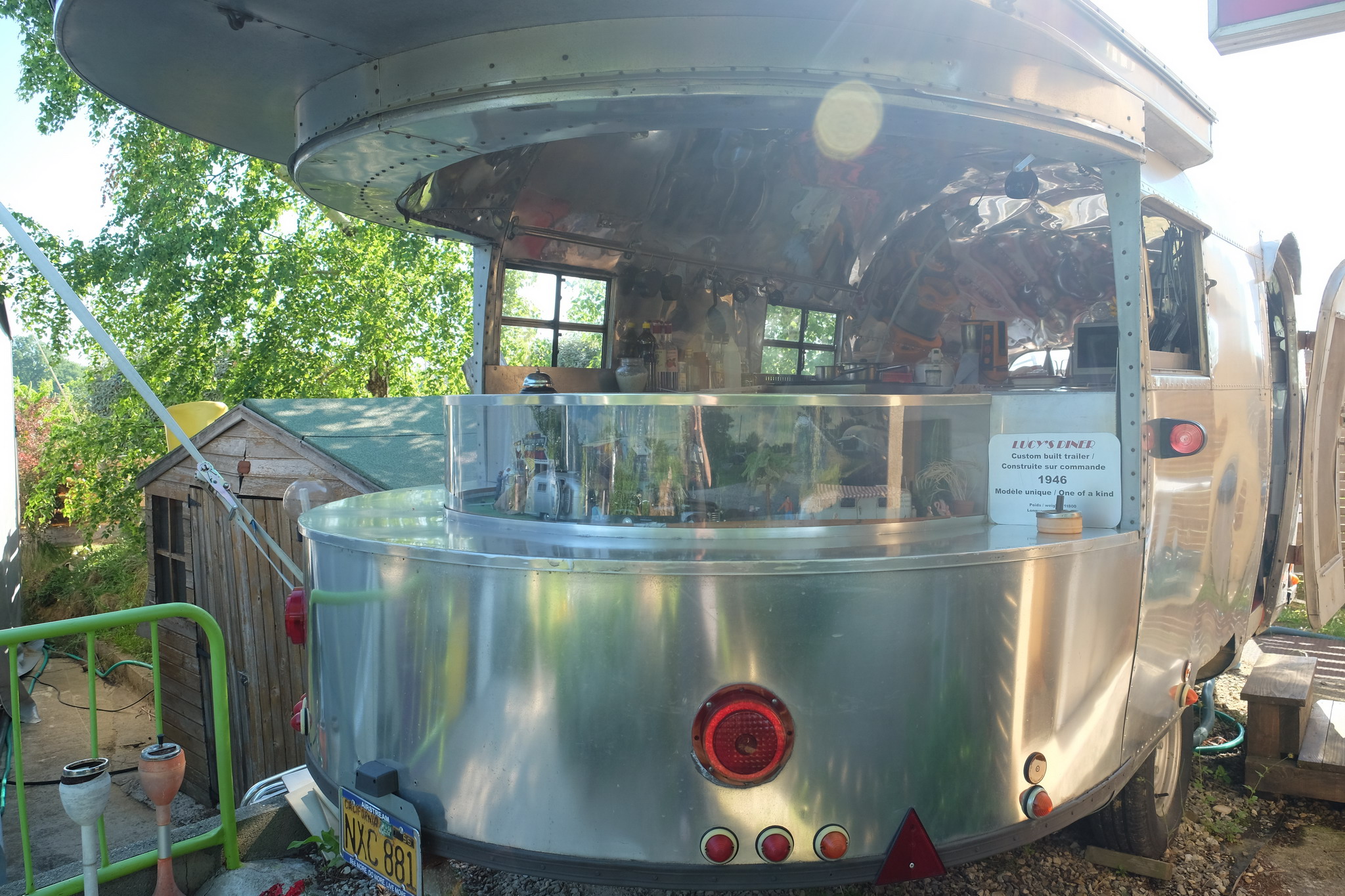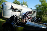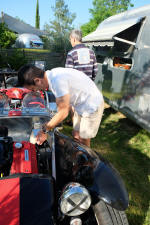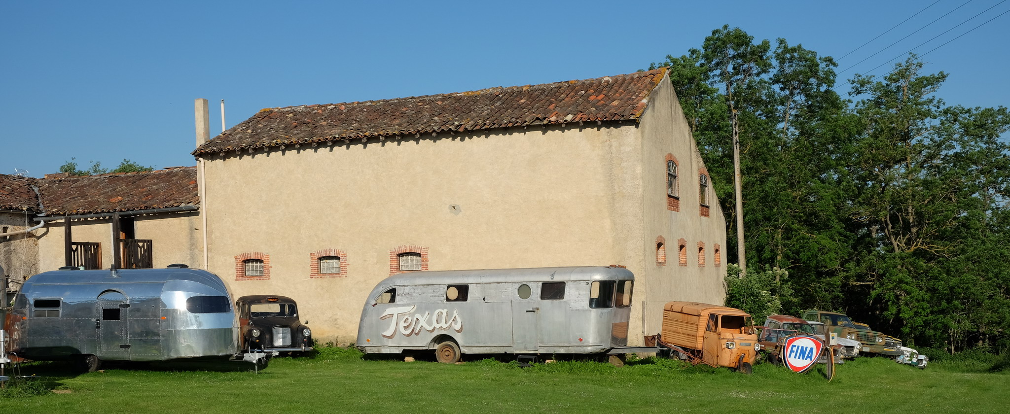 Et Perry nous fait découvrir entre autres sa plus fabuleuse des Aistream, une Spartan Aircraft Manor de 1947, une merveille, qui nous fait plonger dans le cinéma américain des années 50 qui est le thème de la déco, associé à cette Spartan dont les détails de fabrication sont inspirés de la technologie aéronautique, le temps s'arrête pour notre esprit en état de fascination .... puis nous remontons tranquillement vers l'Airstream d'accueil quand j'aperçois un peu derrière un 4x4 qui m'interpelle car c'est un Toyota FJ Cruiser, pas très courant car non commercialisé en France, et c'est bien celui de Perry qui actuellement est souvent baroudeur en Afrique ! Il nous fait donc découvrir avec plaisir son FJ entièrement équipé pour affronter les dures conditions sablonnesques africaines, décidément les histoires de tonton Perry sont toutes enivrantes ;-)) Mais il faut pourtant songer à partir car on a un peu de boulot à abattre pour cette belle journée ! Et on s'attarde encore un peu dans l'Airstream "bureau" de Coline quand on vient la régler car celle-ci regorge aussi d'accessoires fascinants ! On enfile enfin les casques, se poste en ligne pour la photo souvenir et on part tranquillement, "poursuivis" par les deux superbes américaines qui ont aussi dormi au camping ...