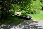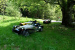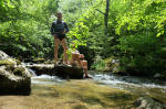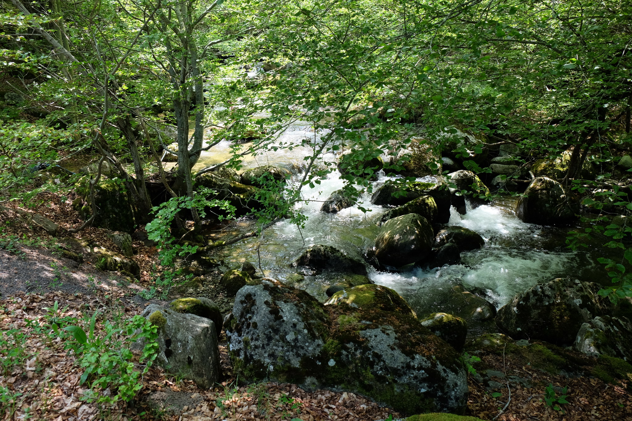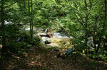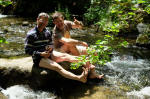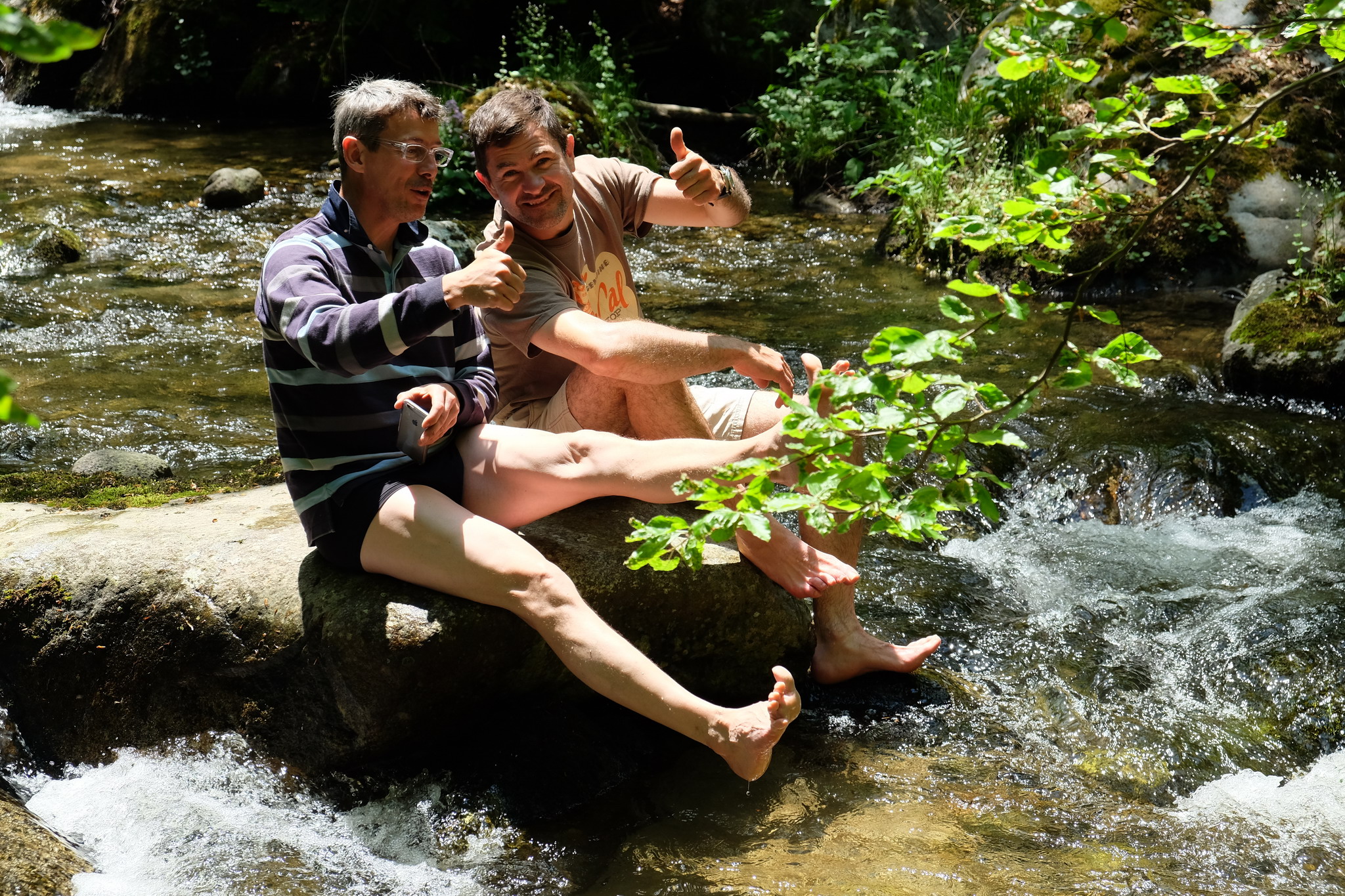 Il est déjà près de 13h00, nous roulons à travers de superbes bois en direction du col de Jau, et comme nous longeons souvent des ruisseaux nous décidons de manger au bord de l'eau, et dans une épingle à cheveu le long de l'Aiguette, le lieu idéal s'offre à nous, de l'herbe pour que les petites Cat puissent paître en se reposant, et pour nous les pieds dans l'eau, encore un petit paradis ....