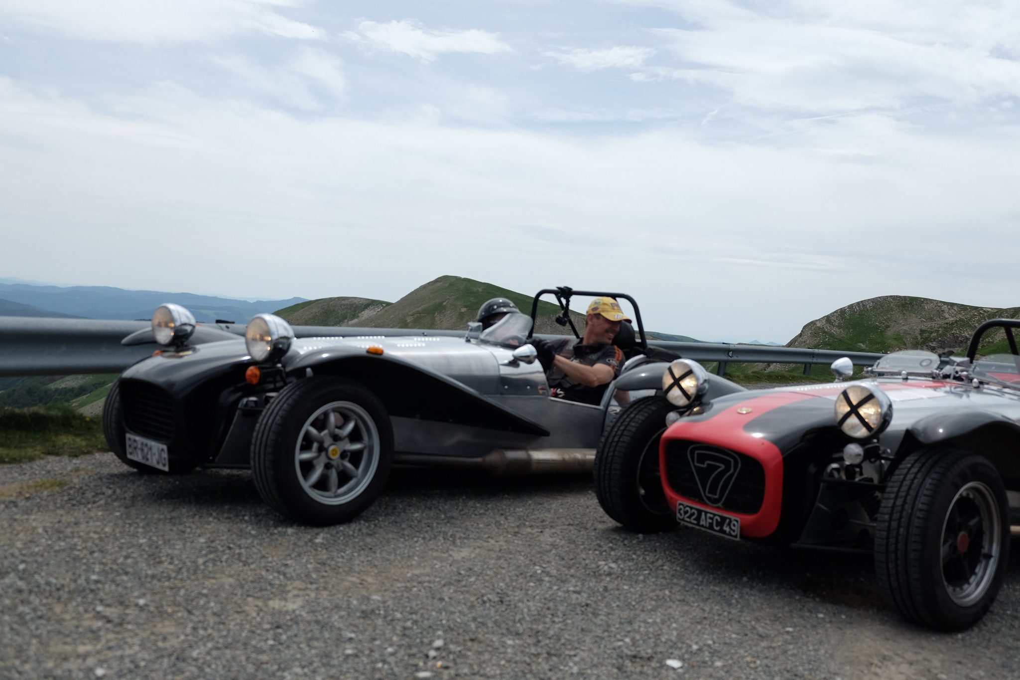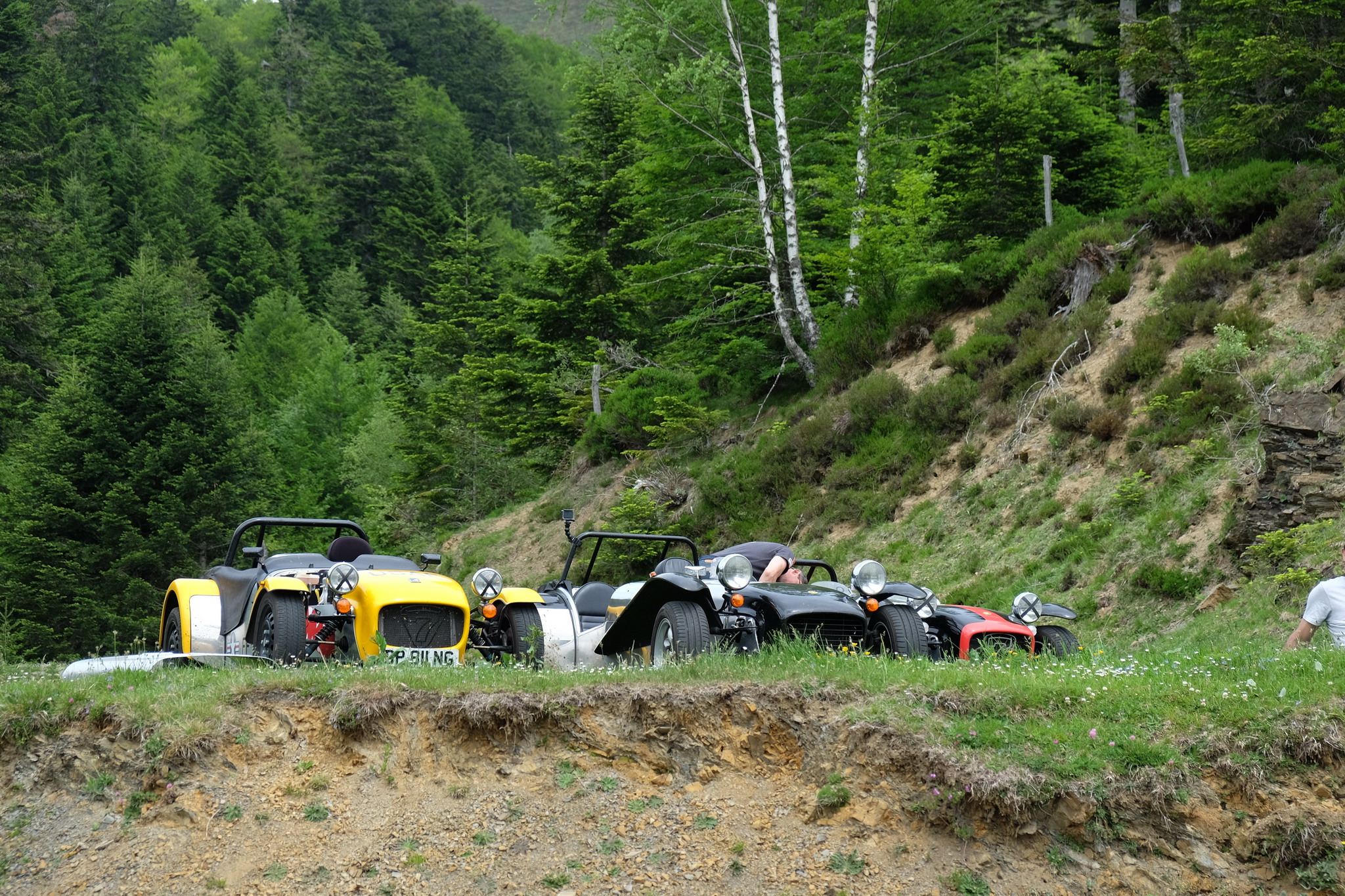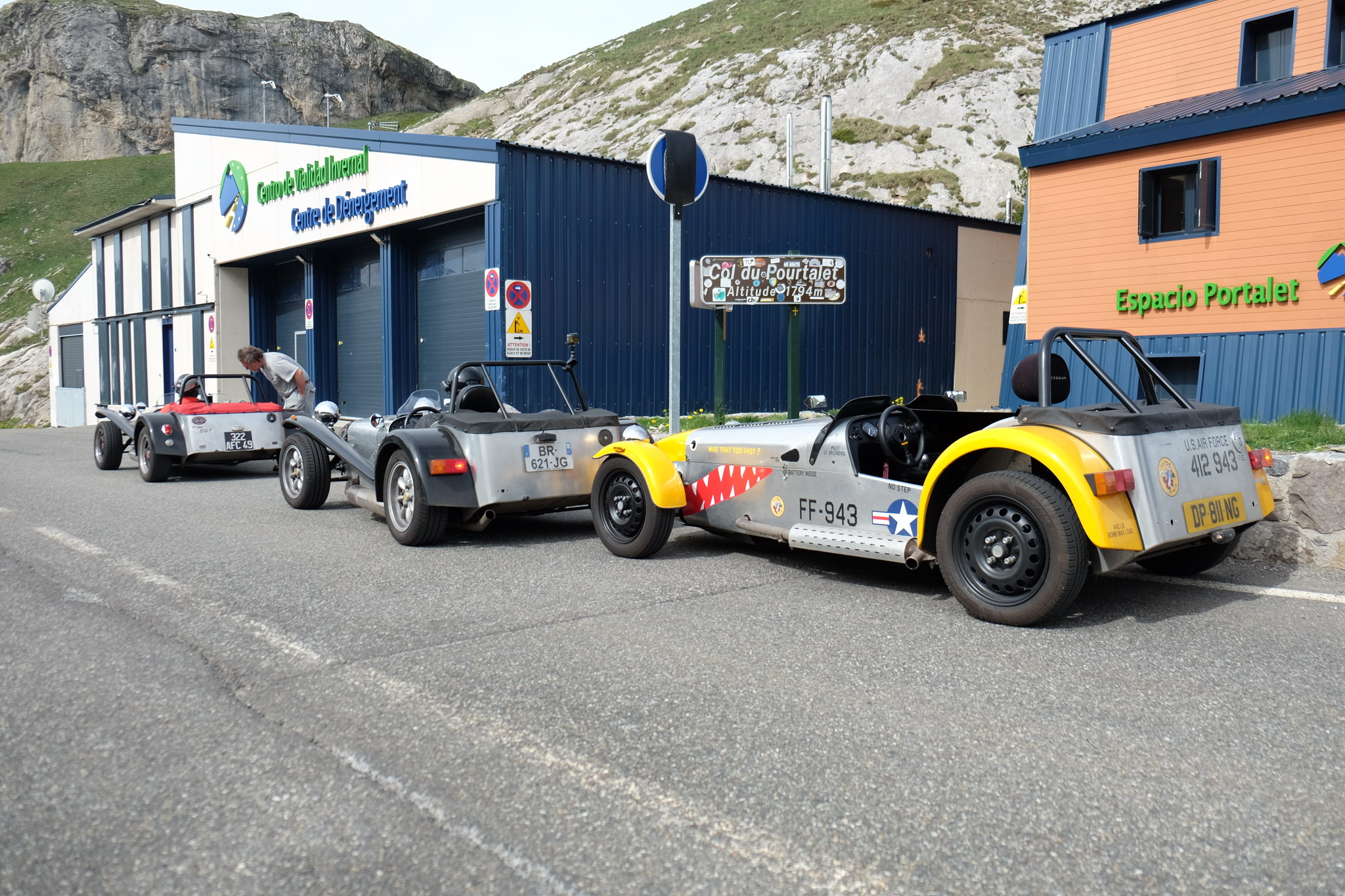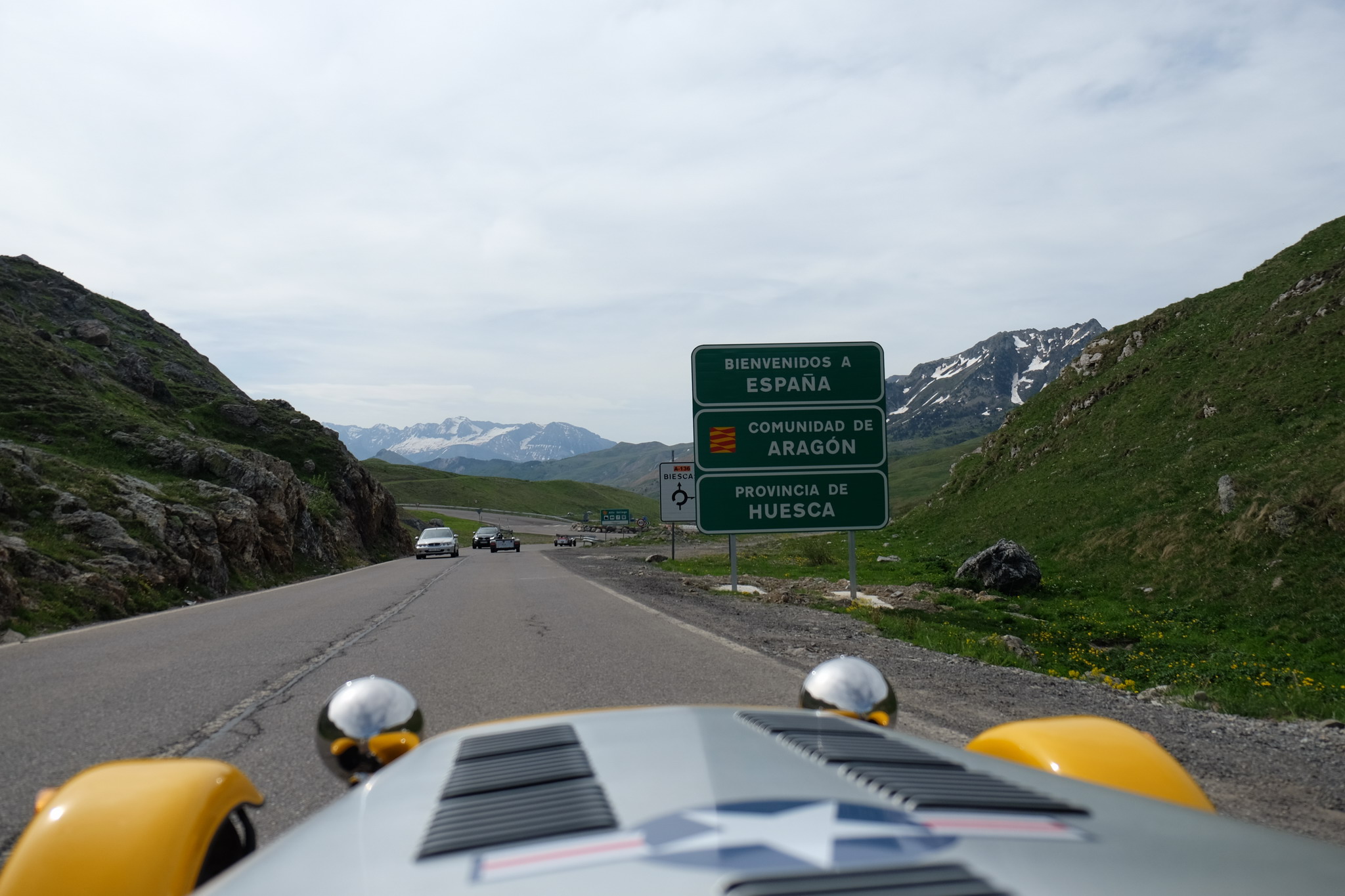 Un chaleureux aurevoir à Alexandra et on prend la route, et on parcourt bien, au moins, laissez moi réfléchir .... cent mètres avant la première pause !! Ben ouais, on a dormi en haut du col, et moi je veux la photo du panneau avec les Cat devant ! Et on est juste à l'ancien poste frontière car l'Espagne commence ici, on aligne les 3 Cat pour prendre la photo, je suis le seul à descendre, un passant s'approche de la Cat de Villo qui est en pole position, et via les Intercom nous commençons à assister à une discussion que je qualifierais de hautement intellectuelle et technique, avec Sly on souffle les réponses au Villo pour qu'il reste au niveau de son nouvel ami, xptdr comme dirait l'autre !