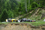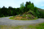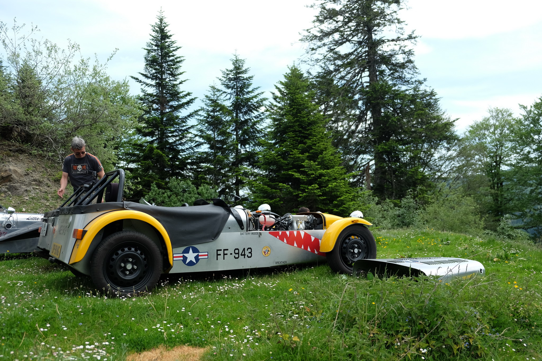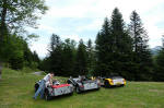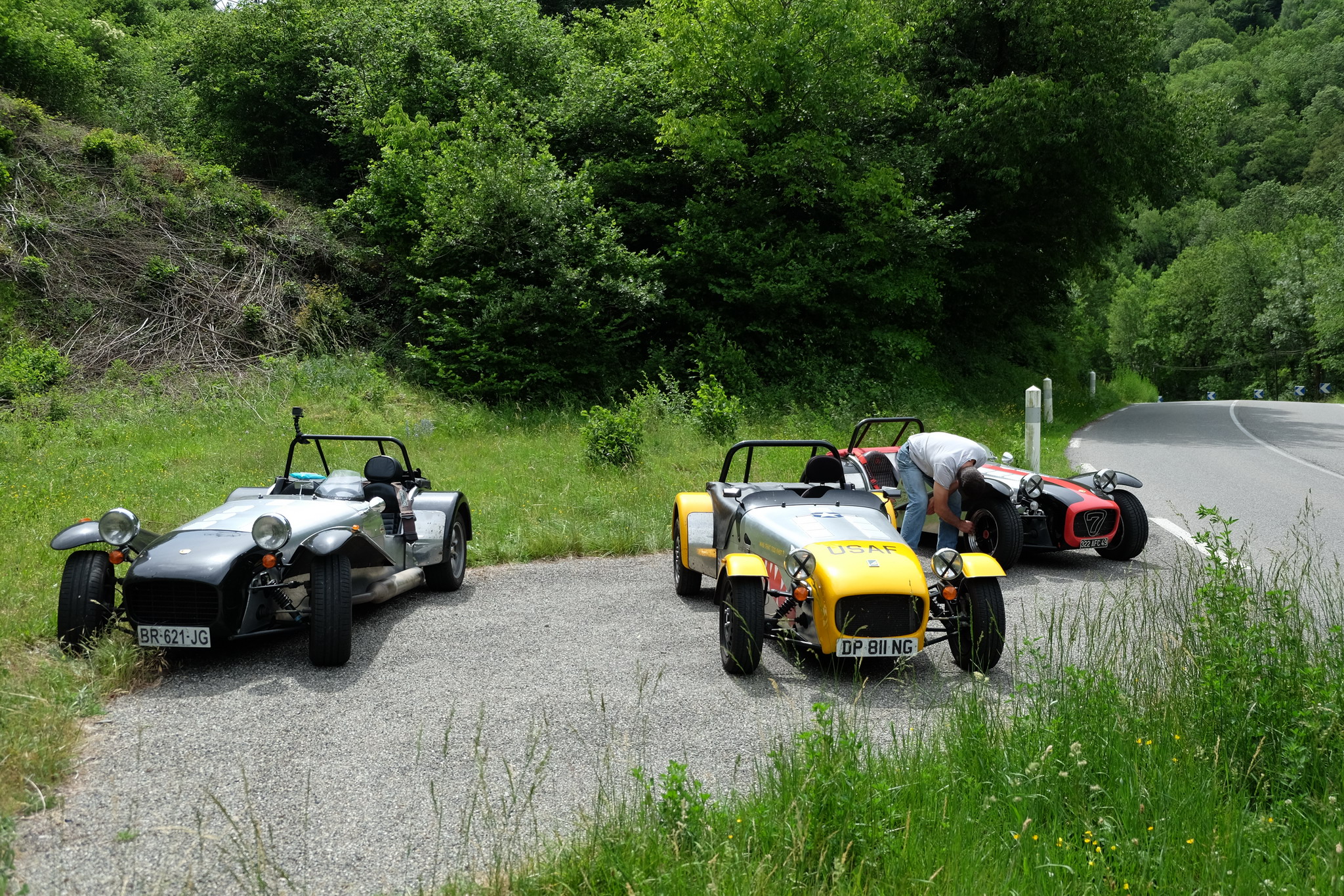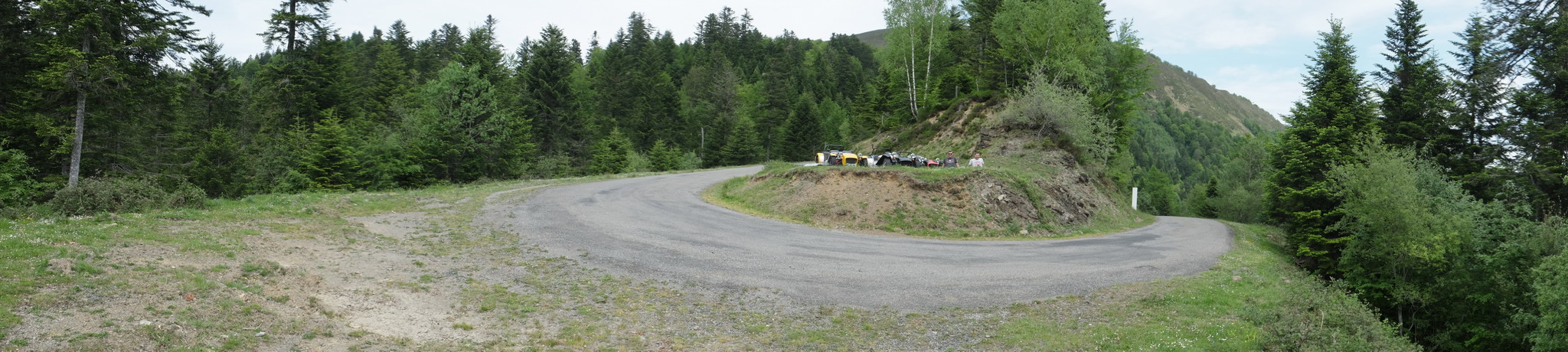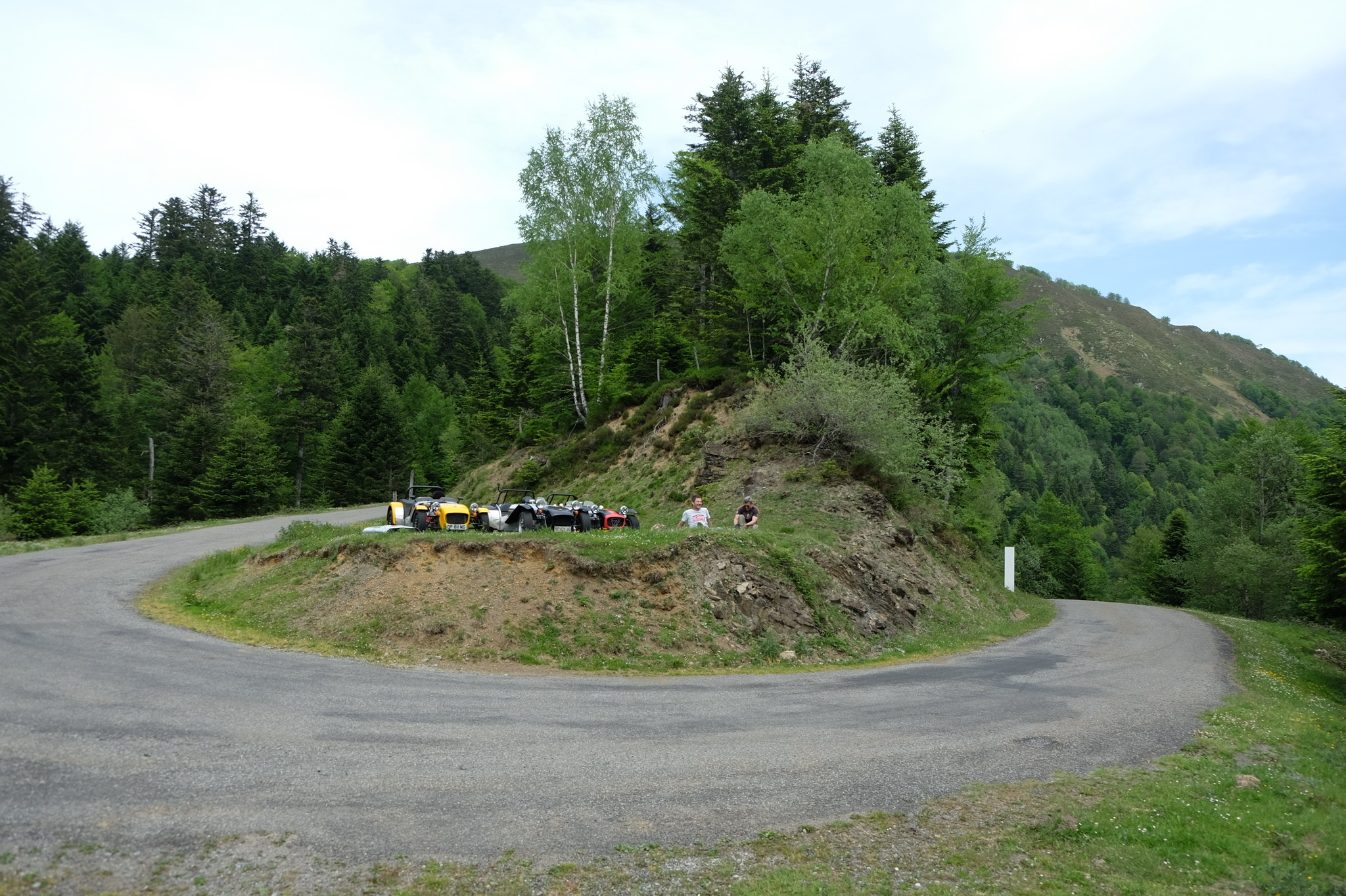 Nous atteignons le col de Labeys à 1354 mètres, il est près de midi et on décide de monter les Cat juste au-dessus, mais on se rend compte qu'une route un peu plus grosse passe à coté avec une voiture en moyenne toutes les cinq minutes qui passe .... ça va pas le faire, on va être trop dérangé, hop on bouge ! Comme on avait vu des potentiels très beaux coins juste avant, nous reprenons la route en sens inverse, et dans une épingle, nous trouvons le lieu idéal, les trois Cat sur le terre-plein à l'intérieur de l'épingle, nous entreprenons de l'escalade de haute-montagne pour nous élever et embrasser le panorama et les Cat en-dessous, ce picnic devrait donc vraiment bien se passer ....