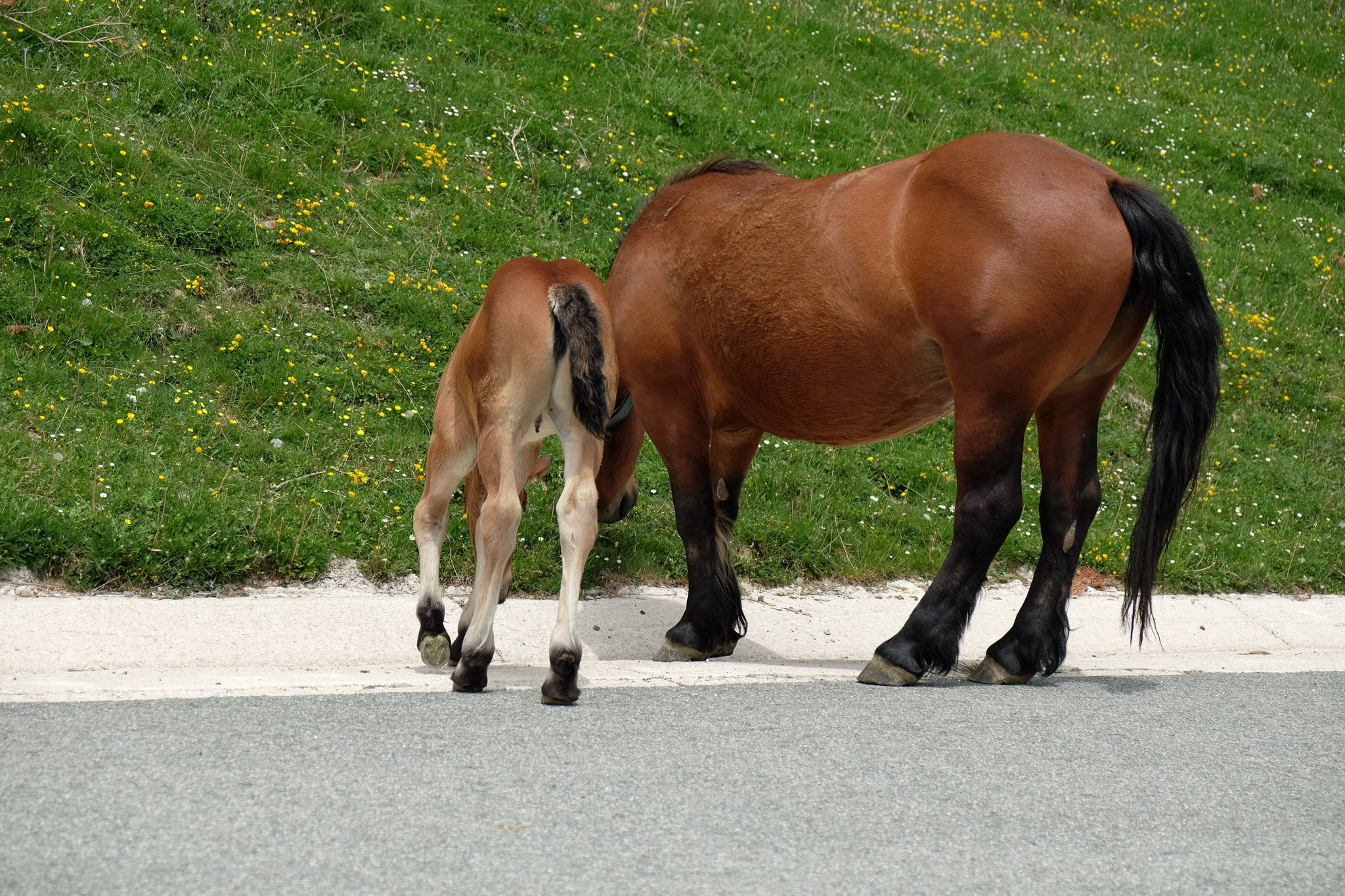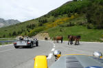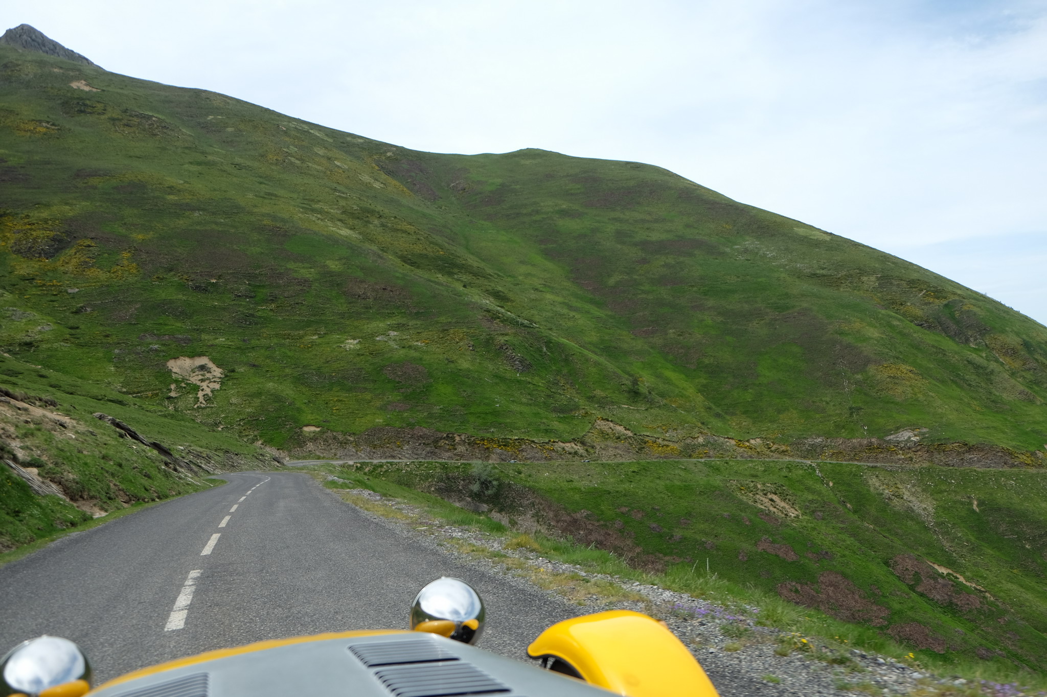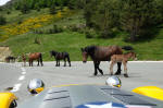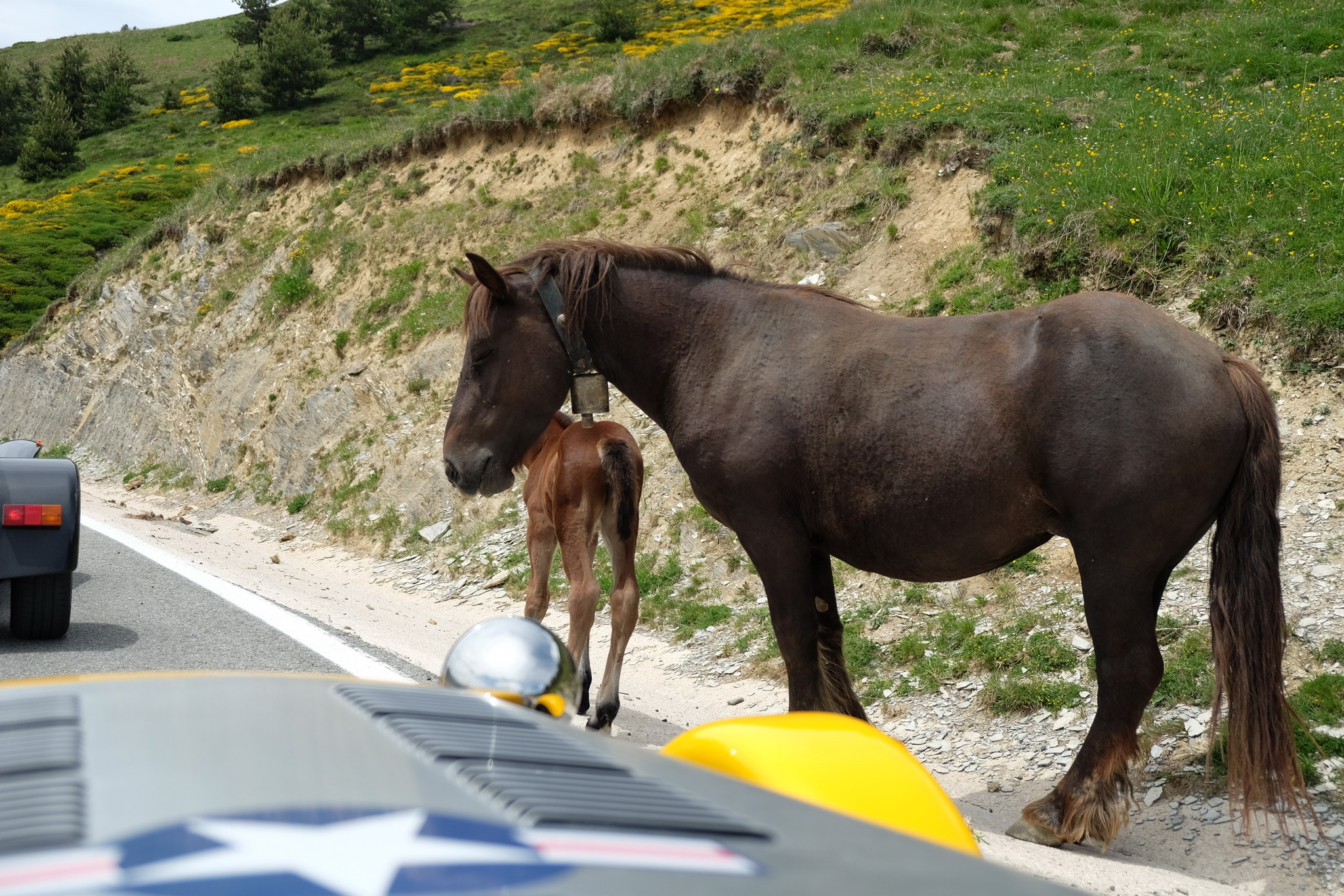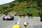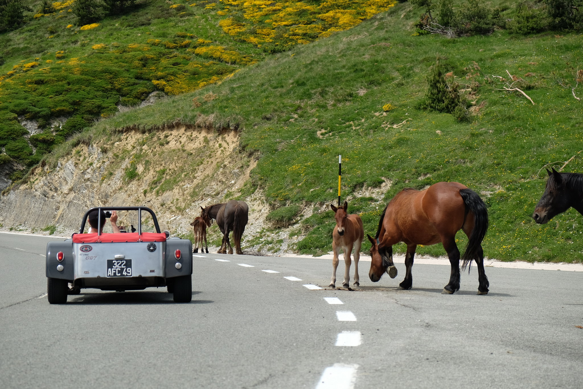 Après ce moment d'intense communion avec la nature, nous reprenons notre grimpette en se dirigeant à nouveau vers l'Espagne, et à nouveau un superbe col, celui de la Pierre Saint Martin. Les routes espagnoles sont plutôt belles et larges et donc avenantes, j'ose alors m'autoriser à expérimenter le jeu préféré des mes deux acolytes, à savoir la descente en mode "caisse à savon" que eux prennent un malin plaisir à faire dès la moindre occasion (je n'oserai jamais assez répété que ce sont deux gros inconscients, c'est bien simple, si on demandait quels seraient les gens sérieux dans ce groupe, seul mon nom pourrait être annoncé....) . Bref, je les laisse donc passer devant, et je le fais, je coupe le contact .... grisant, même si mon piti trois cylindres est plutôt discret, descendre sans bruit de moteur, juste l'air dans les oreilles et le bruit de roulement des pneus, les sensations sont encore décuplées, on a l'impression d'aller encore plus vite ! Et il faut être plus technique pour passer les virages en essayent de freiner le moins possible et perdre le moins de vitesse possible, un bon apprentissage pour améliorer ses trajectoires. Belles rencontres ensuite avec des chevaux sauvages, enfin pas si sauvage car ils viendront même renifler l'arrière-train de ces drôles de pitites voitures qui les intriguent !