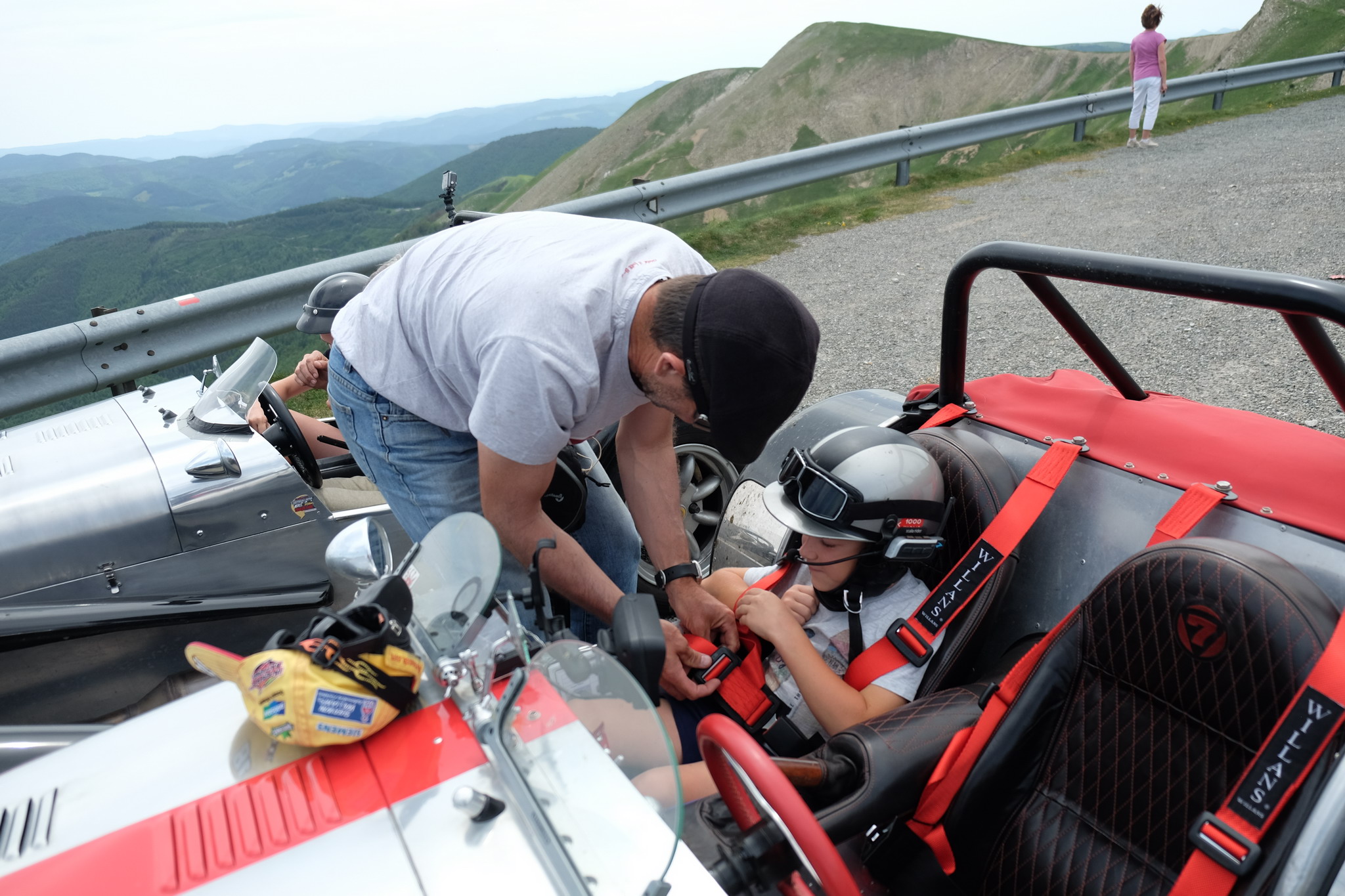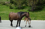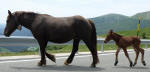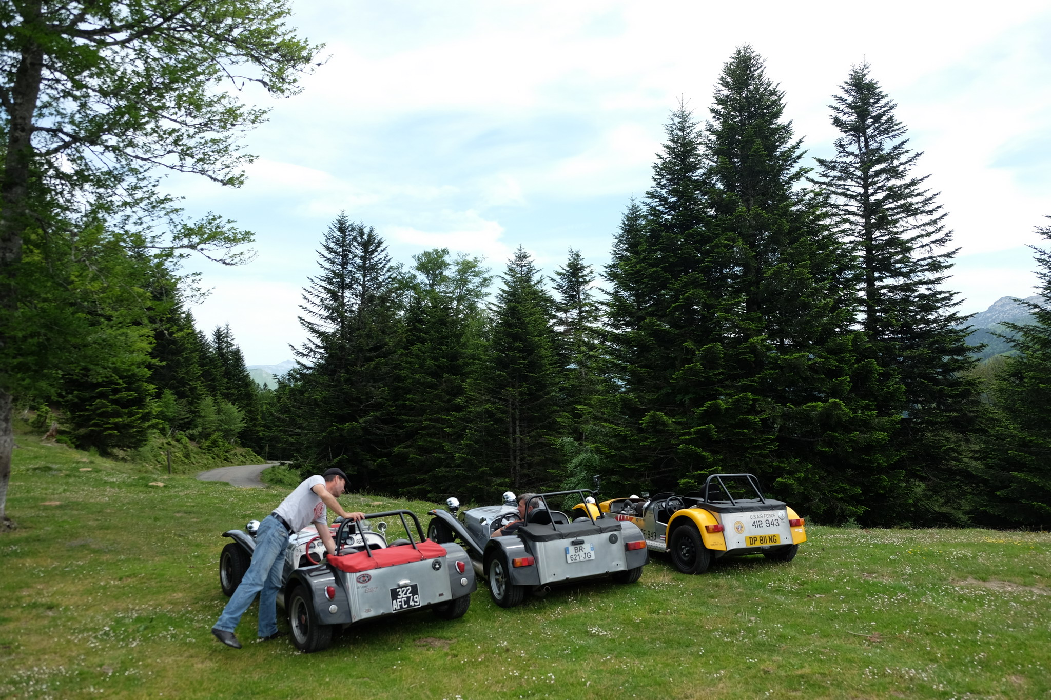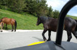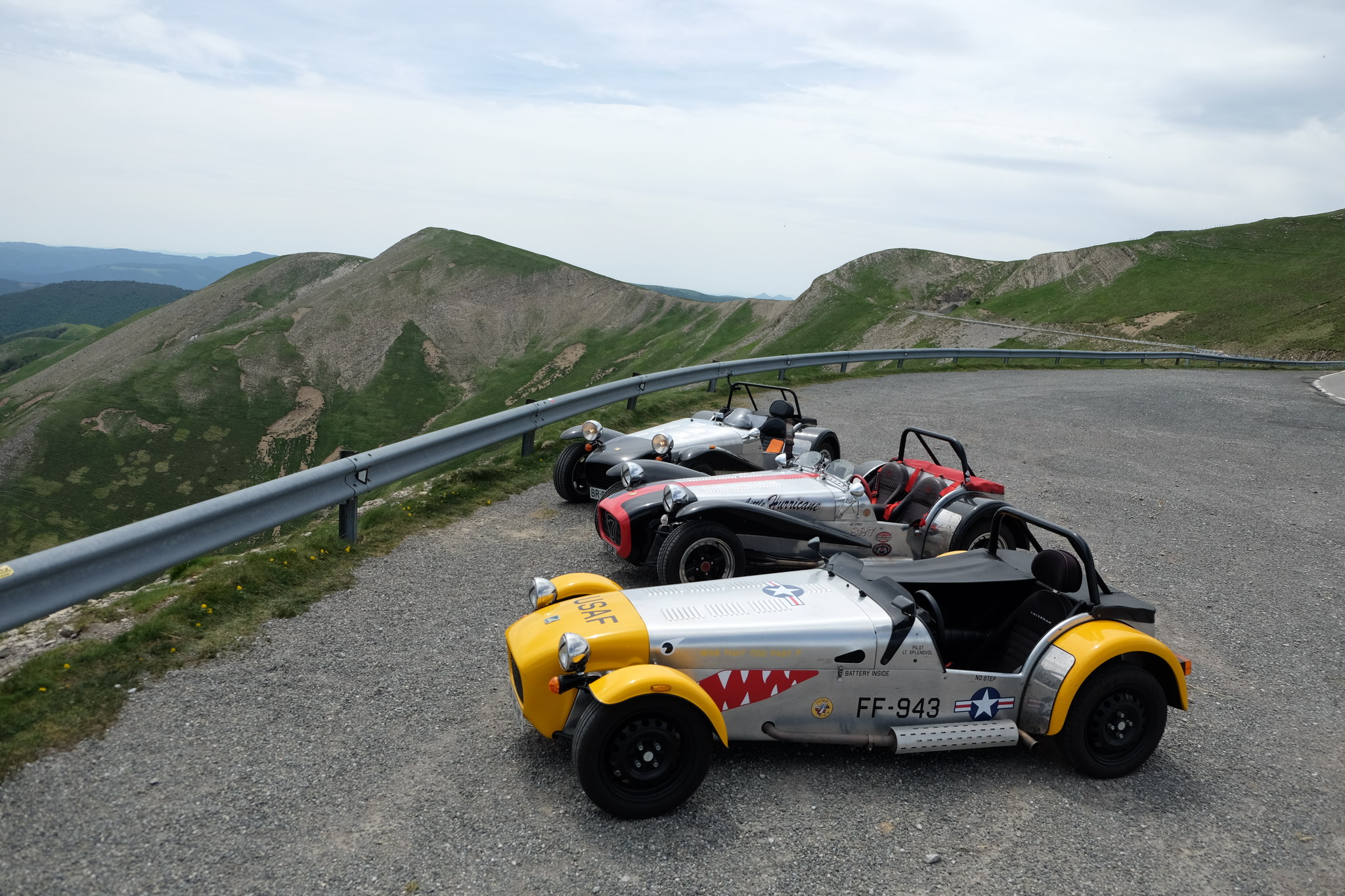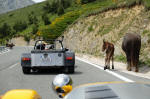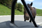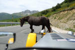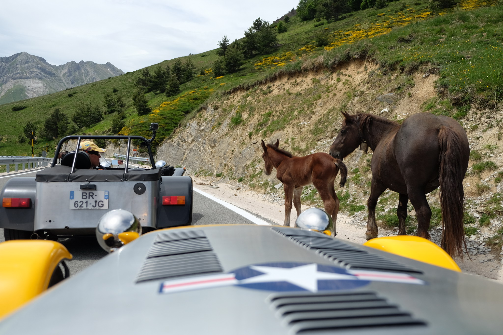 Après ce moment d'intense communion avec la nature, nous reprenons notre grimpette en se dirigeant à nouveau vers l'Espagne, et à nouveau un superbe col, celui de la Pierre Saint Martin. Les routes espagnoles sont plutôt belles et larges et donc avenantes, j'ose alors m'autoriser à expérimenter le jeu préféré des mes deux acolytes, à savoir la descente en mode "caisse à savon" que eux prennent un malin plaisir à faire dès la moindre occasion (je n'oserai jamais assez répété que ce sont deux gros inconscients, c'est bien simple, si on demandait quels seraient les gens sérieux dans ce groupe, seul mon nom pourrait être annoncé....) . Bref, je les laisse donc passer devant, et je le fais, je coupe le contact .... grisant, même si mon piti trois cylindres est plutôt discret, descendre sans bruit de moteur, juste l'air dans les oreilles et le bruit de roulement des pneus, les sensations sont encore décuplées, on a l'impression d'aller encore plus vite ! Et il faut être plus technique pour passer les virages en essayent de freiner le moins possible et perdre le moins de vitesse possible, un bon apprentissage pour améliorer ses trajectoires. Belles rencontres ensuite avec des chevaux sauvages, enfin pas si sauvage car ils viendront même renifler l'arrière-train de ces drôles de pitites voitures qui les intriguent !