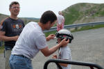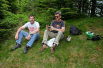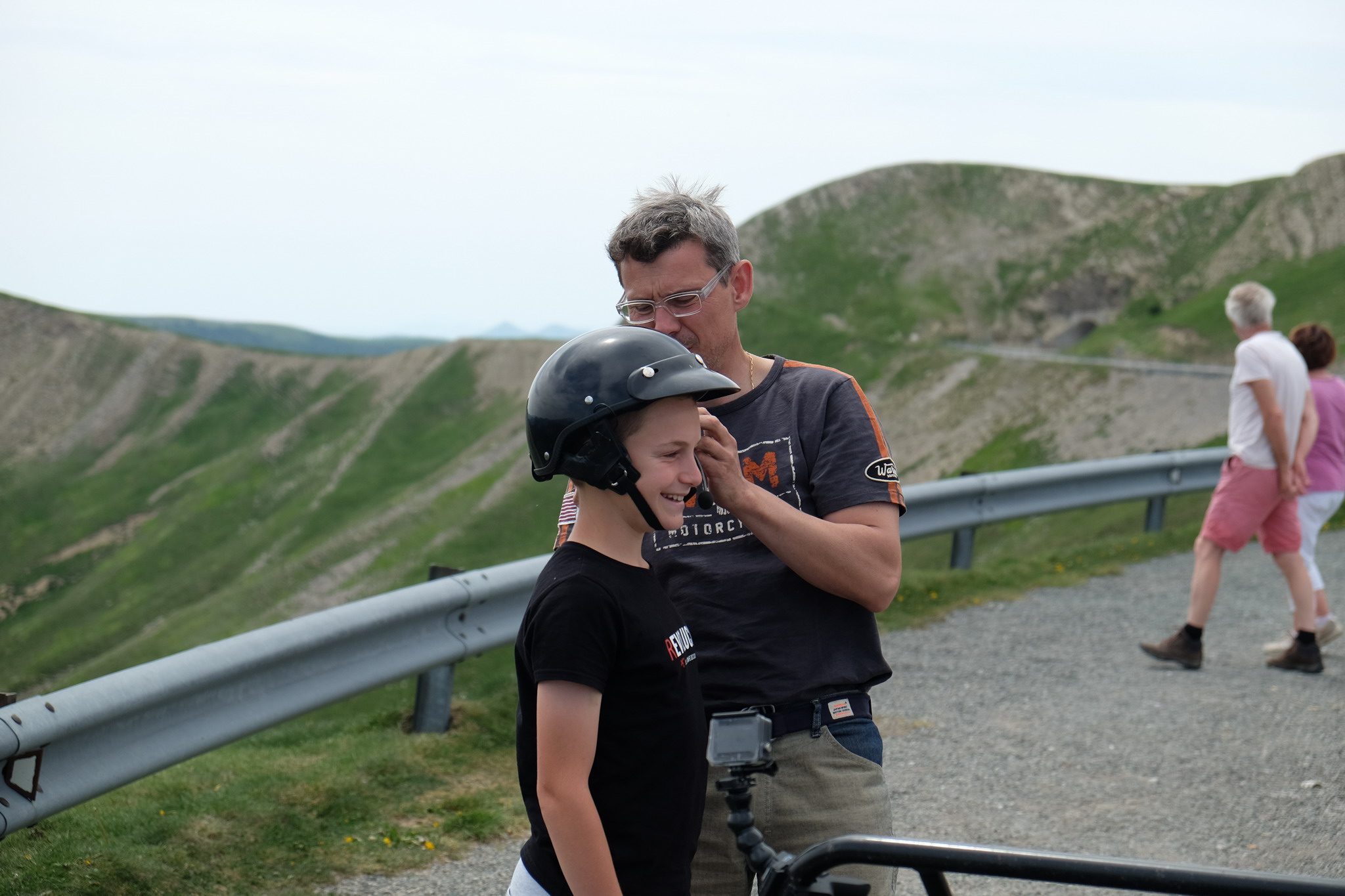 Après une telle bourre, nous nous arrêtons en haut du col d'Erroymendi, un peu regardés par les touristes qui sont présents et qui ont du nous entendre arriver, et en particulier une famille de français et leur deux garçons, qui nous avaient repérés depuis un moment, au bruit, puis qui avaient fini par nous apercevoir au détour d'un virage et suivre la fin de notre ascension ! Les garçons étant attirés par ces petits bolides, Villo et Sly se proposent de les emmener pour la descente, et nous nous donnons rendez-vous pour boire un coup ensemble à Larrau juste en bas, un beau souvenir pour eux surtout que ça va astiquer un peu, je n'arrivais même pas à les suivre, mais chut faut pas le dire, si leur maman apprend ça, les deux fêlés vont en prendre pour leur grade !
