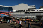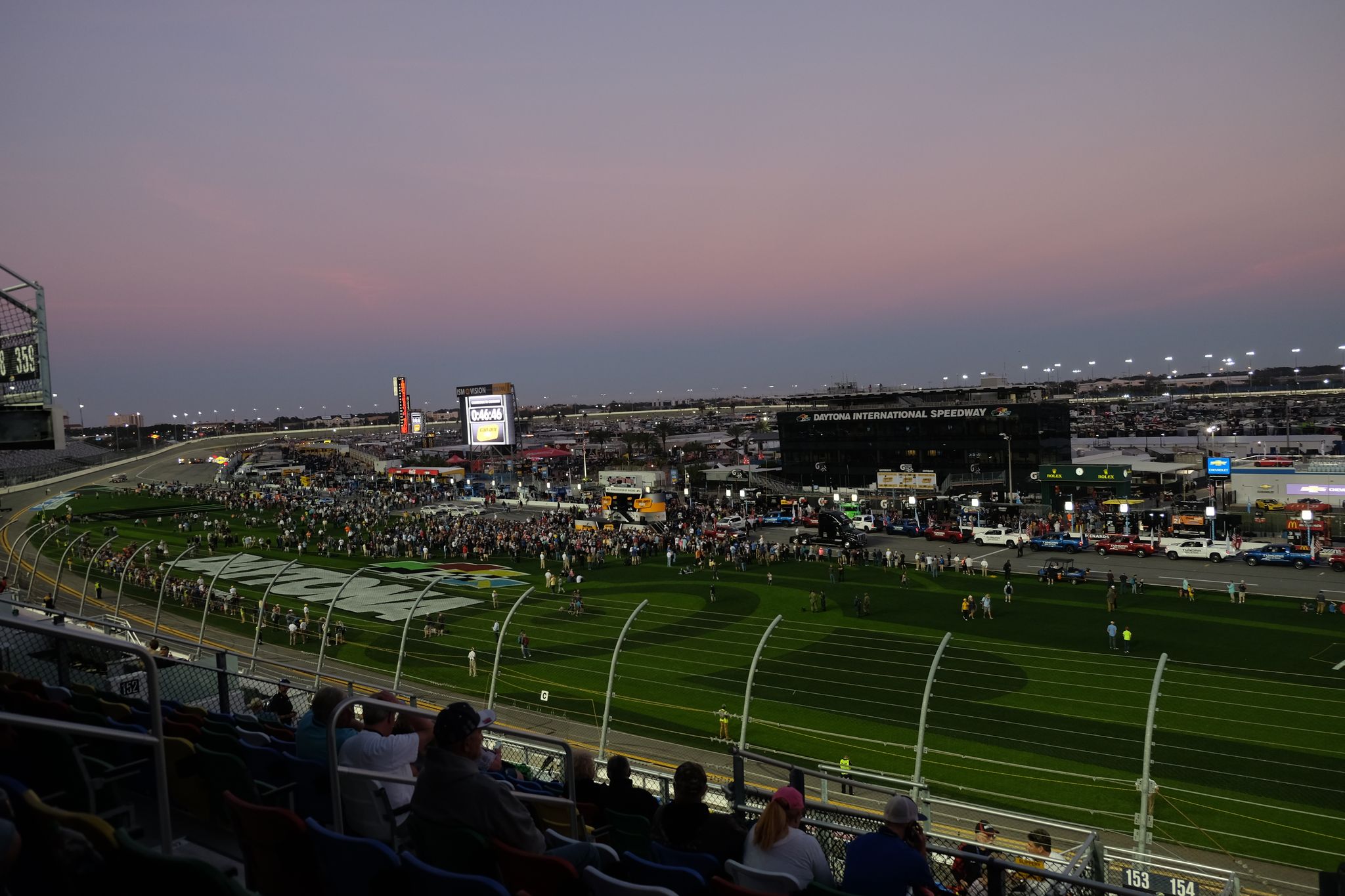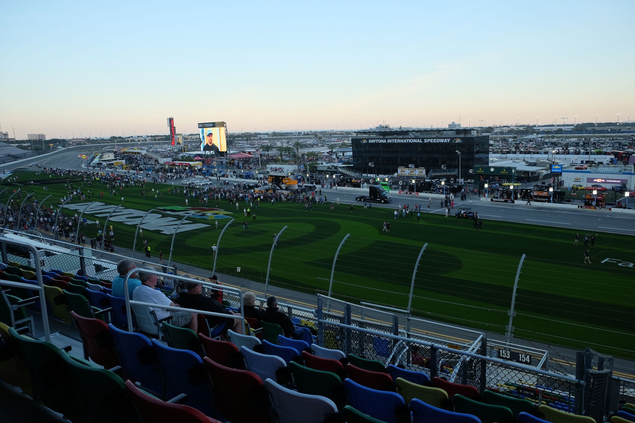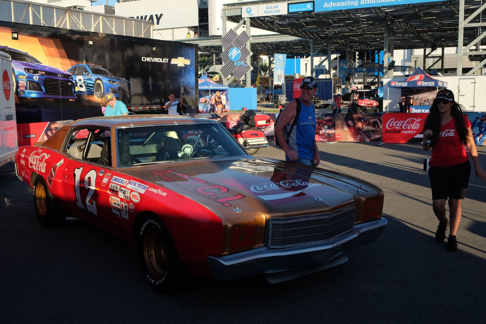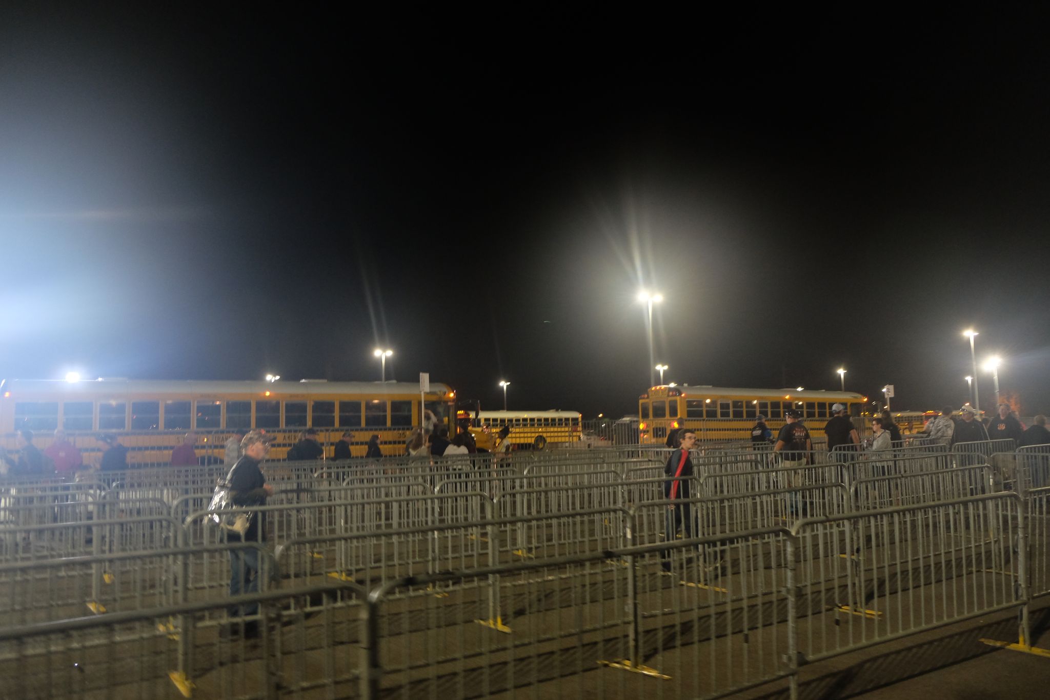 Les Can Am Duels ont lieu le jeudi soir, deux courses qui opposent les voitures de la Cup, le plateau des 40 voitures est divisé en deux pour faire ces deux courses, qui sont en fait les qualifications et déterminent donc la grille de départ du Daytona 500. Nous avions choisi de stationner la Challenger sur un parking gratuit, donc loin du speedway, mais un service de school bus assurent les navettes, vraiment cool de monter dans ces véhicules mythiques, surtout que nous fonçons à travers les chemins, traversant les routes à fond de cale car à tous les croisements, des State Troopers en Dodge Charger arrêtent la circulation pour nous laisser passer, vraiment funky ! Nous arrivons ainsi à proximité du circuit, dans la toute récente zone commerciale qui jouxte le speedway juste de l'autre coté de l'avenue.