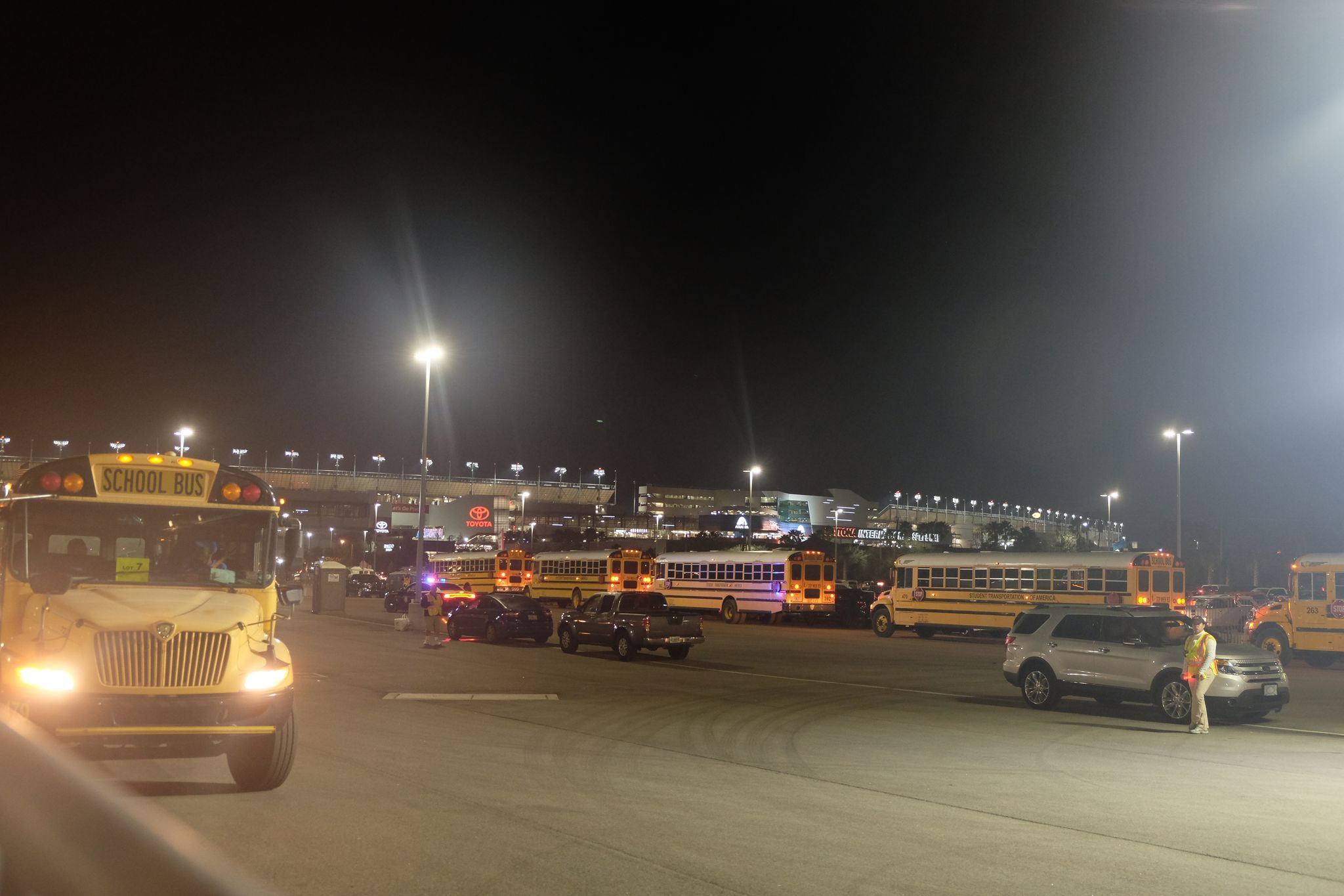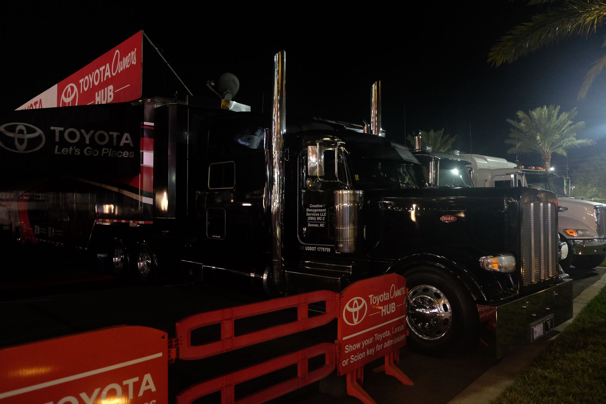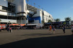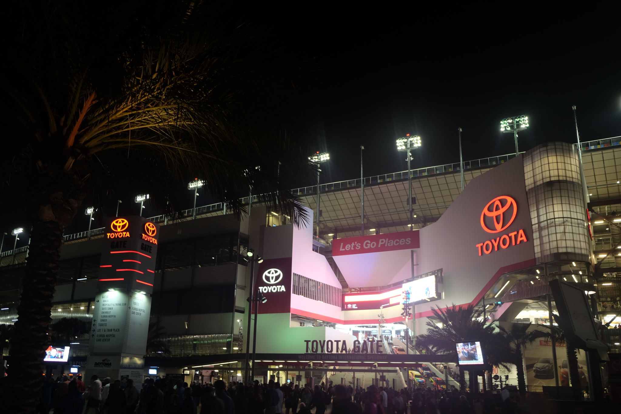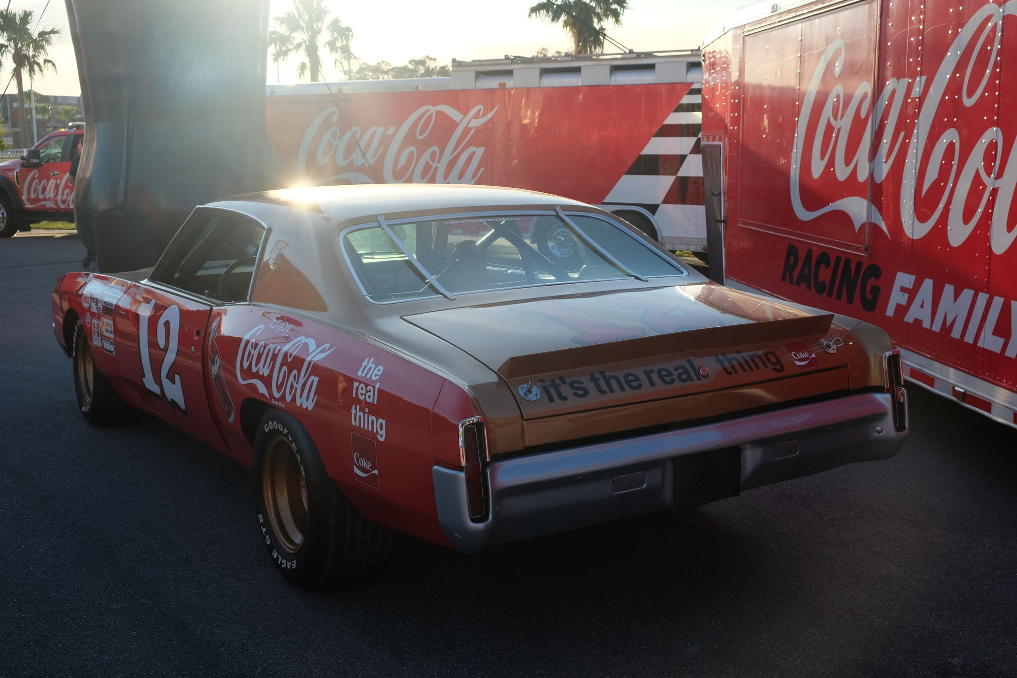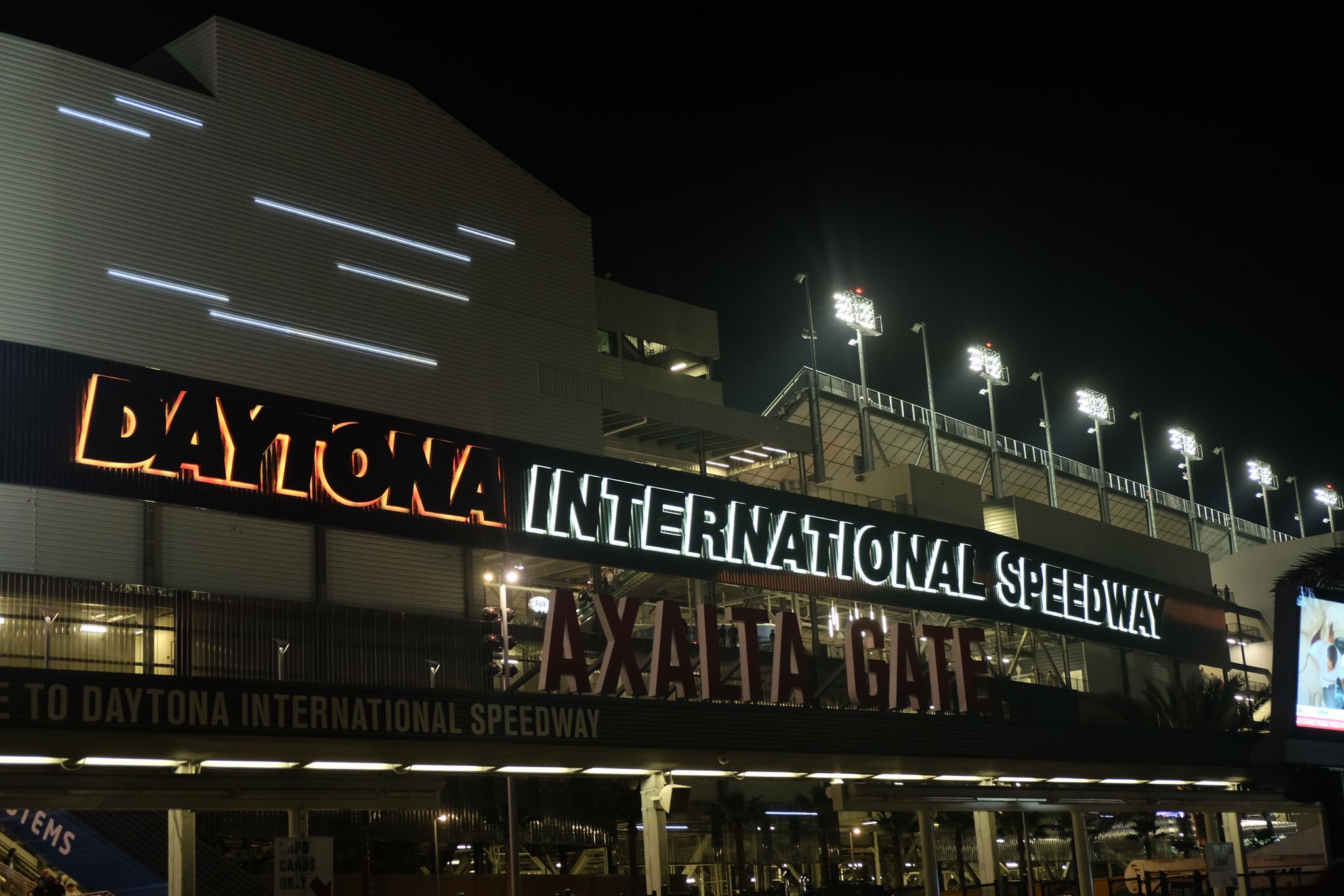 Les Can Am Duels ont lieu le jeudi soir, deux courses qui opposent les voitures de la Cup, le plateau des 40 voitures est divisé en deux pour faire ces deux courses, qui sont en fait les qualifications et déterminent donc la grille de départ du Daytona 500. Nous avions choisi de stationner la Challenger sur un parking gratuit, donc loin du speedway, mais un service de school bus assurent les navettes, vraiment cool de monter dans ces véhicules mythiques, surtout que nous fonçons à travers les chemins, traversant les routes à fond de cale car à tous les croisements, des State Troopers en Dodge Charger arrêtent la circulation pour nous laisser passer, vraiment funky ! Nous arrivons ainsi à proximité du circuit, dans la toute récente zone commerciale qui jouxte le speedway juste de l'autre coté de l'avenue.