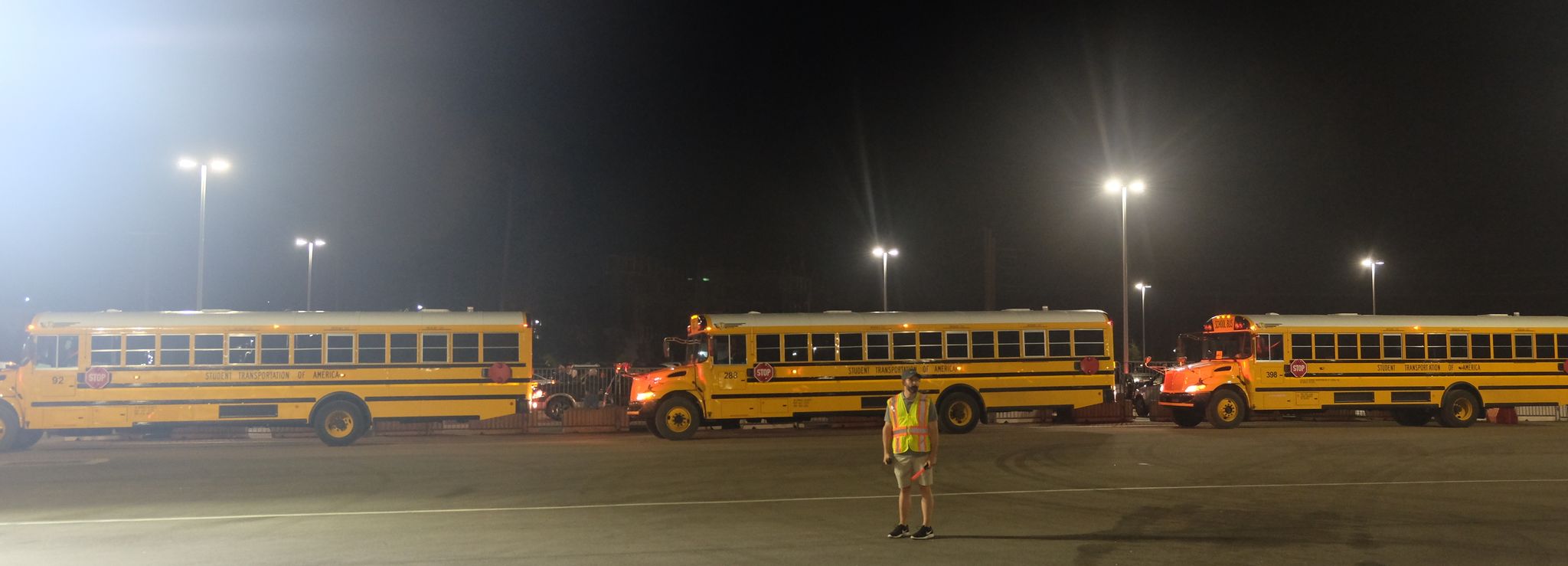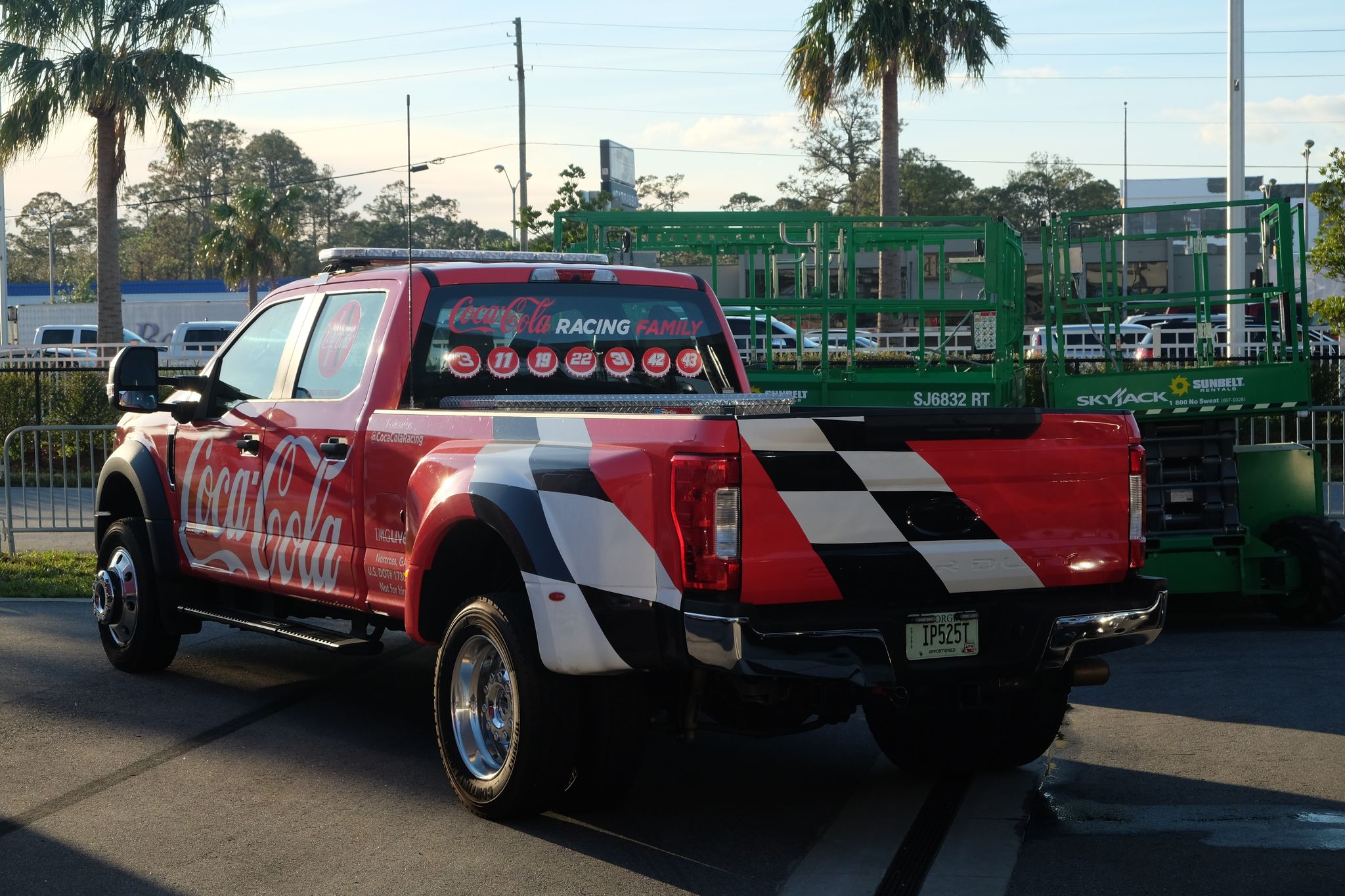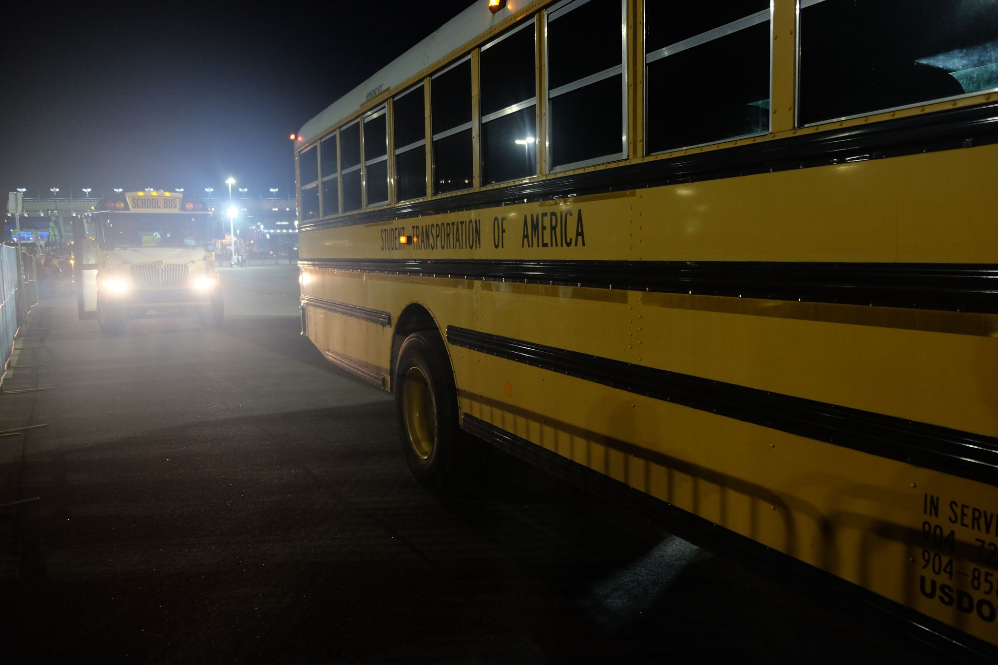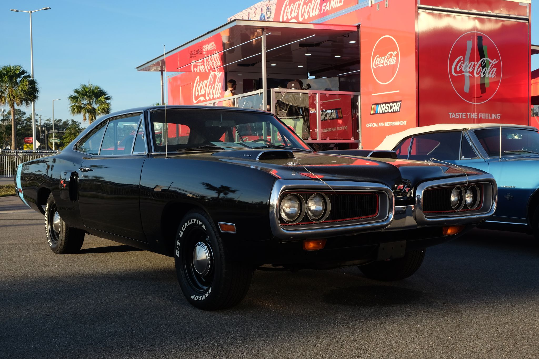 Les Can Am Duels ont lieu le jeudi soir, deux courses qui opposent les voitures de la Cup, le plateau des 40 voitures est divisé en deux pour faire ces deux courses, qui sont en fait les qualifications et déterminent donc la grille de départ du Daytona 500. Nous avions choisi de stationner la Challenger sur un parking gratuit, donc loin du speedway, mais un service de school bus assurent les navettes, vraiment cool de monter dans ces véhicules mythiques, surtout que nous fonçons à travers les chemins, traversant les routes à fond de cale car à tous les croisements, des State Troopers en Dodge Charger arrêtent la circulation pour nous laisser passer, vraiment funky ! Nous arrivons ainsi à proximité du circuit, dans la toute récente zone commerciale qui jouxte le speedway juste de l'autre coté de l'avenue.
