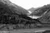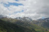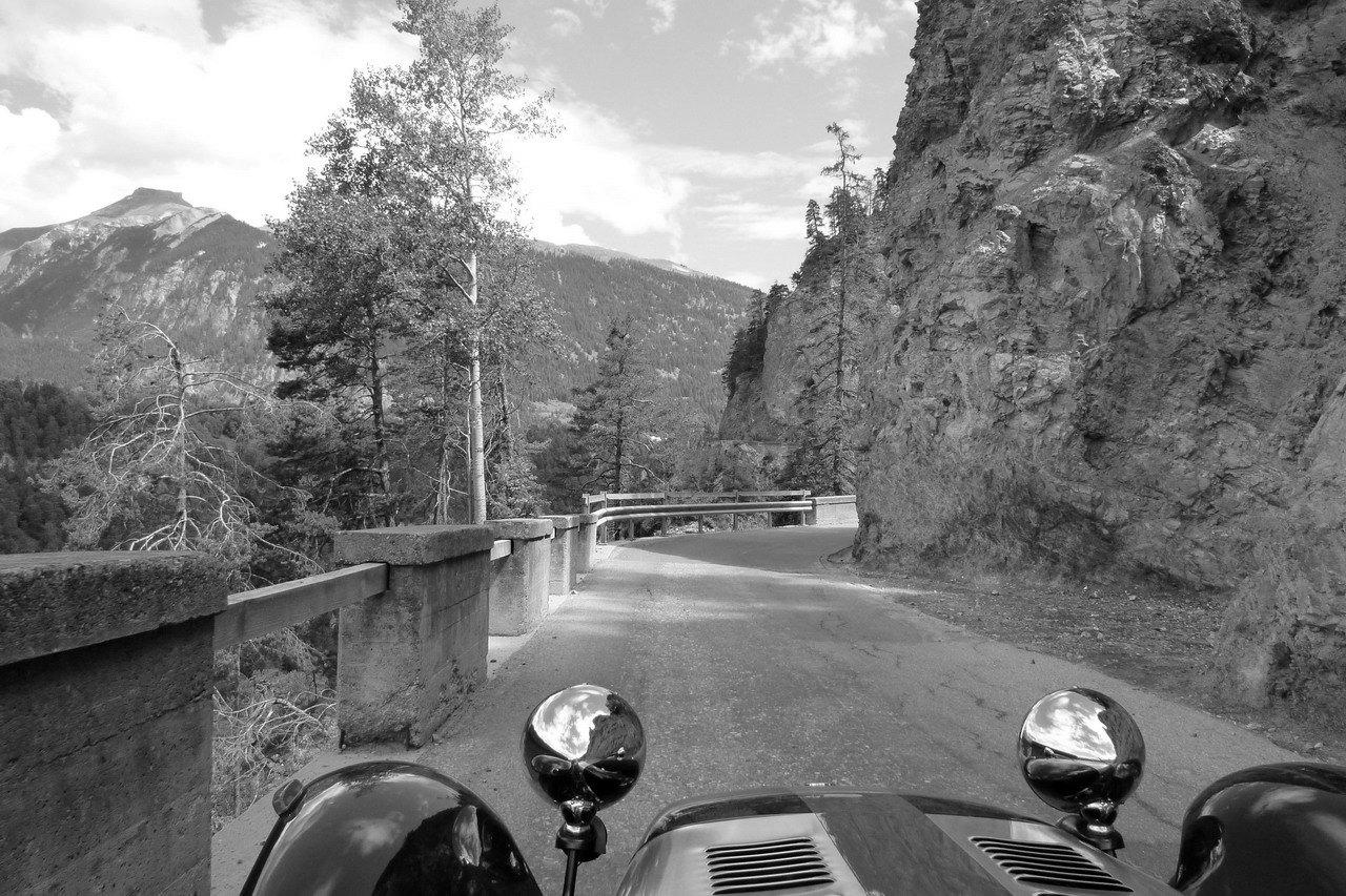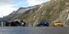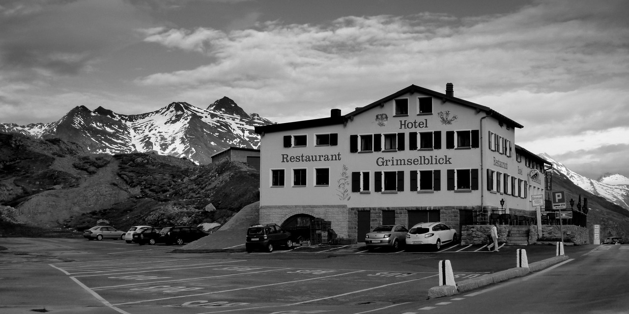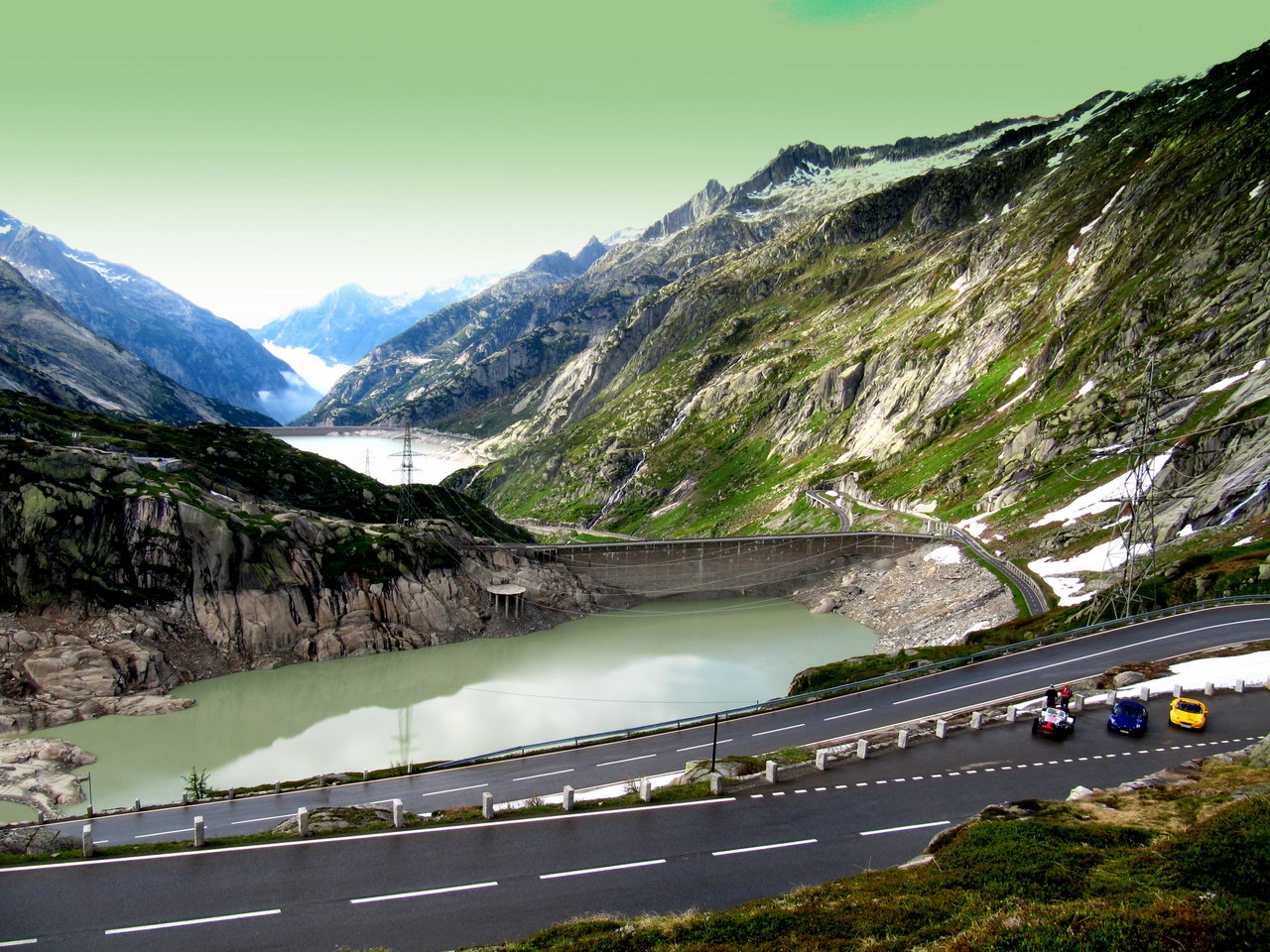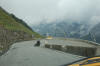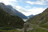 Puis on commence à affronter les reliefs par Aigle et Chateau d'Oex, surtout en direction de nos premiers "pass". Peu après être repartis, les 2 gus devant moi me larguent, loupent une sortie et je suis obligé de les attendre en bordure du lac de Thunersee. Puis on attaque vraiment les choses sérieuses, arrêt ravitaillement, sauf moi une fois de plus, car avec ma conduite "soft et coulée", ma tutusse doit bien consommer la moitié de l'autre tutusse et de la cat !! Avant d'attaquer notre premier pass, la tutusse "Kanard WC" fait un peu des siennes par un bruit de frottement lors des freinages, le Villllo se plonge dessous malgré la (très) faible garde au sol, à priori p'têt lecarter de l'étrier de frein qui frotte, bon, ça n'empêchera pas de rouler !! Car il faudrait p'têt qu'on se magne un peu, il est déjà 17h00 et on a 3 pass à franchir !! Le premier et non des moindres est Grimselpass, je profite tranquillement du paysage avant de l'affronter car obligé de stopper car un troupeau de vaches doit franchir la route pour passer d'un champ à l'autre. Et enfin j'attaque, route superbe, paysage grandiose, passage au pied du barrage, et on se retrouve tous les 3 juste au-dessus d'un lieu mystérieux et presque lugubre, donc terriblement attirant et excitant, l'hotel "Grimsell Hospiz", très peu de voitures sur la route, la chaussée est humide due à la fonte de la neige encore fortement présente sur les abords, et on trouve un petit parking pour une séance shooting offrant de superbes angles de prise de vue.