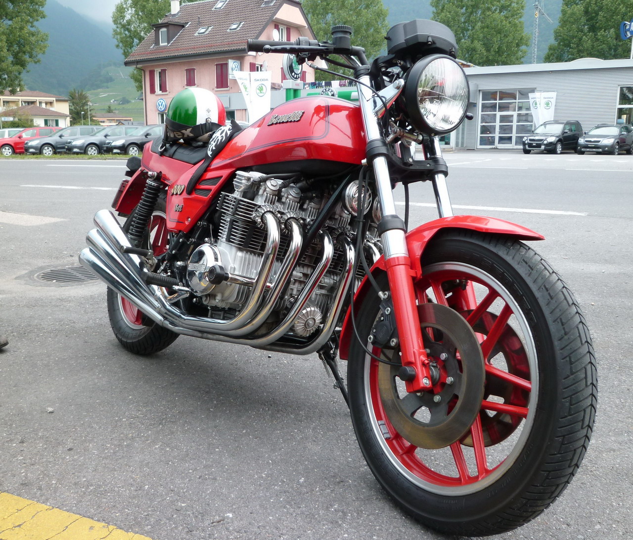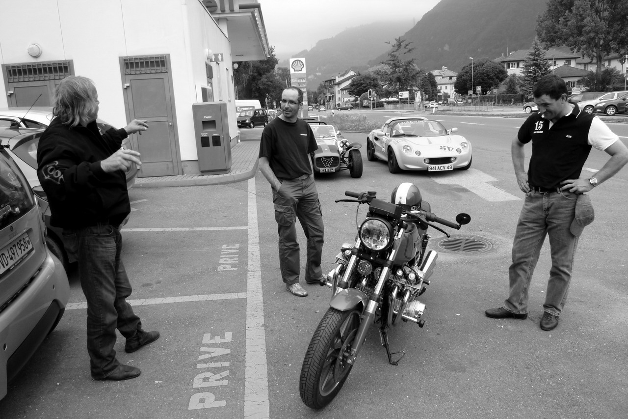 Après une excellente nuit dans ce cadre exceptionnel, un piti-dej nous donnant des forces pour la journée (ou plutôt la matinée!), quelques photos souvenirs auprès de nos hébergeurs, on décolle vers 10h00 sous un soleil radieux et les splendides routes en direction de la Suisse. On passe la frontière à Crassier, un petit poste douanier, les douaniers nous font à peine un signe pour nous laisser passer, et on part à la recherche d'une station ou autre pour acheter des vignettes d'autoroute. On file direct en direction du lac Léman que l'on découvre au détour d'un virage. Le but du jeu ensuite est de longer toute la cote nord du lac jusqu'à Montreux, ce qui ne va pas se révéler une si bonne idée! En effet, les paysages sont plutôt beaux tout le long du Léman mais c'est une succession d'agglomérations donc peu d'intérêt et une circulation un peu chargée nous empêchant franchement de rouler, tellement marre d'avoir fait 60 bornes comme ça que l'on appréciera même pas la très chic ville de Montreux. On quitte enfin les rives du Léman pour faire une pause carburant qui se solde par une rencontre une fois de plus extraordinaire!! Un motard passe devant la station, sa monture faisant un bruit complètement atypique, et voyant les 2 Elise et la Cat, il décide de faire demi-tour pour venir nous voir, et on découvre sa superbe Bennelli Sei et son 6 en ligne. Le personnage est extraordinaire, il habite juste à coté et possède une superbe collection de 2 et 4 roues, et cette Bennelli a été découverte neuve en caisse un paquet d'années après sa naissance!! Il est déjà plus de 13h00 et le pilote de la Bennelli nous emmène jusqu'à un resto juste à coté à Rennaz.
