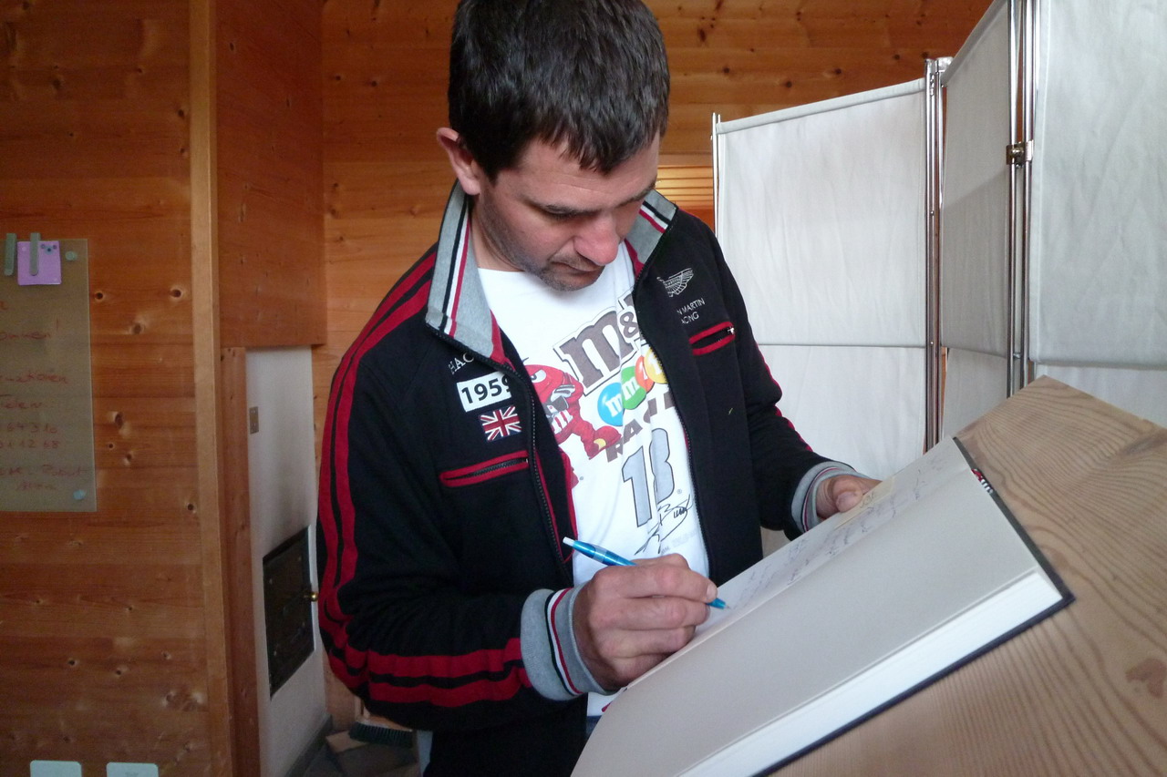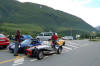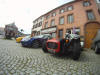 Il est largement plus de 10h00 quand on arrive à décoller, pour faire un premier arrêt .... quelques minutes plus loin !!!! Car Elise Kanard WC fait encore des siennes, après les frottements de la tôle de l'étrier de frein de la veille, cette fois, c'est une roue qui vibre dixit le Villllo !! Premier controle, rien d'anormal à l'avant, on retente de partir, pour s'arrêter juste un peu plus loin car ça semble plutôt venir de l'arrière !! Et en effet, la roue arrière semble avoir du jeu comme si elle était desserrée, le Sly suggère donc au Villllo de sortir sa clé ou son cliquet histoire de vérifier tout ça, et la réponse imparable du Villllo deux points ouvrez les guillemets "trop lourd, light is right, je n'ai emmené aucun outil"!!!! Bon, kooool, on improvise, on est à l'entrée du bourg de Castrisch, je passe devant pour trouver un piti garage ou autre, et on arrive déjà au panneau de sortie sans trouver d'enseigne "intéressante", c'est alors que le Sly en Cat disparait à l'angle d'un bâtiment, c'est en fait une scierie, et avec son allemand "hors du commun", il a déniché des gens très sympas qui ont tout le matos nécessaire !! Check control complet de la tutusse, quasiment toutes les vis des 4 roues sont plus ou moins dévissées !! En fait, les jantes étaient fraichement repeintes, et la surface d'appui des vis étant peintes, cela a engendré un dévissage, on aurait pu mal finir avec des conneries pareilles !! Allez, zou, photo souvenir avec la clé à cliquet à la main et on repart enfin sérieusement, petits cols très sympas au menu, passage de la frontière italienne sous quelques gouttes de pluie, et on s'arrête enfin (surtout pour certains!!) déjeuner, en compagnie d'une chouette Austin Healey allemande .... et commence alors une discussion assez passionnée sur les routes prises ce matin, car on n'aurait pas pris les routes exactes de Top Gear, et je suis bien sûr le seul responsable car c'est moi qui ait fait le trajet ;-)))) bon, ça sera surtout une bonne excuse pour bien réétudier tout ça à froid au coin de la cheminée l'hiver prochain afin de revenir traîner dans le coin !!