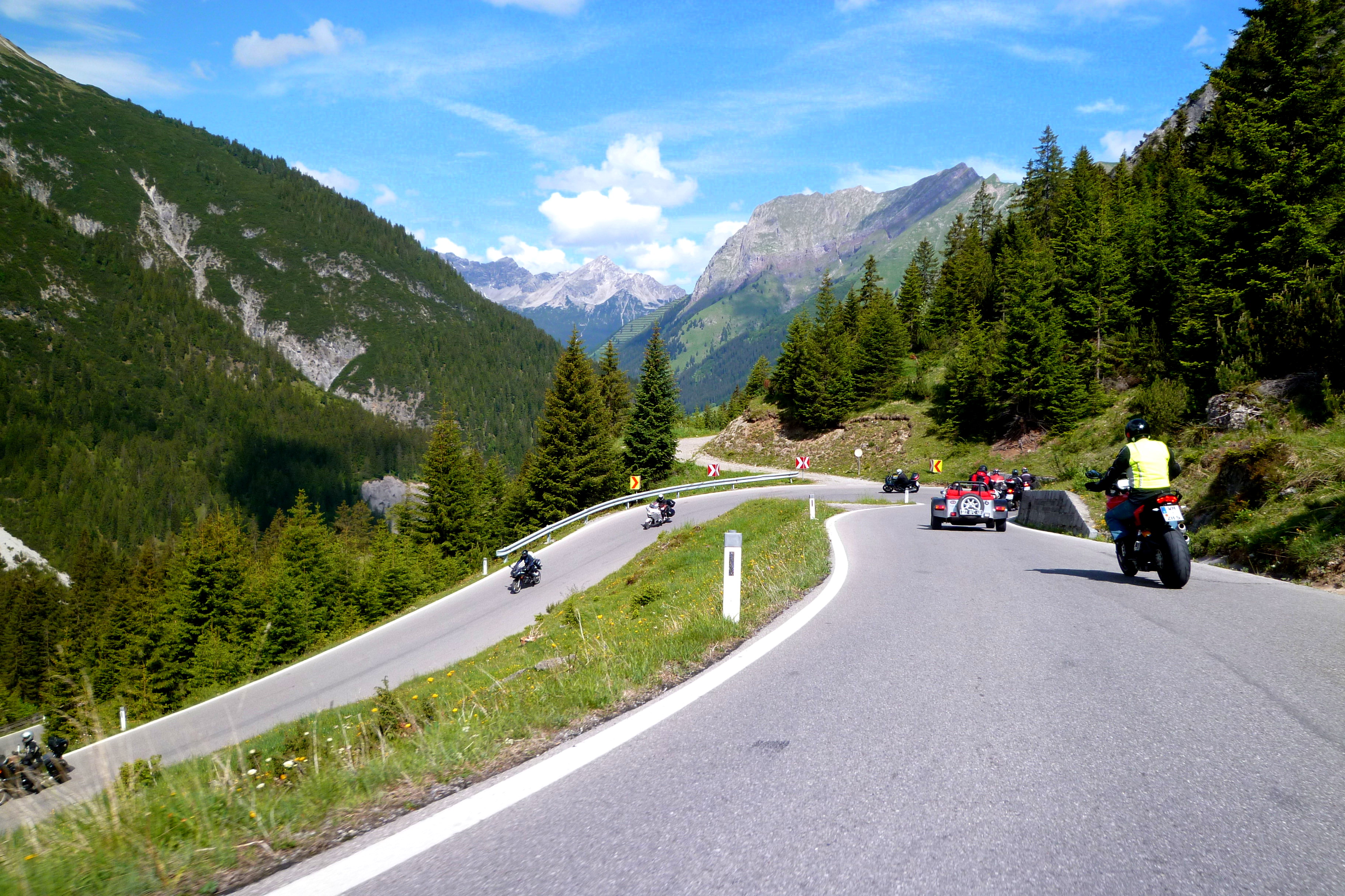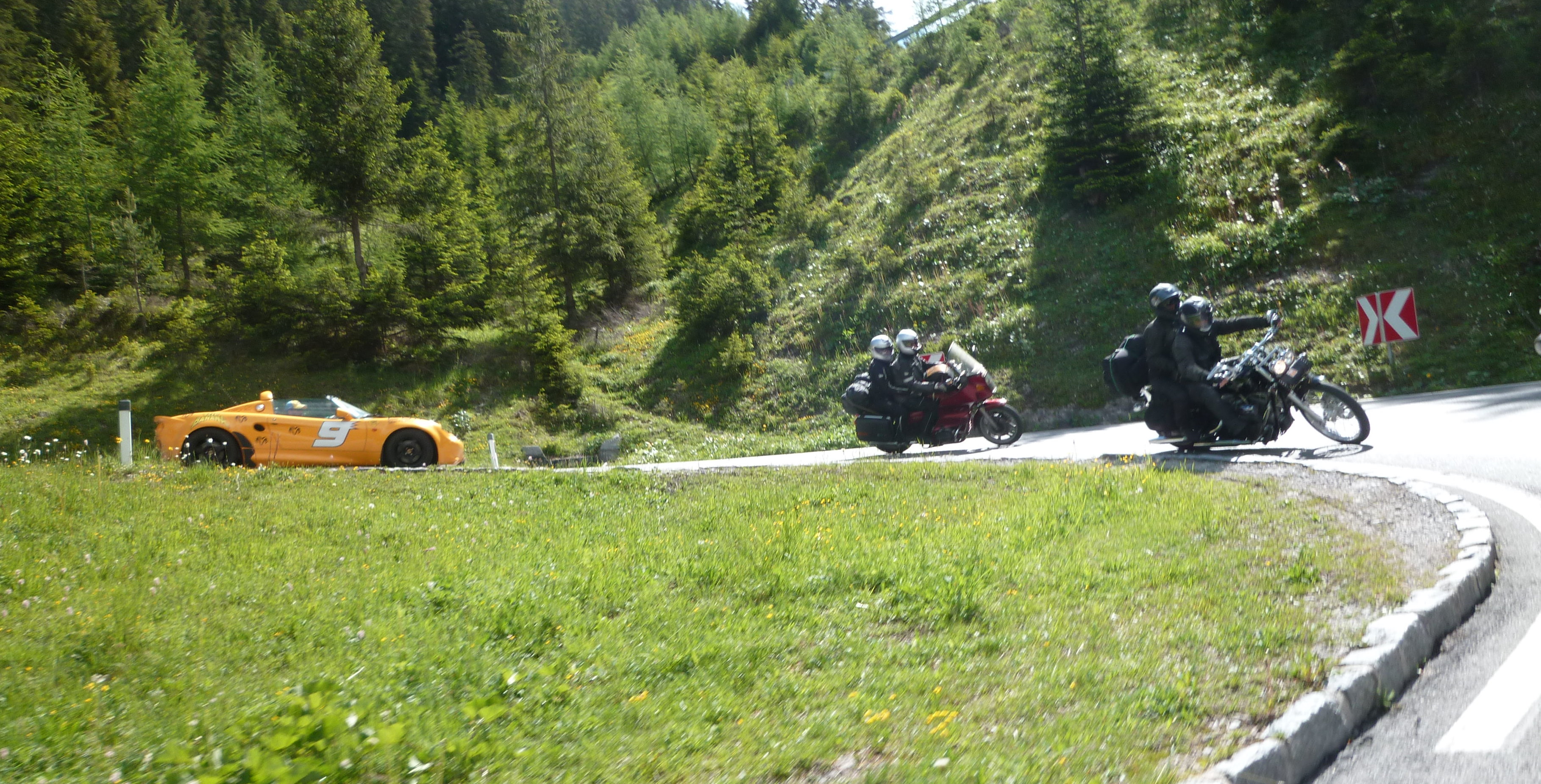 Superbe soleil autrichien ce matin, encore une belle journée qui nous attend, avec un programme alléchant d'entrée, les cols autrichiens d'EVO !! En effet, le Villllo avait lu un superbe essai dans Evo, BMW M3 GTS, Jaguar XKR-S, Porsche 997 GT3 RS qui vantait allégrement leur terrain de jeu dans les col de Hahntennjoch et Namlos. Ni une ni deux, un coup de Google Maps et j'avais repéré toutes les routes découvertes par les journalistes d'Evo, et ces routes autrichiennes valaient le déplacement, envahies par les motos, qui vont un peu nous freiner dans le premier col. Par contre dans le deuxième col ça va tartiner sévèrement, à la chasse des sportives à 2 roues, les tutusse et la cat vont s'en offrir une belle palanquée pour le piti dej, avec comme prime au dessert, un radar et 2 uniformes planqués à la sortie d'un village !!!! Heureusement, le civisme des autrichiens nous avertissent par de nombreux appels de phare, y'en a juste un qui fait le zigoto et se fait piquer, c'est le Sly !!!! Je passe devant lui alors qu'il est en grande discussion avec les 2 uniformes !! Bien évidemment, je ne m'arrête pas, c'est là que l'on reconnaît ses amis !! Comme il a du liquide plein les poches, il en laisse quelques poignées et repart dare-dare !!