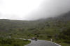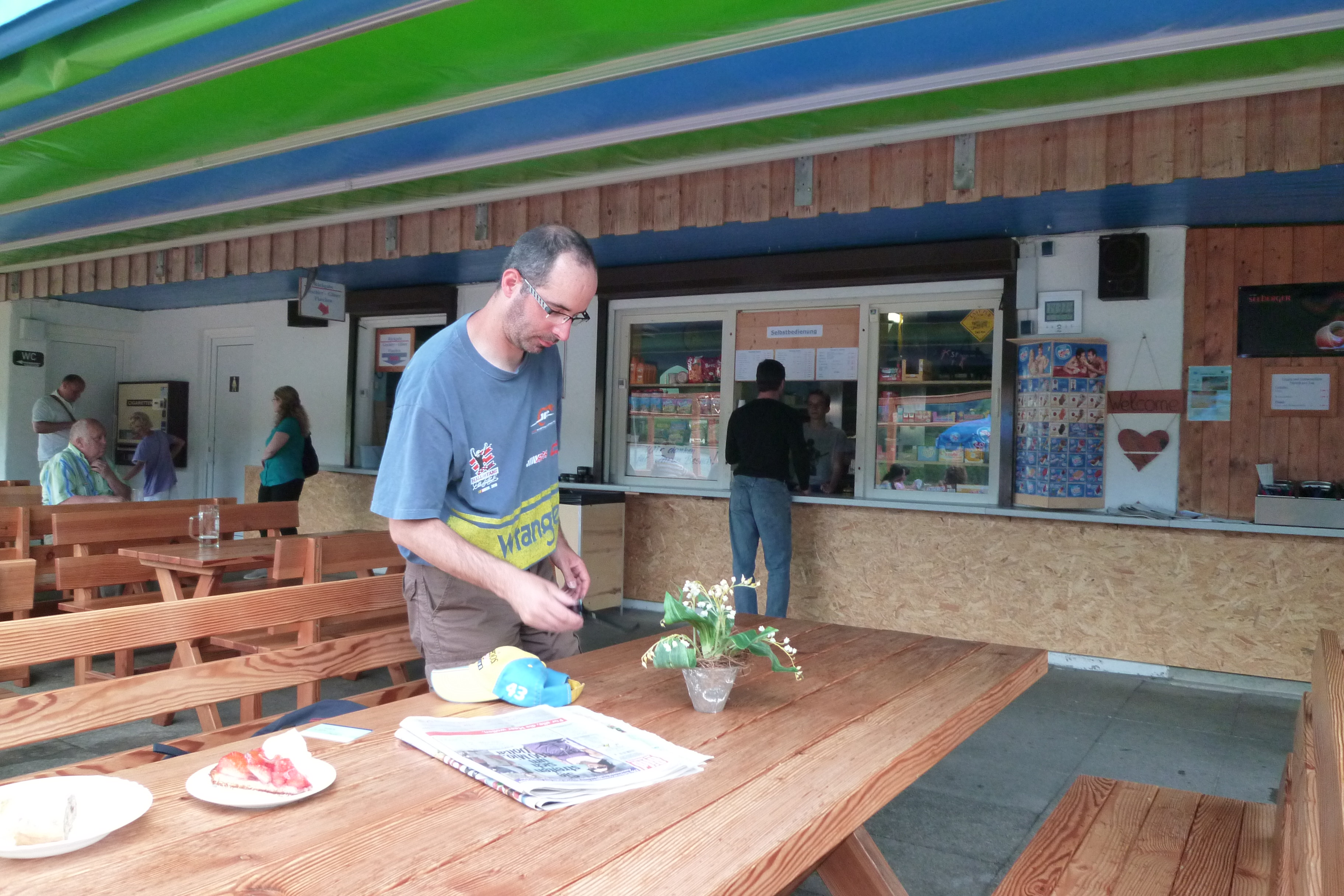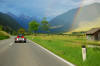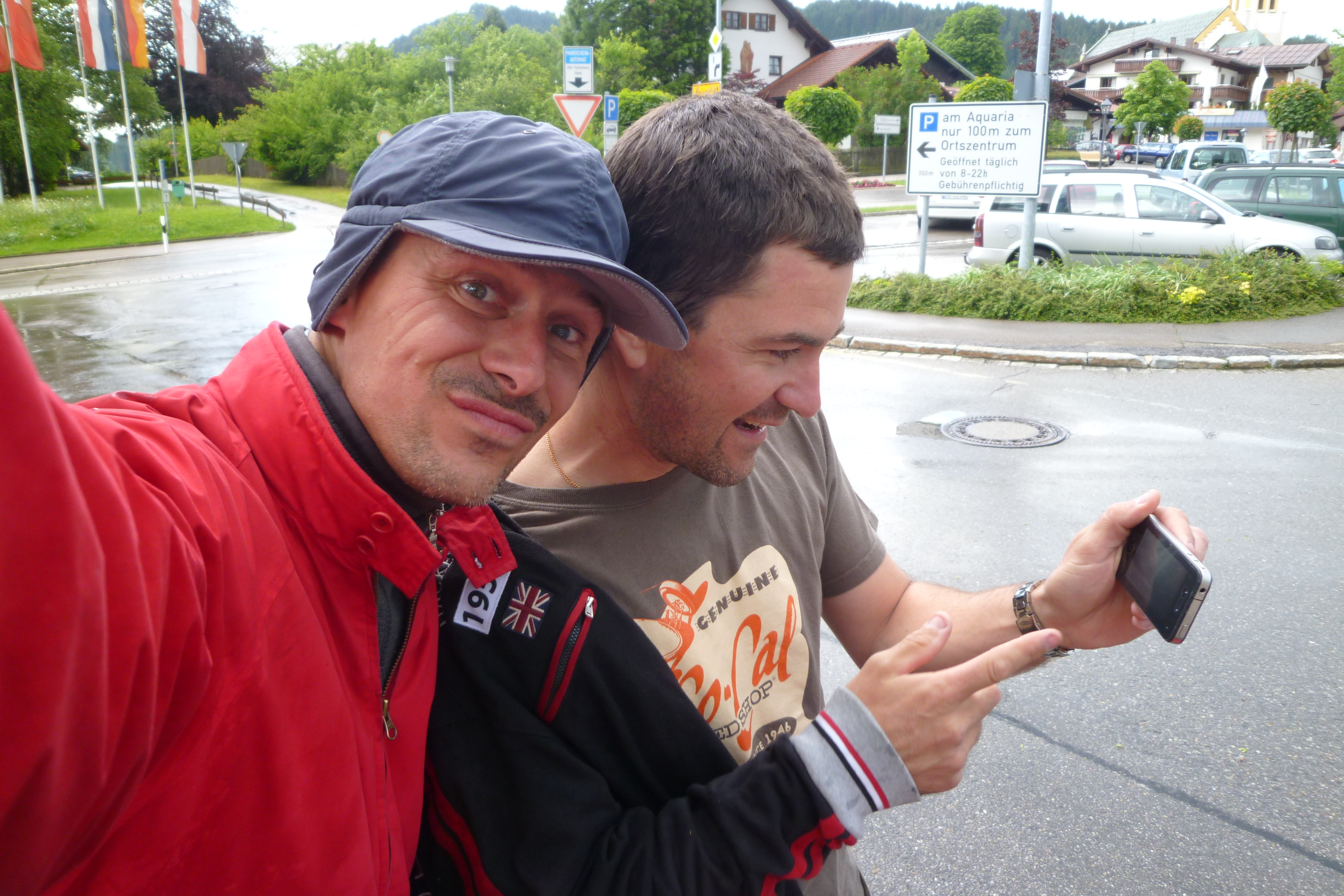 Avec toutes ses péripéties, il est déjà 14h00 et nous n'avons toujours pas déjeuné, mais après être passé en Allemagne, nous allons être récompensé en découvrant le charmant petit lac de Alpsee avec un boui-boui qui fait des trucs pannés frites et des parts de gâteau terribles !! On est dimanche, il fait beau, les gens sont venus faire bronzette en bordure du lac, on profite du paysage, si vous voyez ce que je veux dire !!!! Et c'est pour la digestion que les choses vont vraiment commencer à se gâter, grand soleil toujours en repartant mais des nuages ma foi un peu sombres accrochent les sommets qui nous entourent, mais même pas peur, on repart non capoté .... je roule devant, et devant justement, ça fait, comment dire, une sorte de barre noire, nous fonçons vers l'apocalypse !!!! Mais tels des chevaliers sans peur ni teproches, nous fonçons vers notre destin, ça commence par quelques gouttes, et en dix secondes, ça se transforme en une tempête de grêle, trop tard pour s'arrêter, je serai trempé le temps de prendre le temps de capoter, je décide de continuer, avec le froid tombé subitement, une buée incroyable s'est formée sur le pare-brise, j'essuie rapidement avec un chiffon, ça tombe tellement fort que la visibilité est très réduite, toutes les voitures commencent à s'arrêter car ça devient dangereux, mais moi je n'ai pas le droit !! Je continue à une allure de 50-60 à l'heure, je suis toujours en tee-shirt, je commence à être bien trempé, les grêlons qui picorent mon crâne ne sont pas vraiment agréables, j'ai viré vite fait les affaires du siège passager pour les repousser dans le fond de l'habitacle afin de limiter les dégâts, et je continue vaillamment en me disant qu'un tel déchaînement ne peut pas durer une éternité !!!! Et l'éternité va durer un bon quart d'heure, puis ça commence à se calmer, Dieu a décidé de rallumer les lumières, je redécouvre le soleil et m'arrête un peu plus loin pour faire le romano en étendant toutes mes affaires sur la voiture et en me changeant !!!! Je décide de prendre des news des 2 zigotos qui étaient derrière moi, et pour eux ce fut l'hécatombe !!!! Le Sly venait juste de prendre la Cat après manger, et il n'a pas été déçu, bien qu'il ait eu un peu de chance, il s'est abrité sous un petit tunnel en compagnie de motards. Le Villllo est donc celui qui a le plus dégusté, ce meussieur n'a pas eu l'idée intelligente d'essuyer son pare-brise couvert de buée, du coup il roulait avec la tête au-dessus du pare-brise ou en regardant la ligne blanche sur le coté de la route, pas franchement sécurisant, il était la risée des motards qui le voyait passer avec une telle technique de conduite, il décida alors de s'arrêter, sans trouver d'abri, en mettant vite fait sur sa tête son shower cap, le résultat fut assez désastreux !!!!
