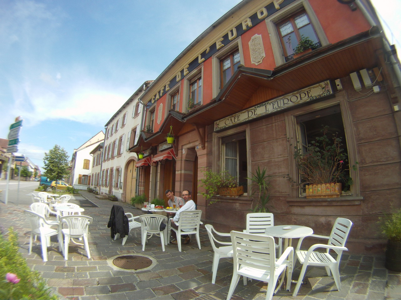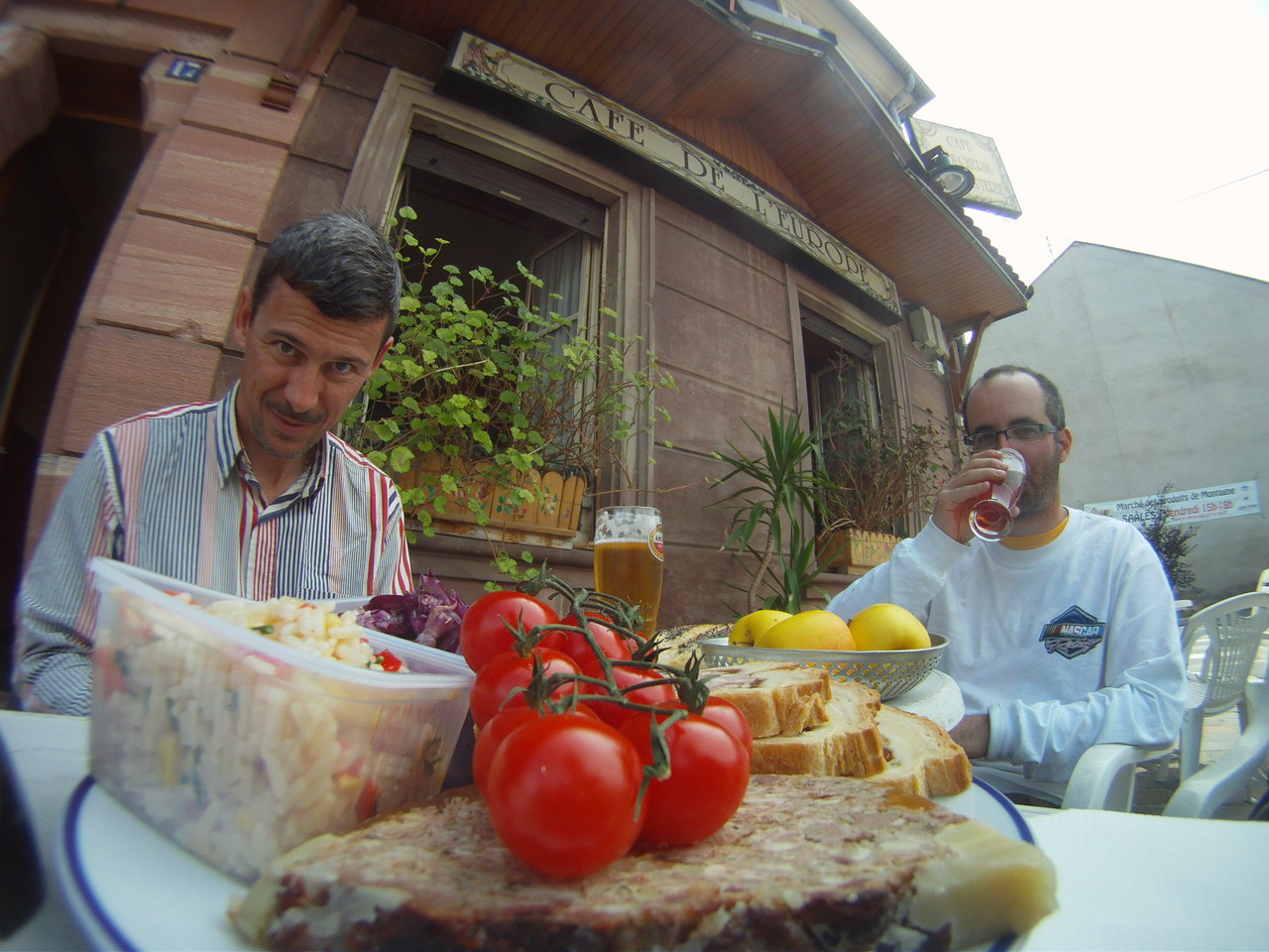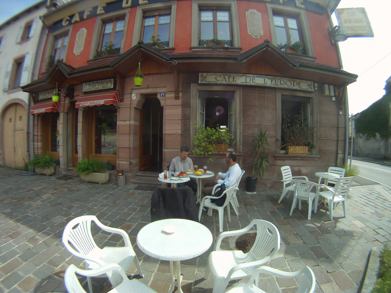 Une fois de plus, il est tard et nous n'avons toujours pas déjeuné .... et on finit par tomber sur un trésor dans le bourg de Saales, une petite place pour stationner les 3 voitures devant une "alimentation-fruits-legumes-pain", très pittoresque et surtout en face un café-boucherie-charcuterie, unique !! On commande donc 3 pitites mousses au café et on passe à coté à la boucherie pour acheter tout ce qu'il faut pour passer un excellent moment, on s'installe en terrasse, la bouchère-charcutière nous sert quasiment à table, nous fournit assiettes et couverts, le bonheur intégral une fois de plus !! Quelques cols des Vosges pour digérer, tels que le col du Bonhomme ou de la Schlucht, assez désert en ce lundi pour atterrir à Ramonchamp dans un lieu que l'on connaît déjà, la ferme vosgienne Chez Fayette de Sven et Clarisse. Nous nous y étions tellement plu lors de notre road trip 2009 que nous avions décide de revenir les voir, et contrôler l'avancée des travaux !!!!