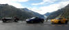 Il commence à être vraiment tard (16h00) quand on redécolle car un des objectifs ultimes de ce road trip nous attend, le lieu de pélérinage pour Elise, j'ai nommé le Stelvio !! On ne sait pas trop de quel coté on va l'aborder, mais on y va mollo car la chaussée est détrempée, et la neige sur les bords fait vite son apparition, il reste bien encore des murs de 1 voir 2 mètres d'épaisseur sur les cotés, mais il est vrai que l'on arrive à plus de 2750 mètres d'altitude !! Le fantasme du Villllo était de prendre une photo avec les voitures dans la neige, et il finit par découvrir une ancienne portion de la route qui ne sert plus, et qui finit dans un mur de neige, on ne résiste pas et on plante les 3 culs des tutusses au frais pour une séance shooting, dans un cadre vraiment hallucinant et fantastique... Les 2 zigs ne s'étant pas assez amusé lors de la montée, ils décident de redescendre une partie du col pour remonter de plus belle, et à les écouter ils ont une fois de plus taquinés du motard !!!! J'en profite pour ma part pour trouver des angles de prise de vue que les paysages ne manquent pas d'offrir pour finir au point culminant où tous les touristes et autres motards se retrouvent, agrémentés de quelques boutiques et une vision vertigineuse de ce qui nous attend de l'autre coté, c'est bien "ça" le Stelvio, une succession harassante de virages qui se perdent dans la forêt tout en bas ....