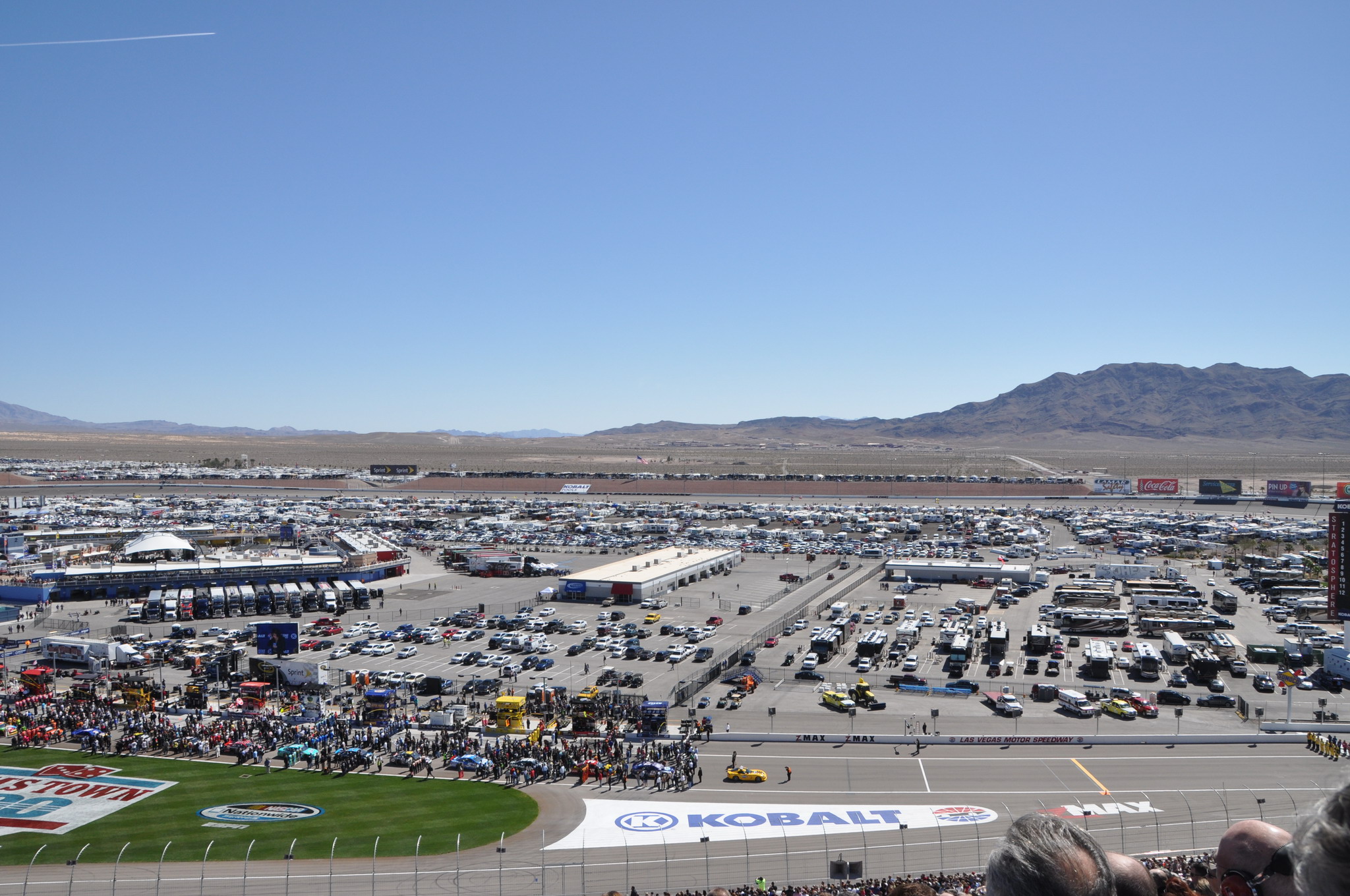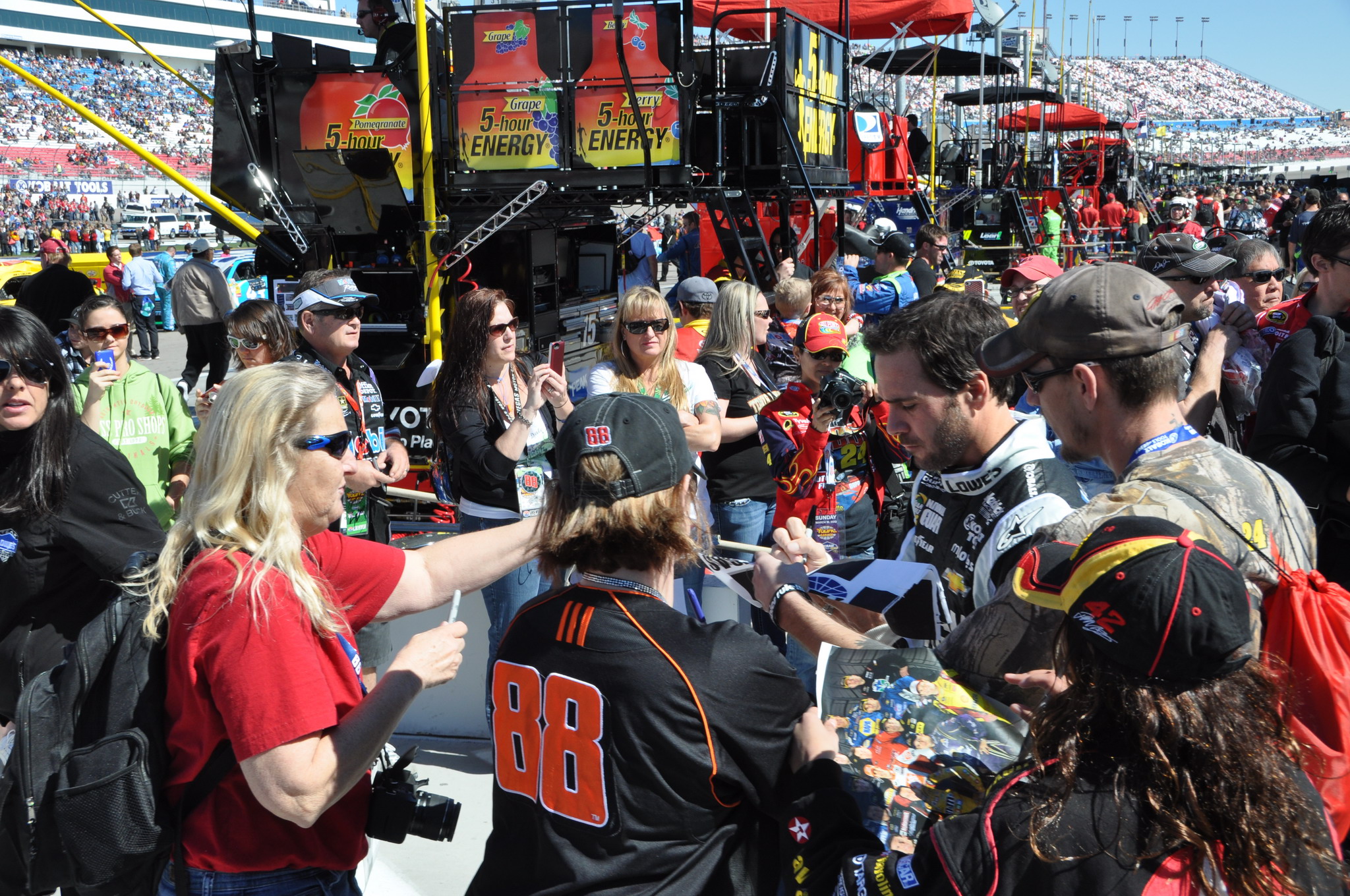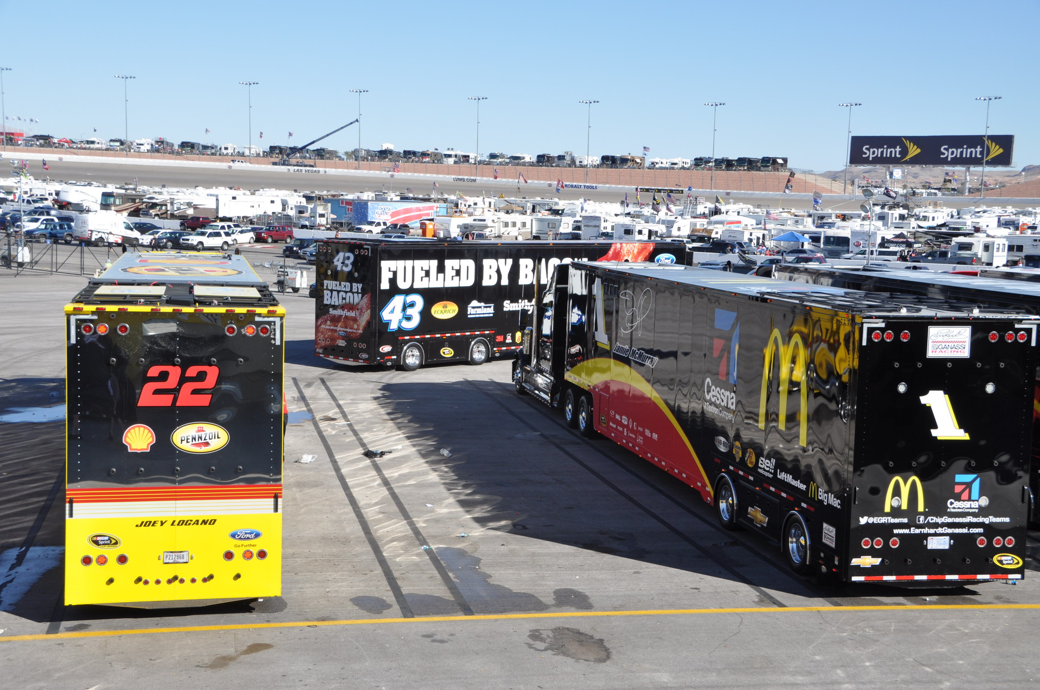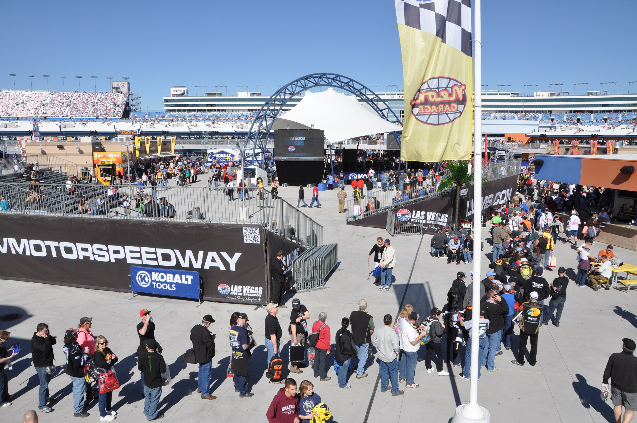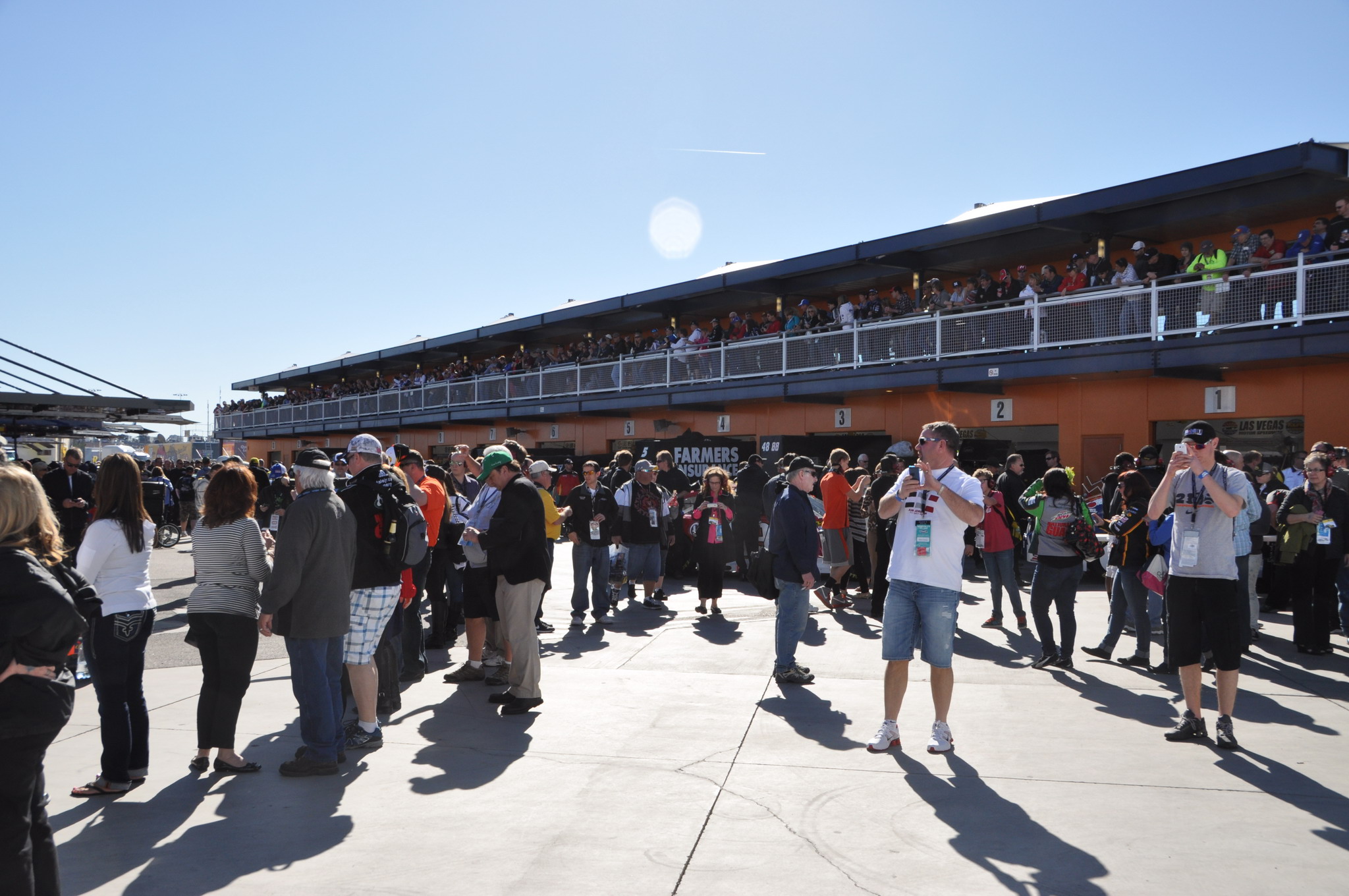 Et comme c'est de tradition le dimanche juste avant la course, et c'est aussi pour ça qu'on m'avait particulièrement conseillé la course de Vegas, toute la ligne des stands est ouverte aux fans. Les équipes, après l'inspection, y mettent les voitures, ce qui permet de toutes les voir de près, quelques animations sont organisées, avec un peu de chance, il est possible de voir les pilotes de près, le vrai spectacle de la Nascar pour les fans.